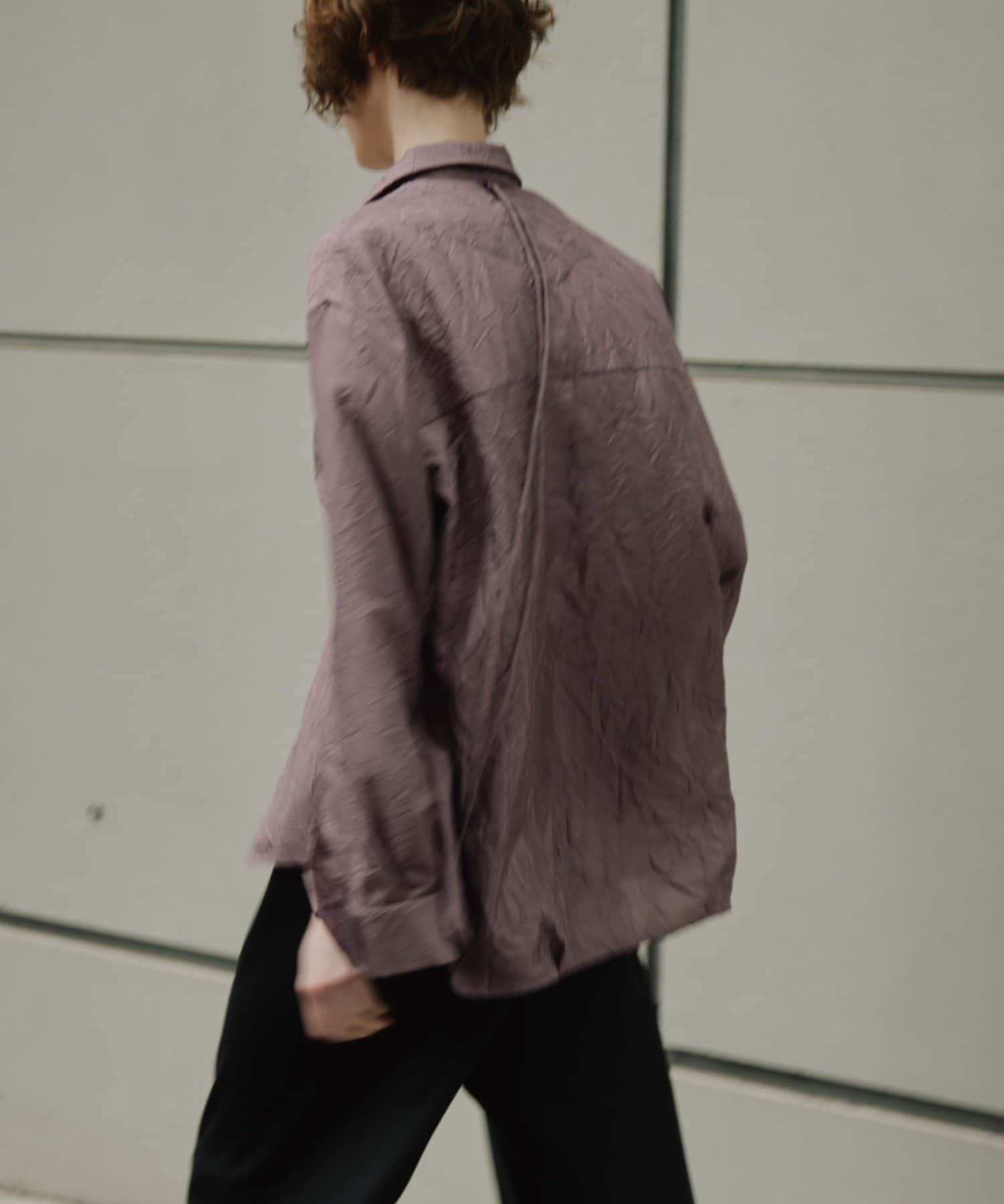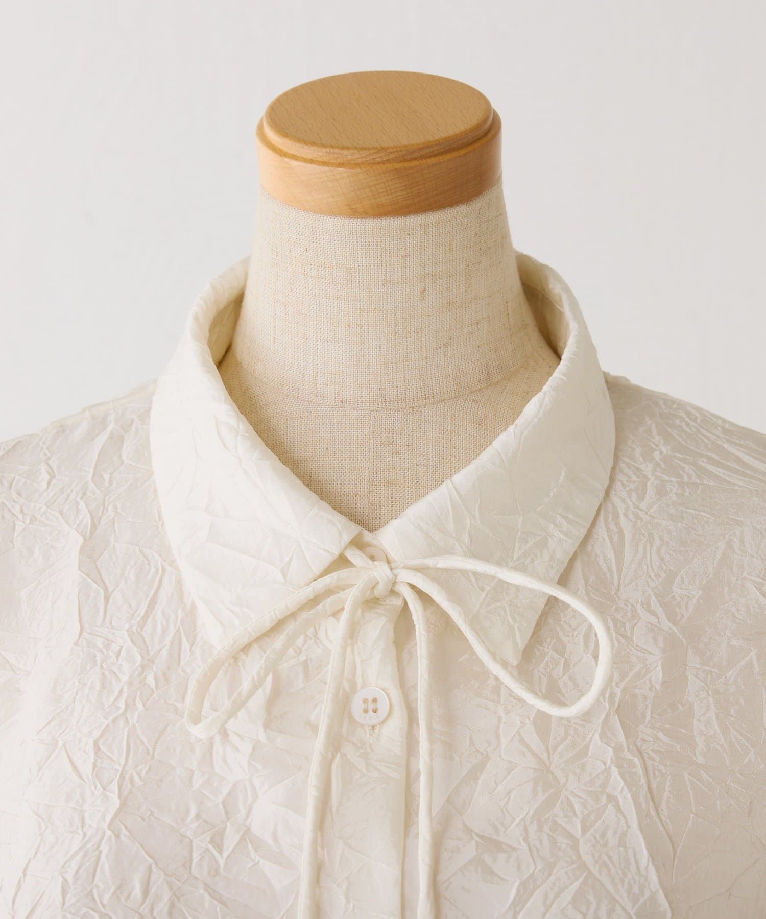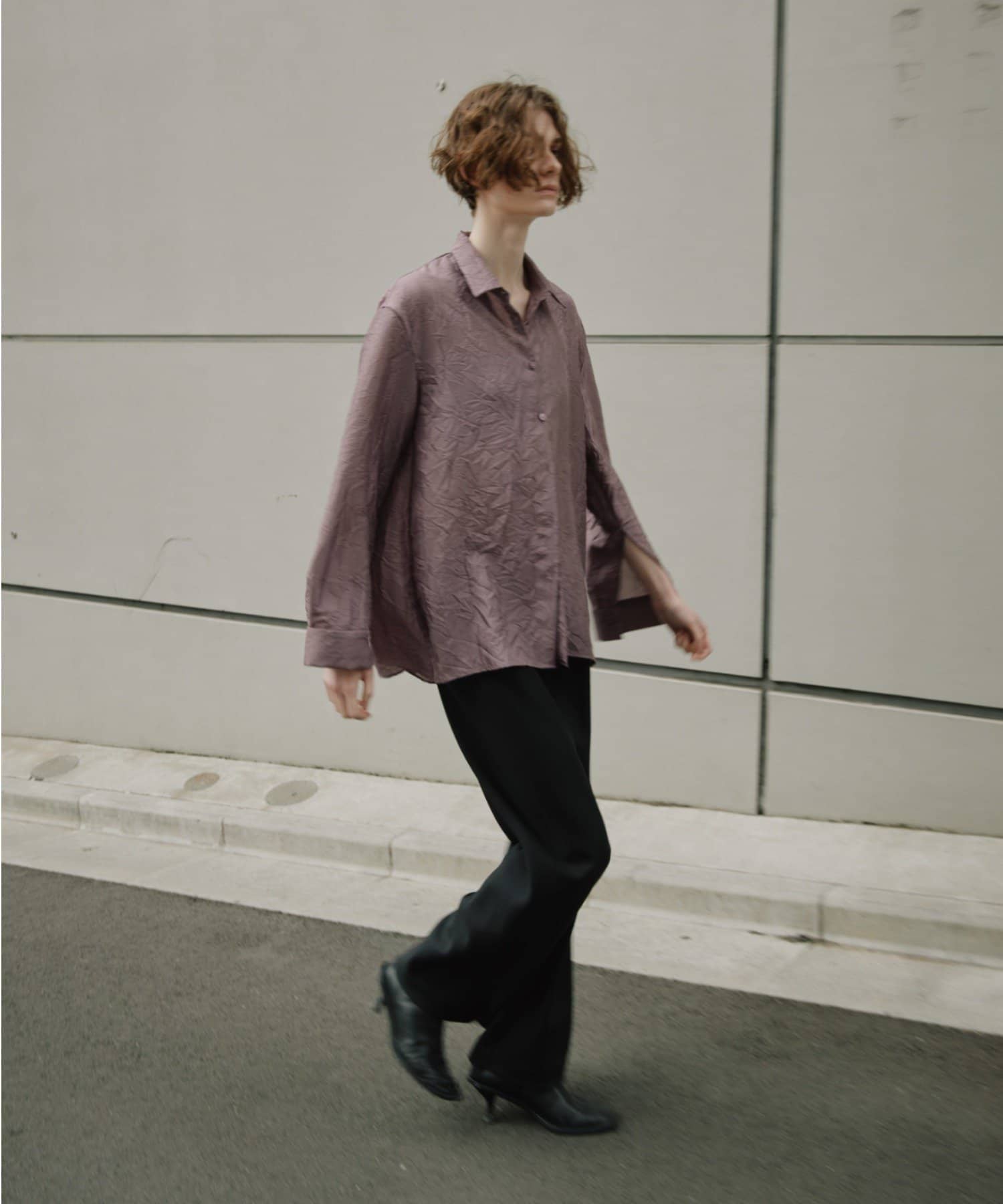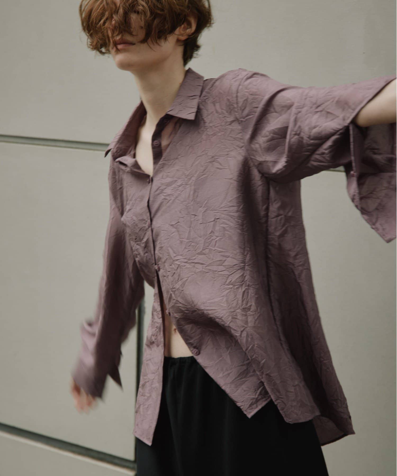 ・シワ加工を施したシルクタッチ素材のブラウス。
