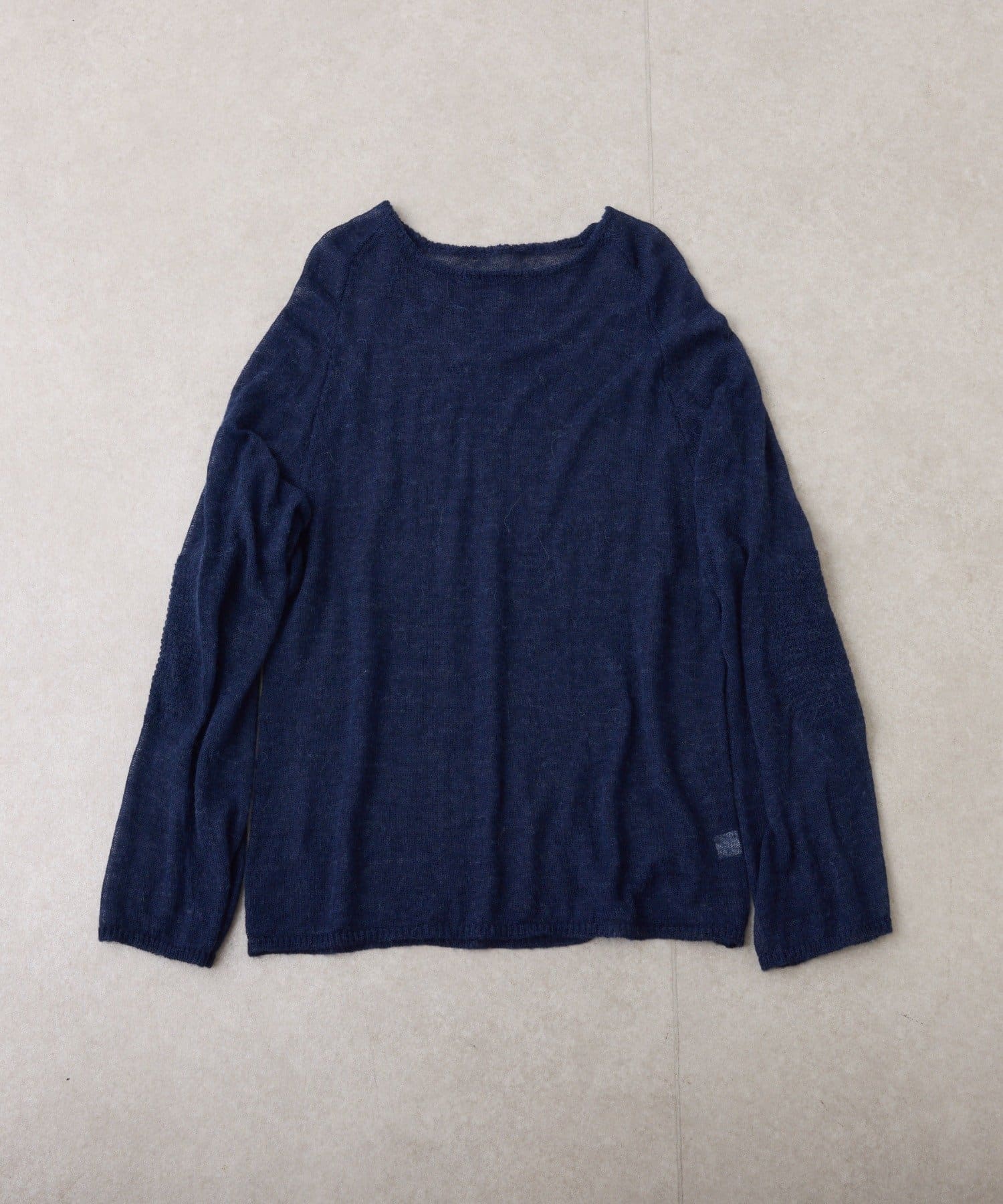 ・袖のタックと編みつづきで、編地を変えて作られたエルボーパッチがポイントです。