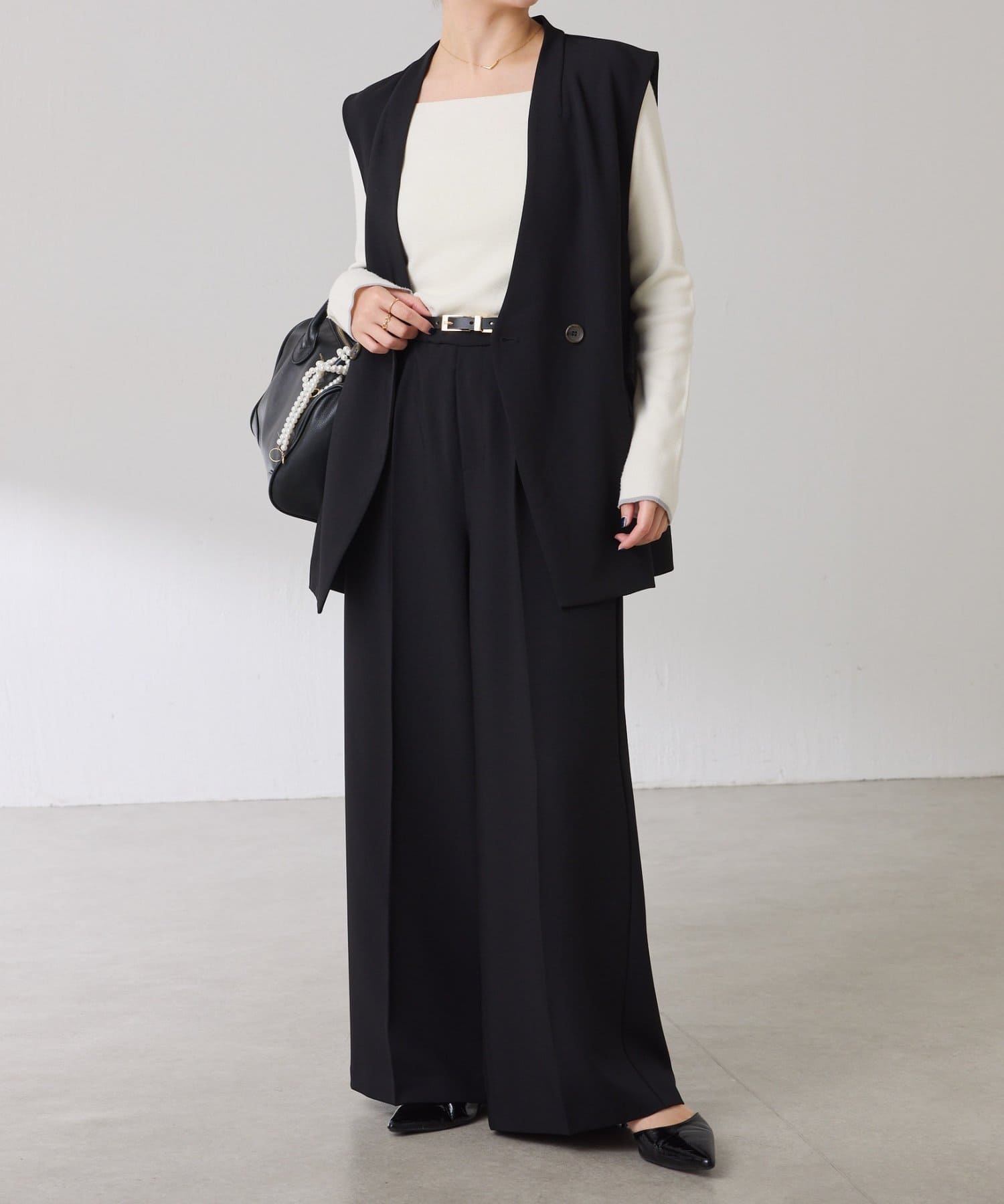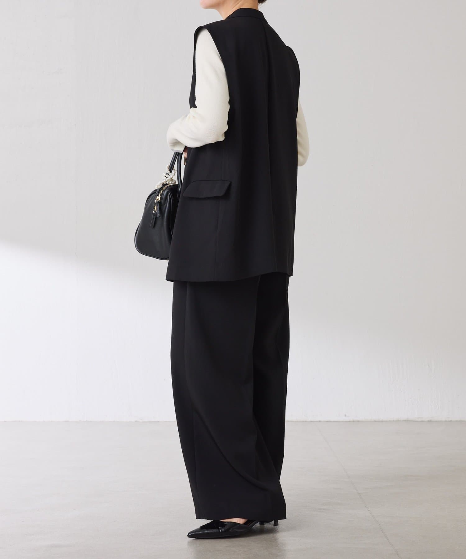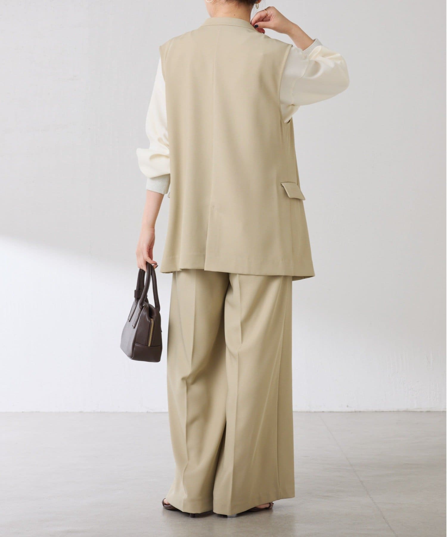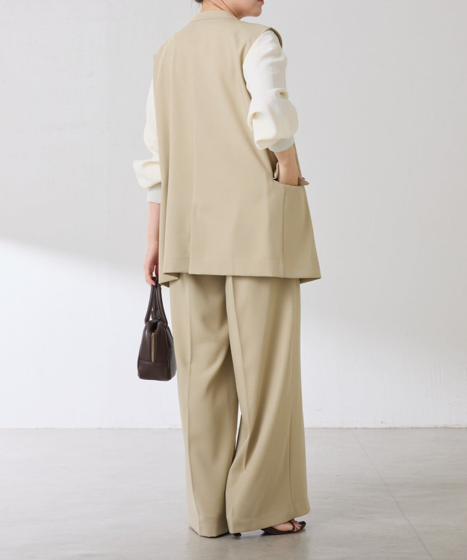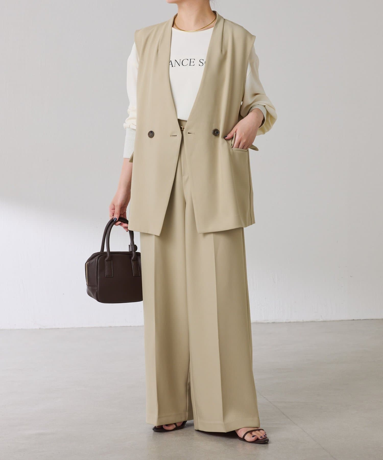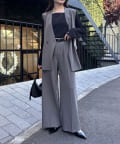・ノーカラーですっきり着られるジレとワイドパンツのセットアイテム。