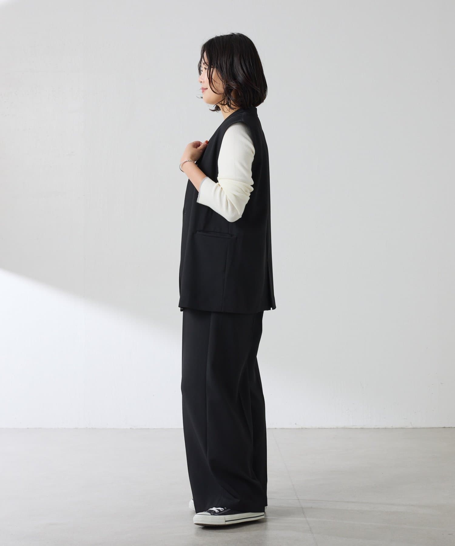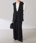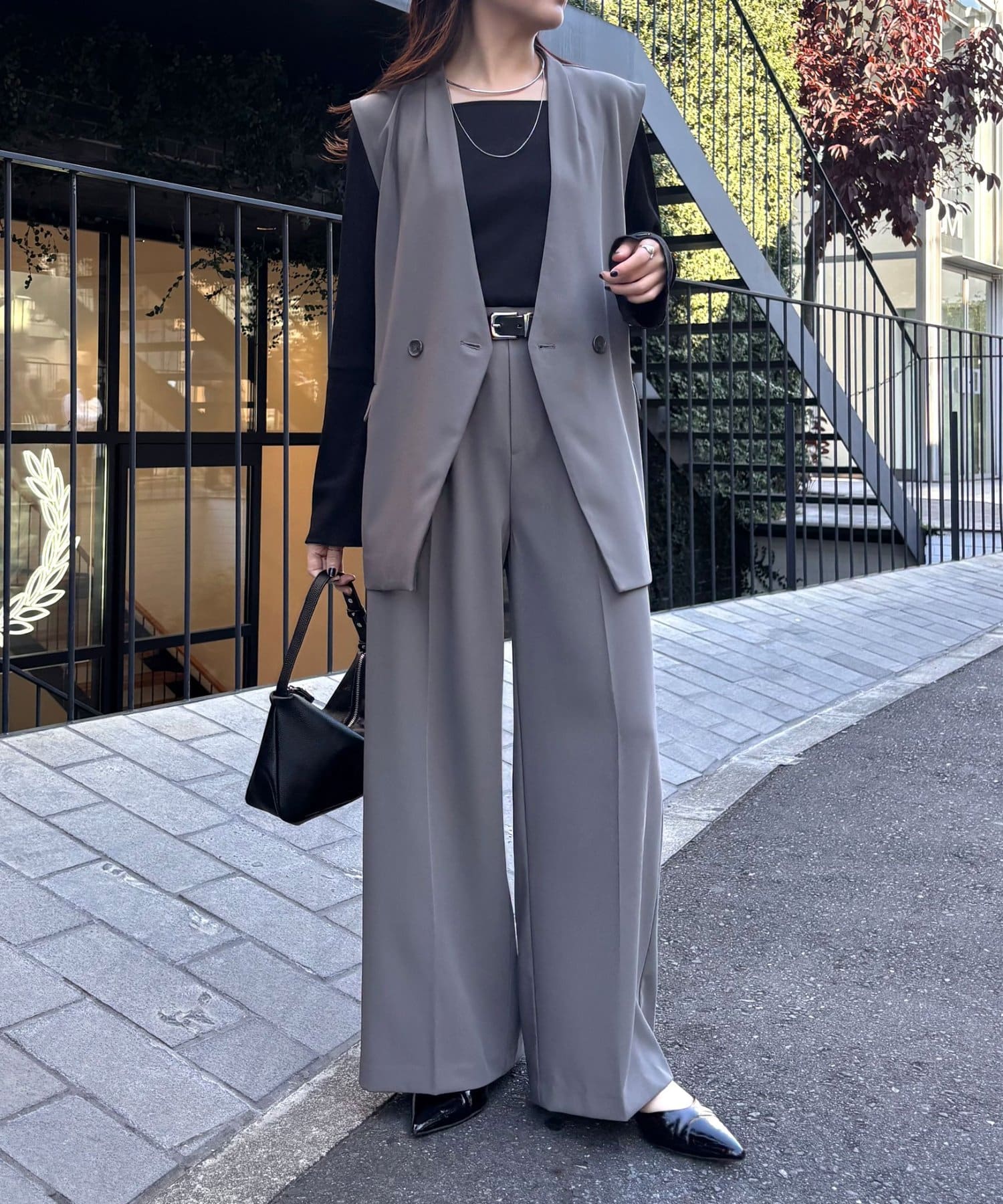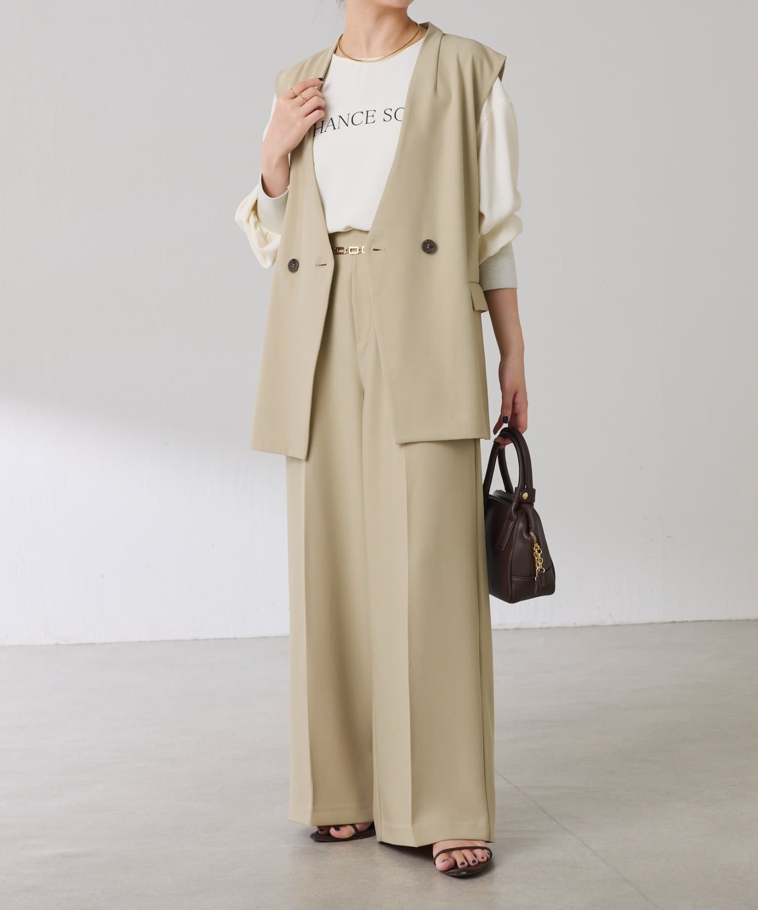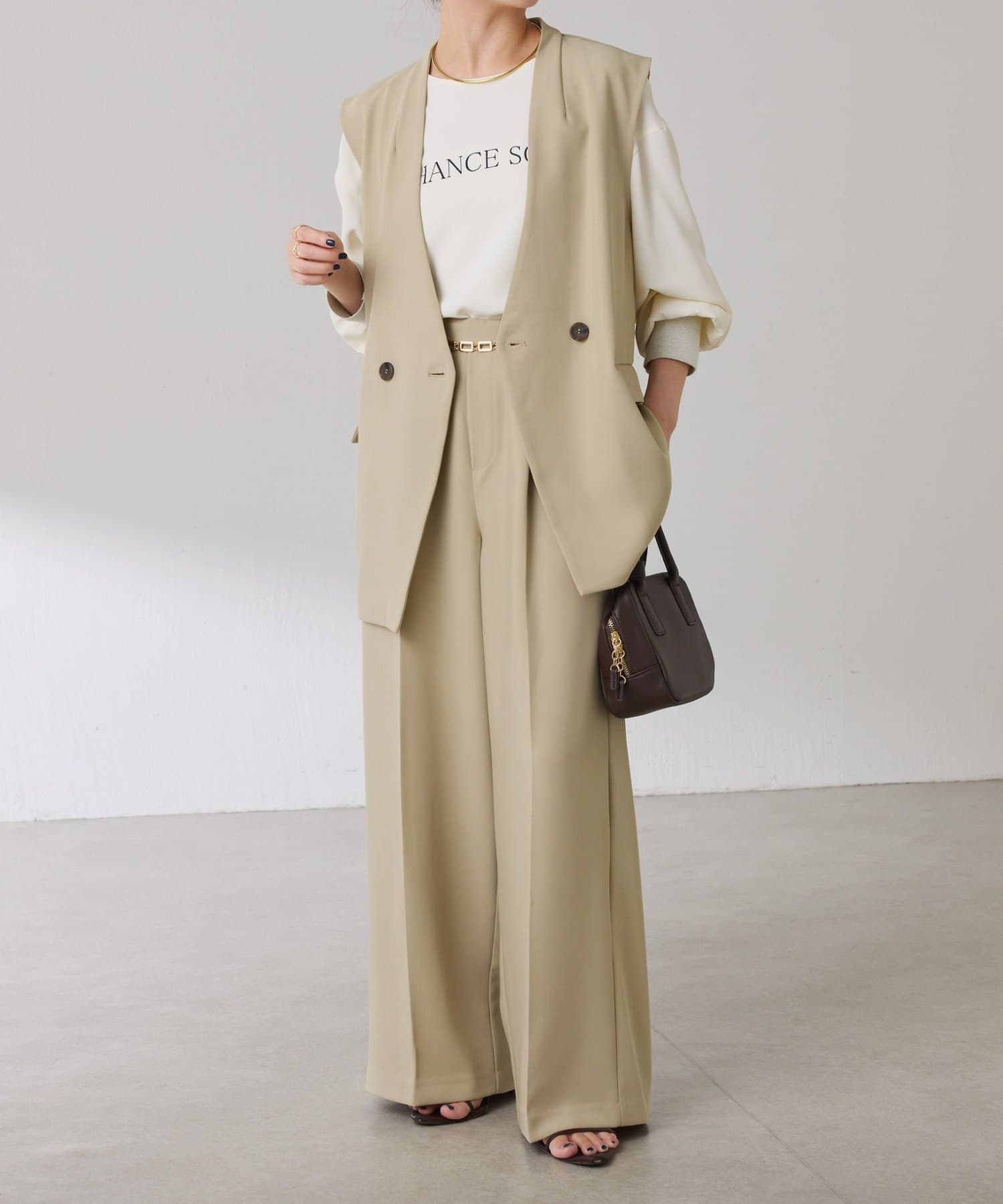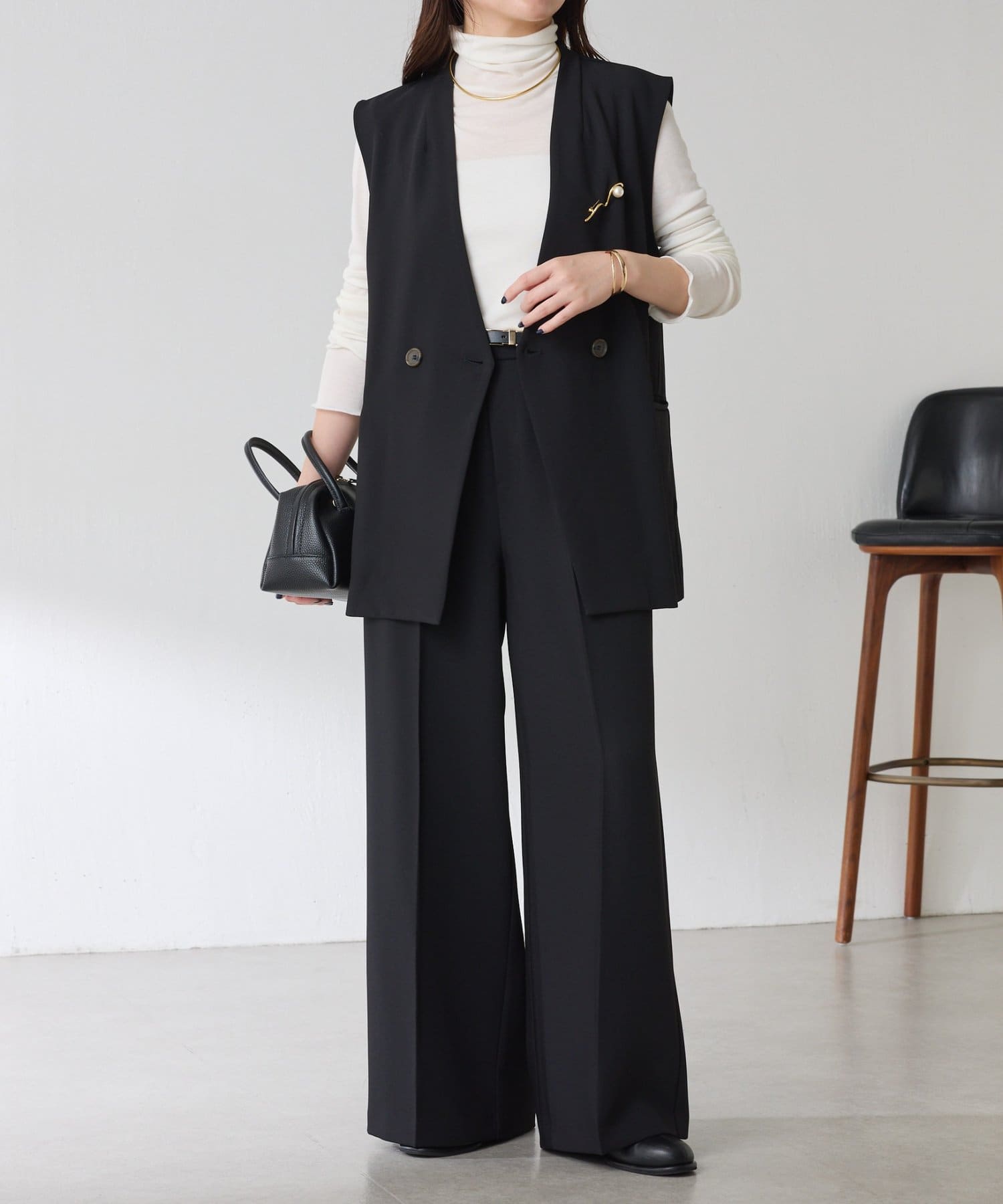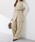 ・ノーカラーですっきり着られるジレとワイドパンツのセットアイテム。