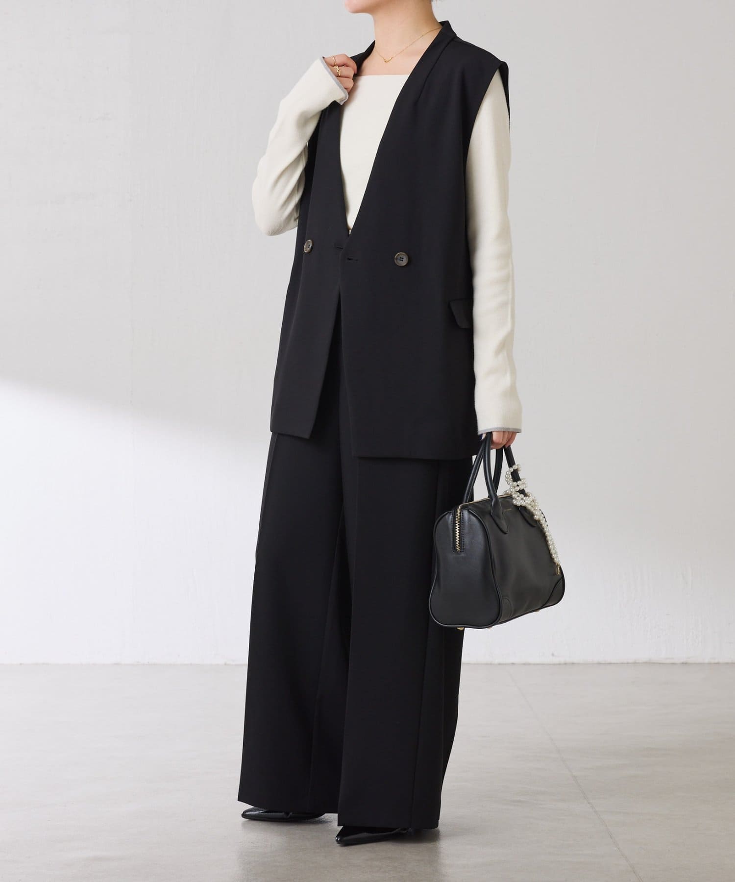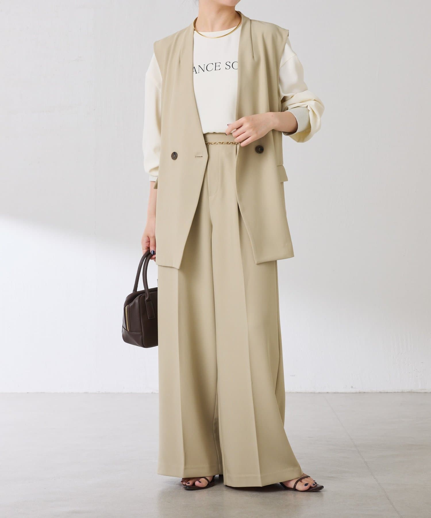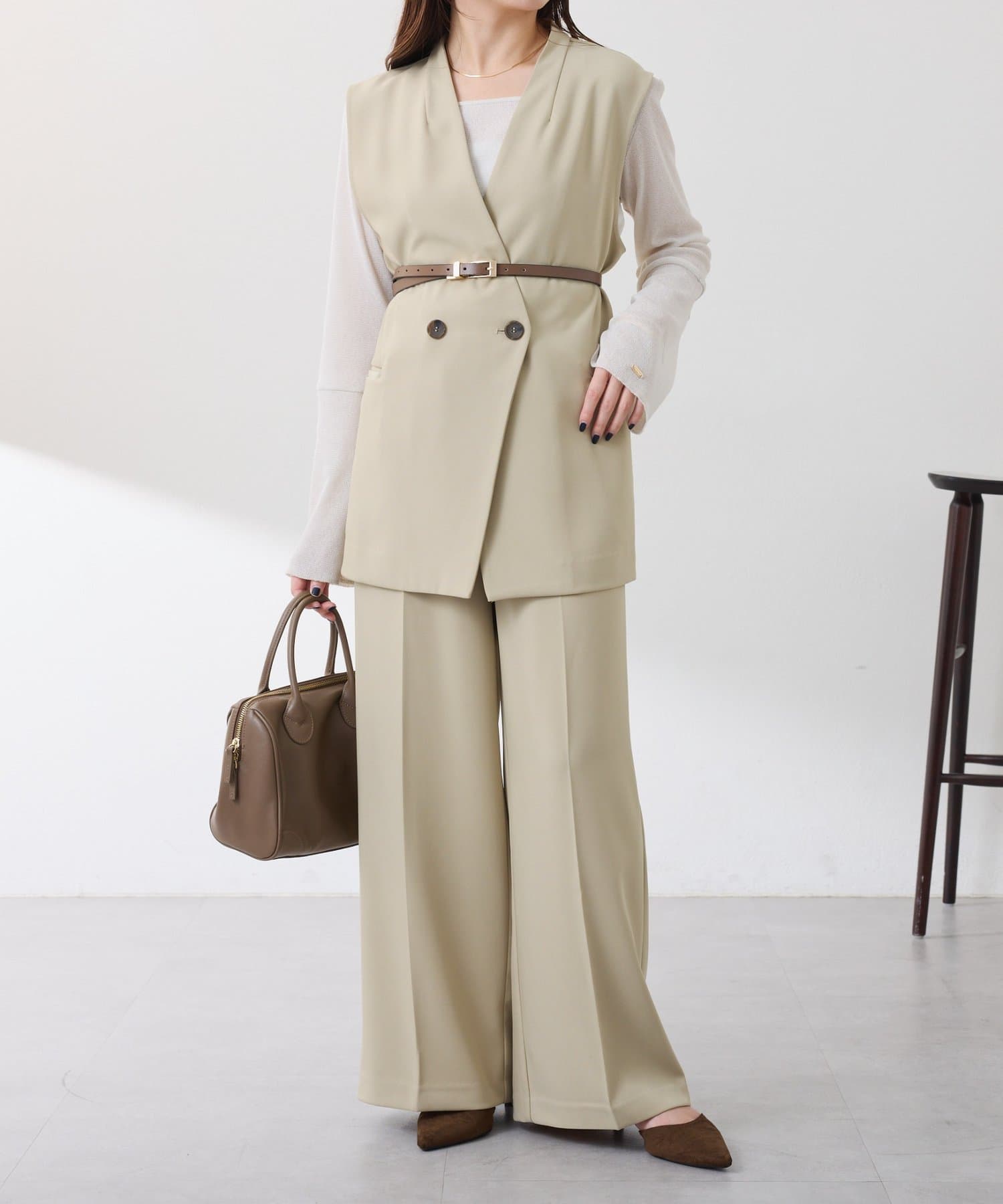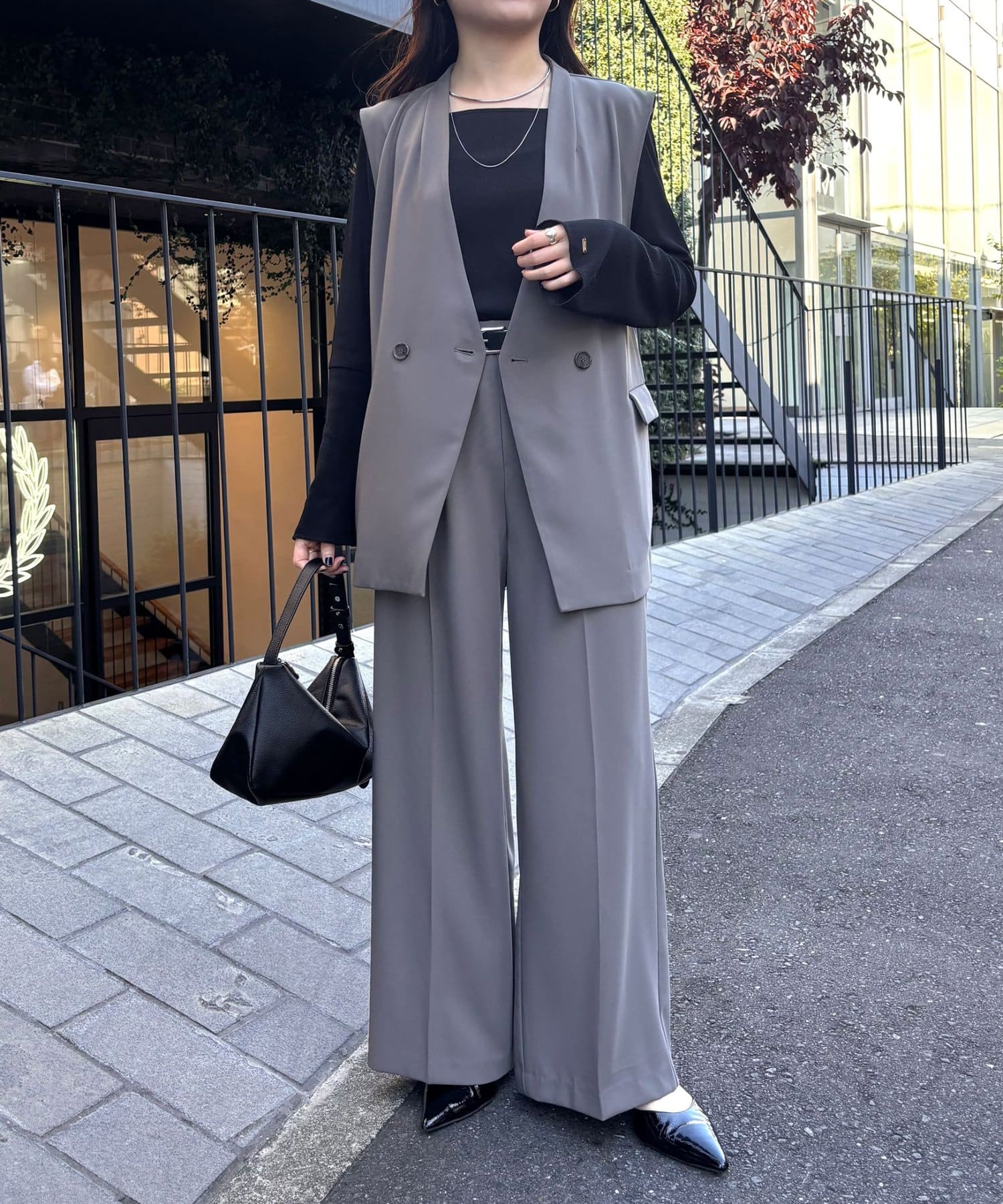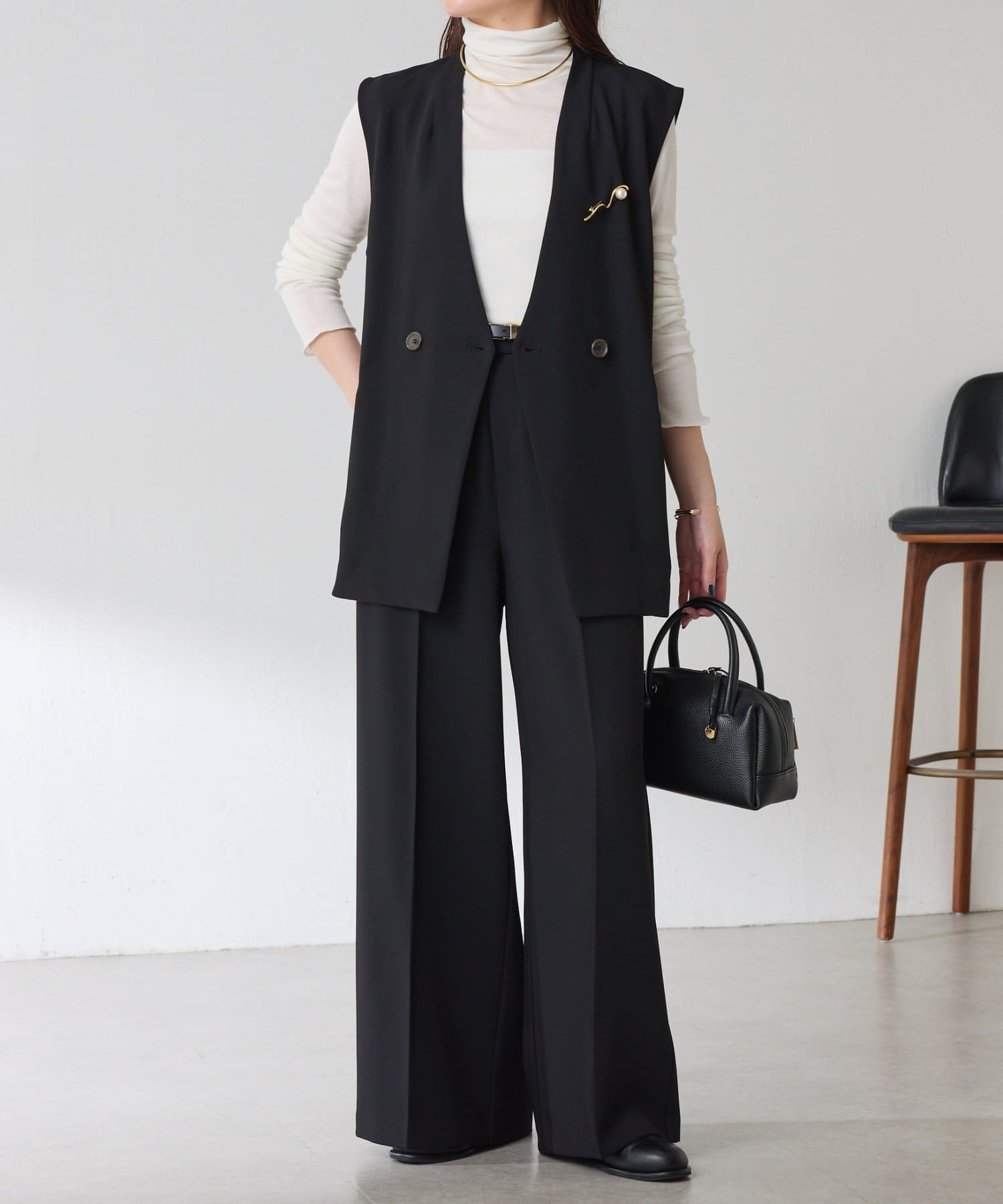 ・ノーカラーですっきり着られるジレとワイドパンツのセットアイテム。