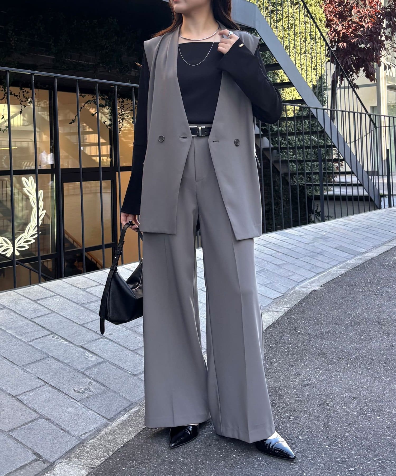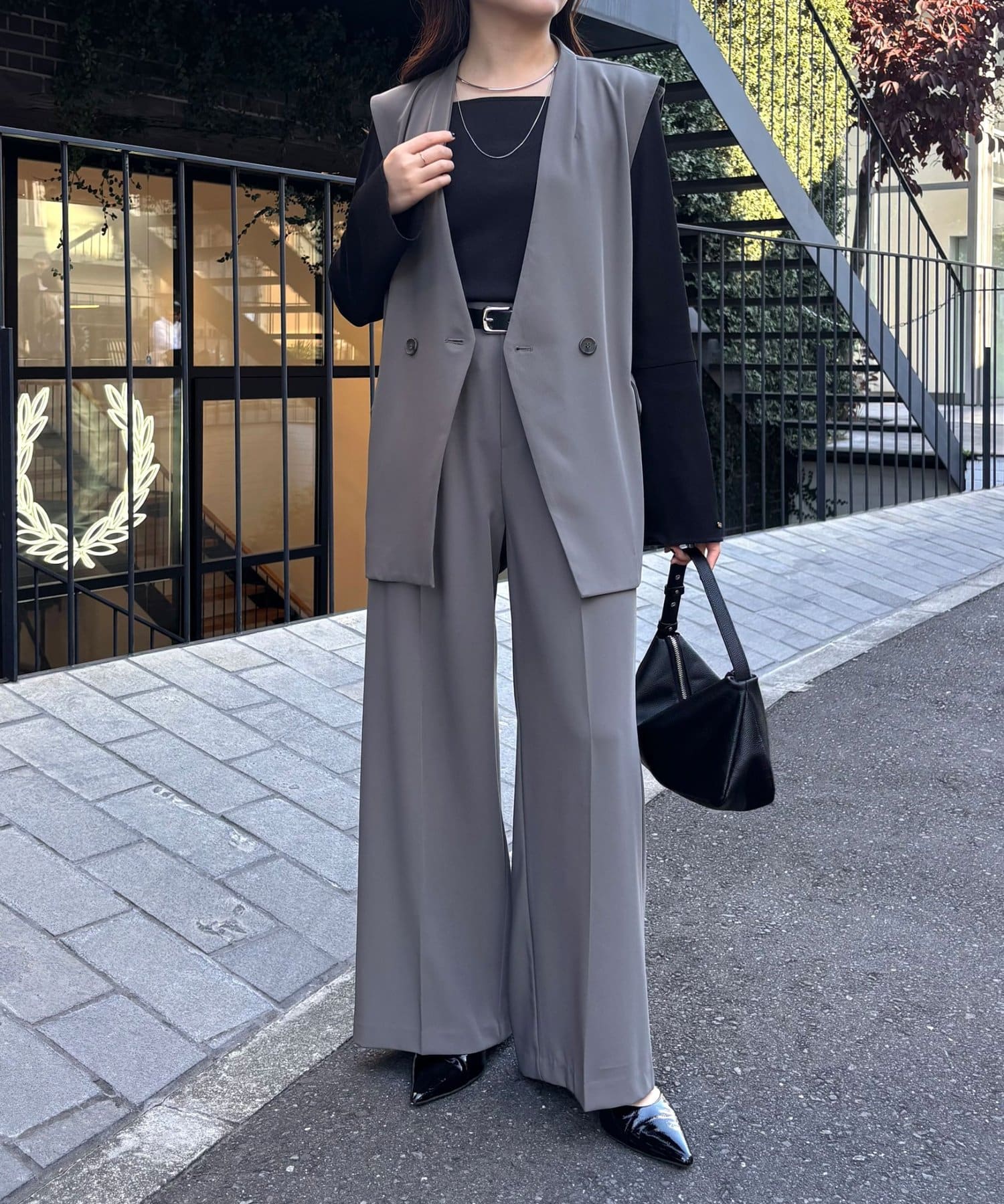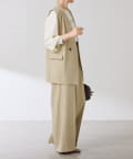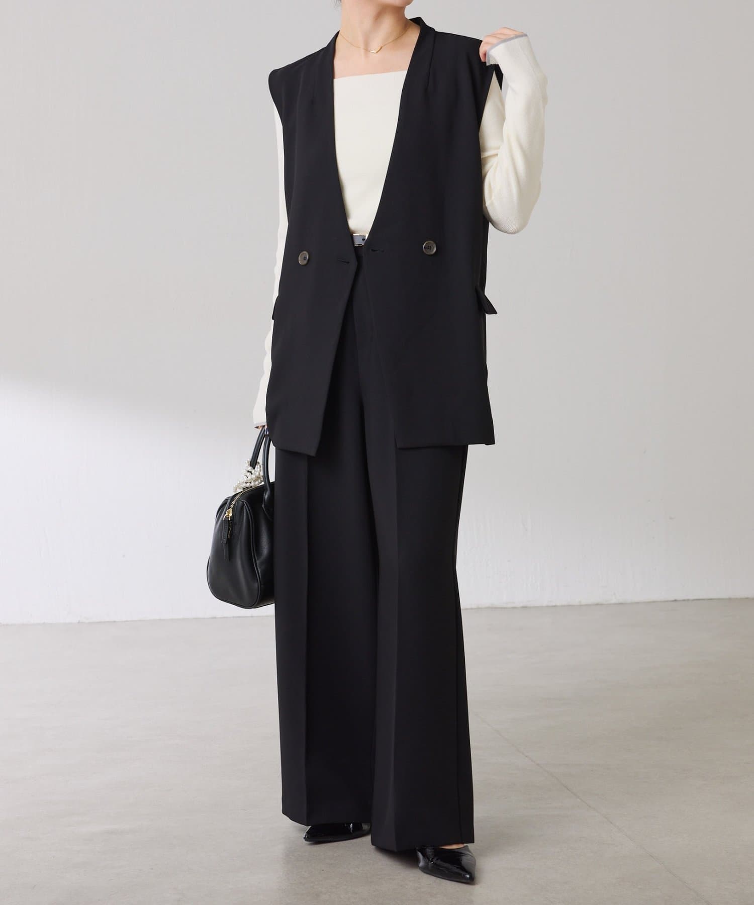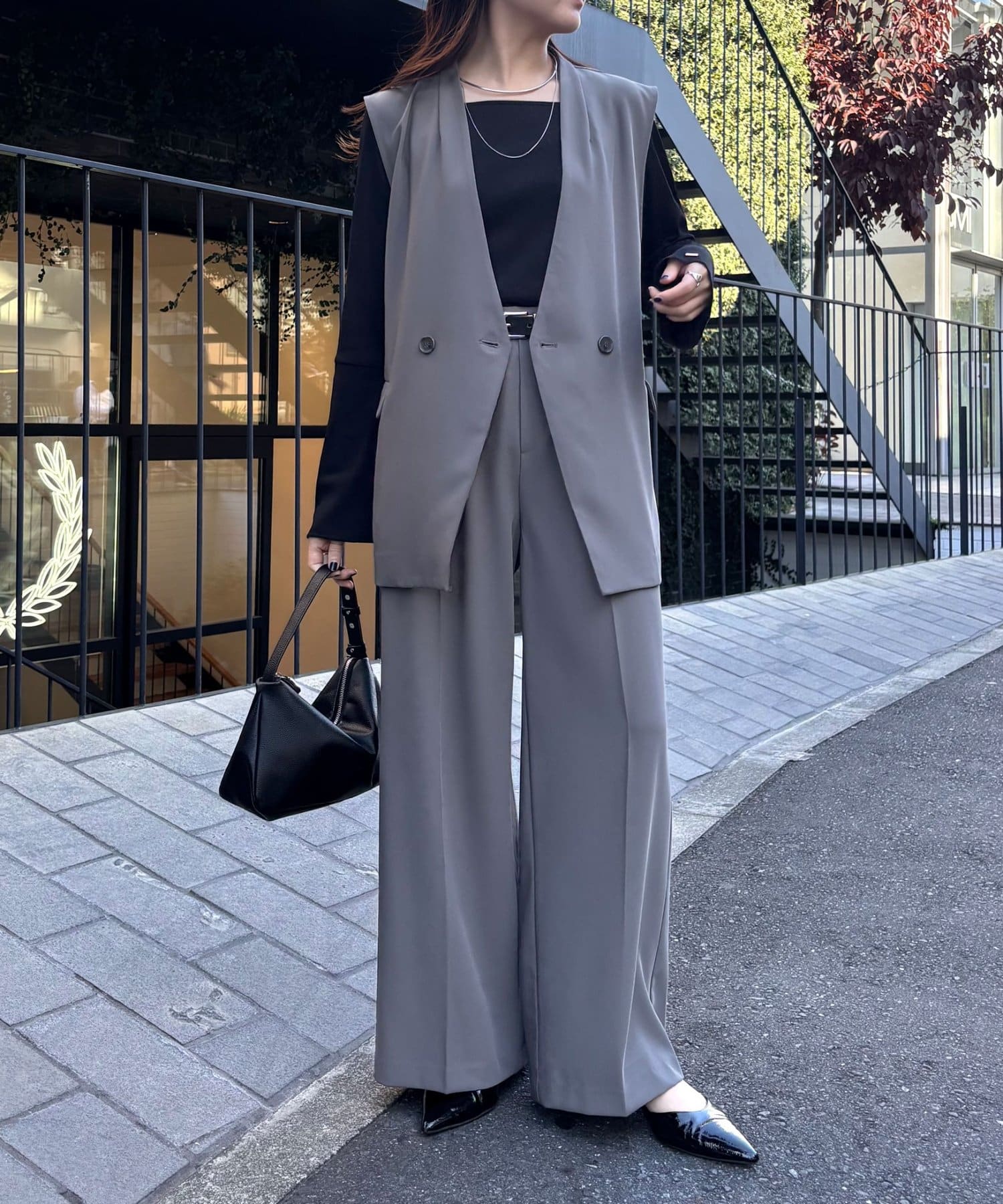・ノーカラーですっきり着られるジレとワイドパンツのセットアイテム。