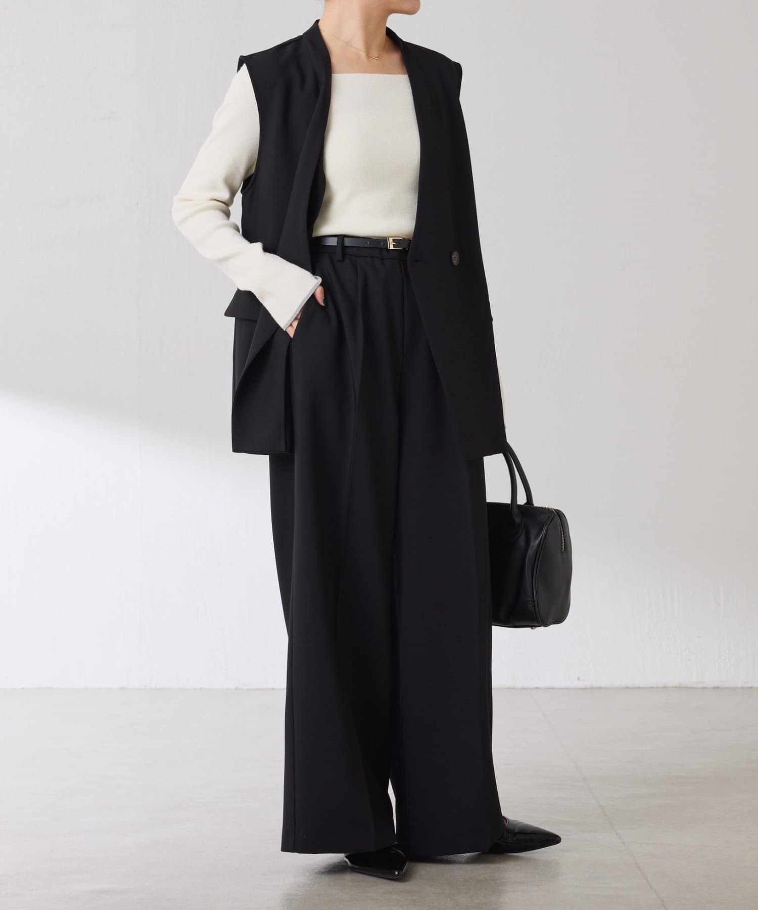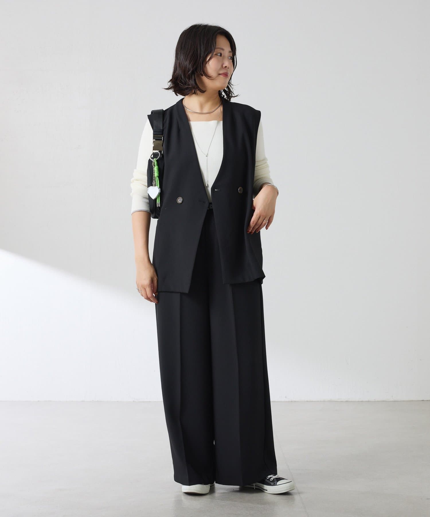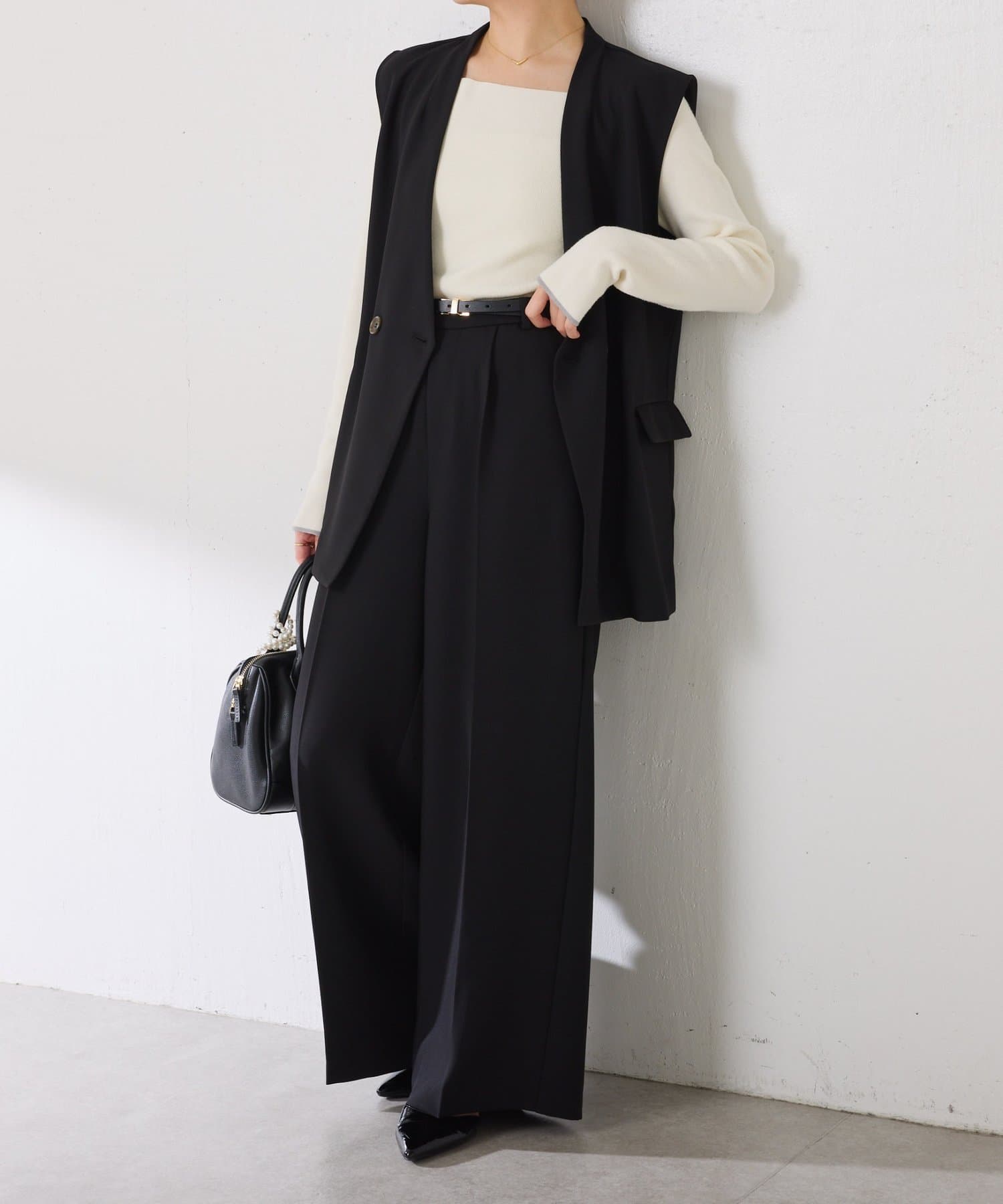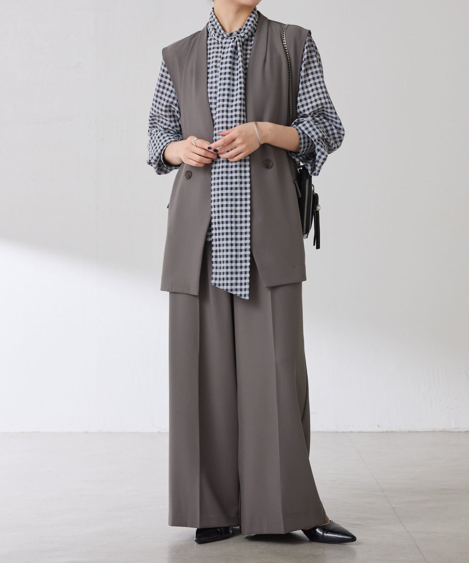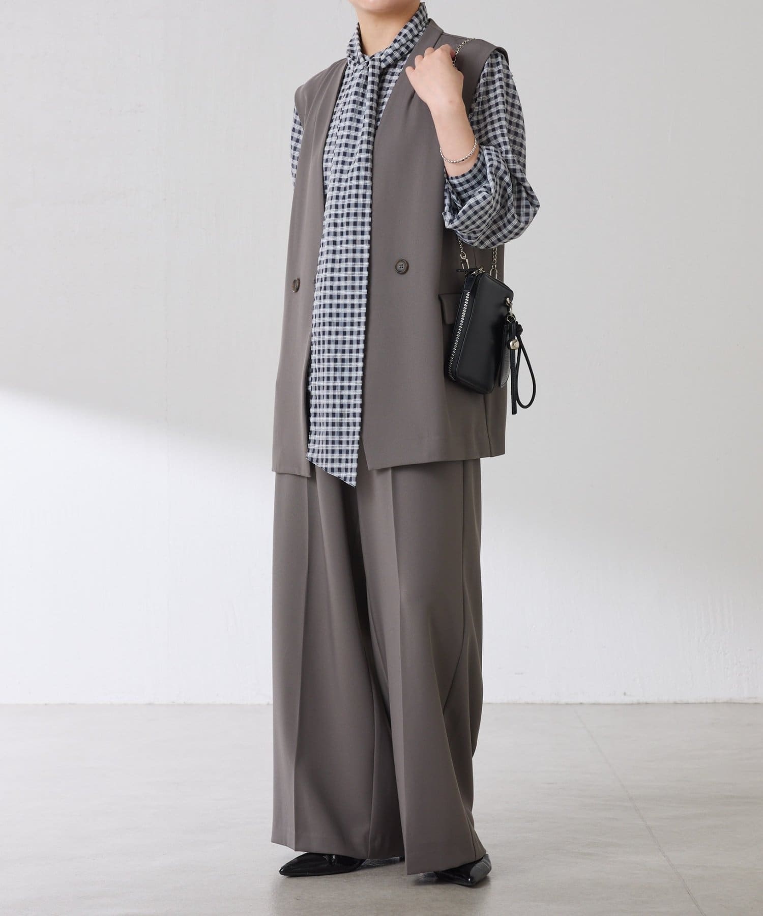 ・ノーカラーですっきり着られるジレとワイドパンツのセットアイテム。