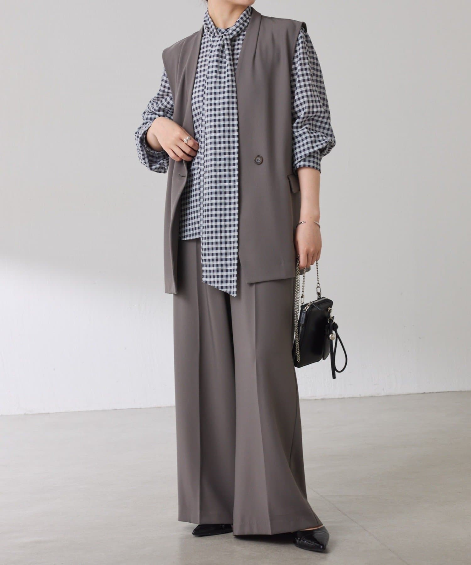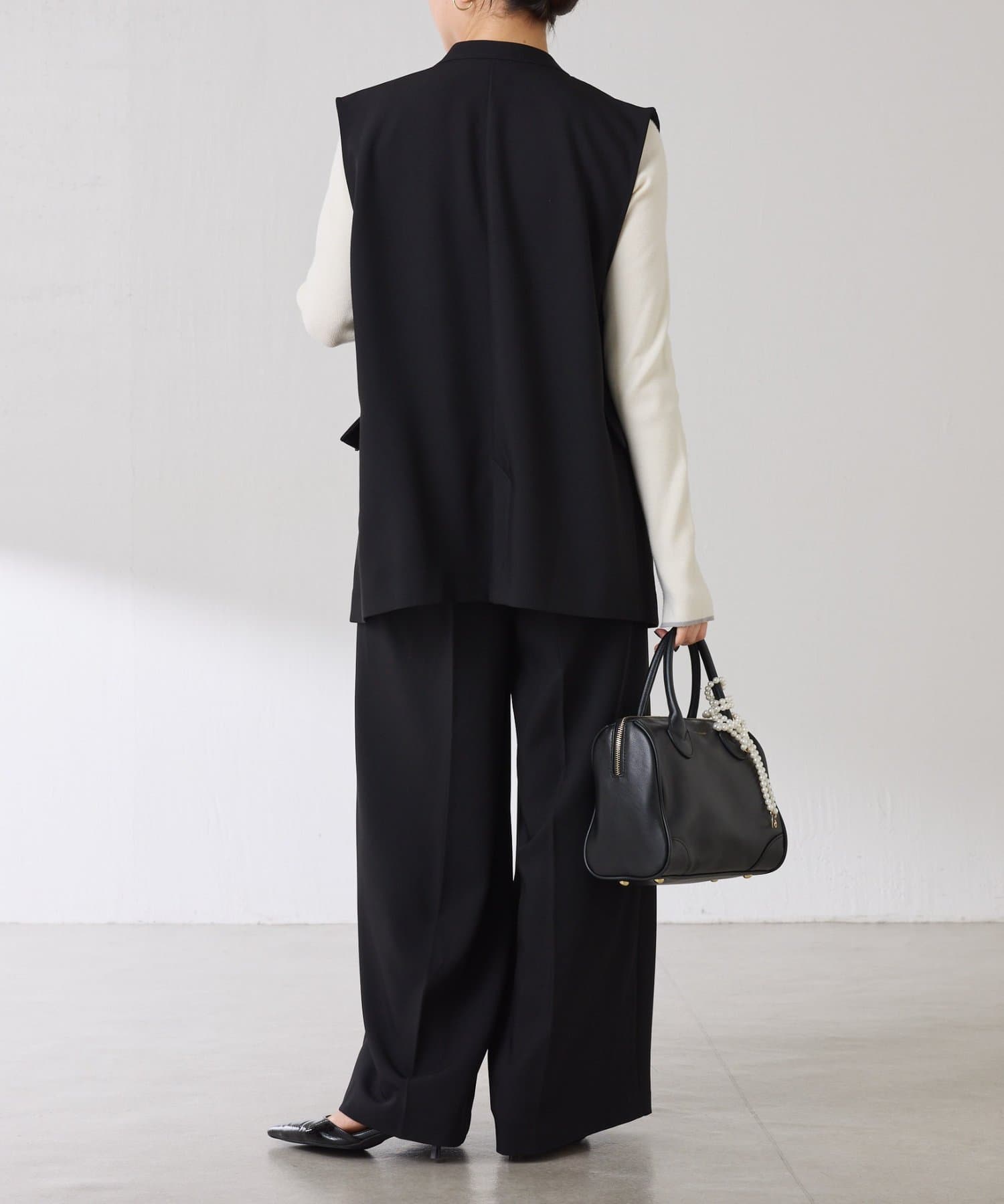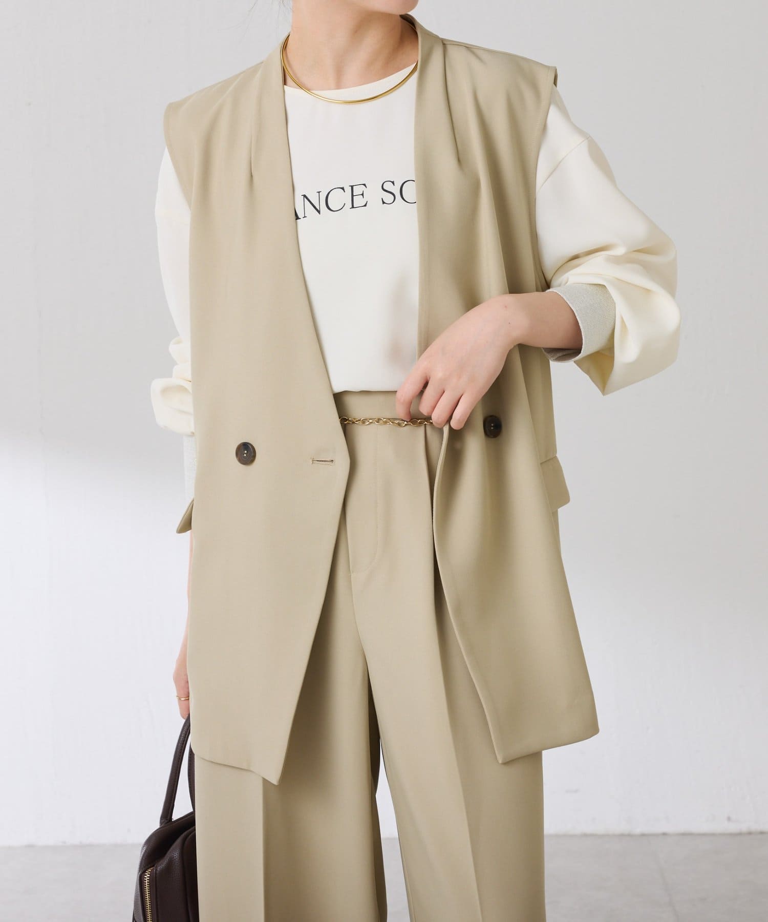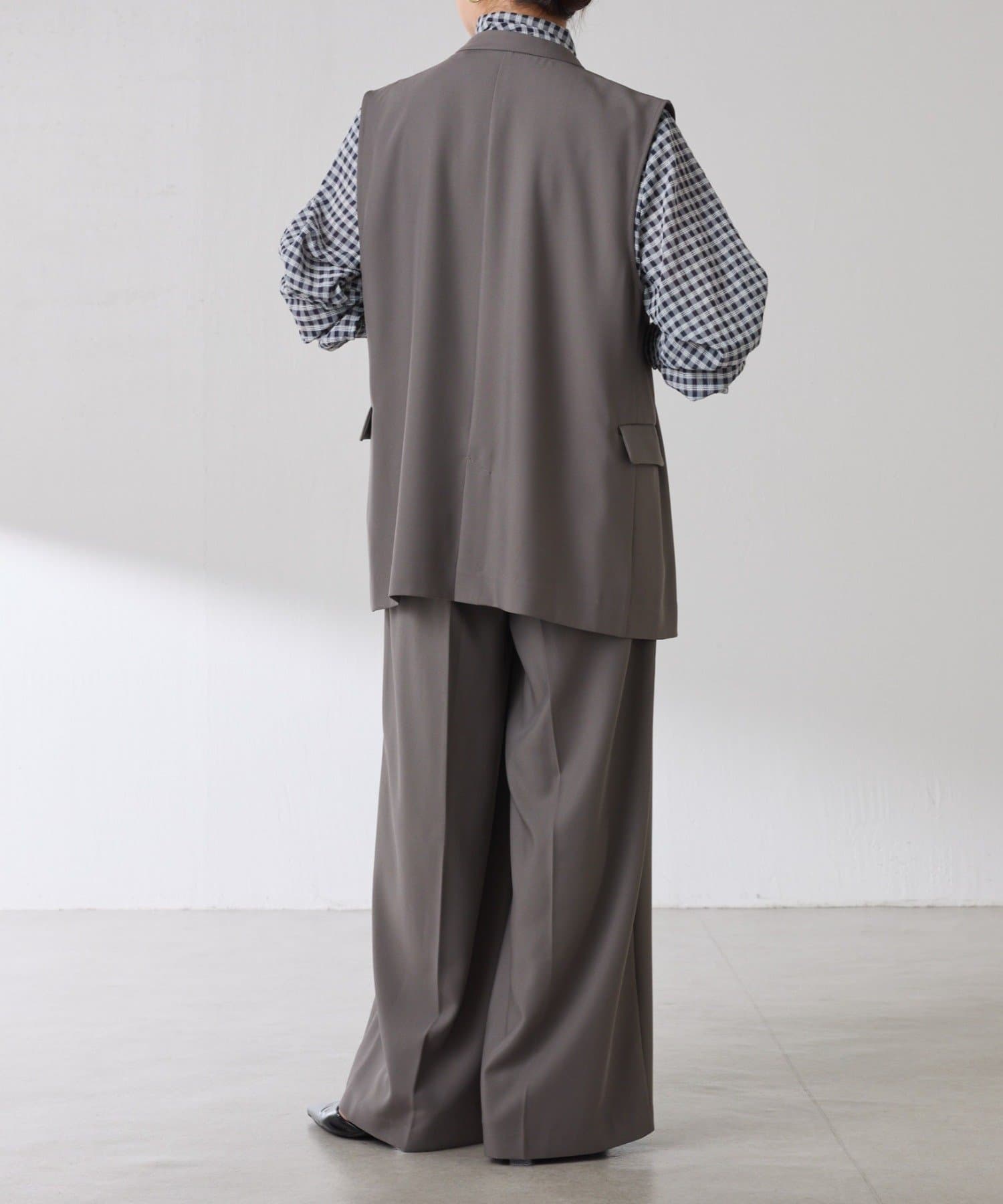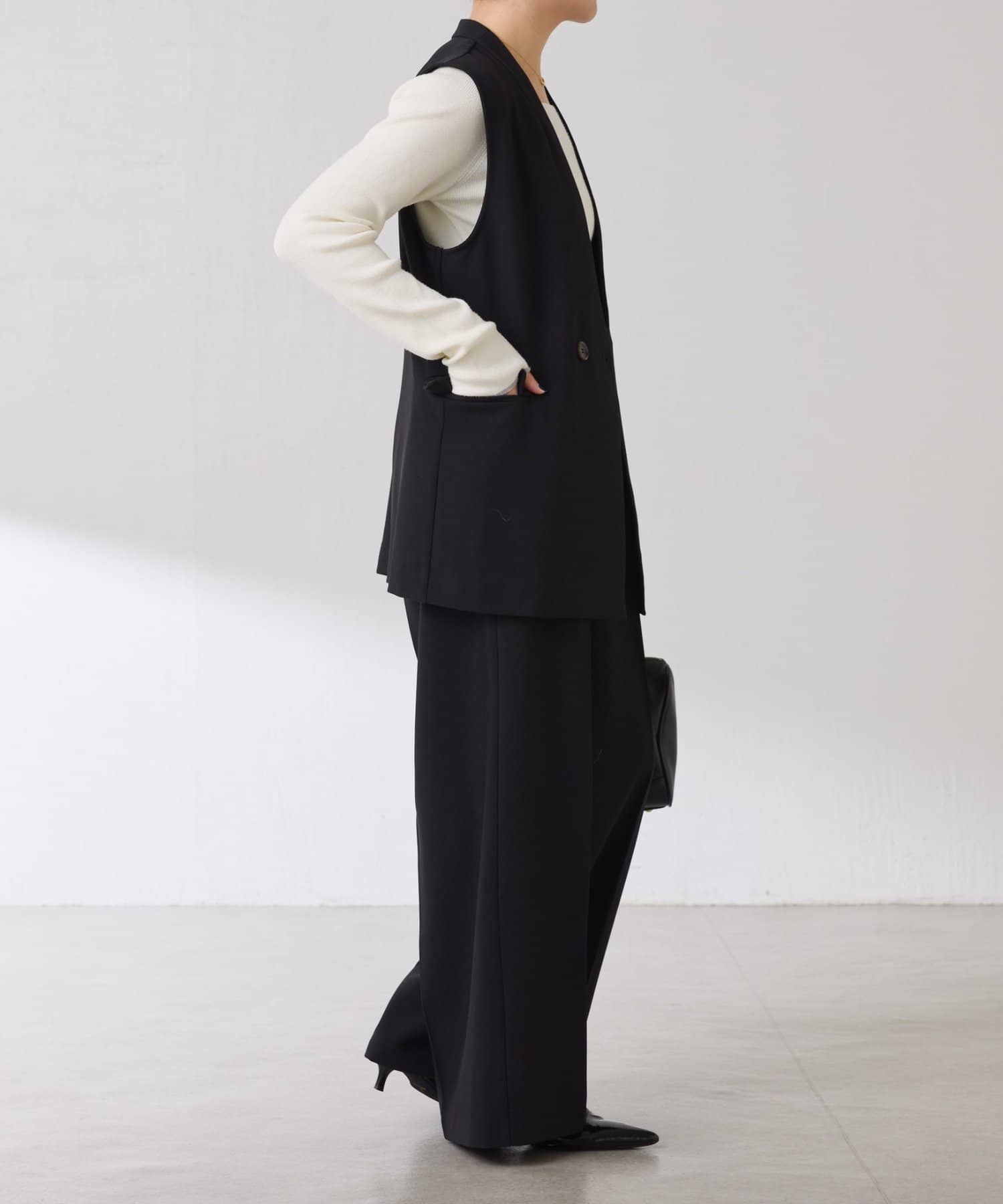 ・ノーカラーですっきり着られるジレとワイドパンツのセットアイテム。