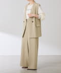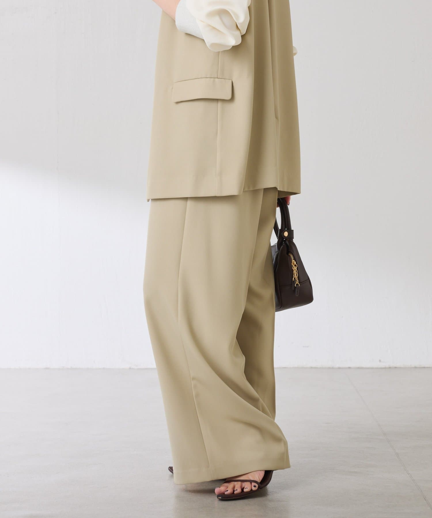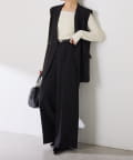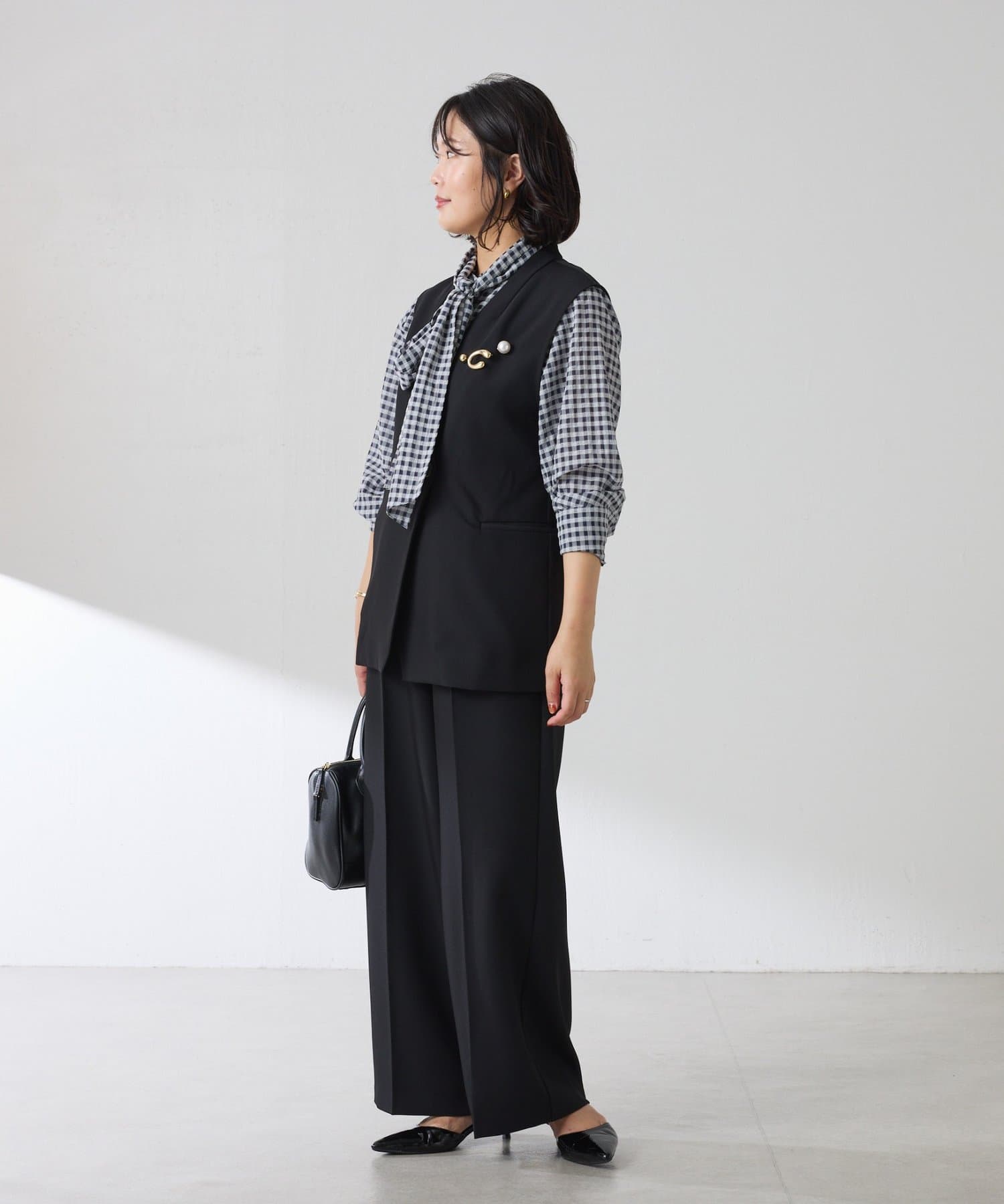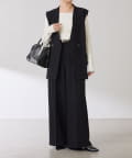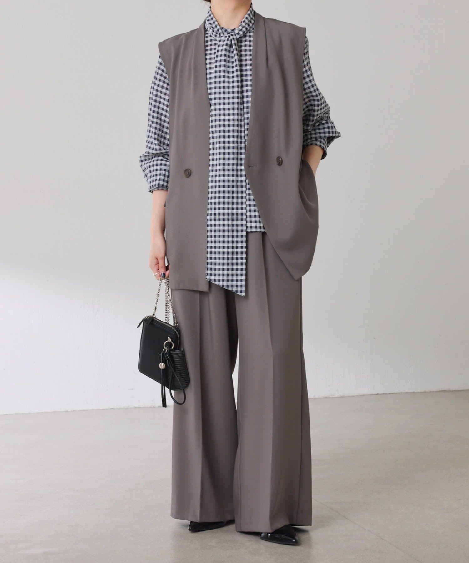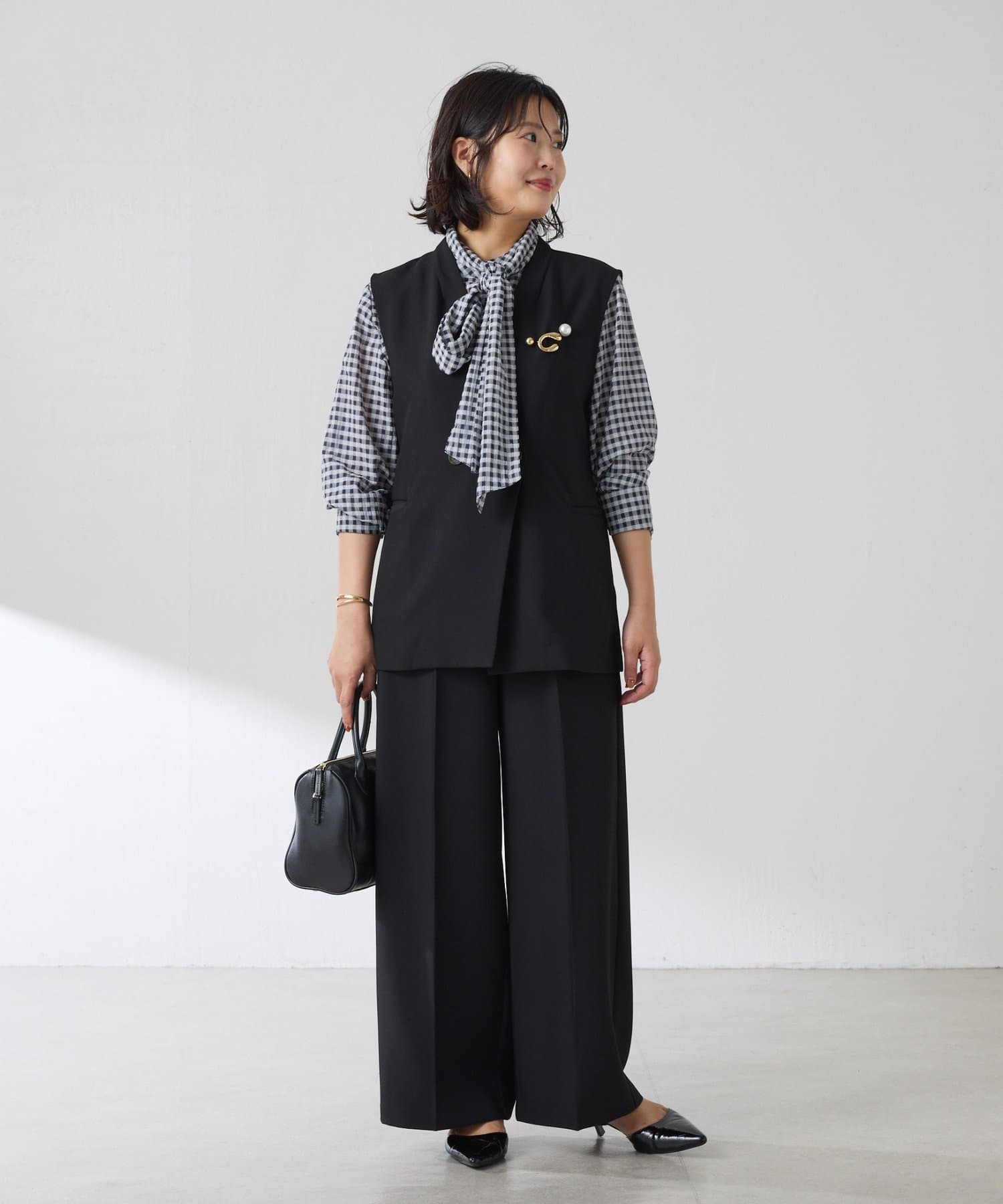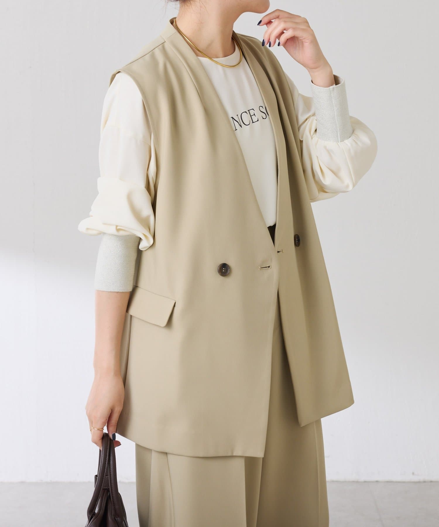 ・ノーカラーですっきり着られるジレとワイドパンツのセットアイテム。