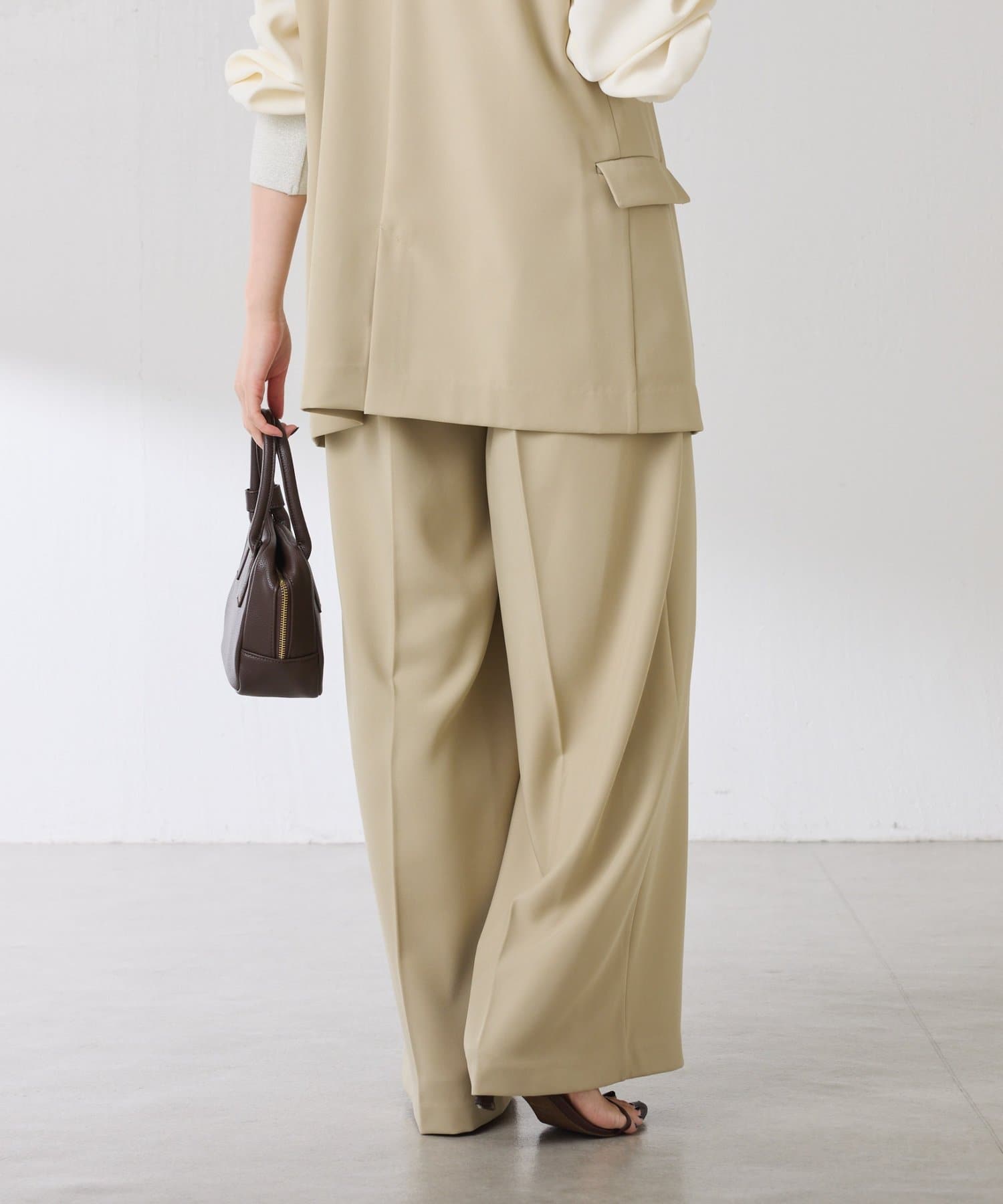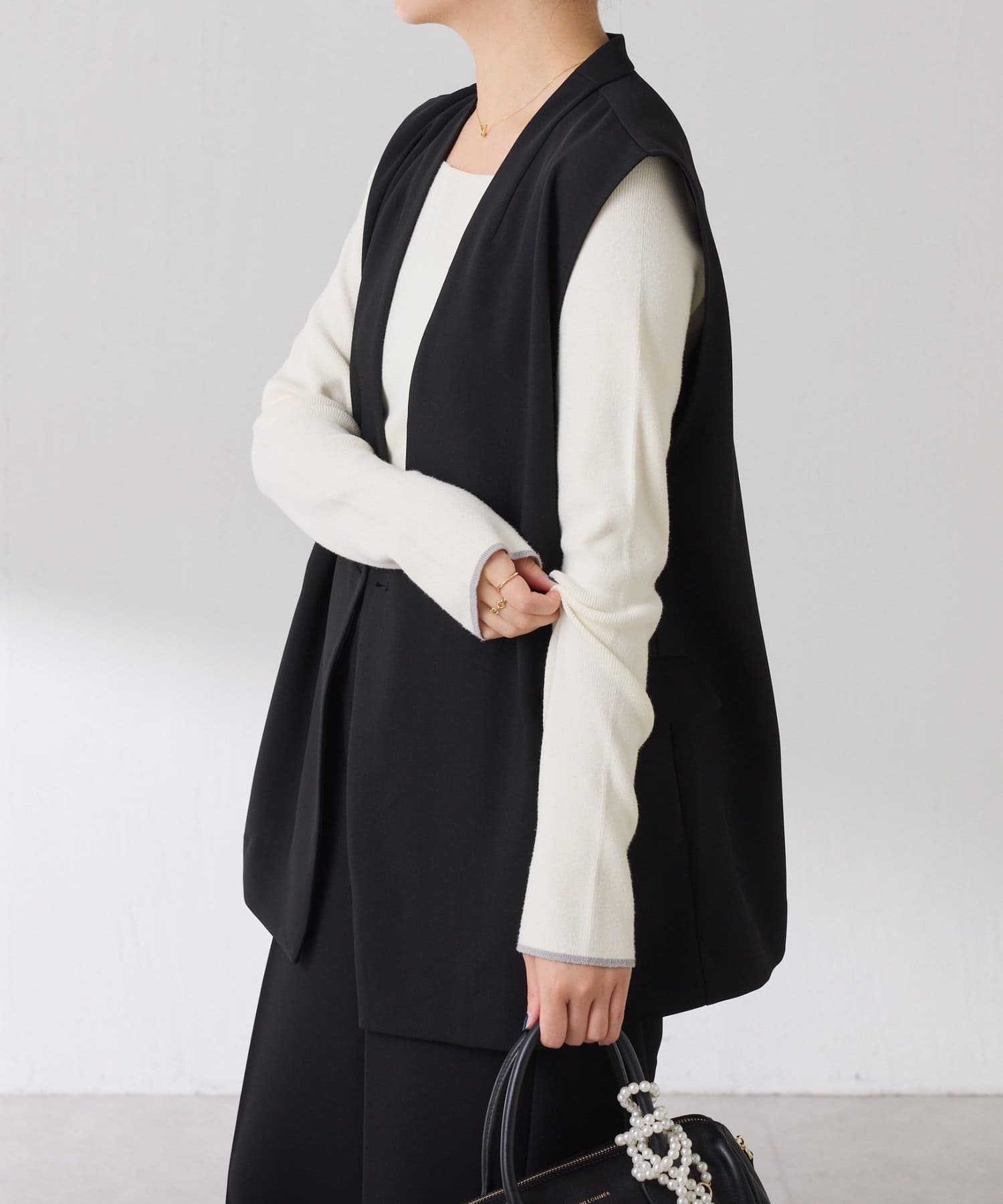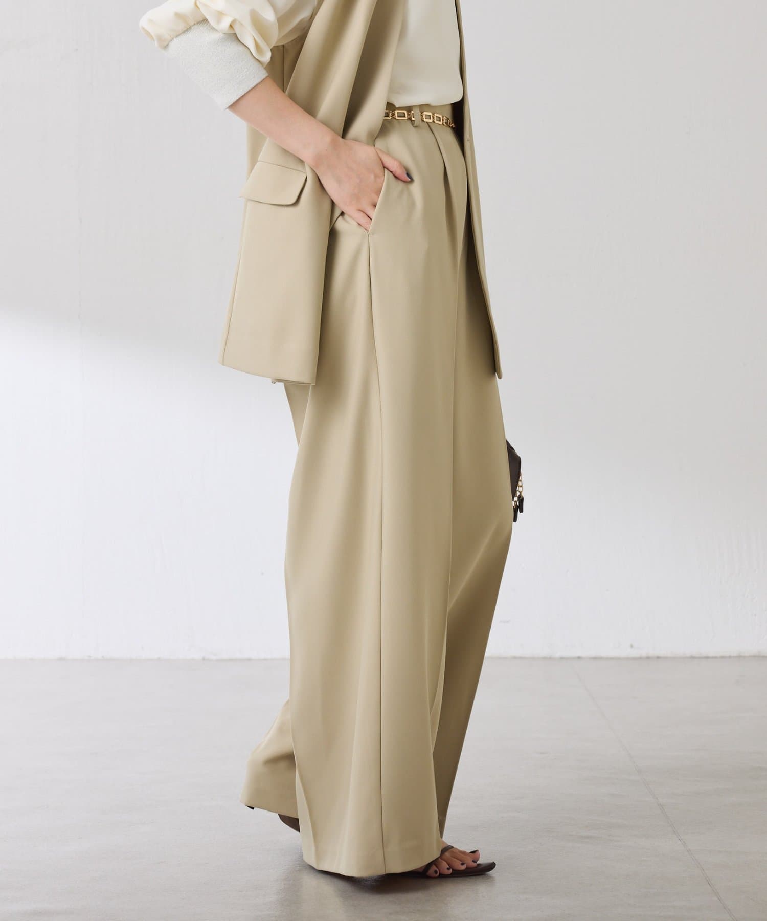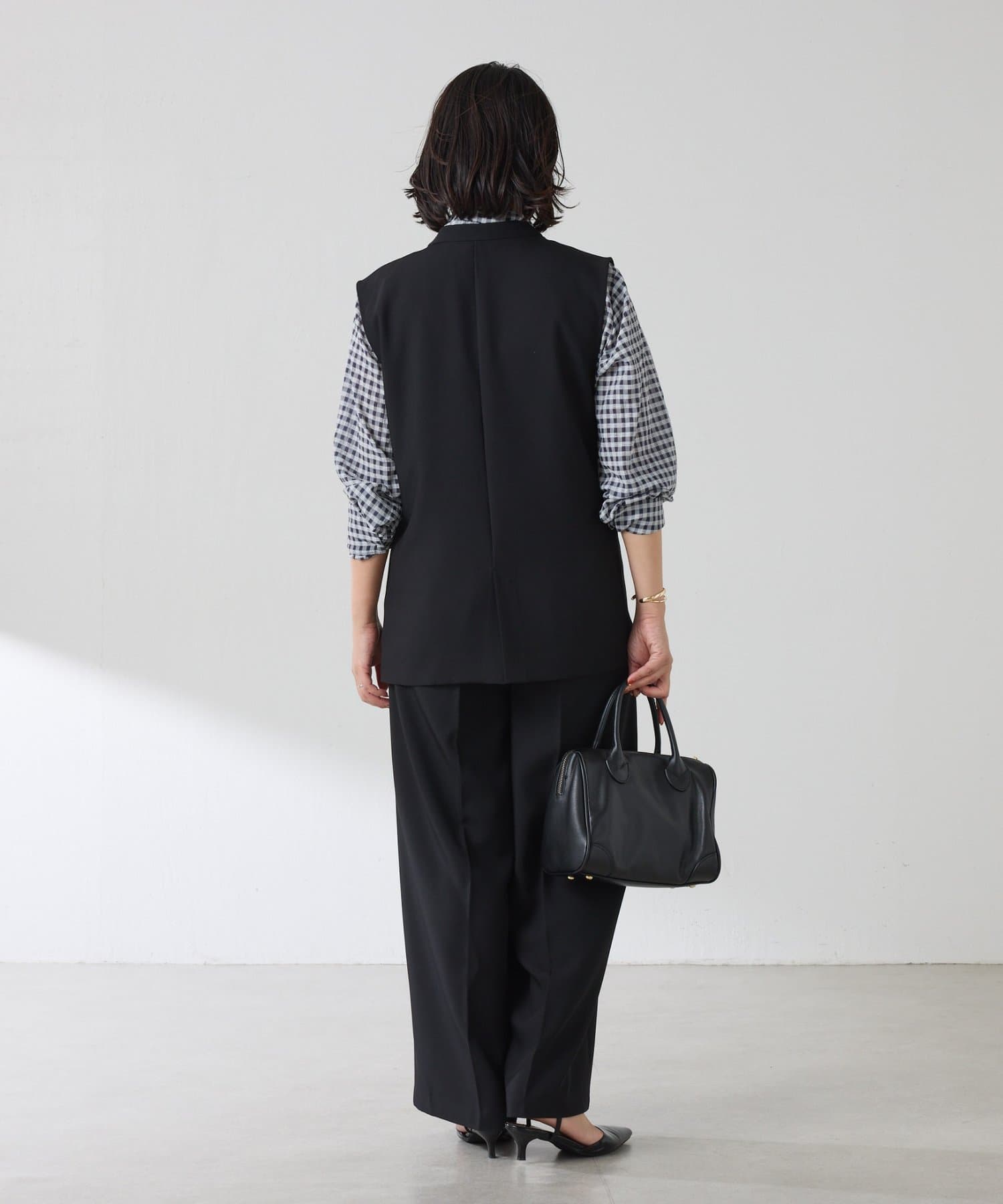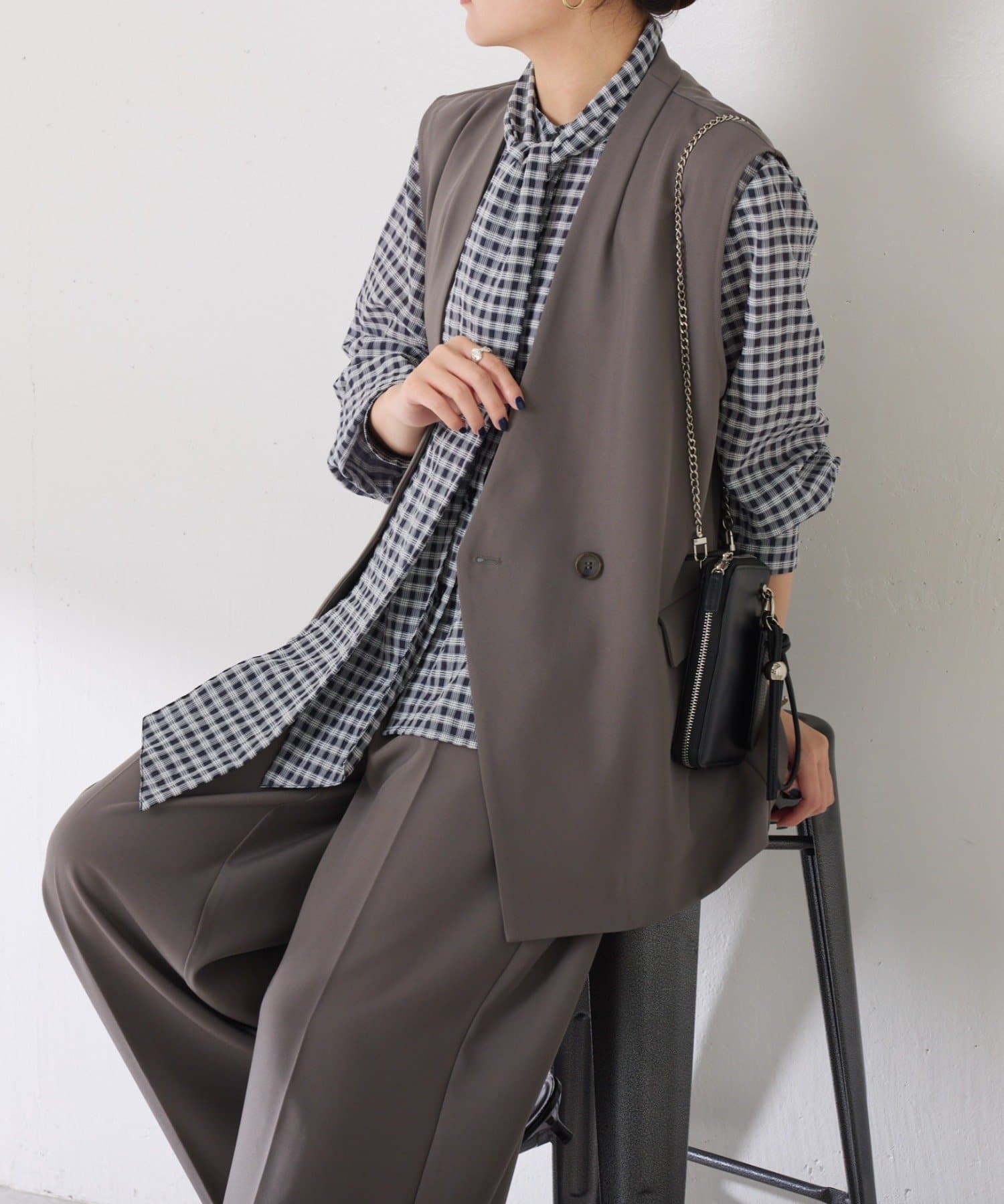 ・ノーカラーですっきり着られるジレとワイドパンツのセットアイテム。