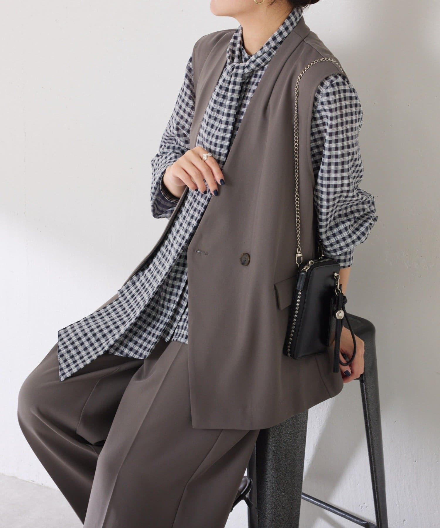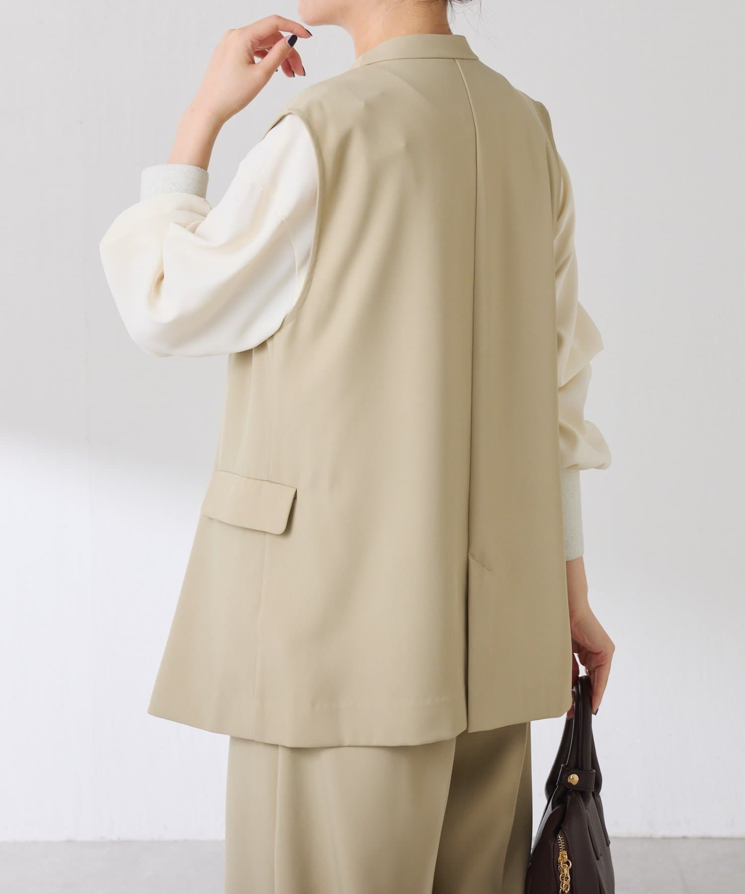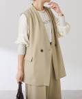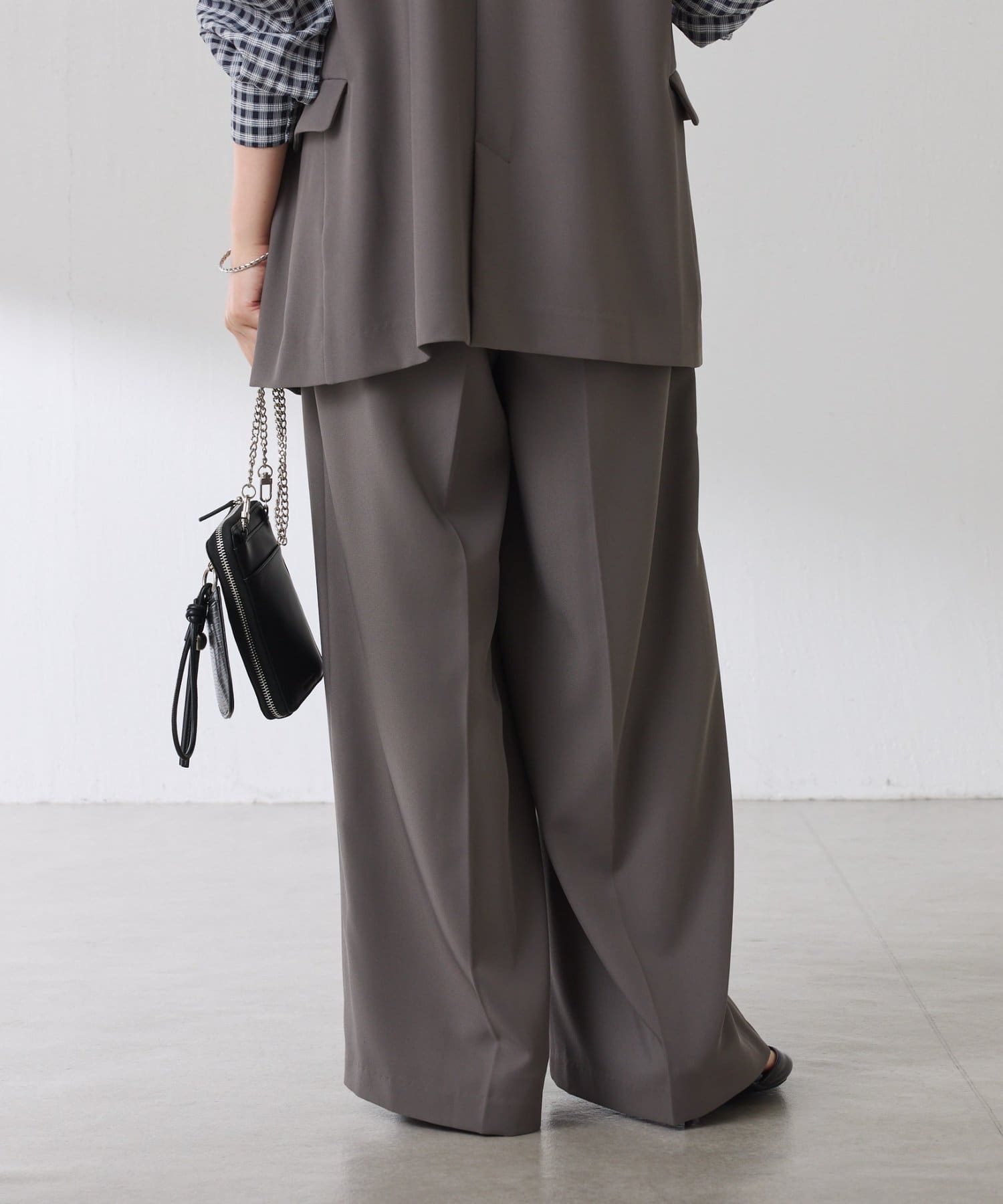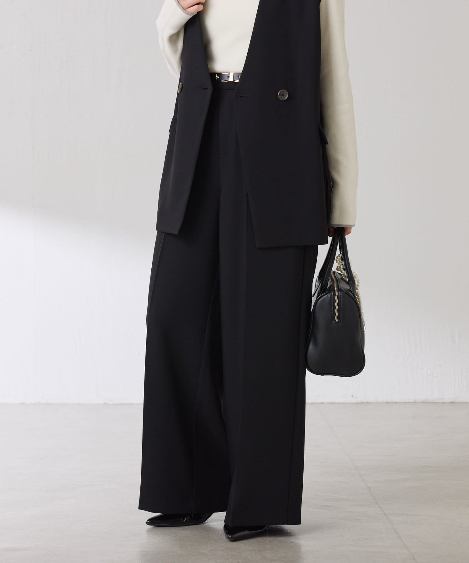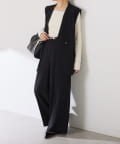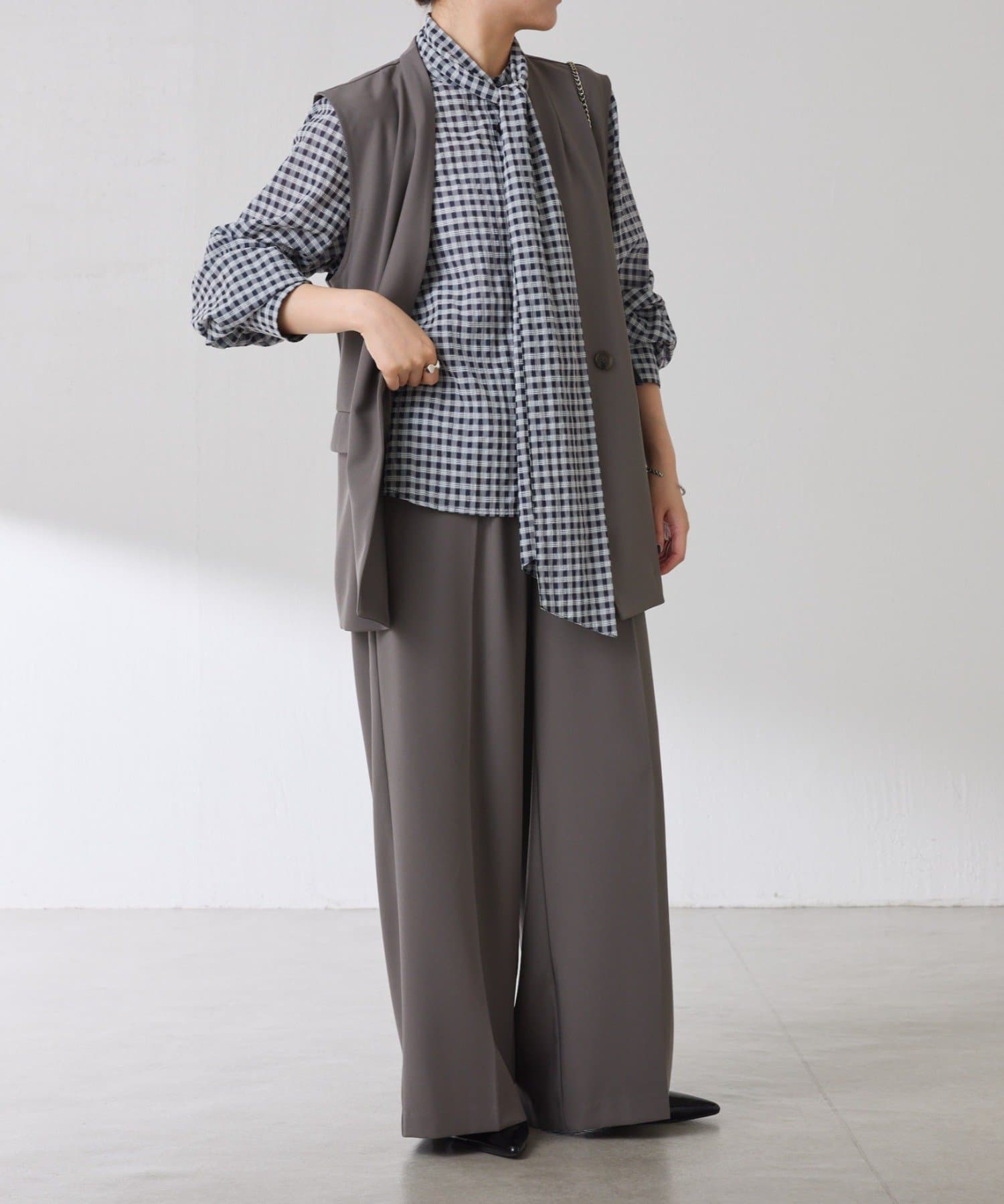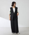 ・ノーカラーですっきり着られるジレとワイドパンツのセットアイテム。