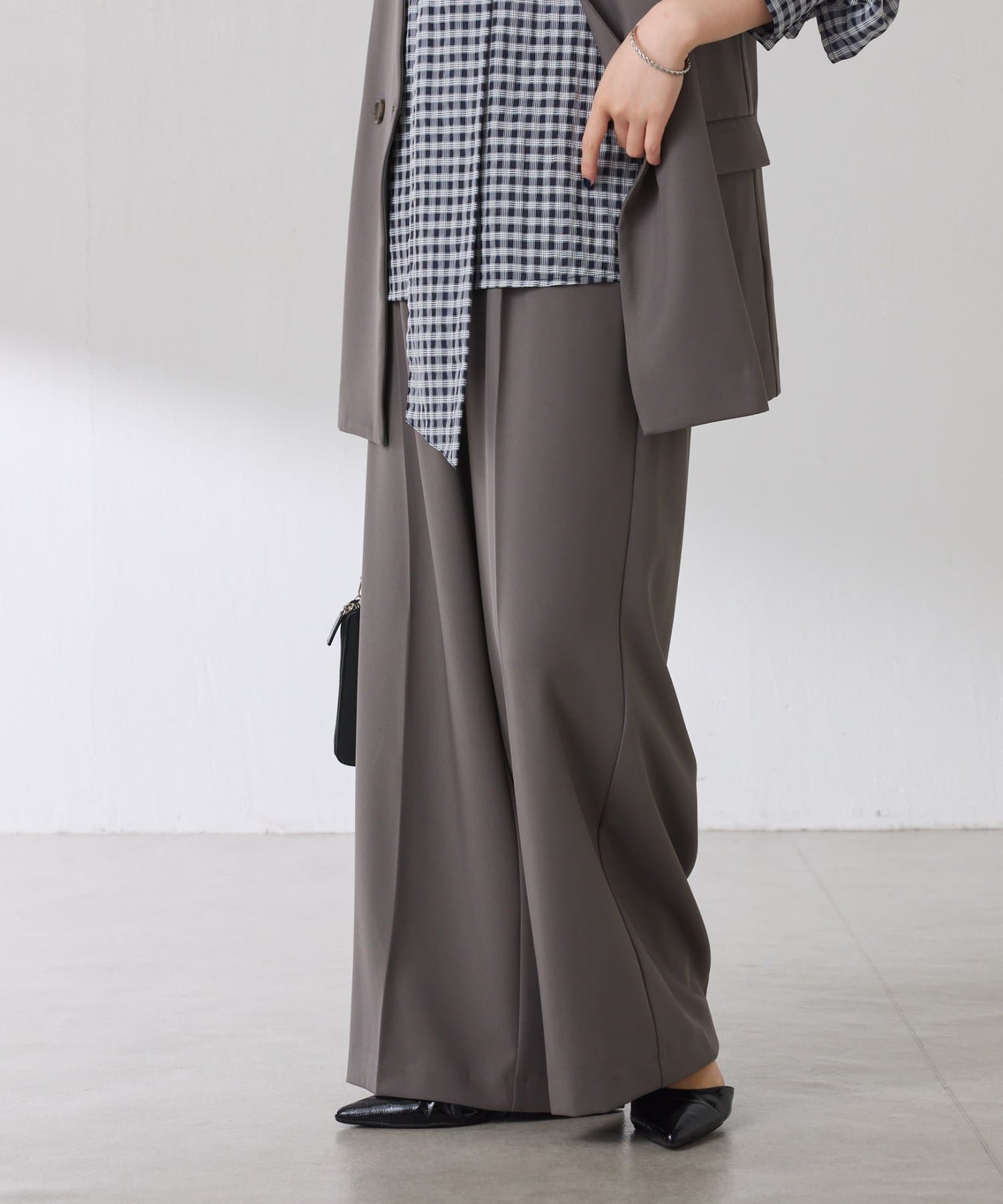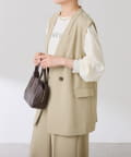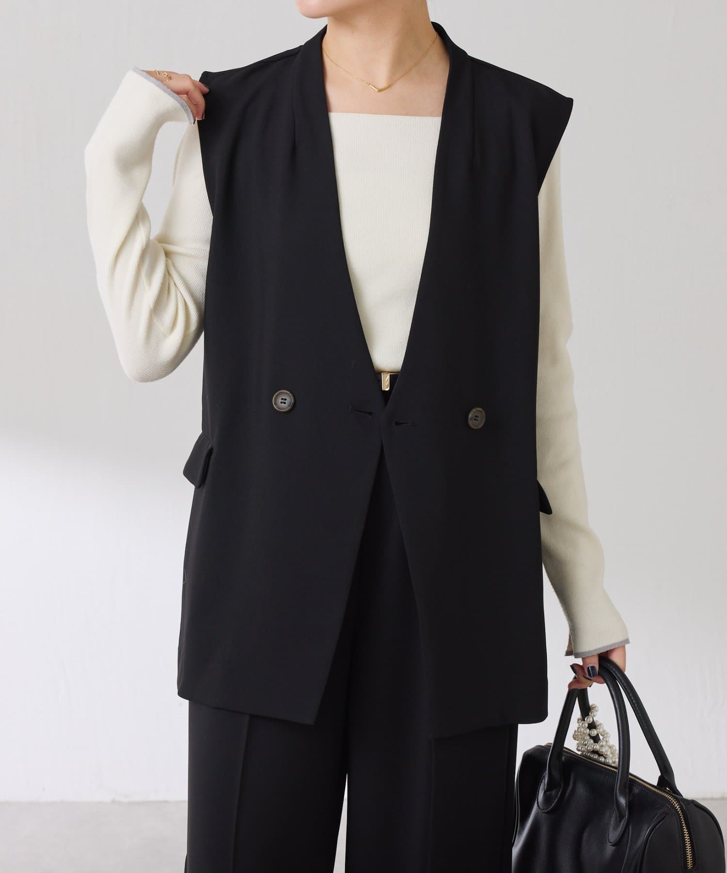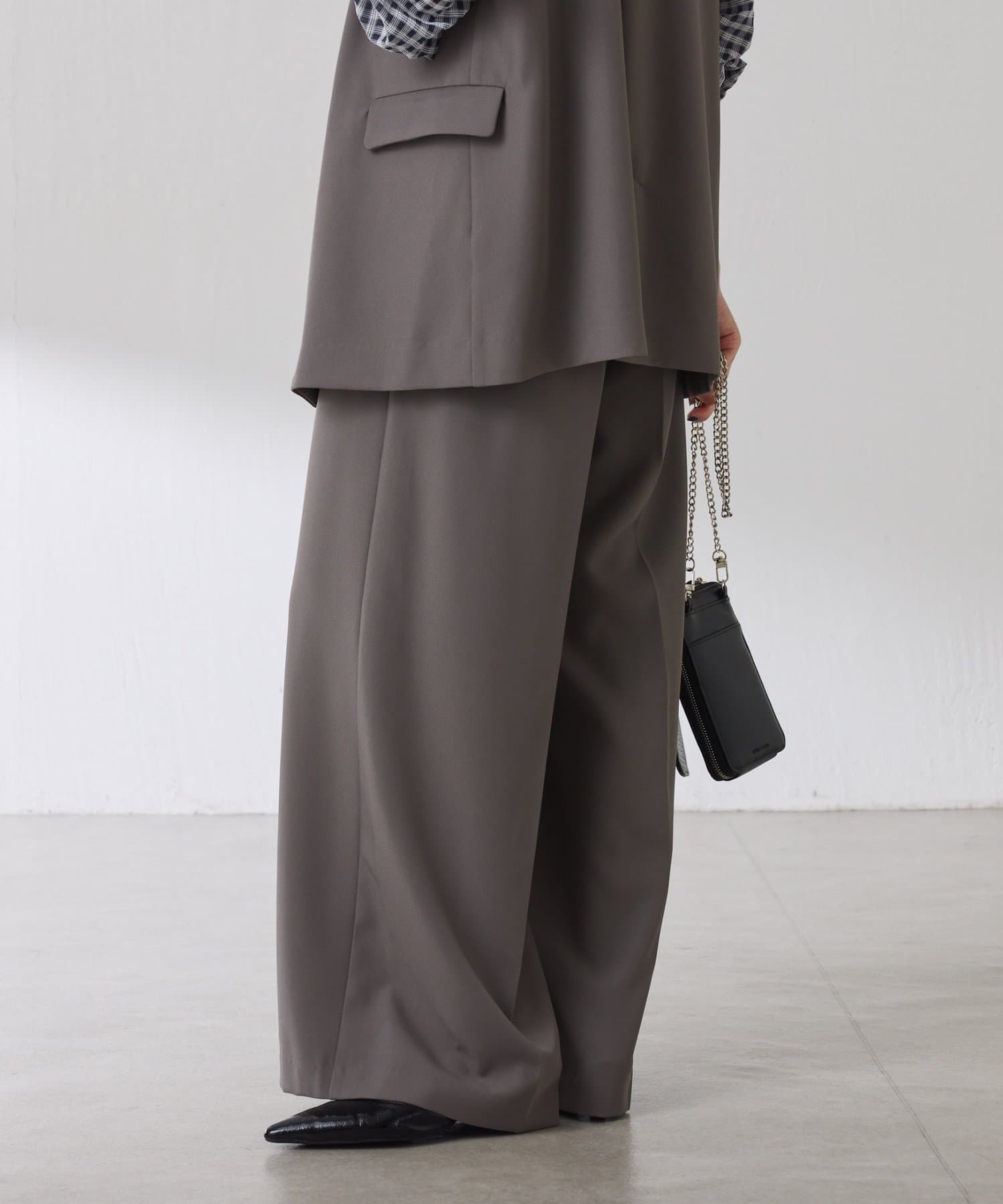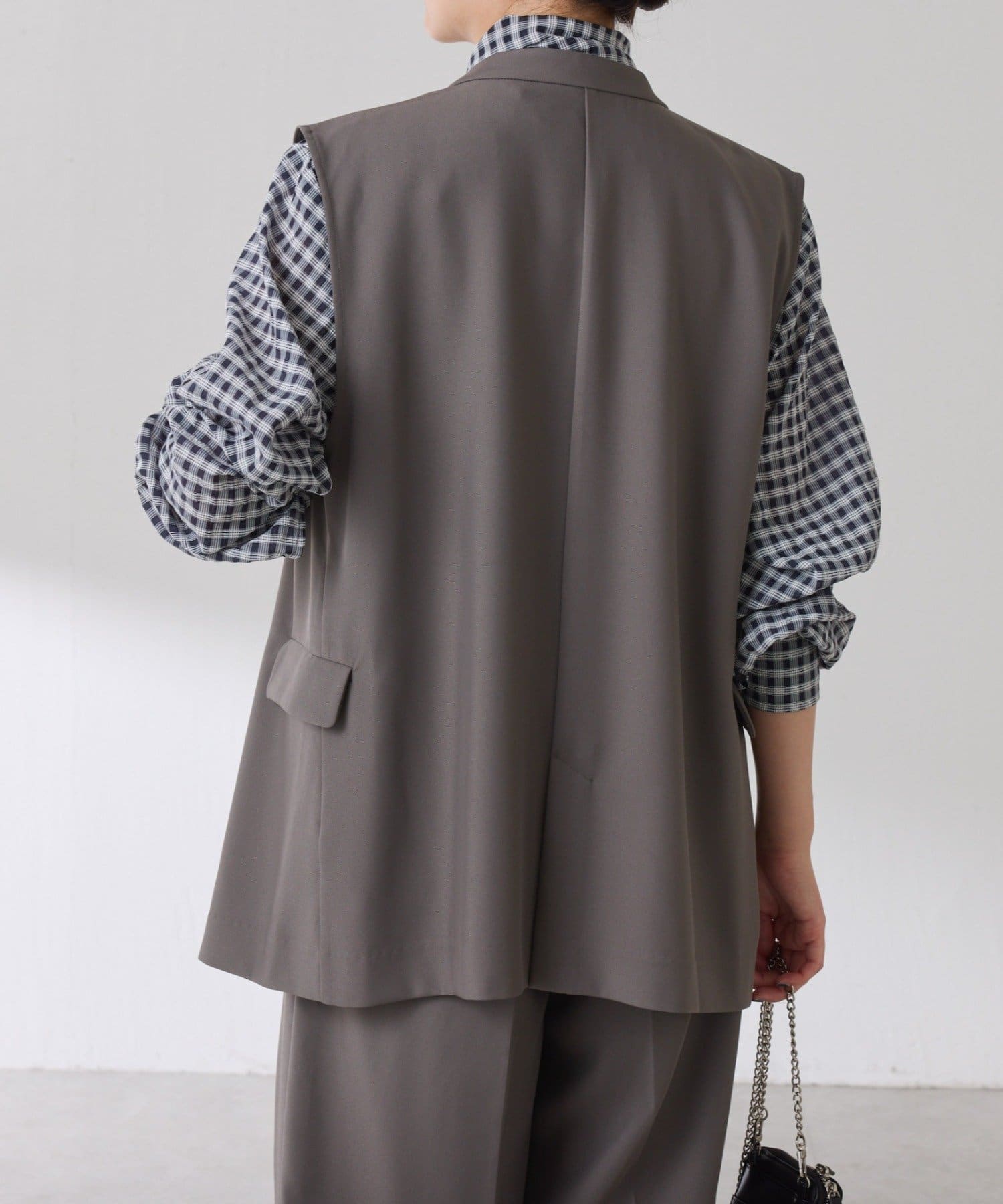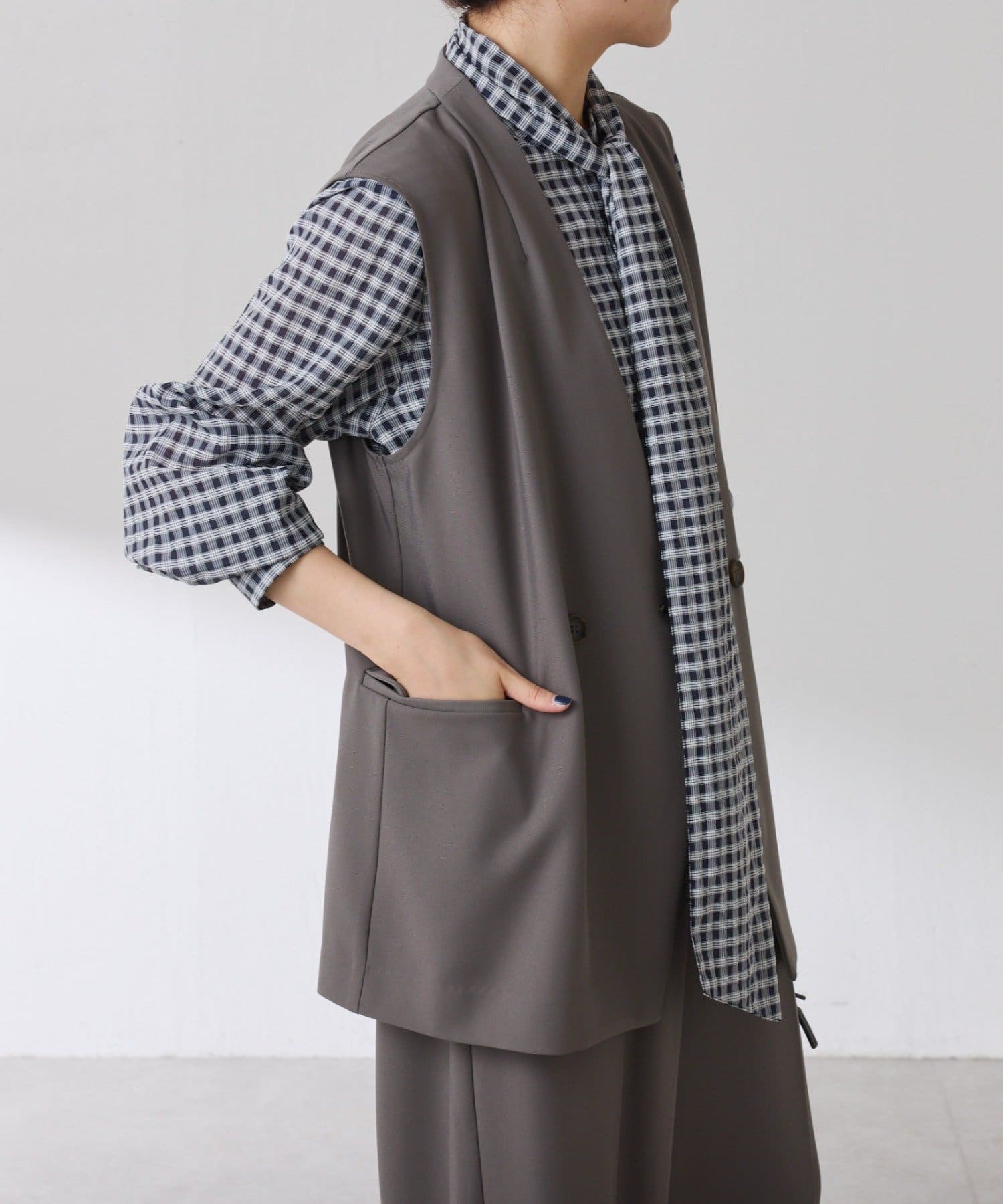 ・ノーカラーですっきり着られるジレとワイドパンツのセットアイテム。