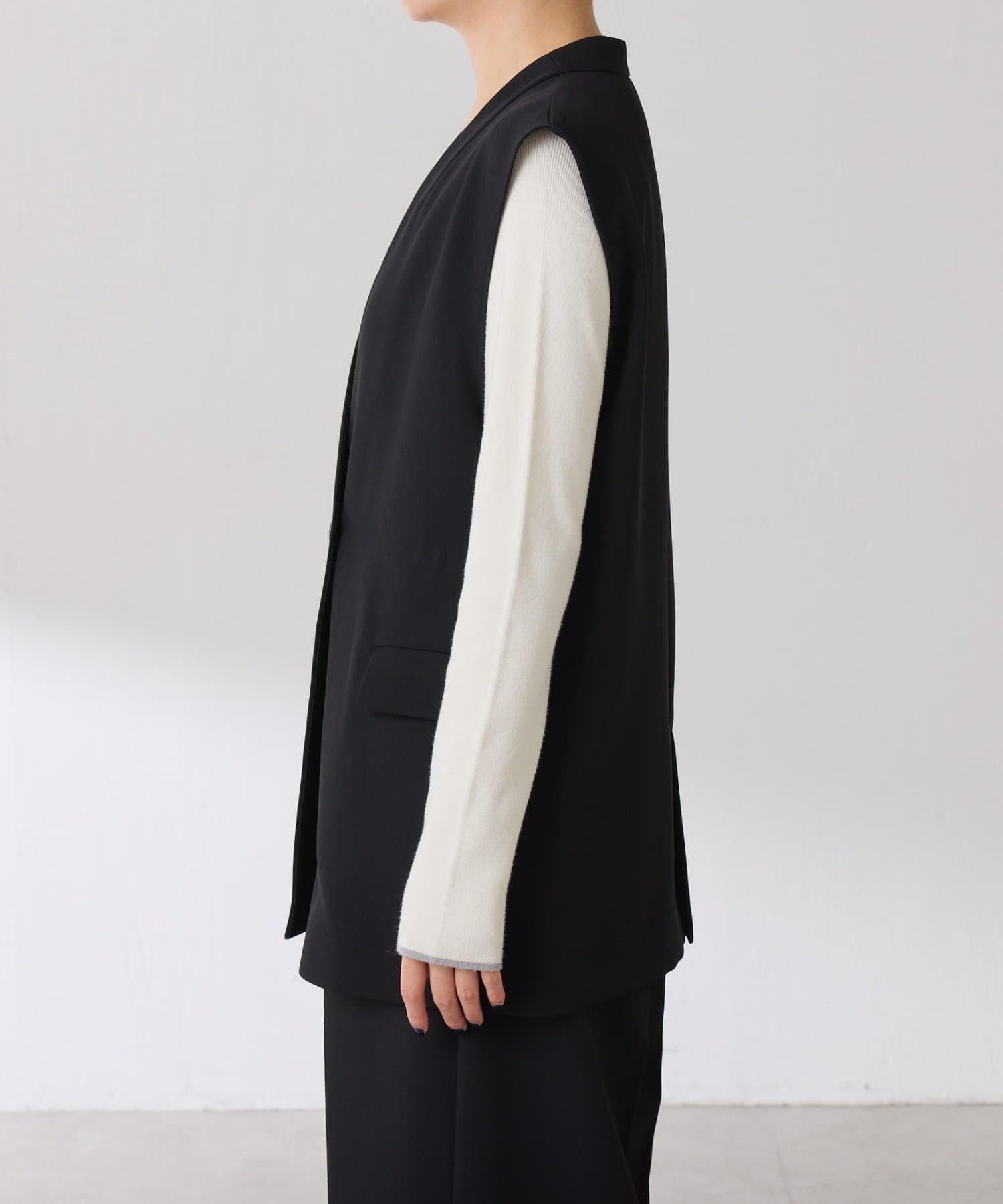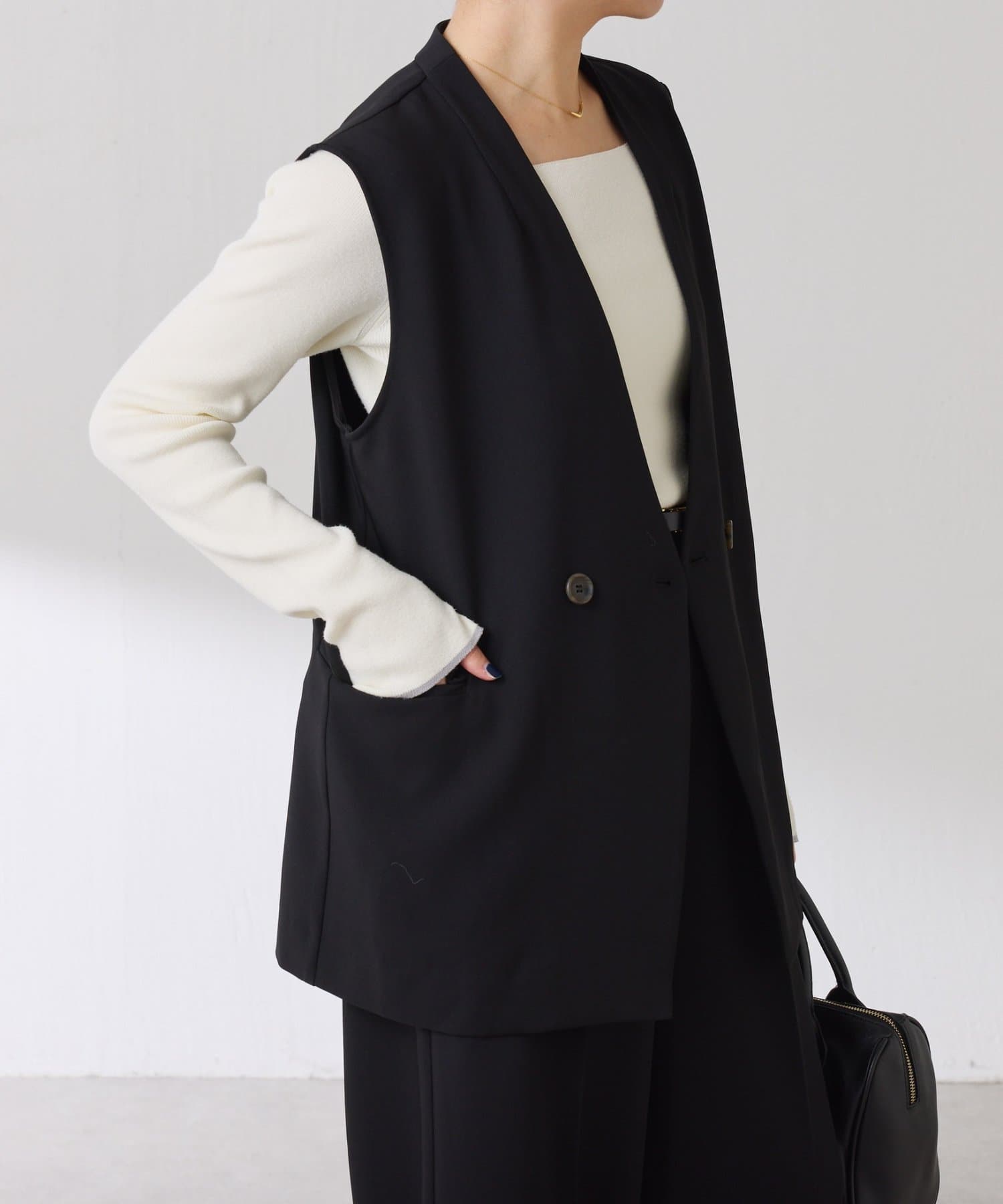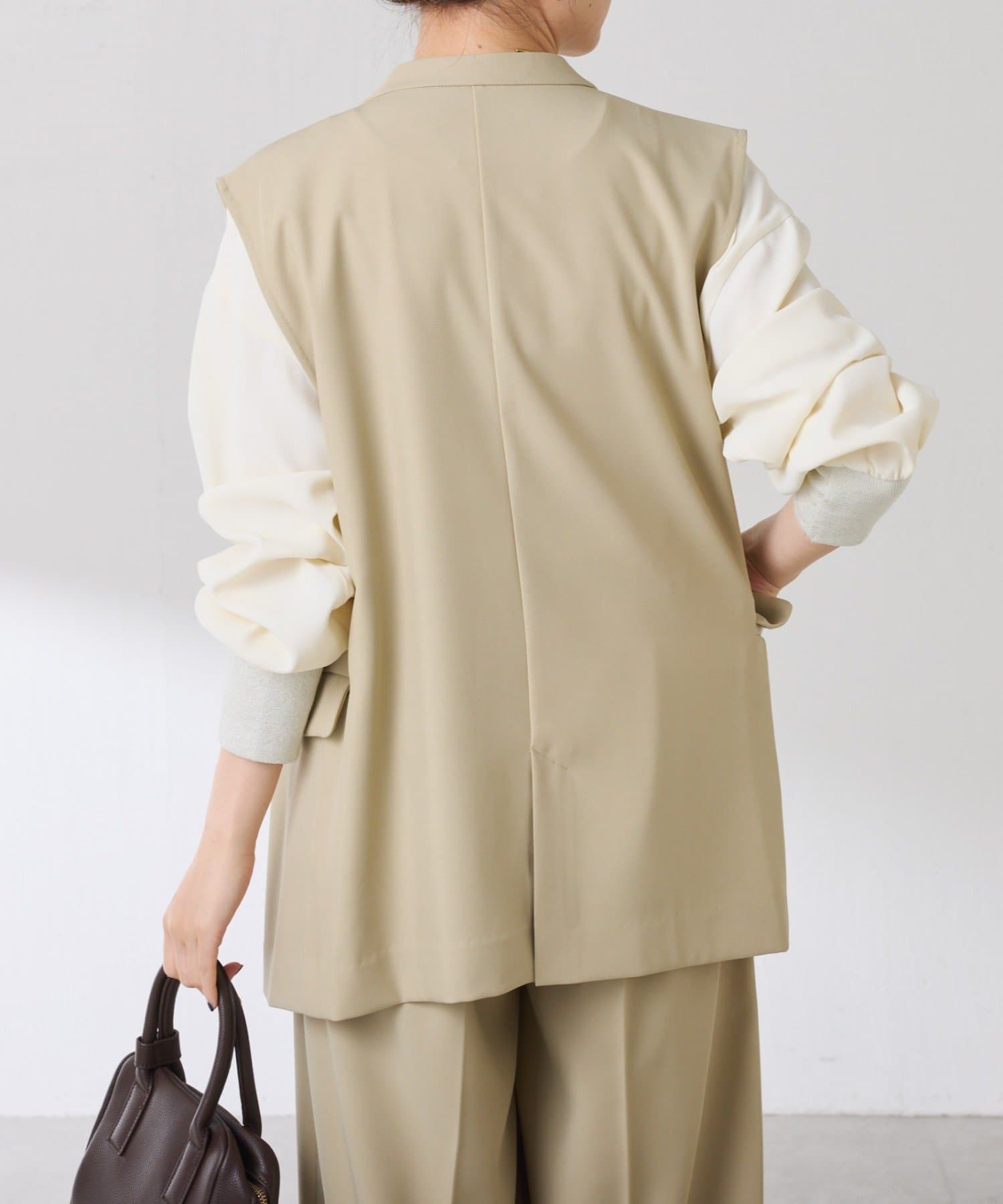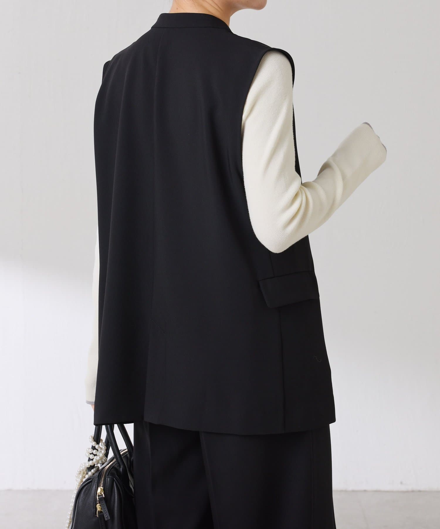 ・ノーカラーですっきり着られるジレとワイドパンツのセットアイテム。