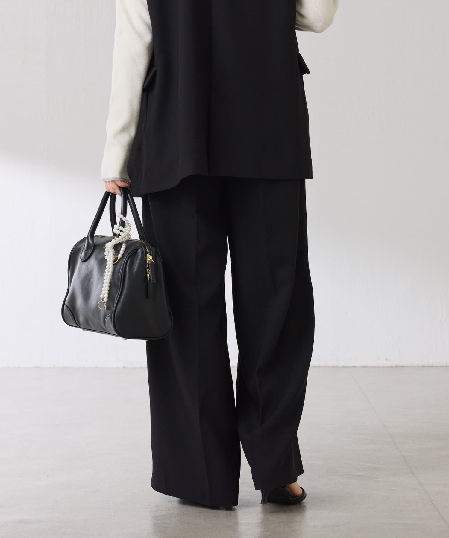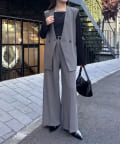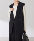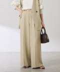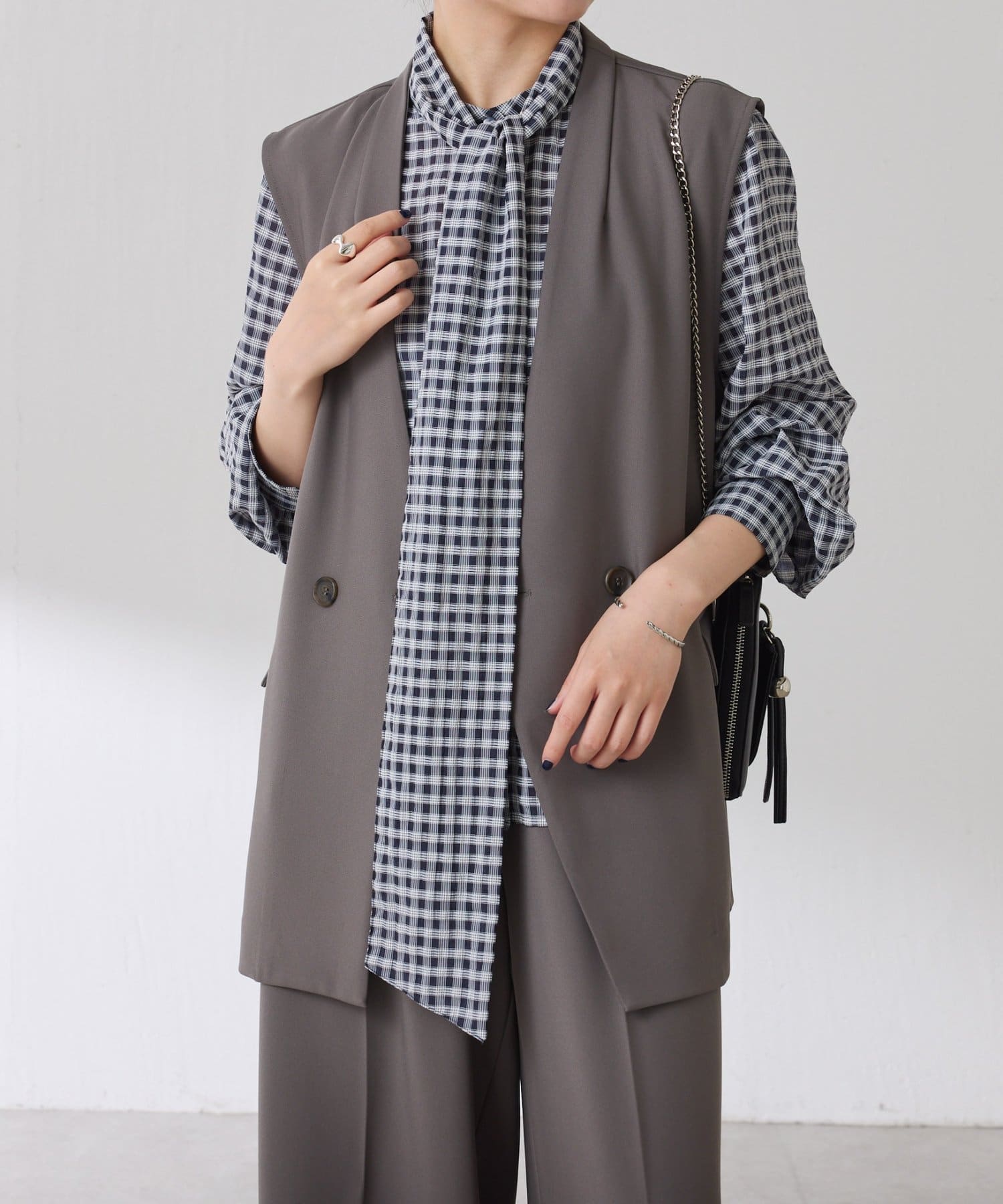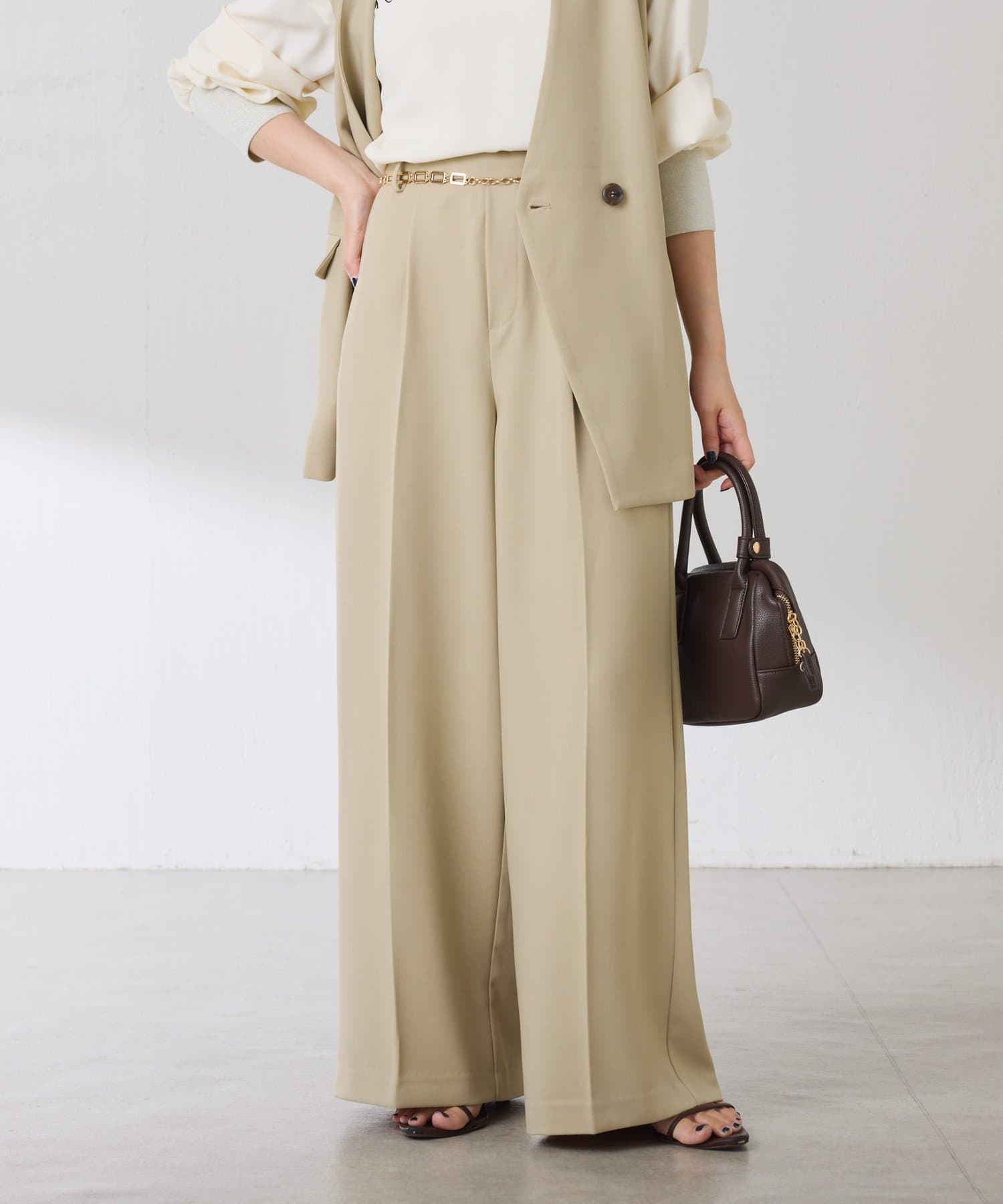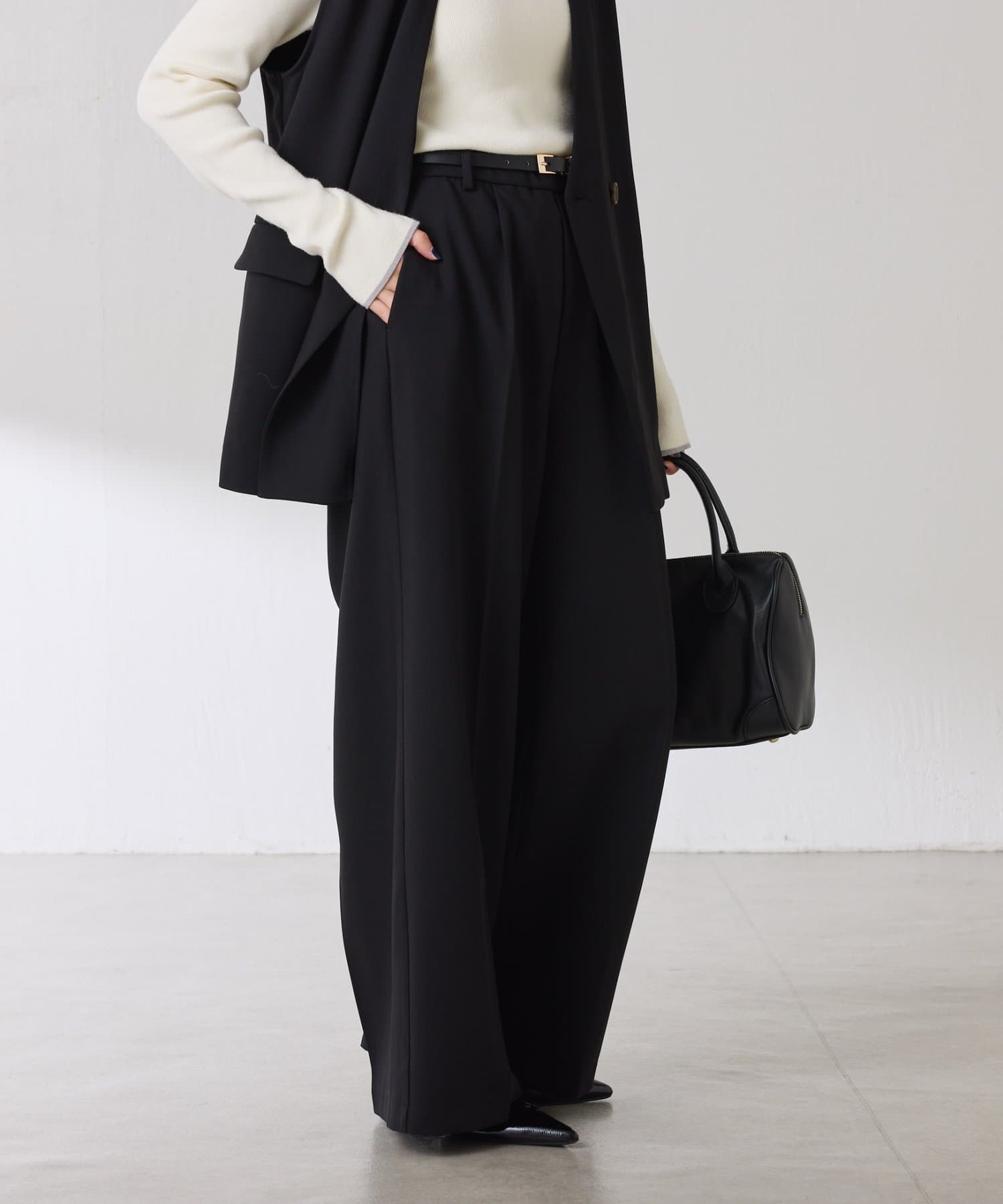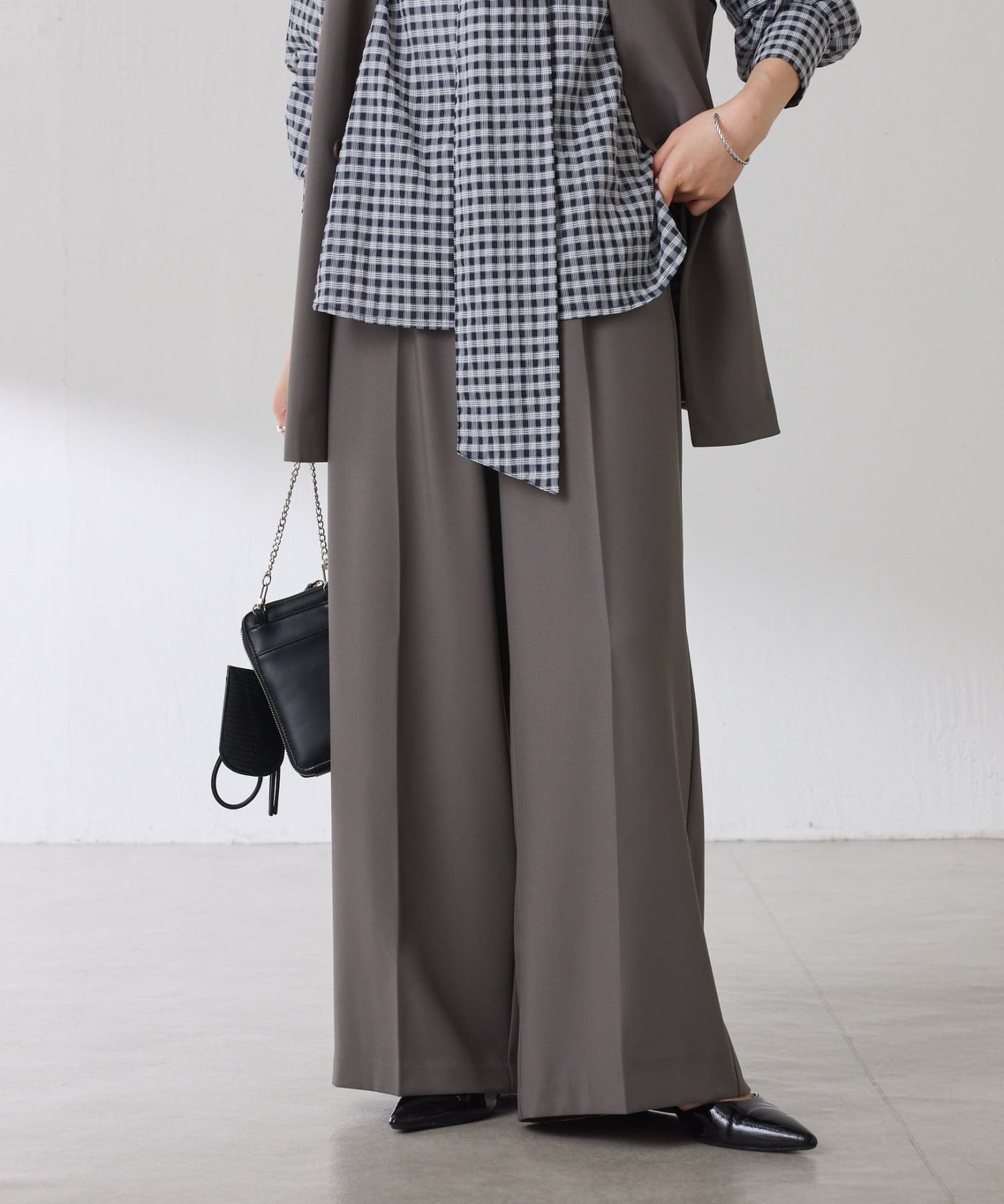 ・ノーカラーですっきり着られるジレとワイドパンツのセットアイテム。
