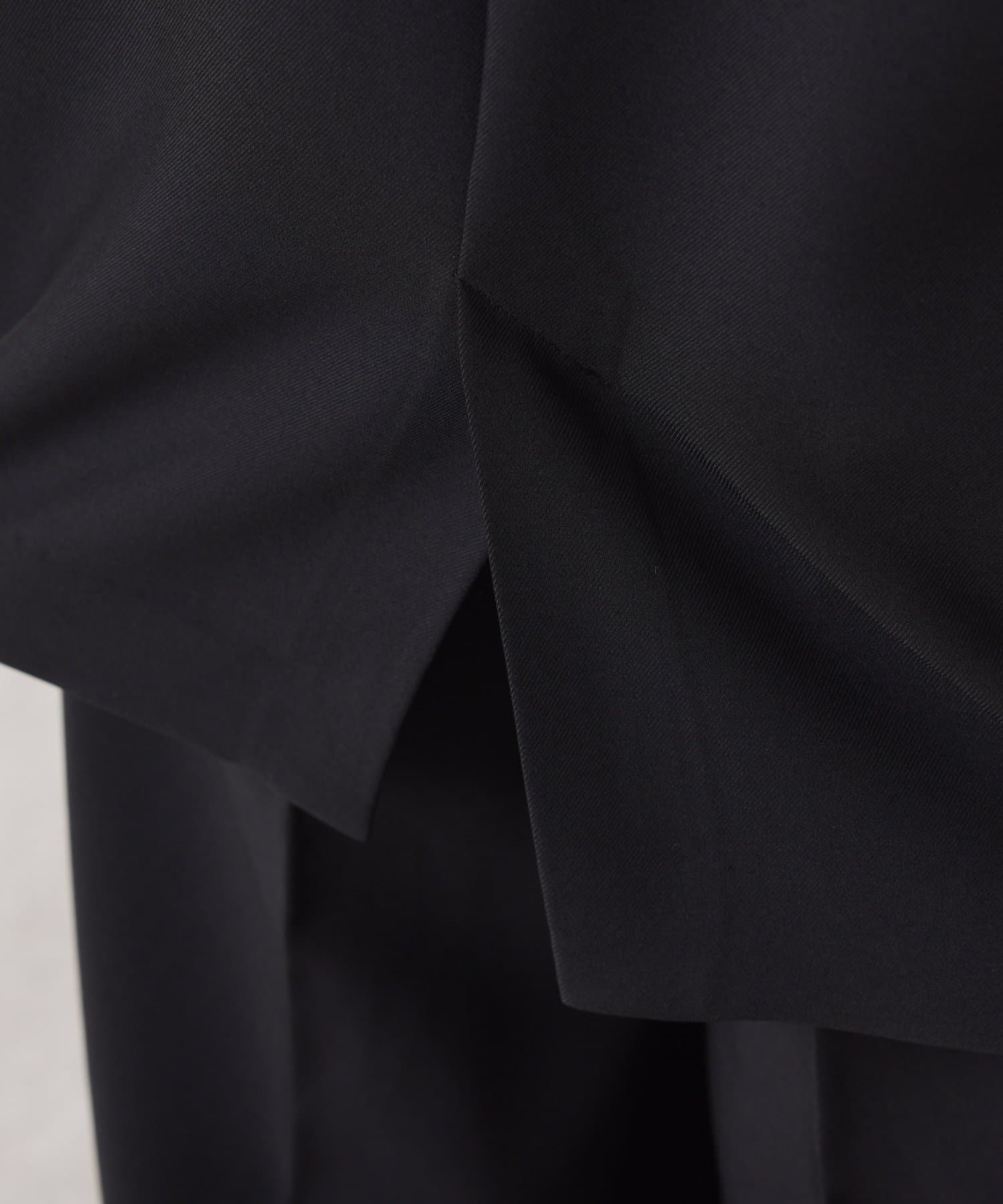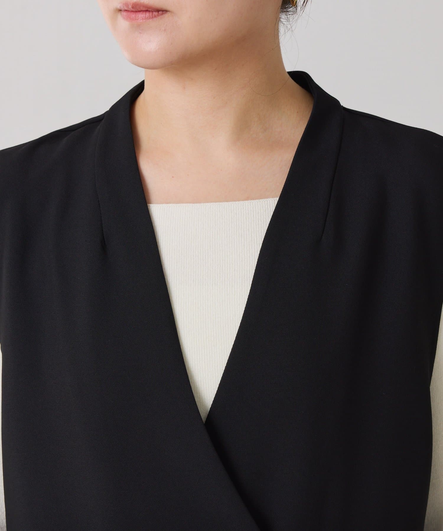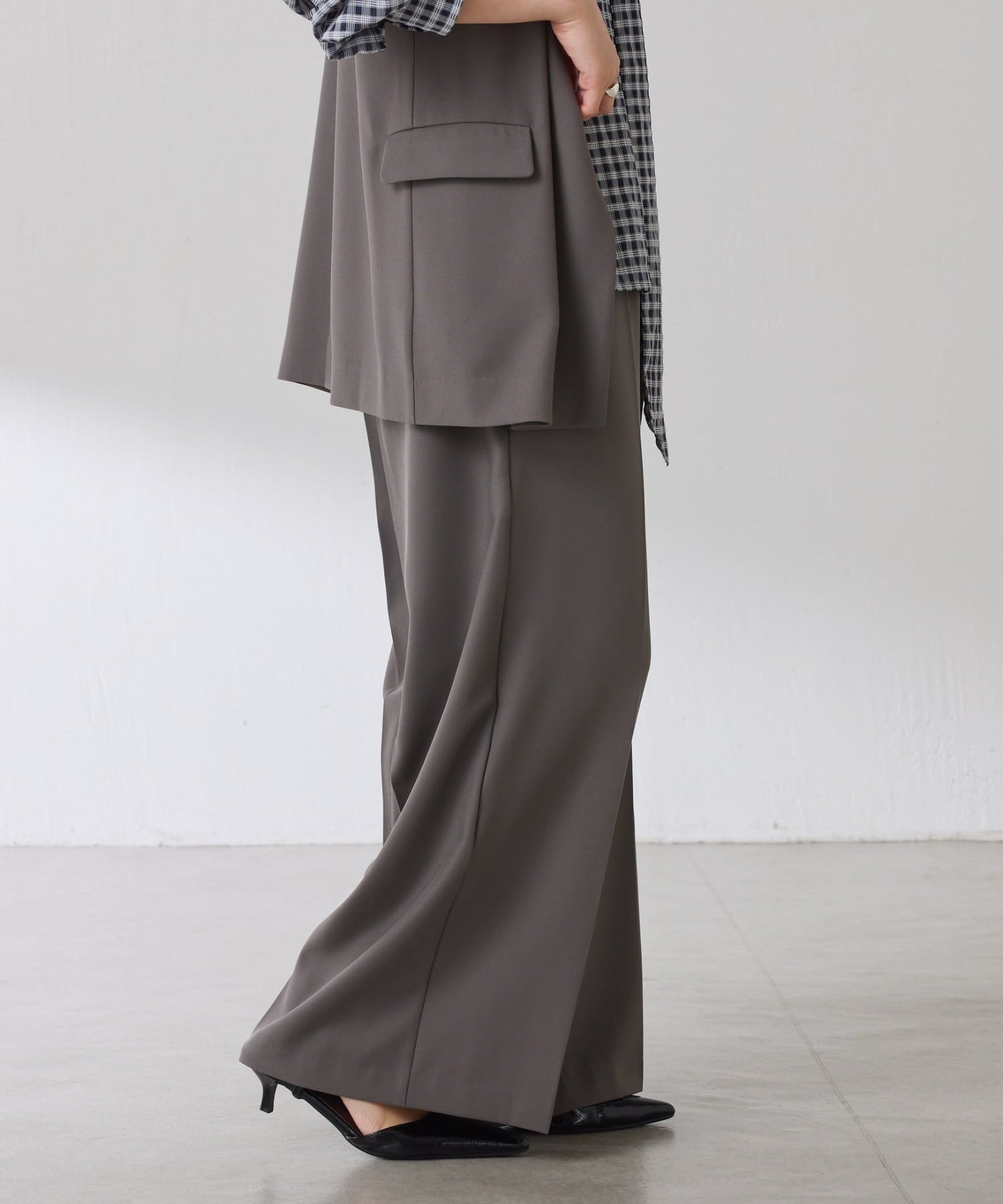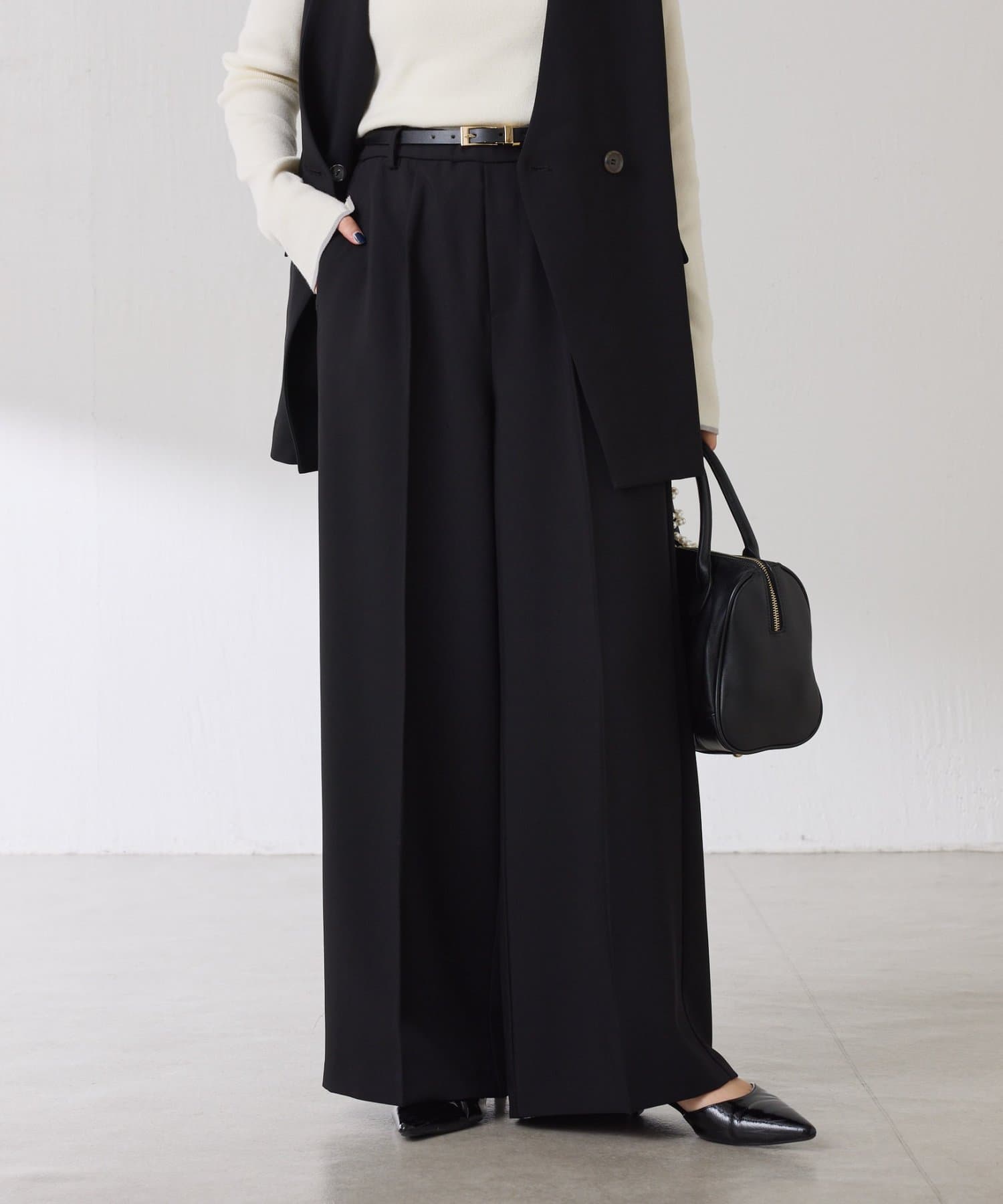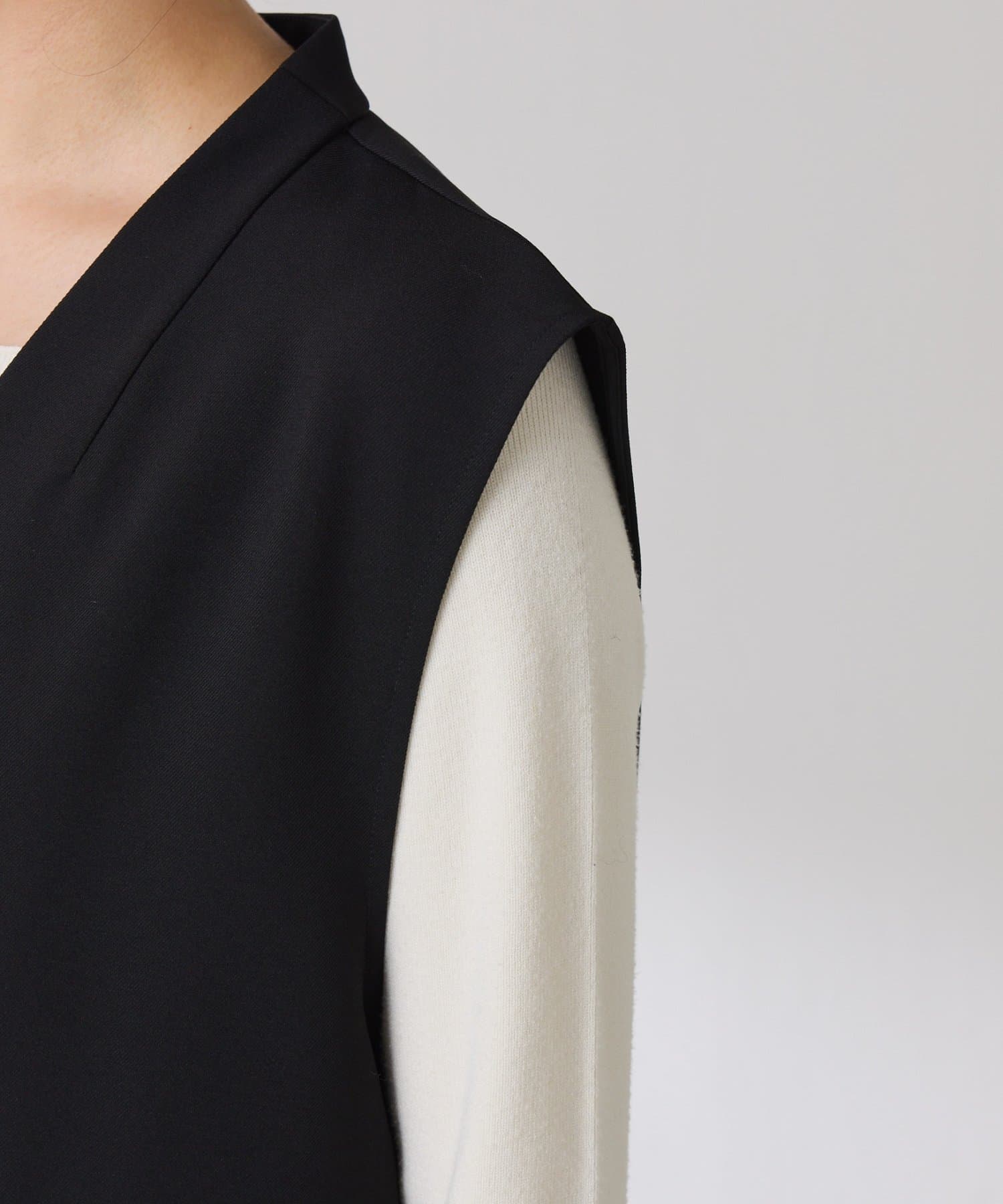 ・ノーカラーですっきり着られるジレとワイドパンツのセットアイテム。
