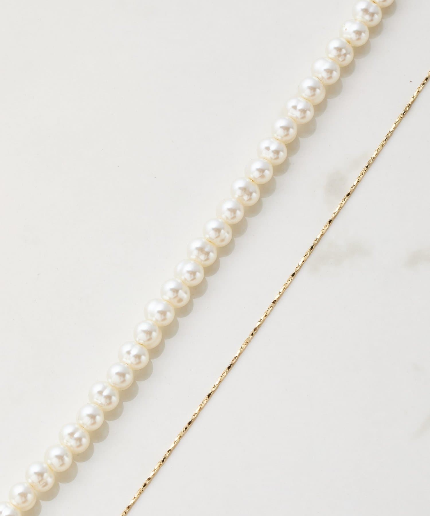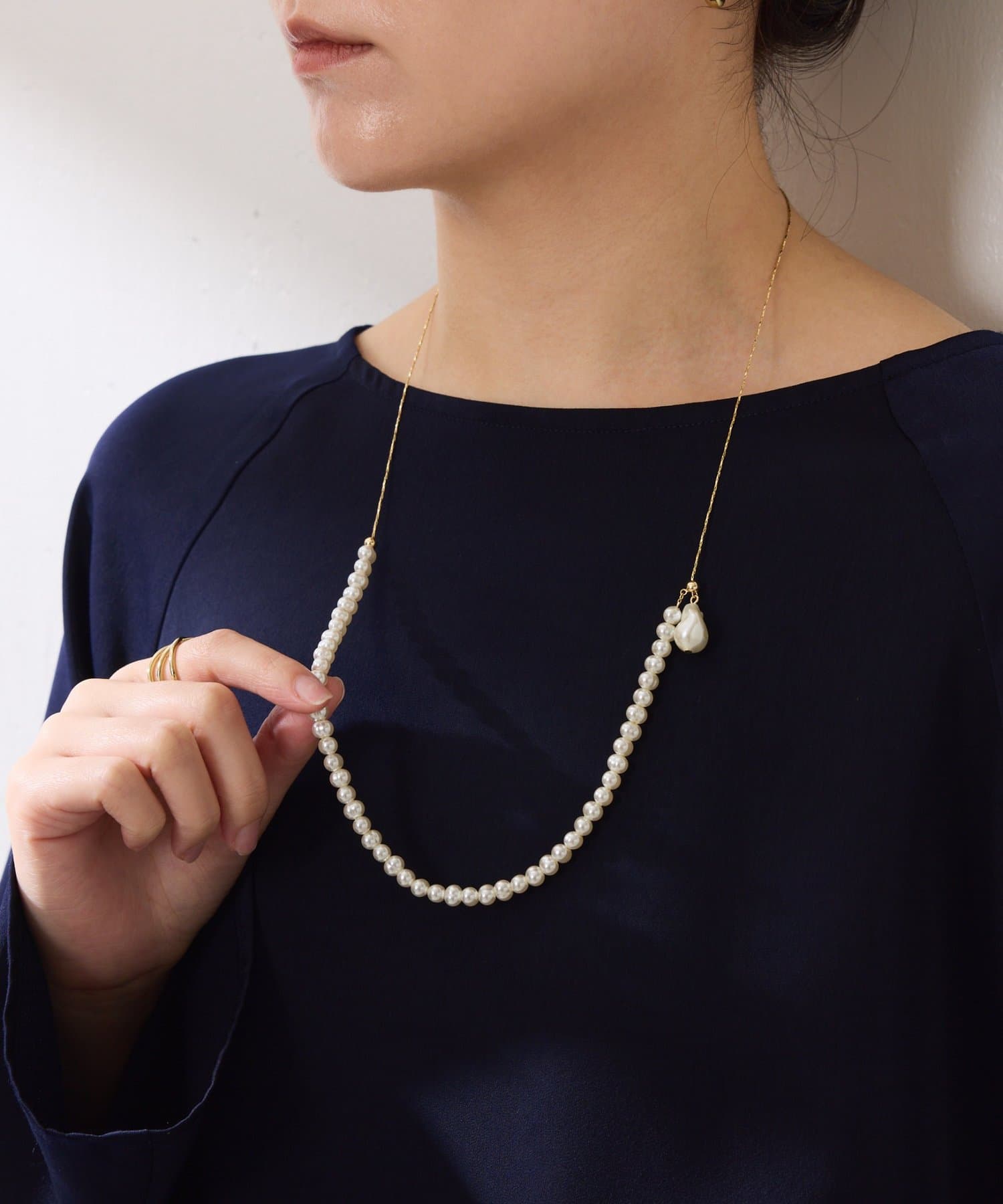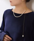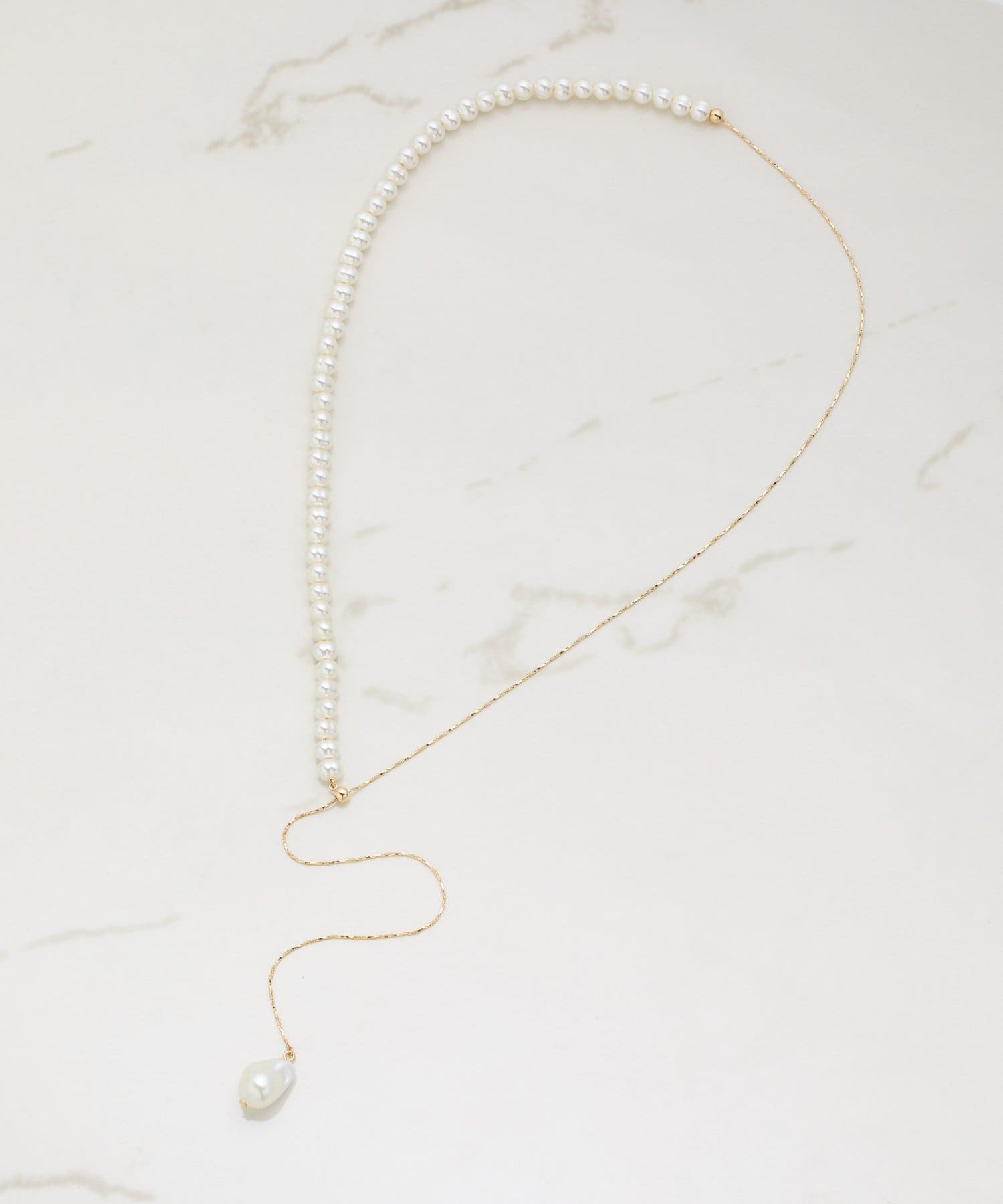 ・表情感あるパールとメタルチェーンがコンビになったアシンメトリーのY字ネックレス。
