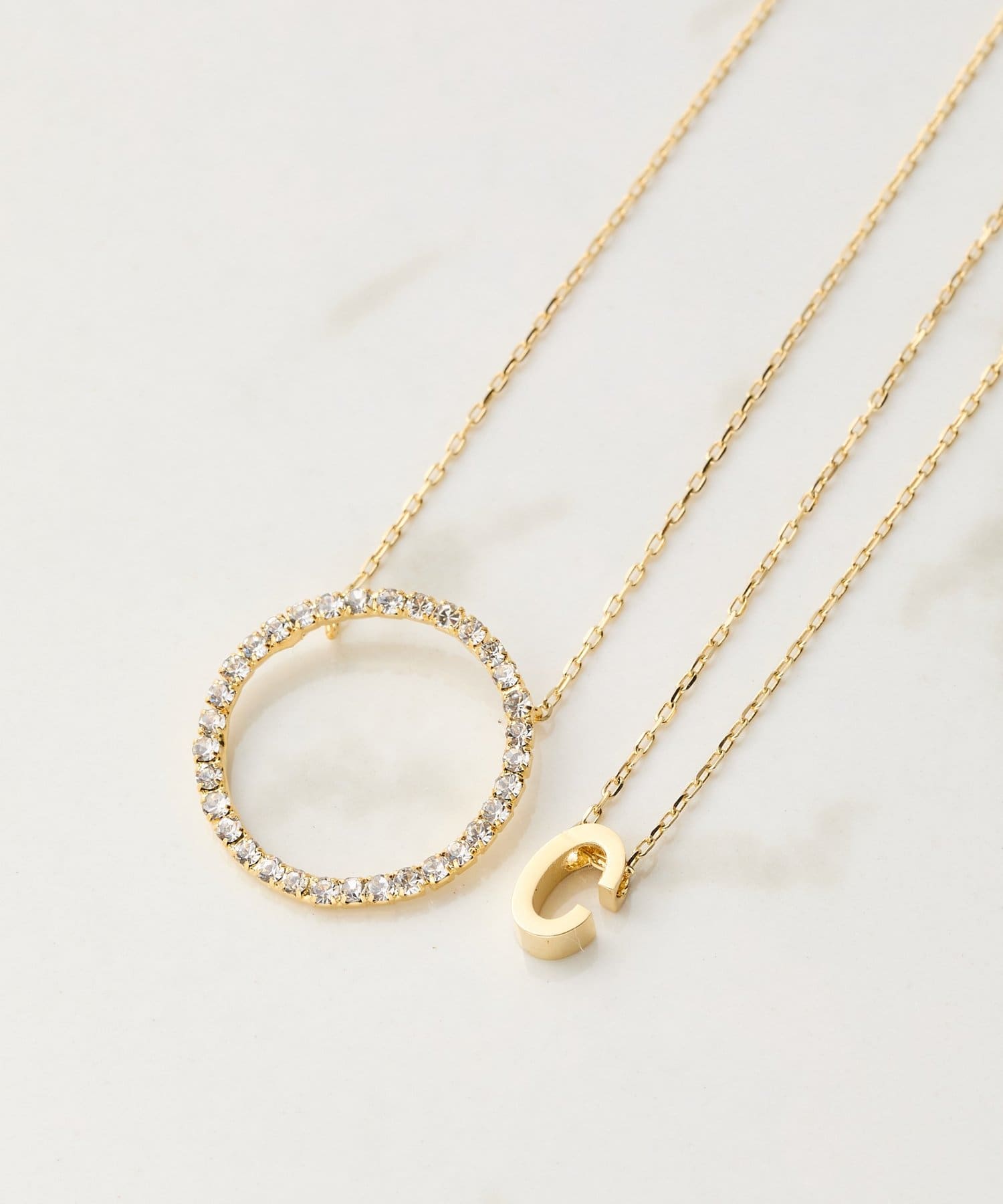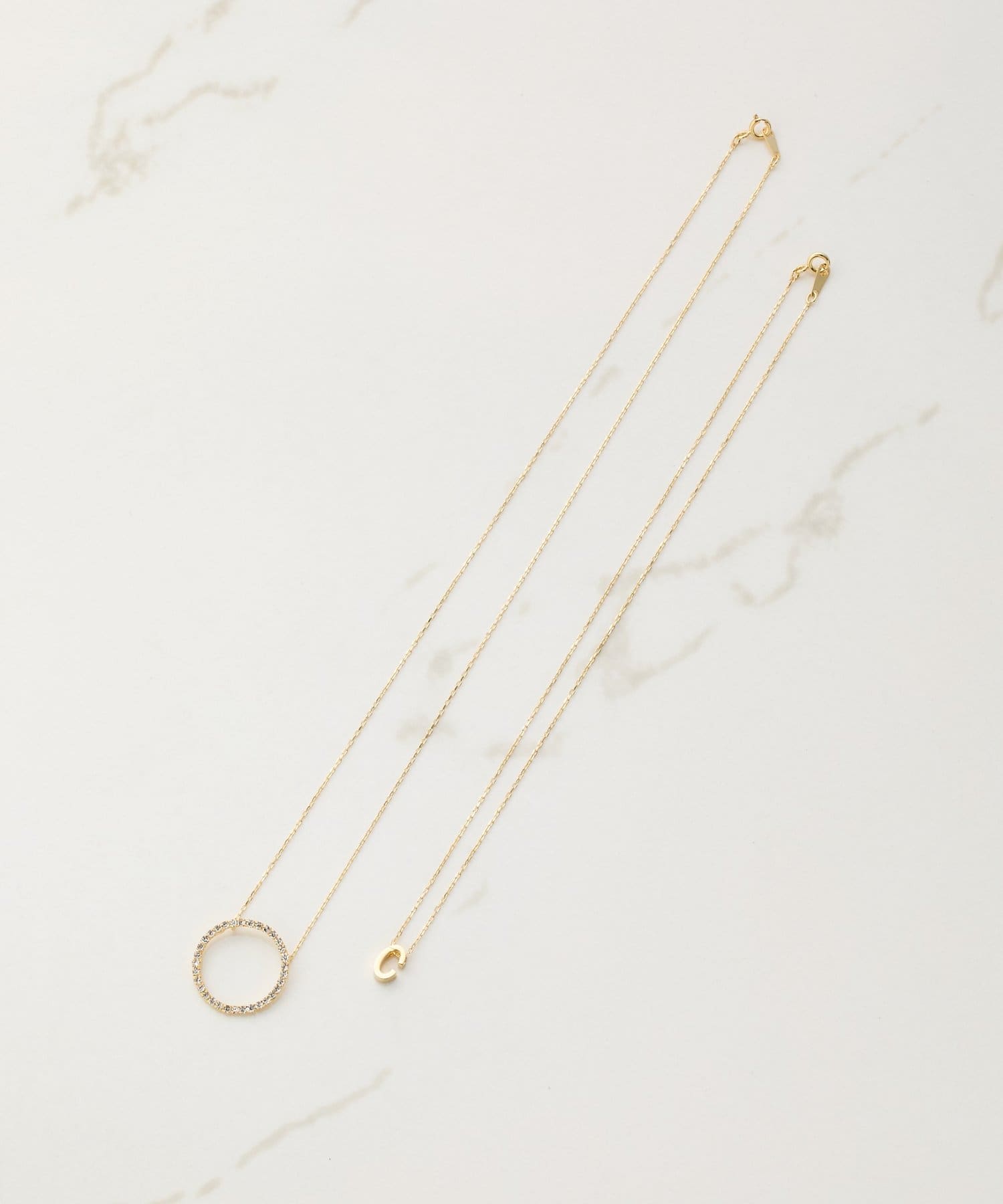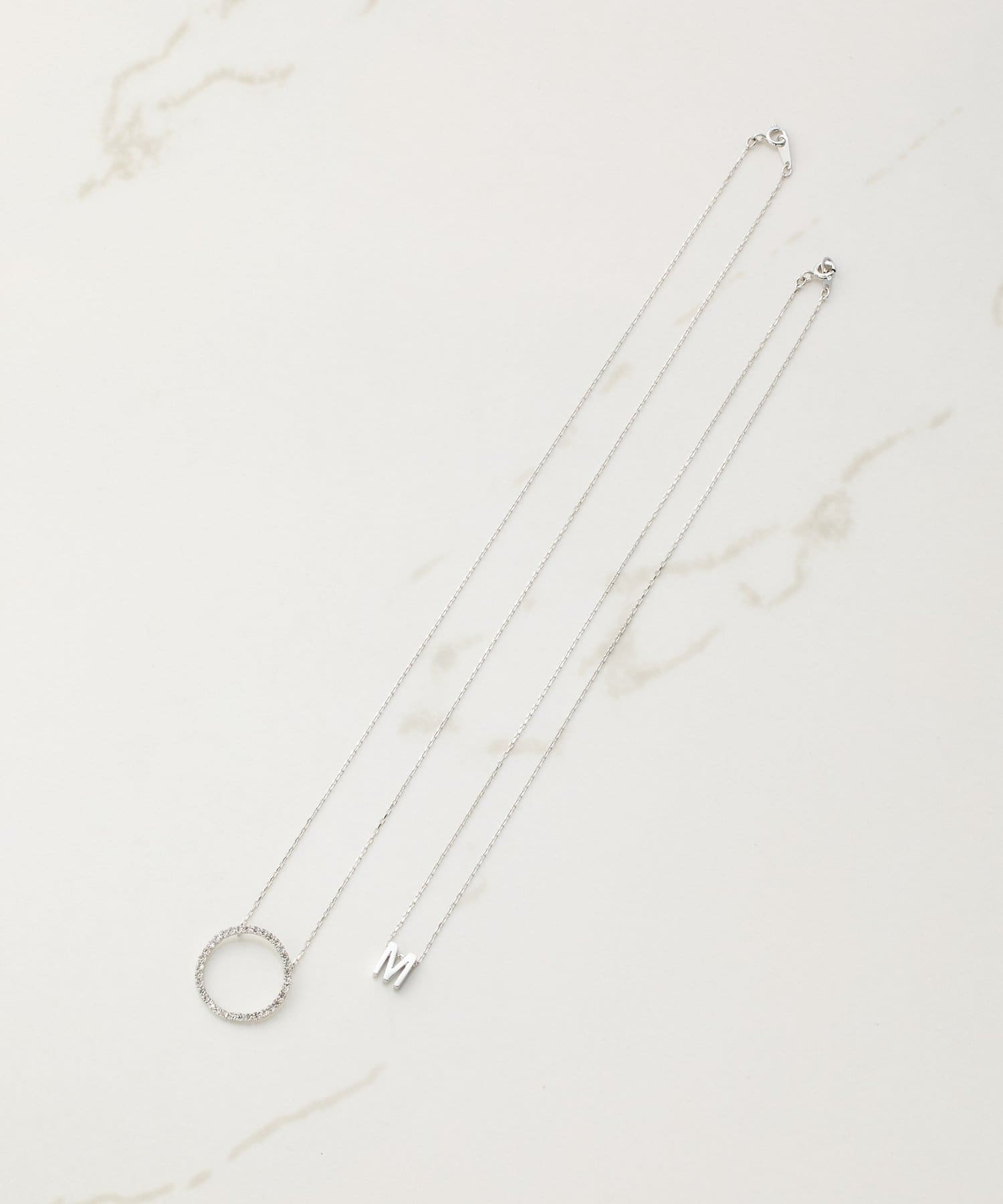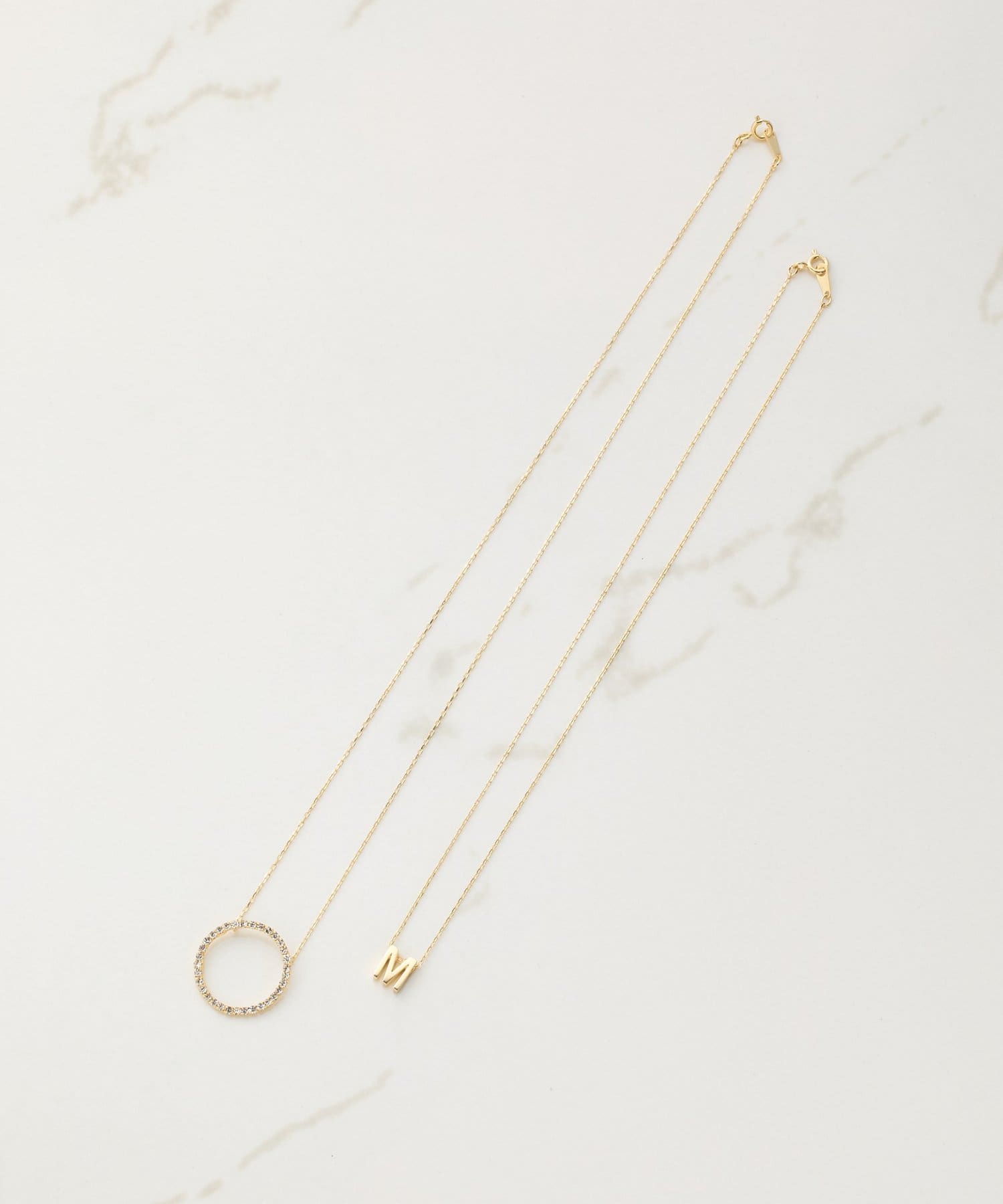 ・アルファベットモチーフとガラスのサークルモチーフのネックレスをセットにしました。
