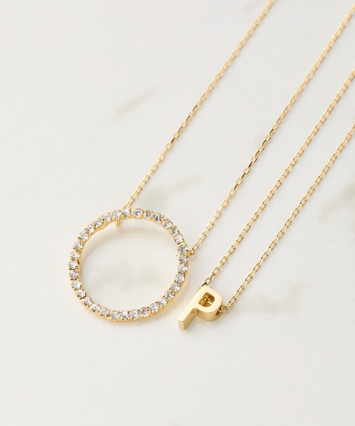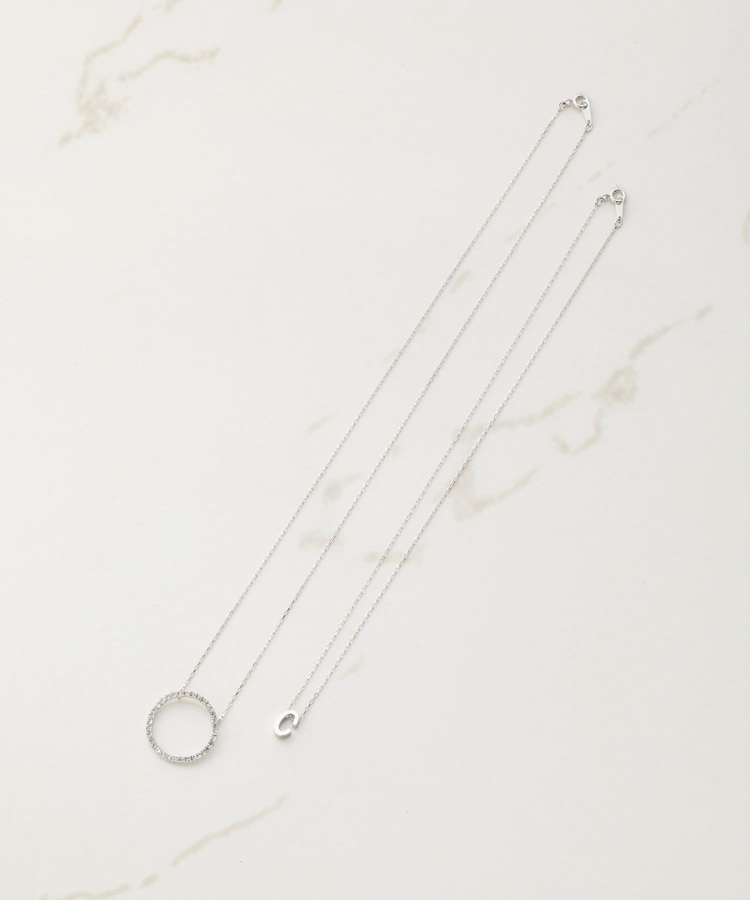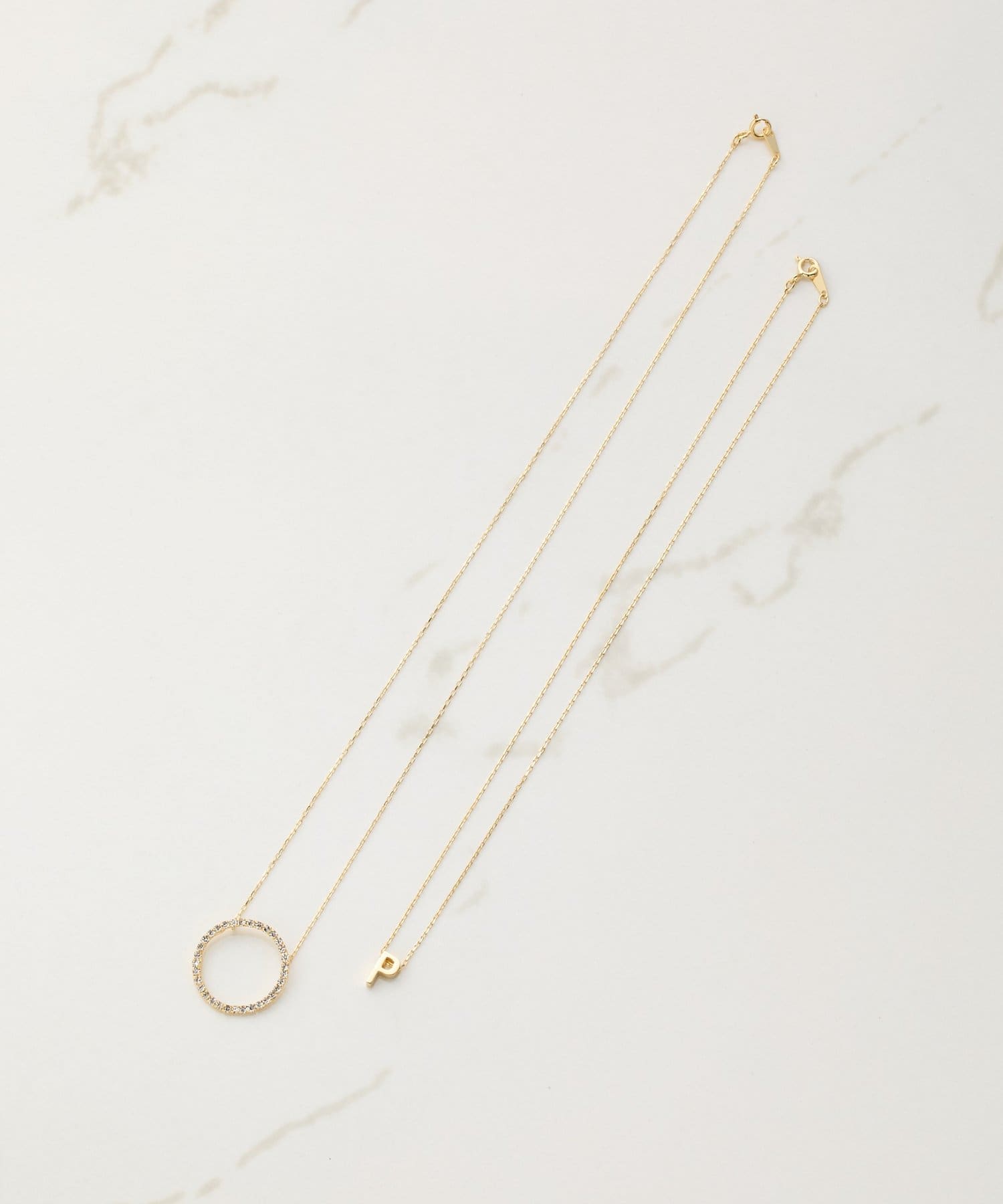 ・アルファベットモチーフとガラスのサークルモチーフのネックレスをセットにしました。