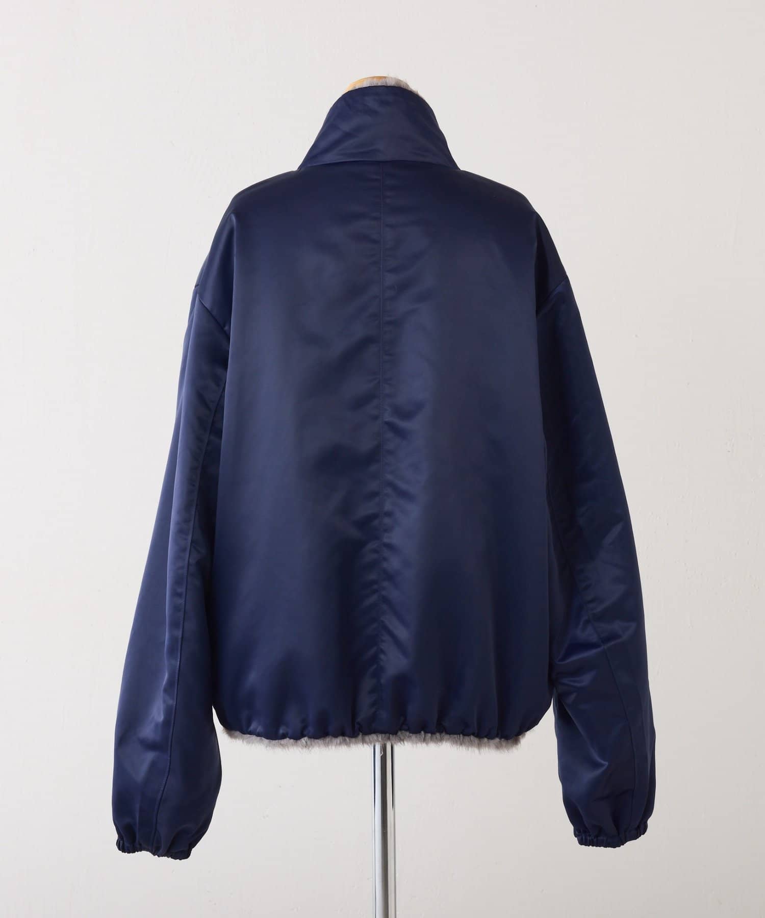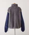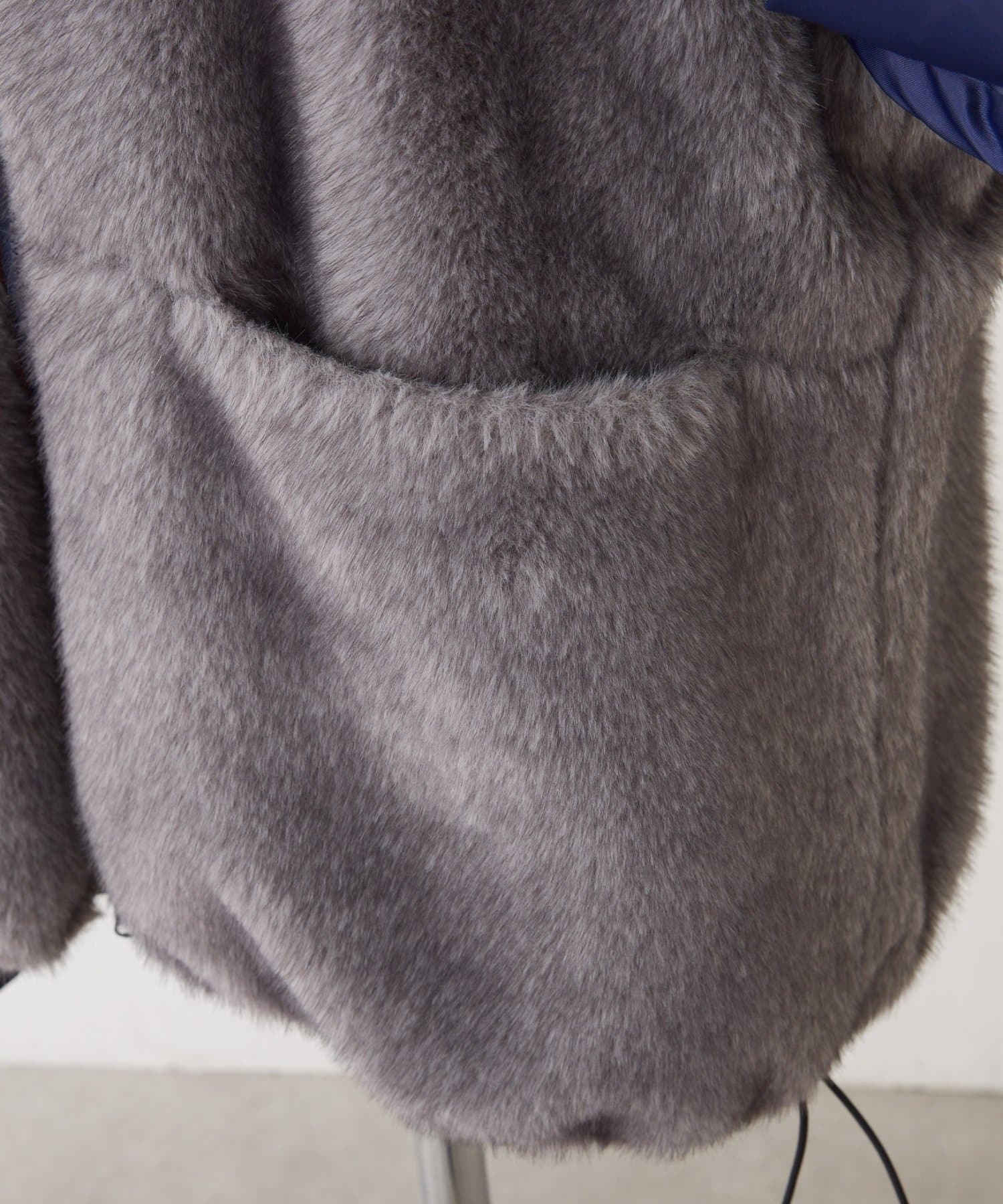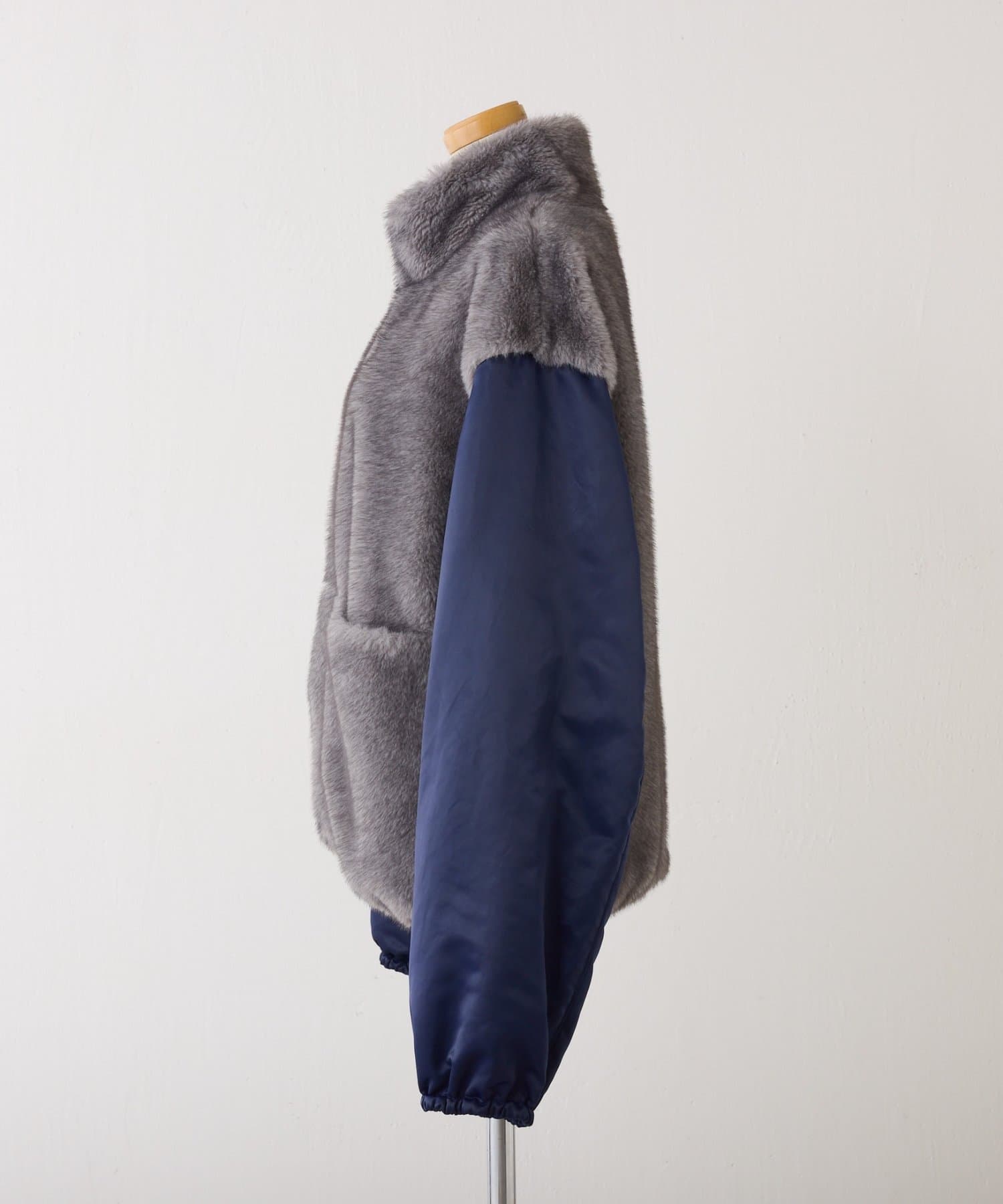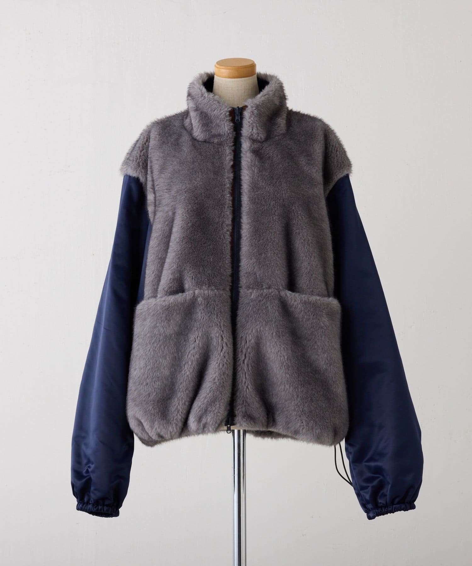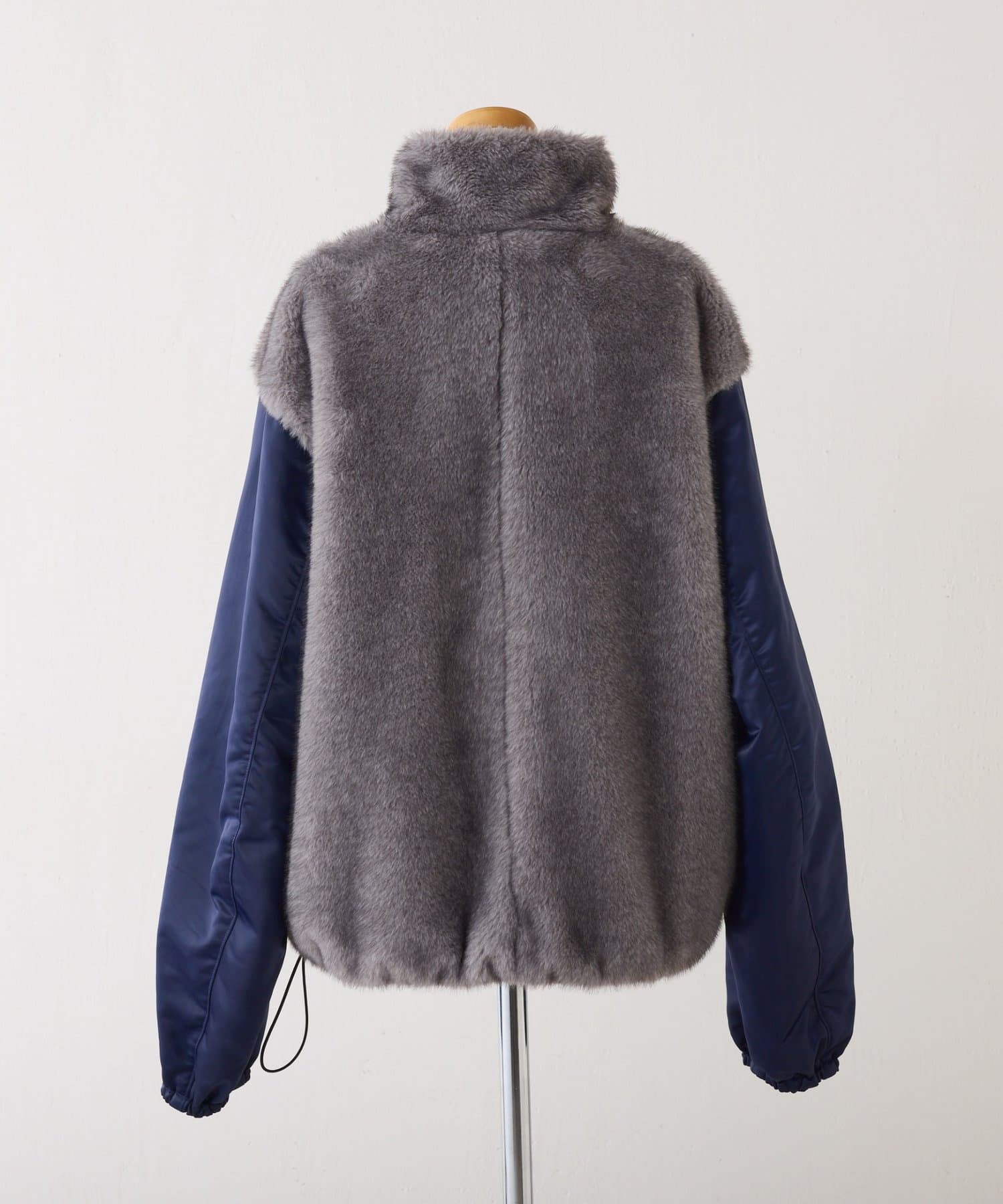 ・ツヤツイル素材と、ベストのファーをレイヤードしたようなコンビデザインのブルゾン。