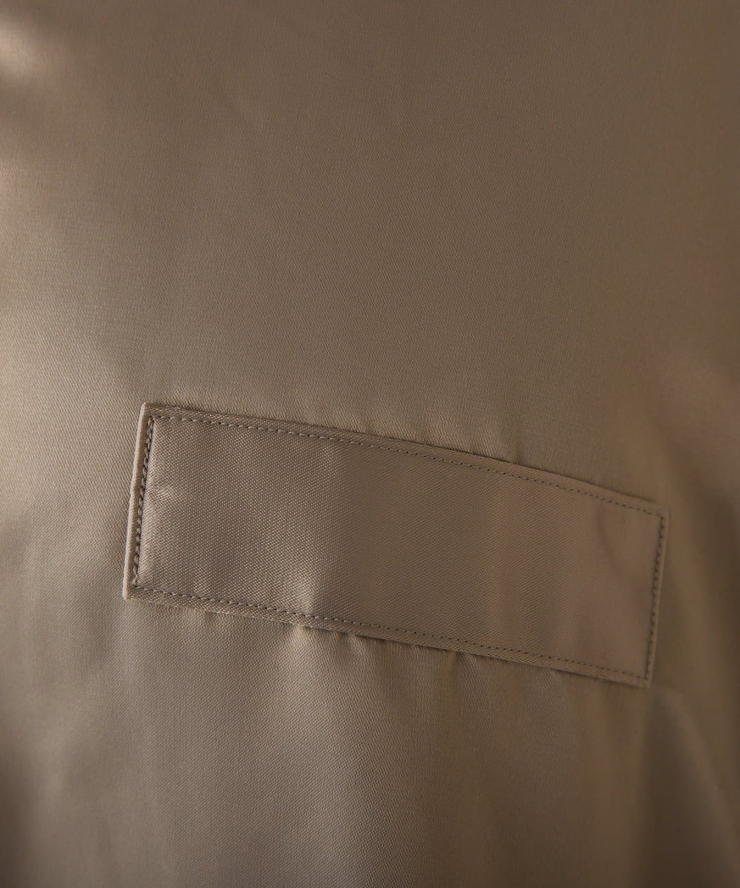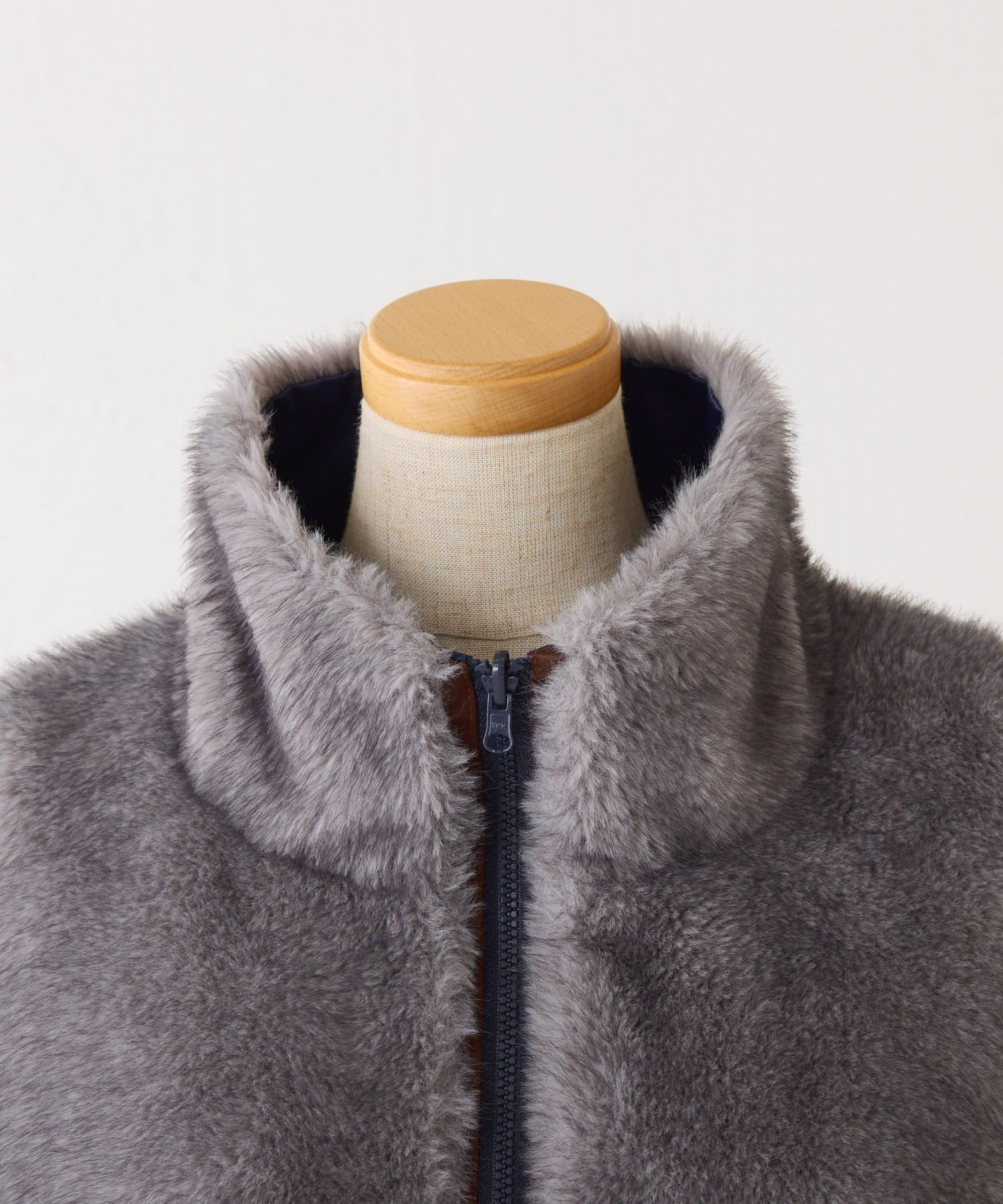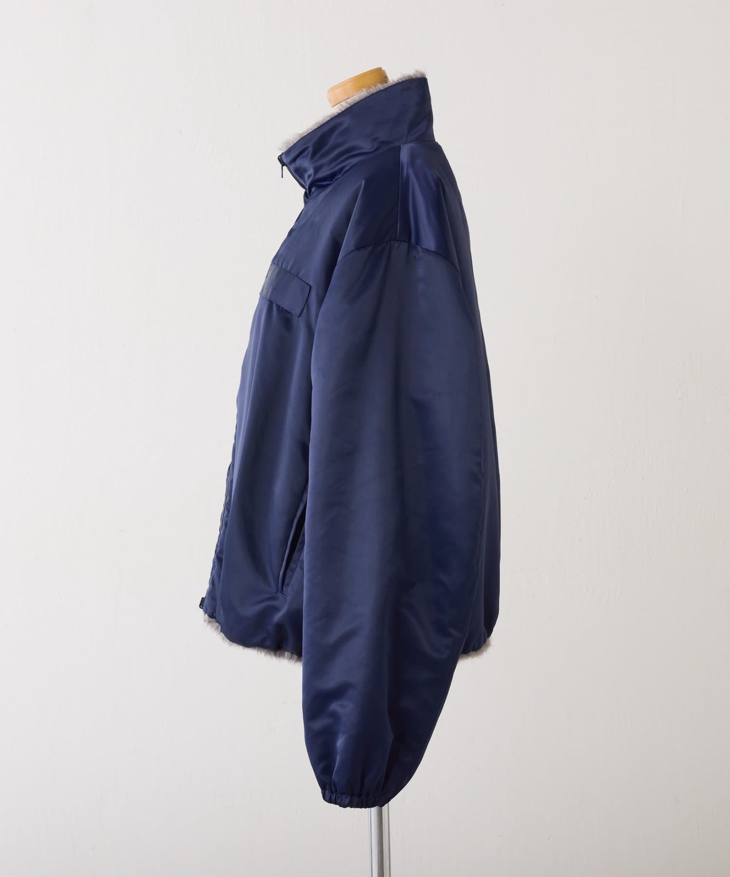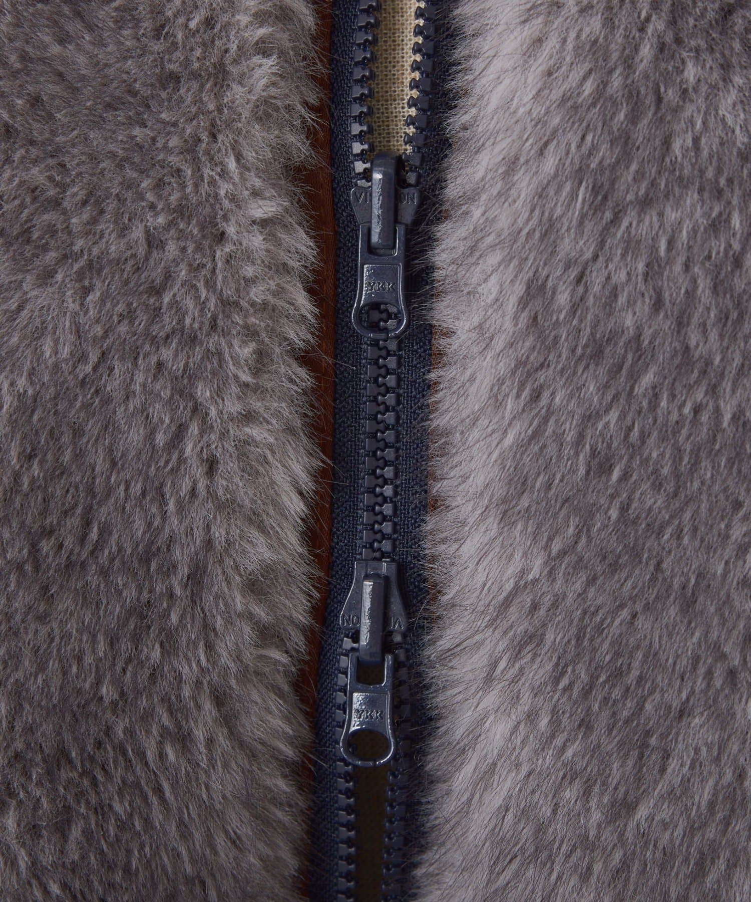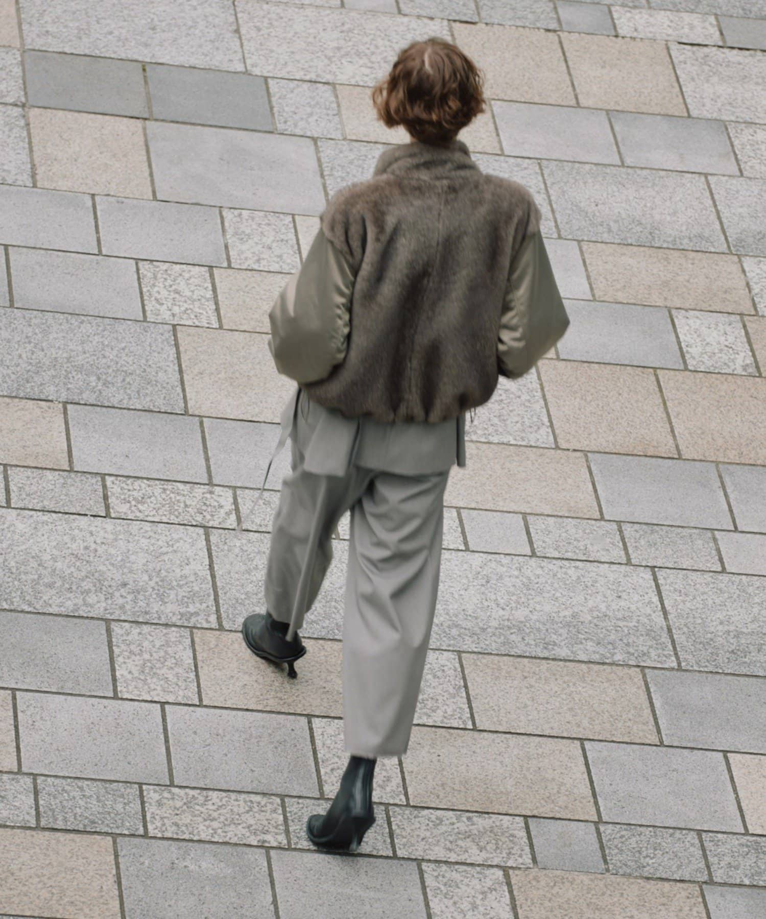 ・ツヤツイル素材と、ベストのファーをレイヤードしたようなコンビデザインのブルゾン。