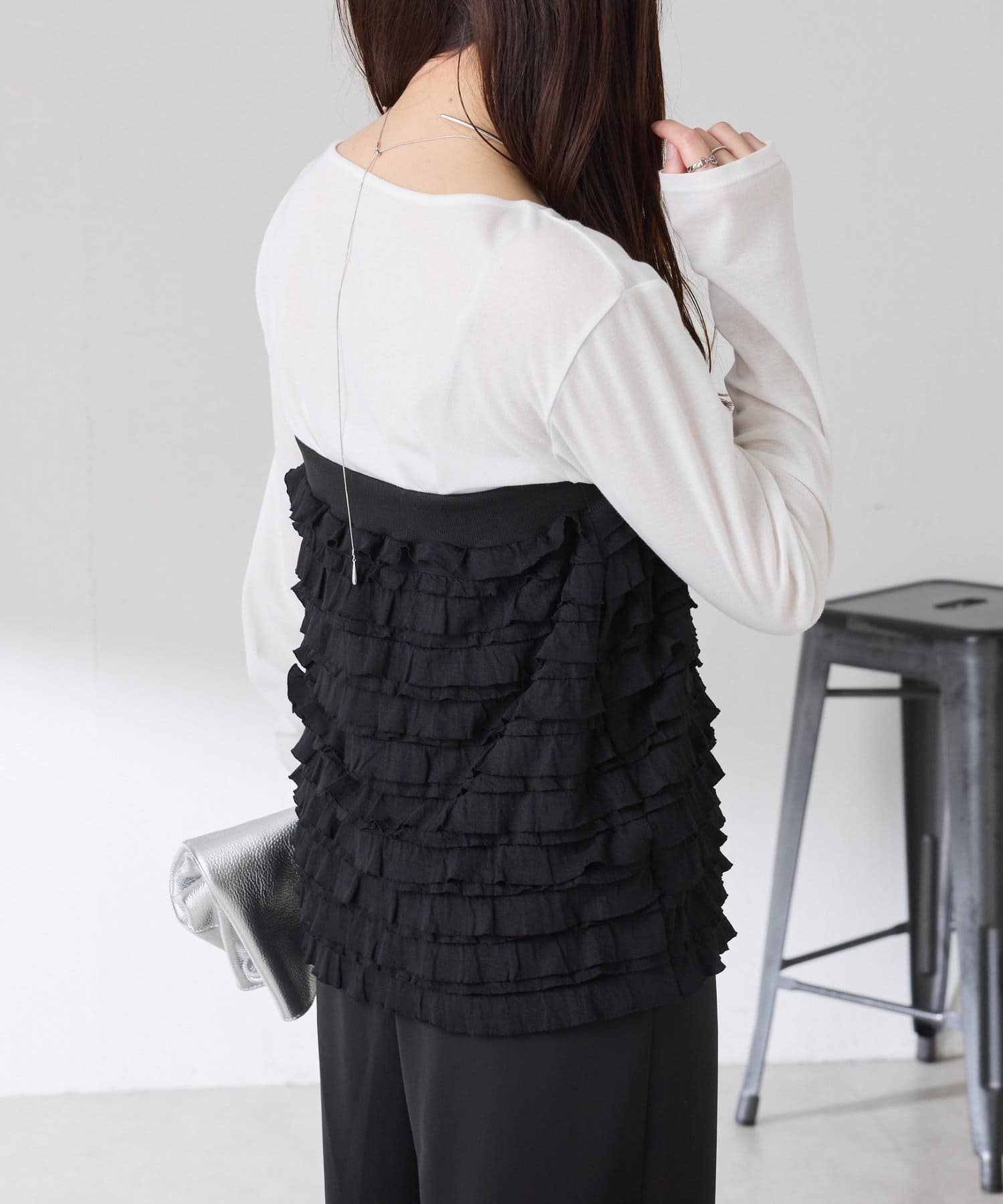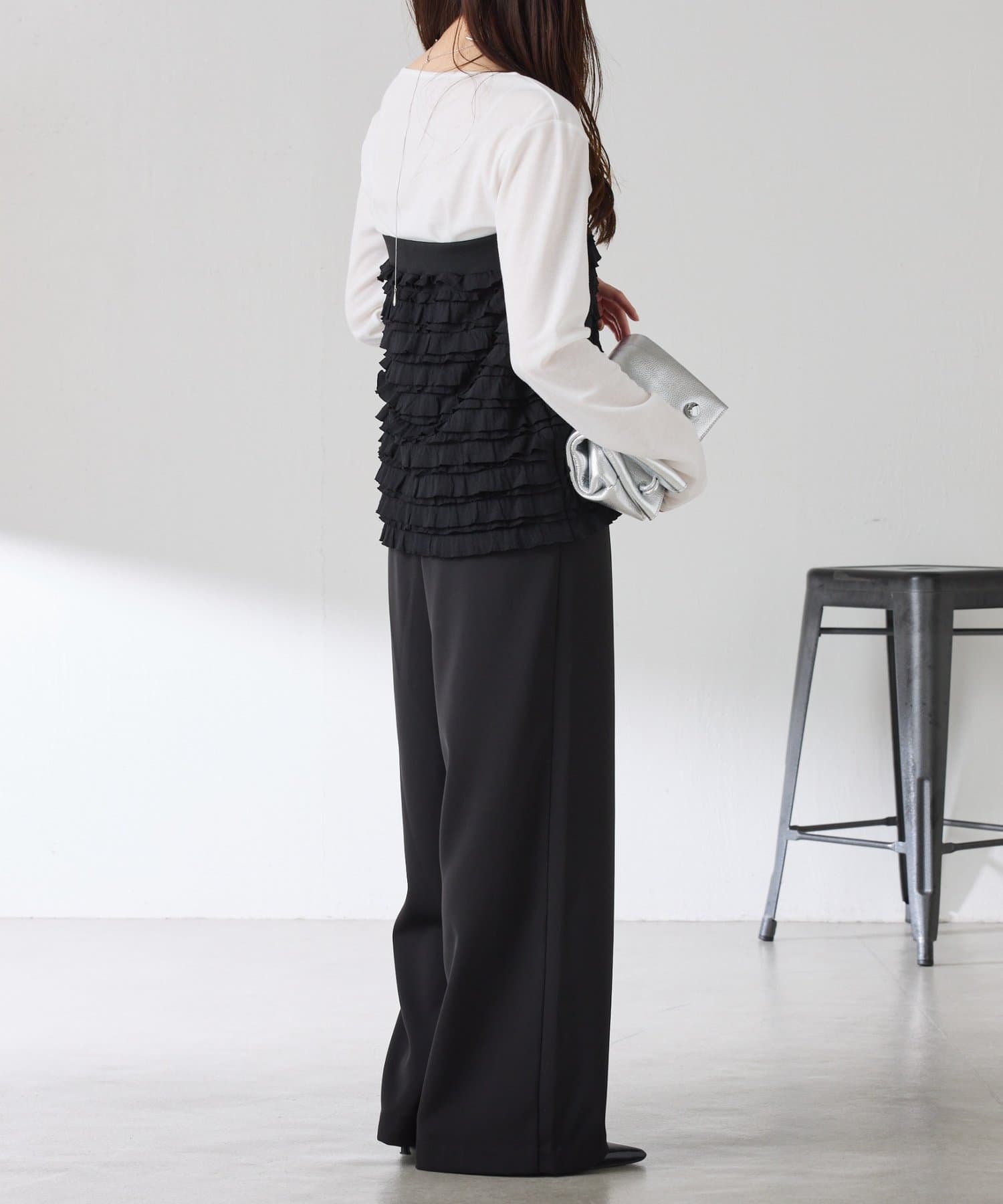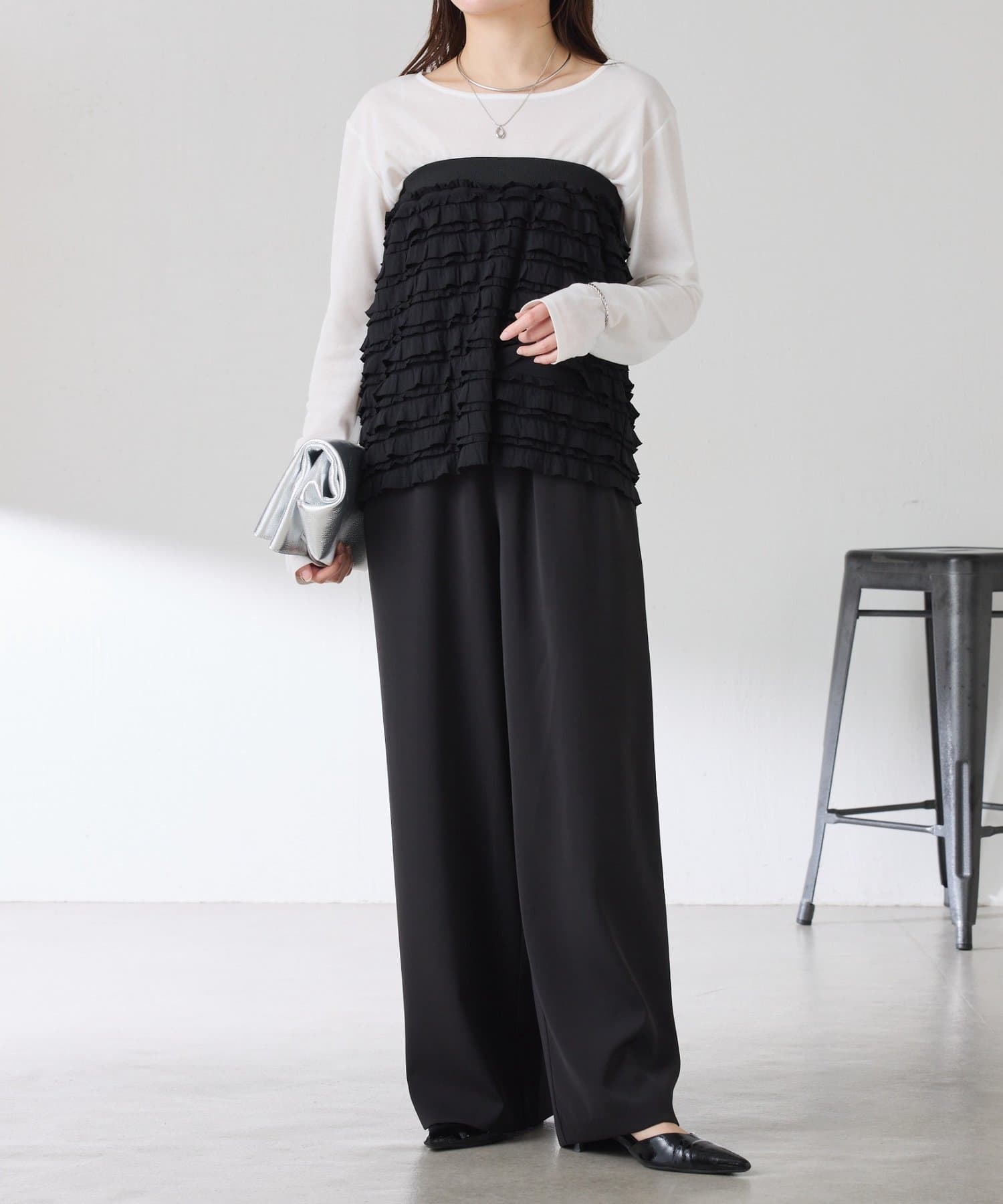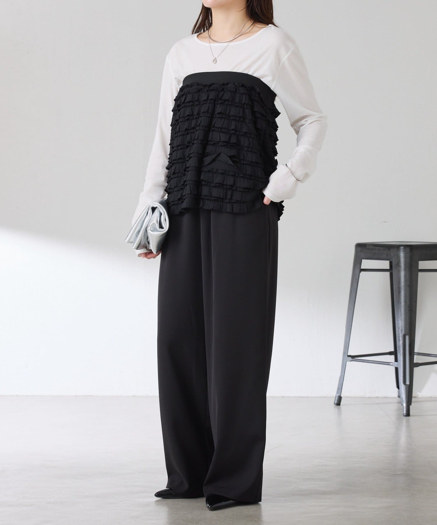 ・フリルですが、カットソ―生地なので甘すぎず、ジャケットやスラックスとも相性が良いです。