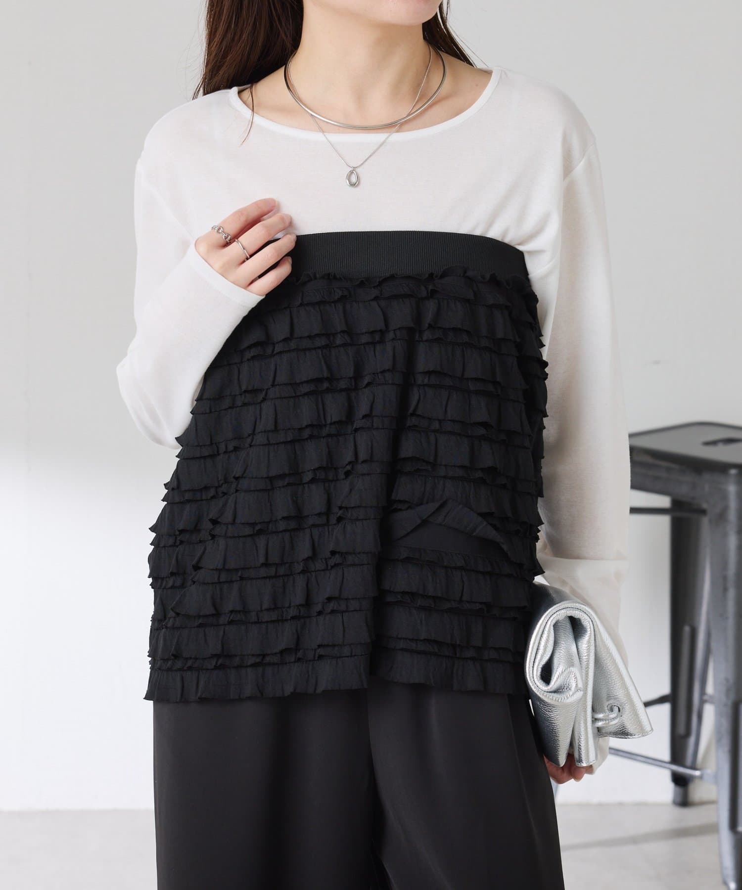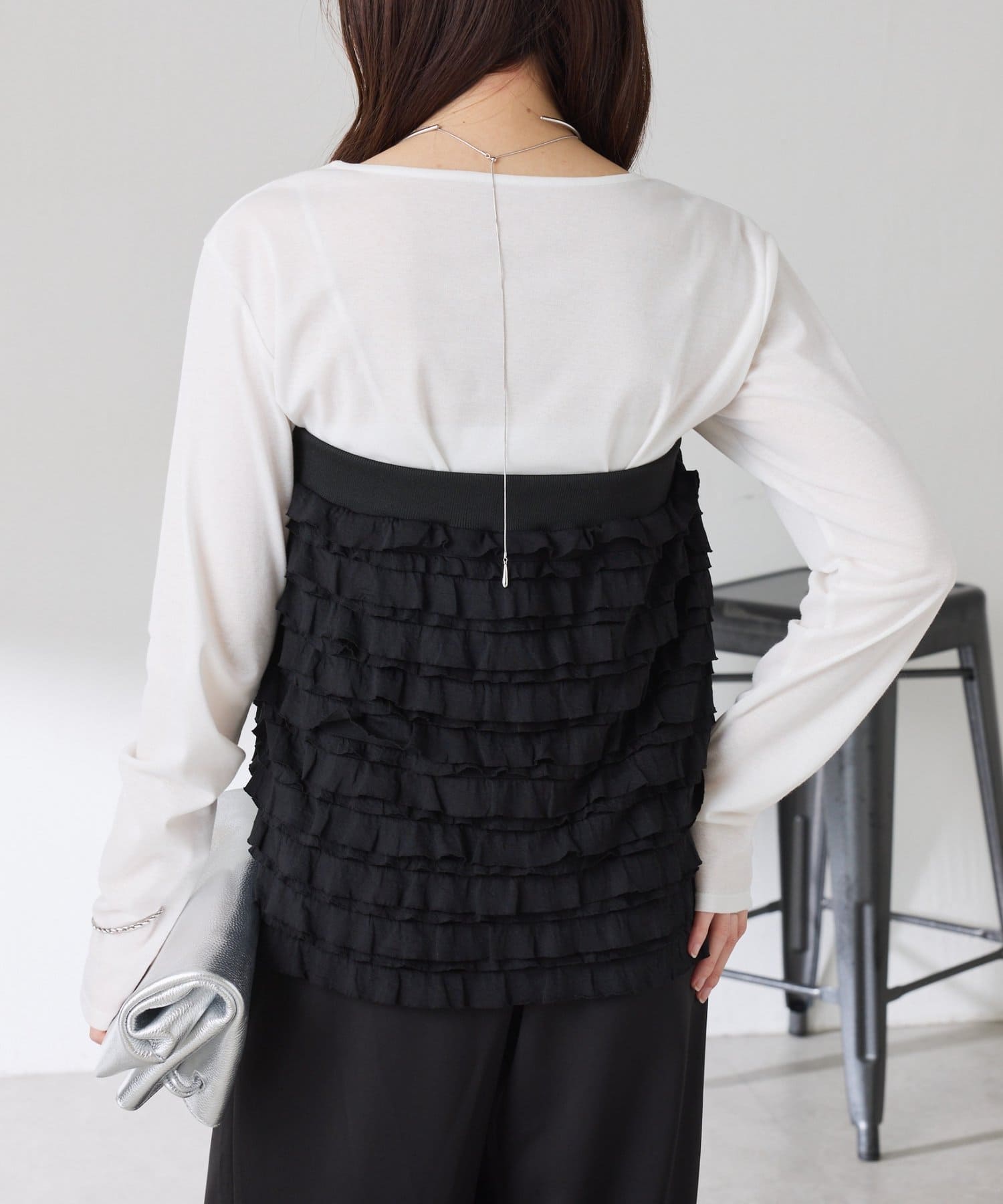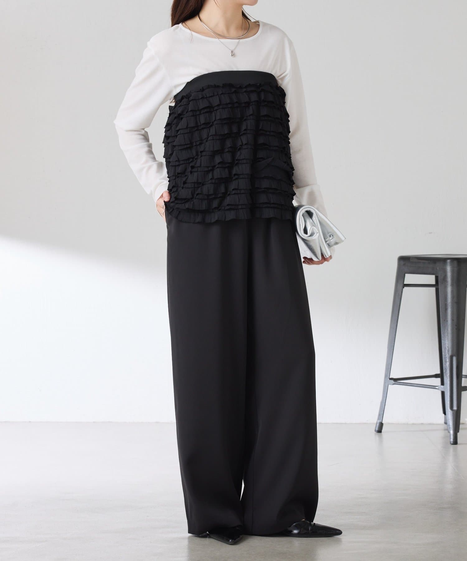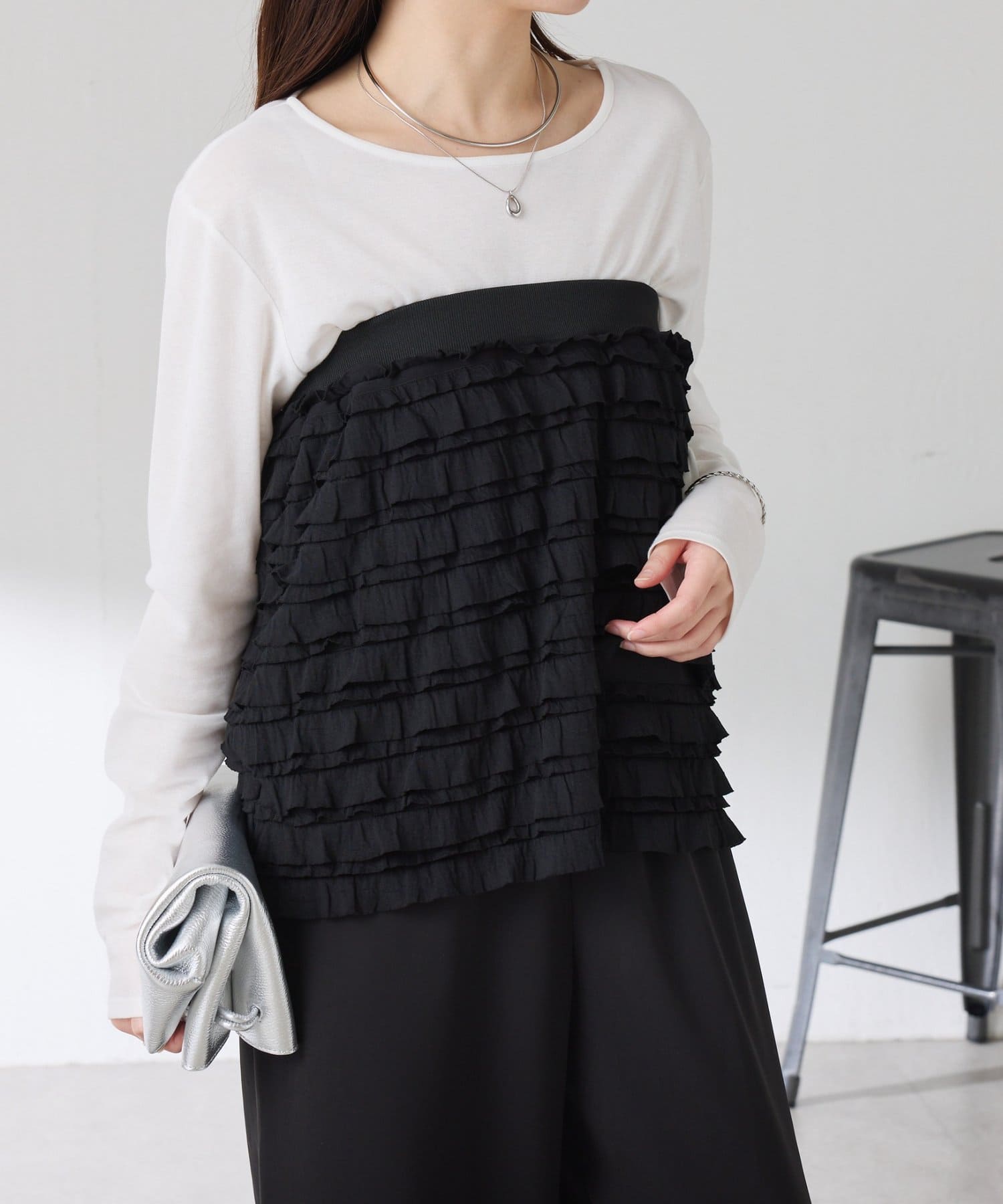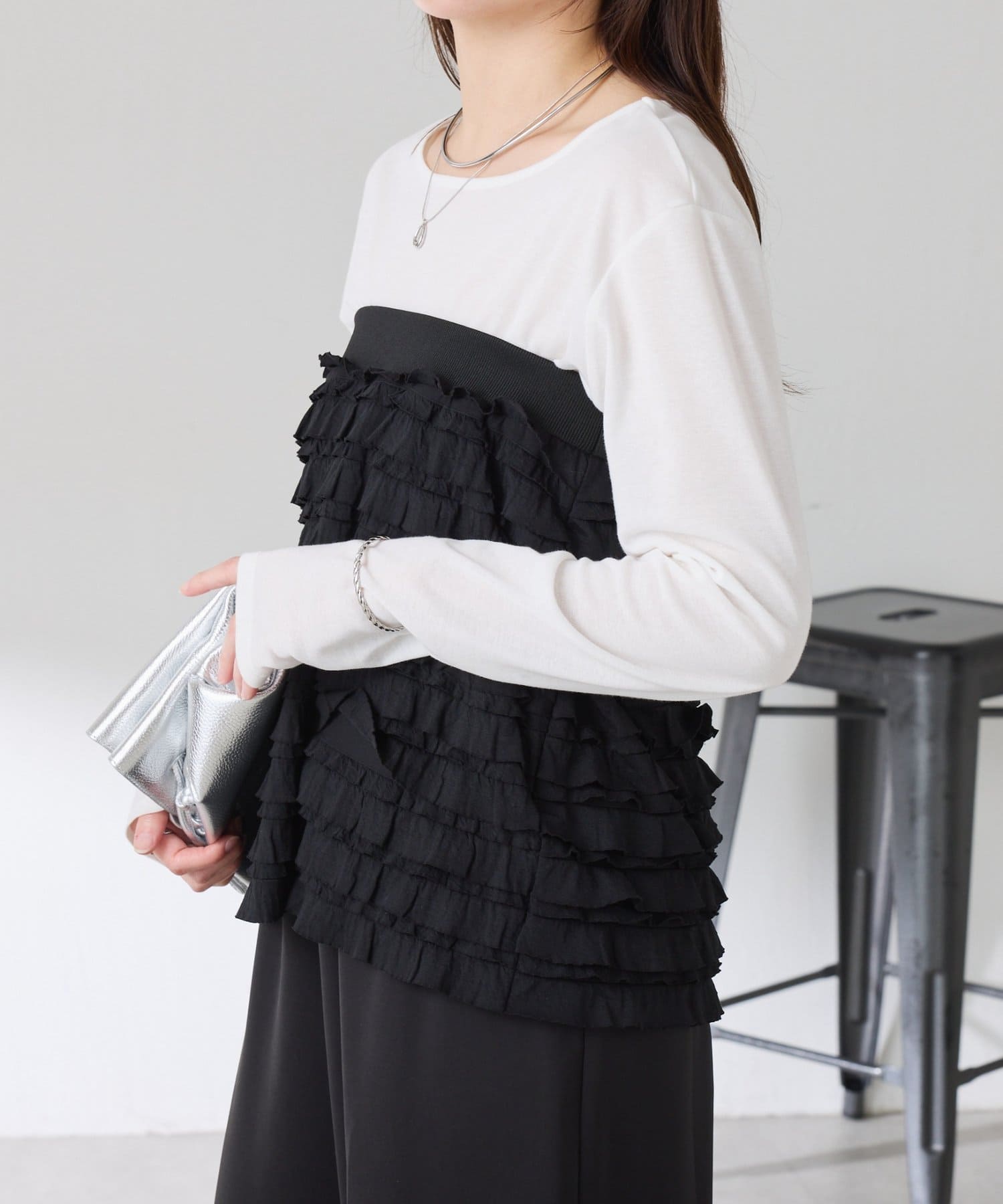 ・フリルですが、カットソ―生地なので甘すぎず、ジャケットやスラックスとも相性が良いです。