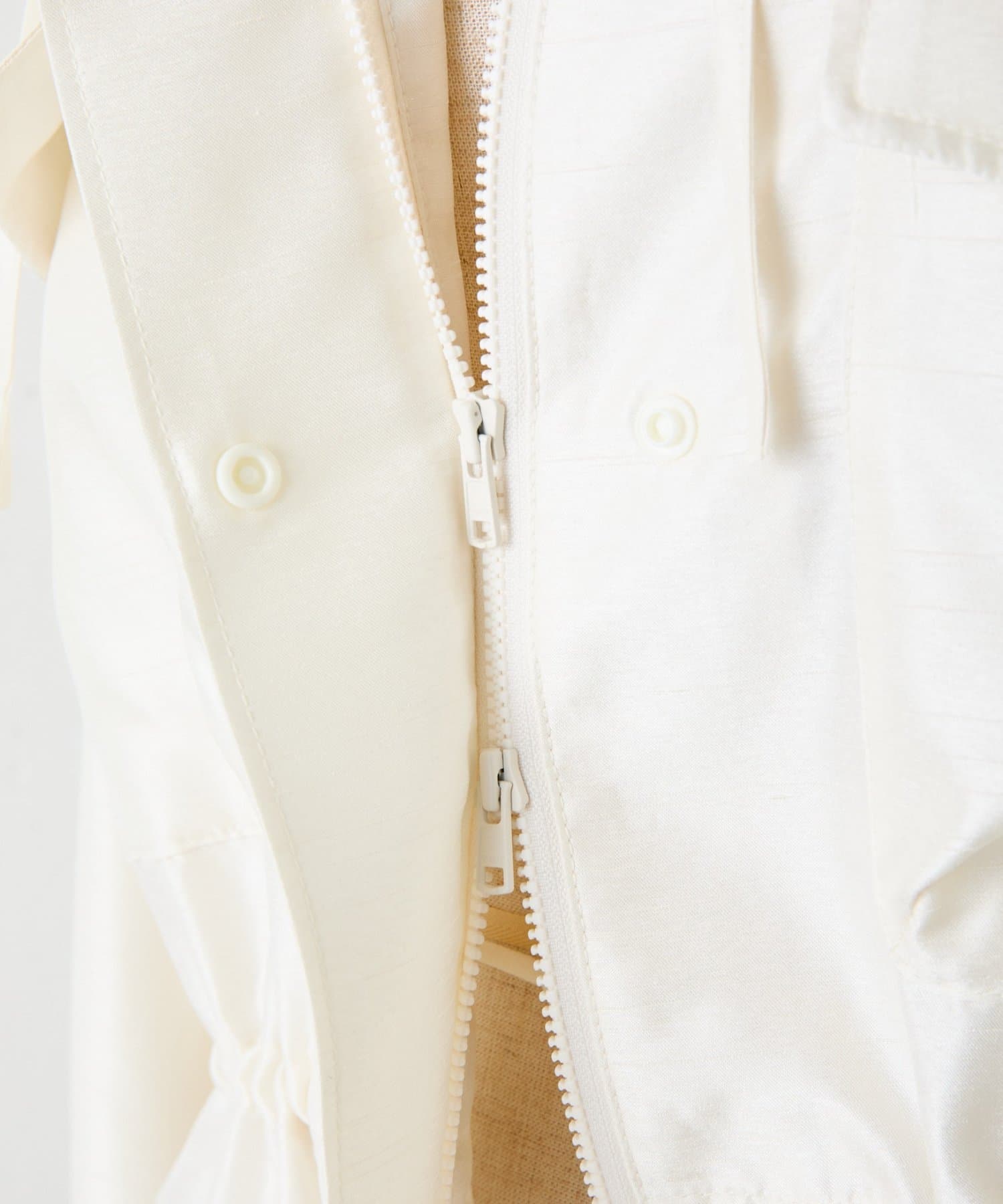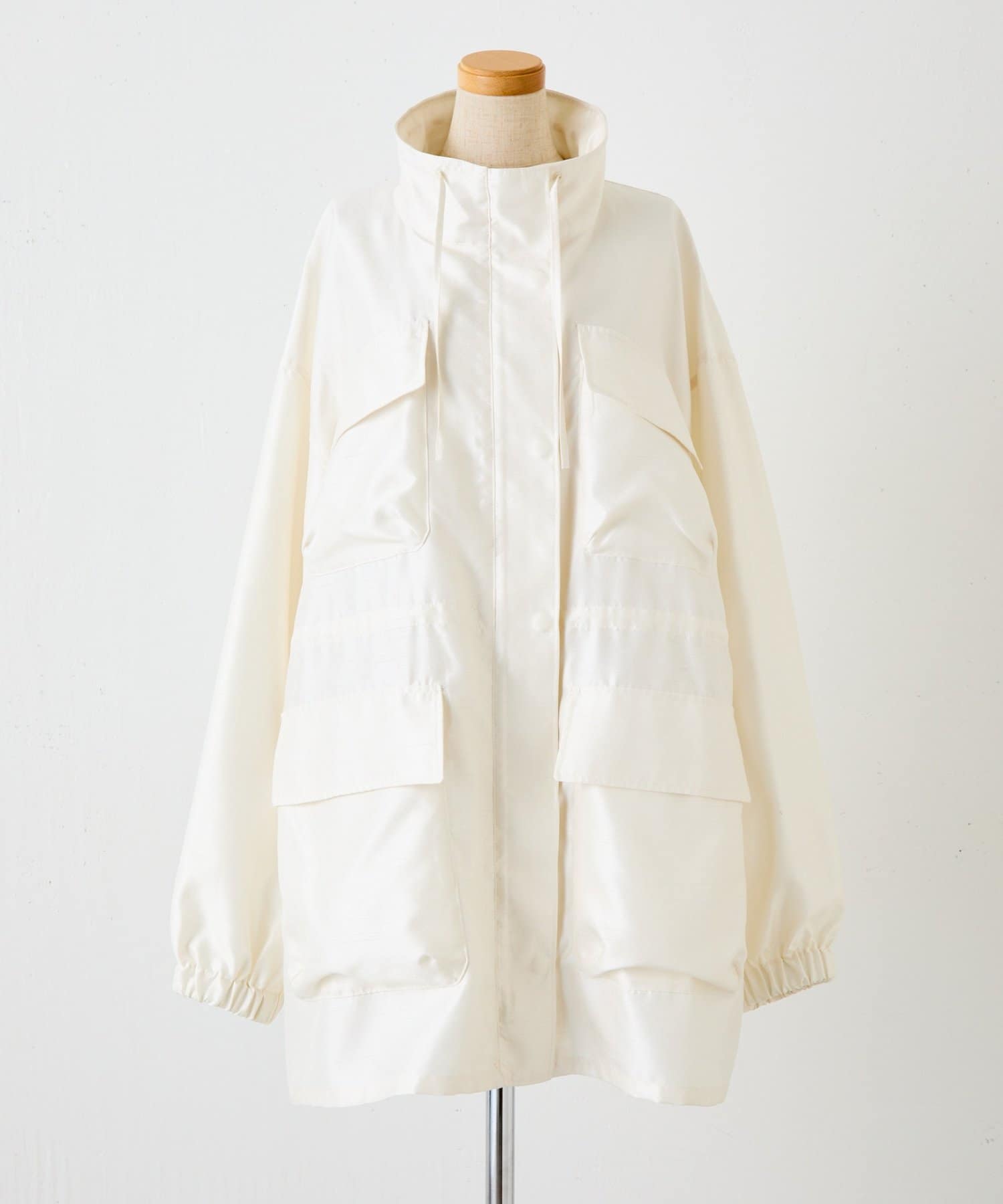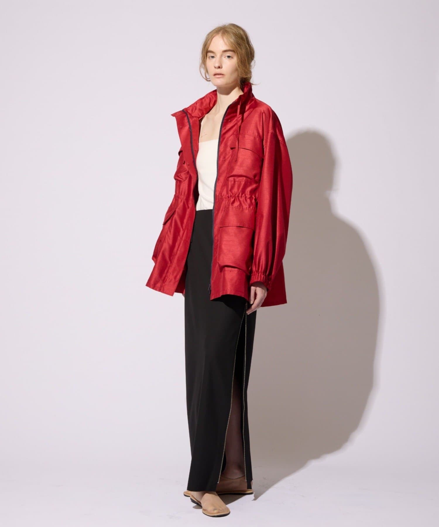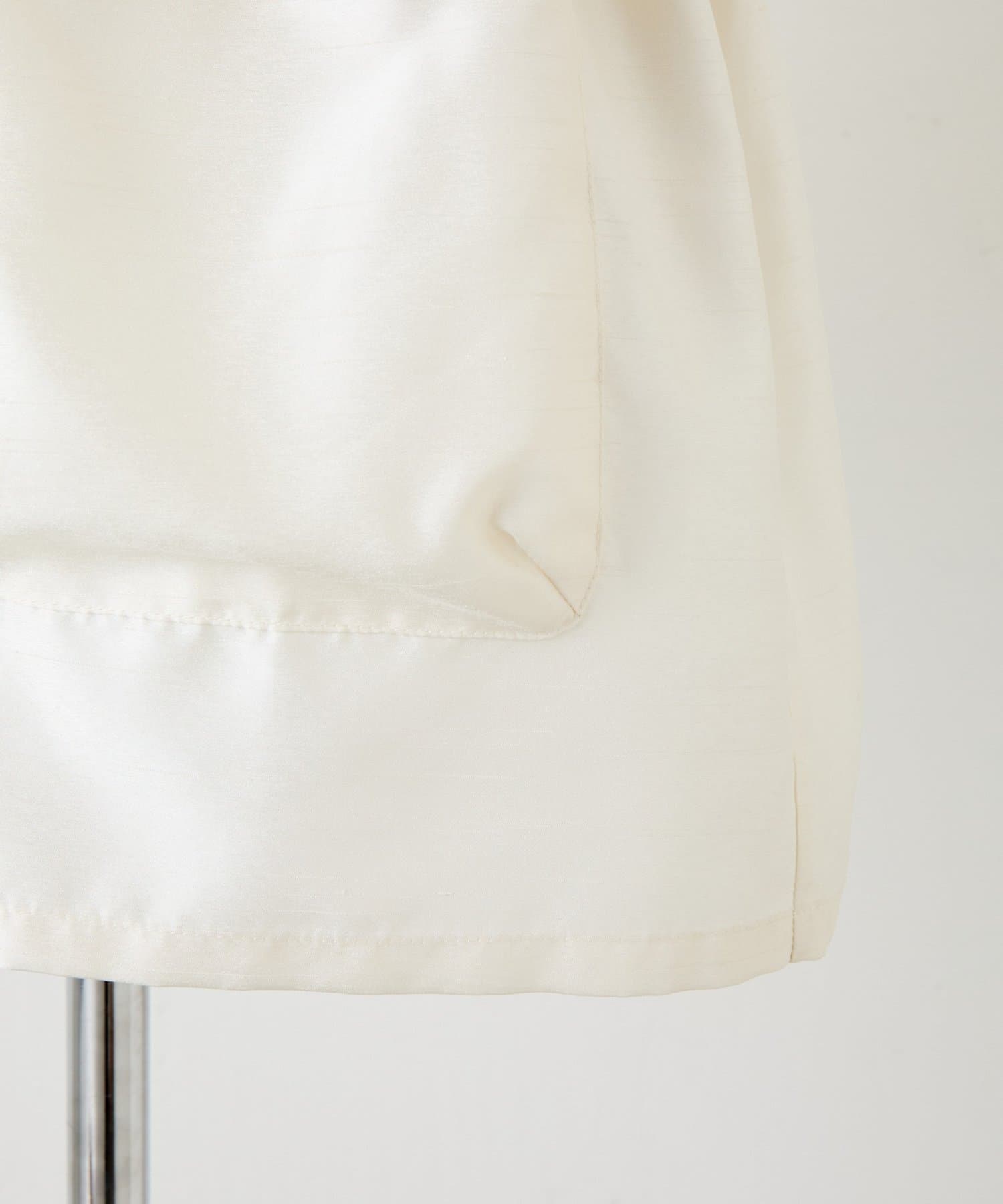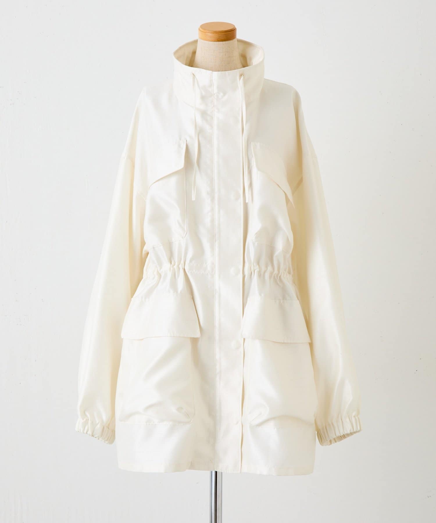 ・シルクライクな光沢感のあるシャンタン素材を使用したスタンドネックブルゾン。