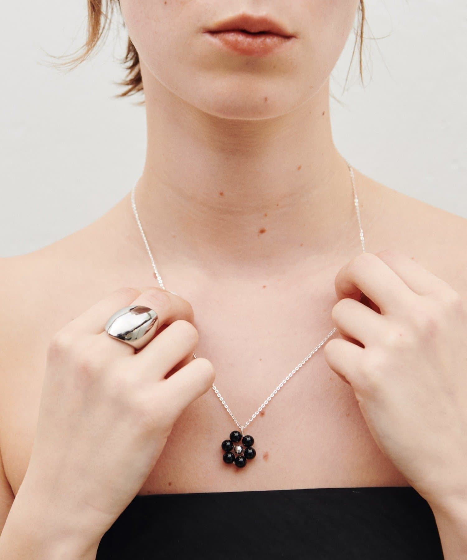 大人の甘辛スタイルに活躍するフラワーモチーフネックレス