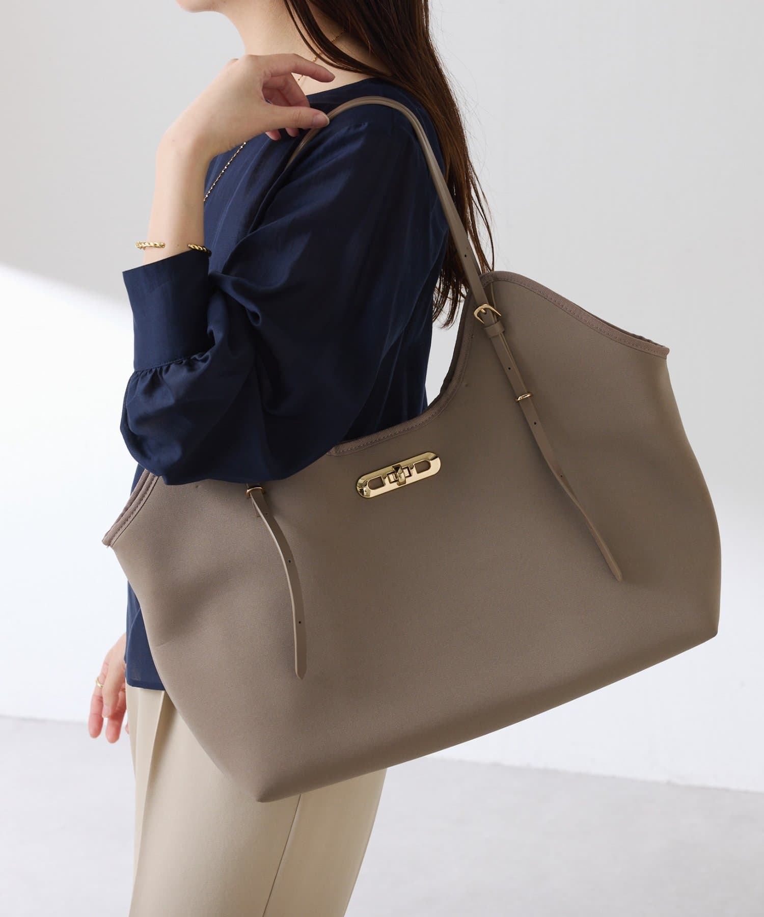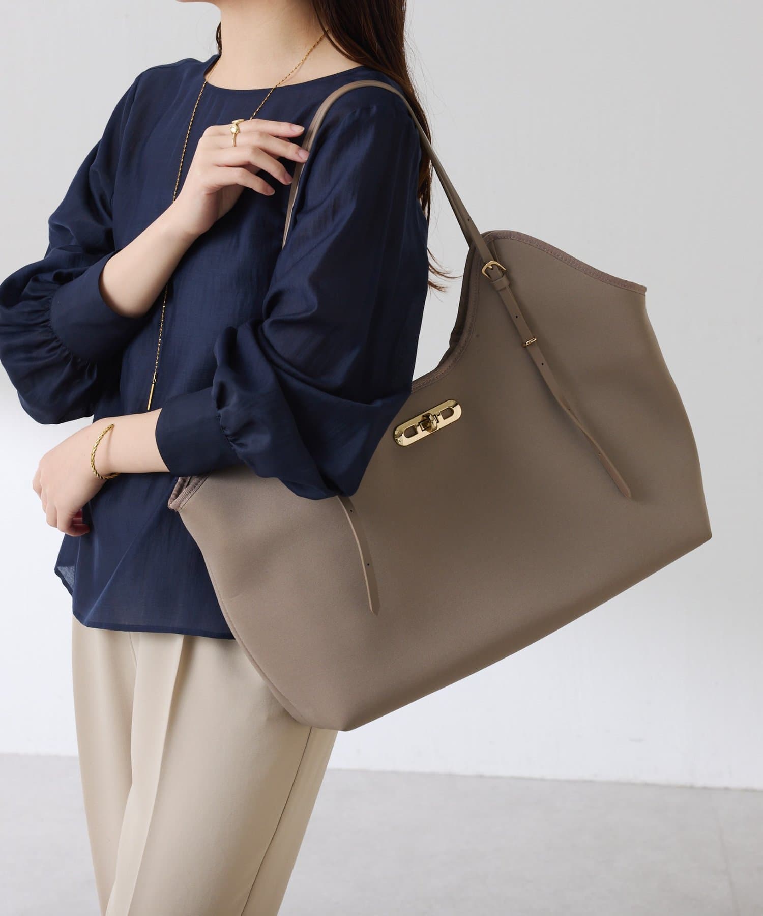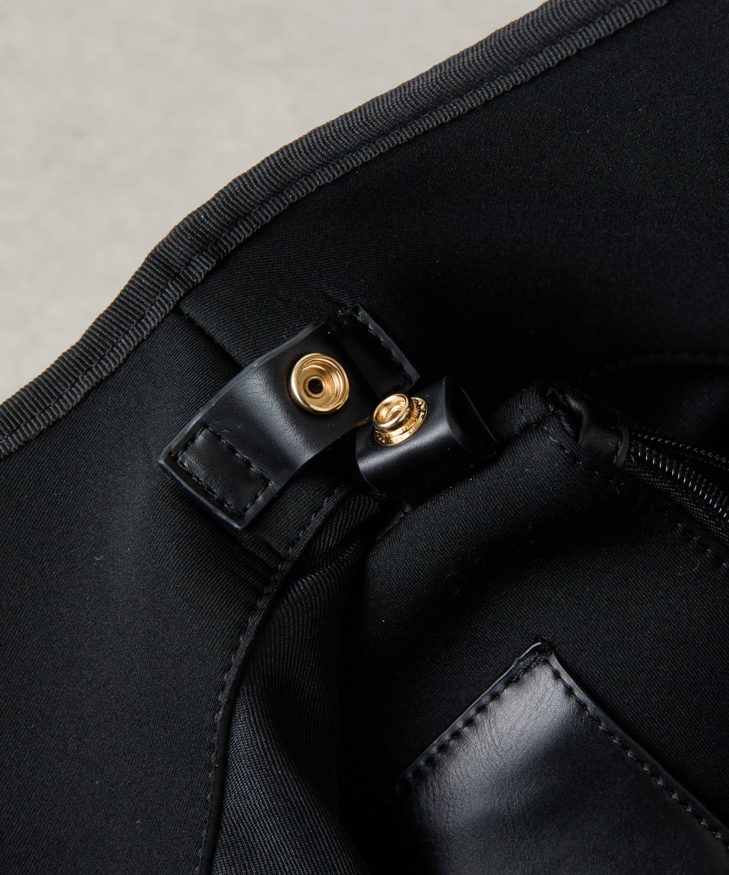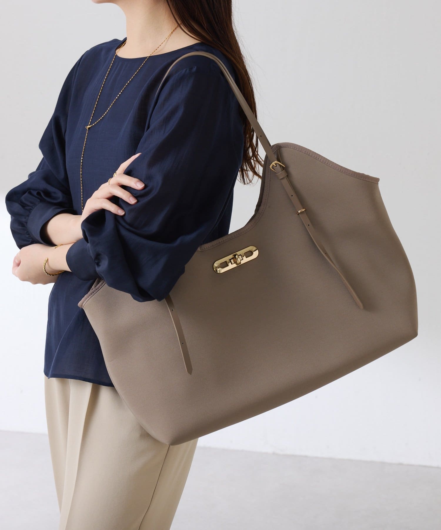 ・ウェット素材のトートバッグにパイピングを施したきれい見えバッグ。
