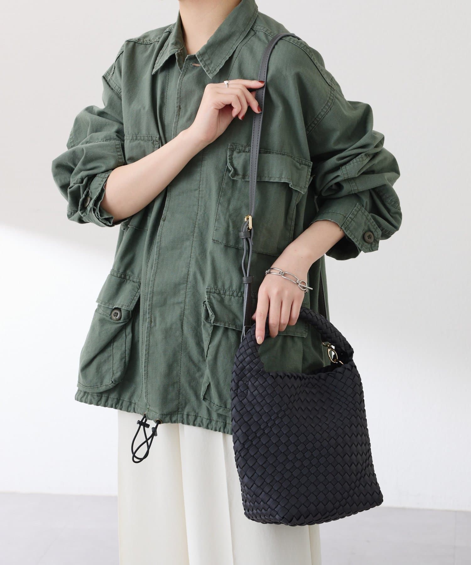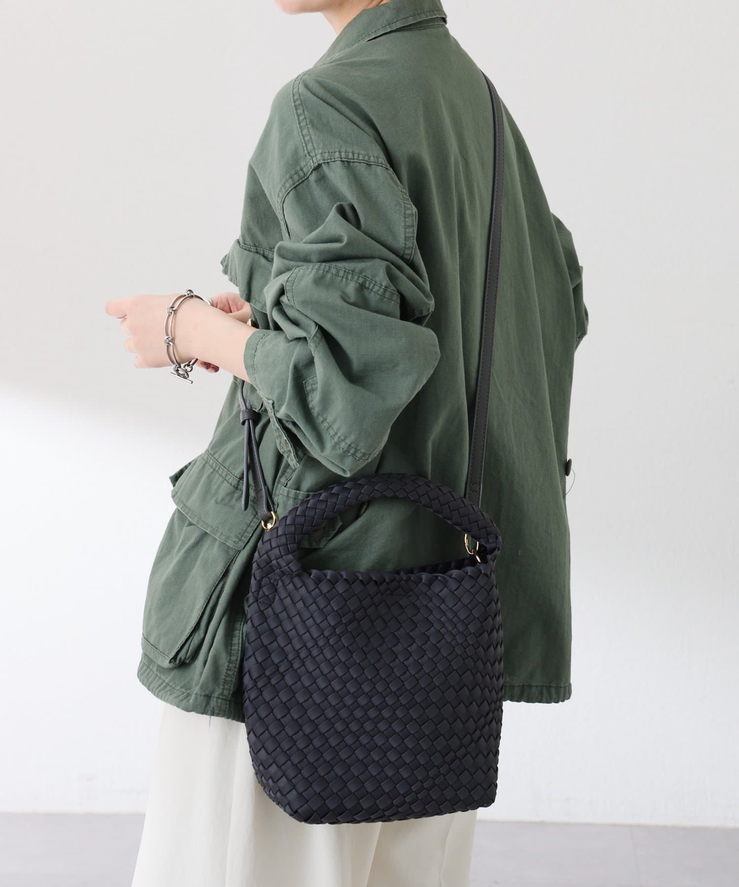 ・コロンとしたバケツ型フォルムとワンハンドルがこなれて見え、カジュアルでもきれいめでも馴染みます。