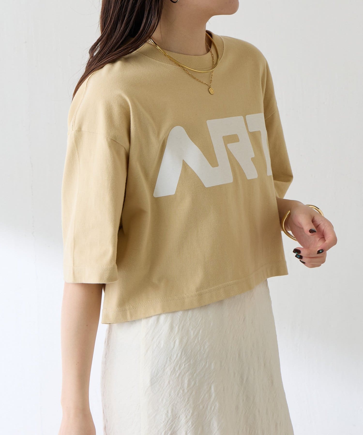 ・大きめのメンズサイズをショート丈にカット。肘辺りまで袖はあるので、そでぐりを折るとすっきり着ていただけます◎
