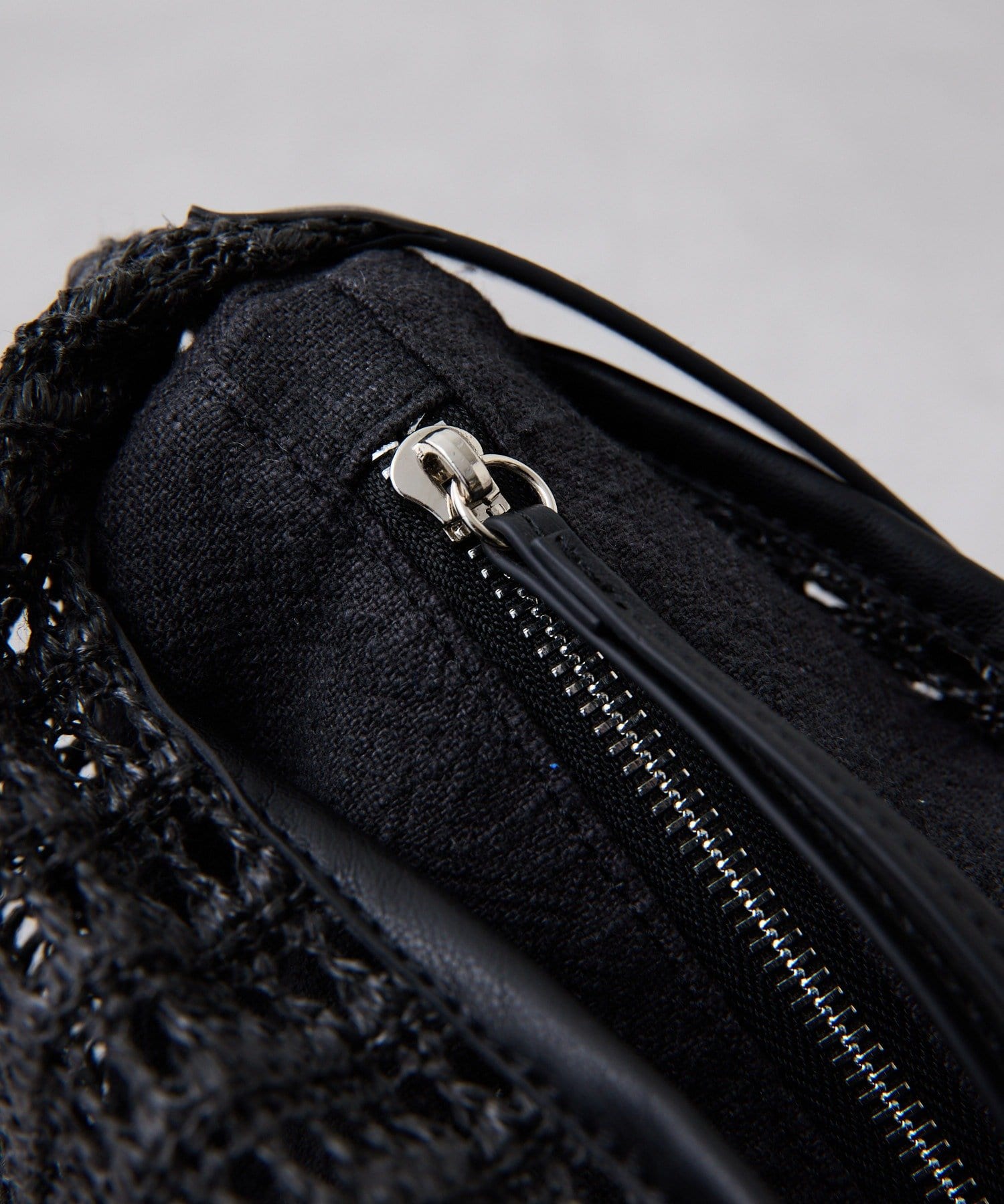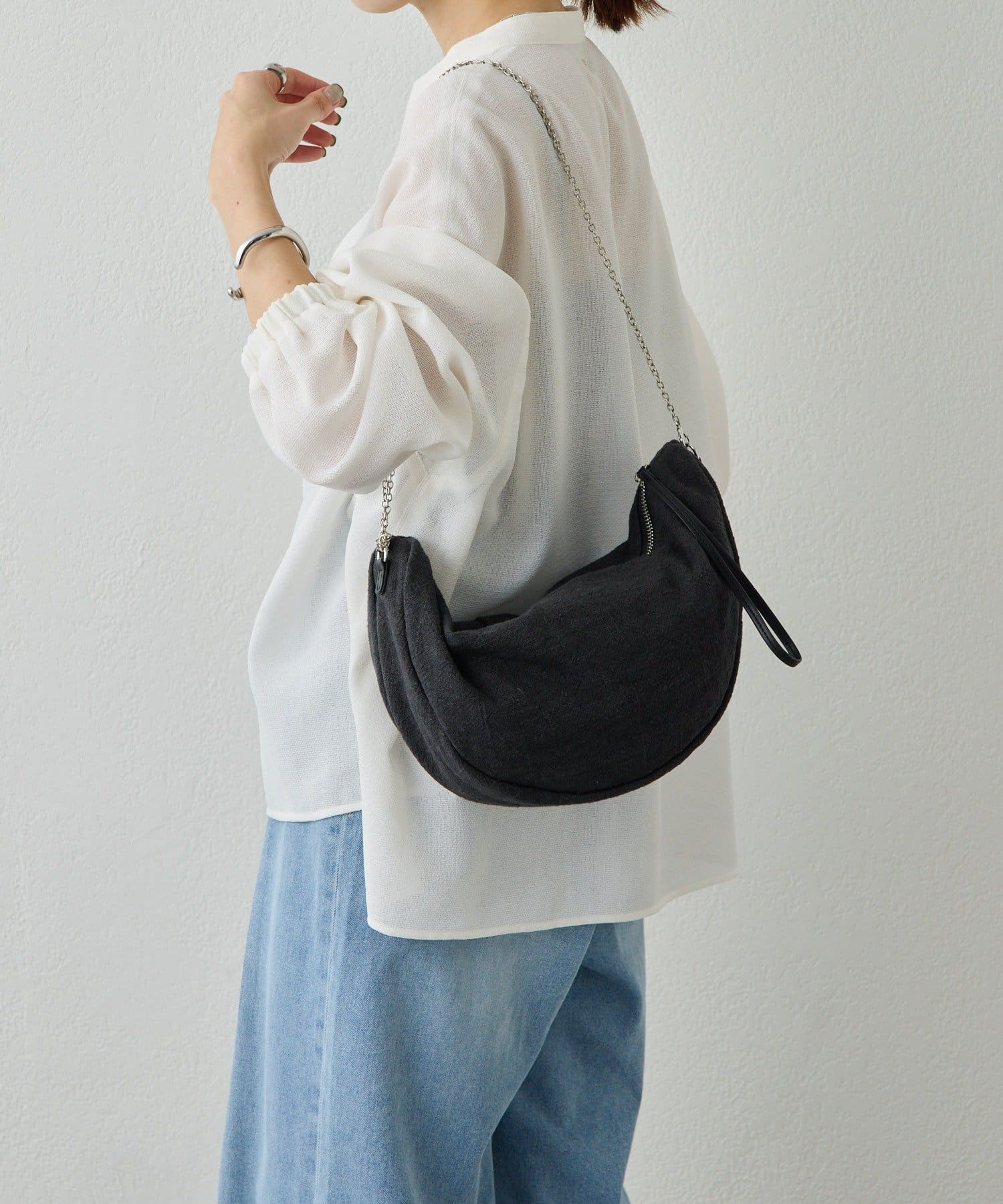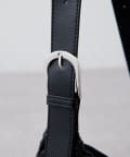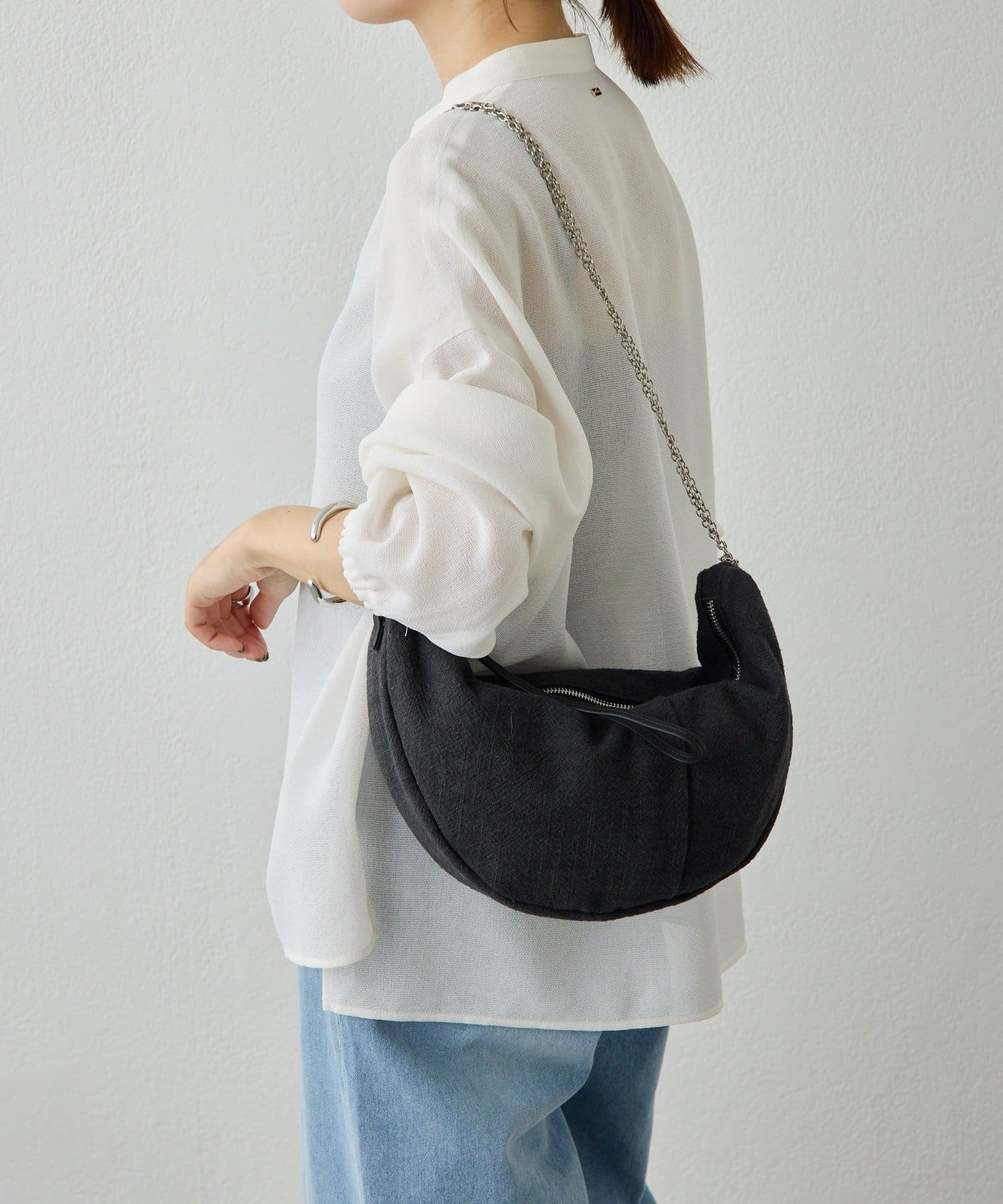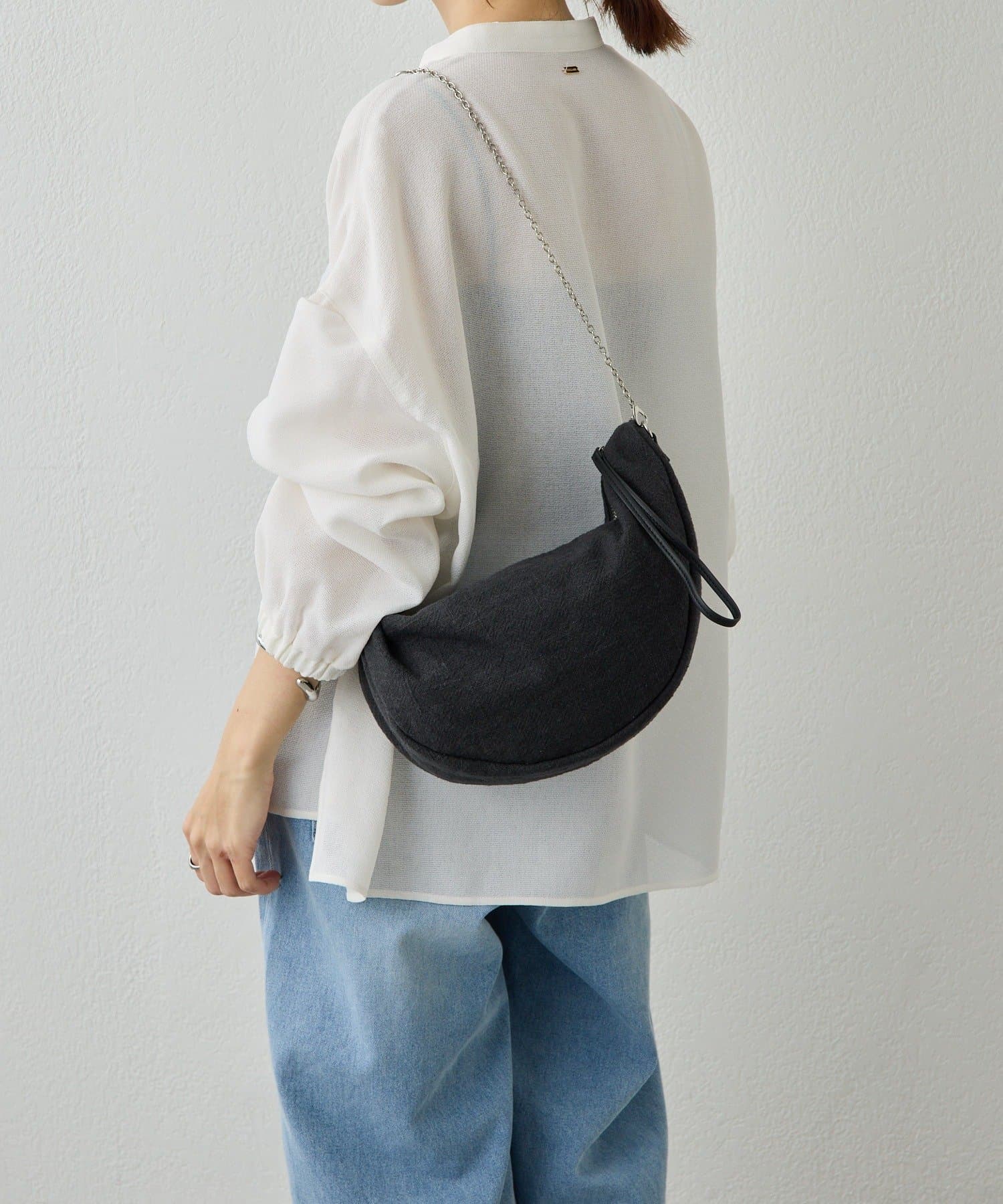 ・ラフな雰囲気になりすぎないようにパイピングと持ち手を異素材にしているのもポイント。
