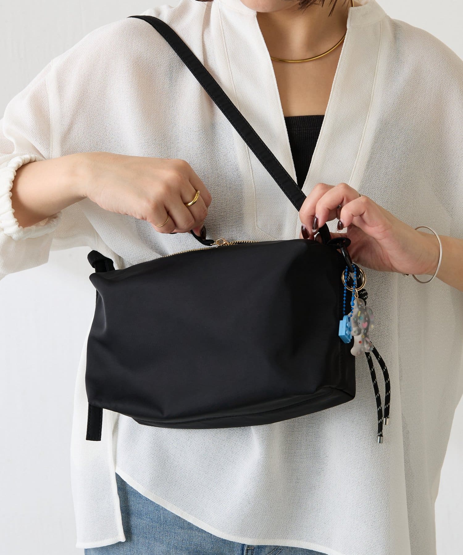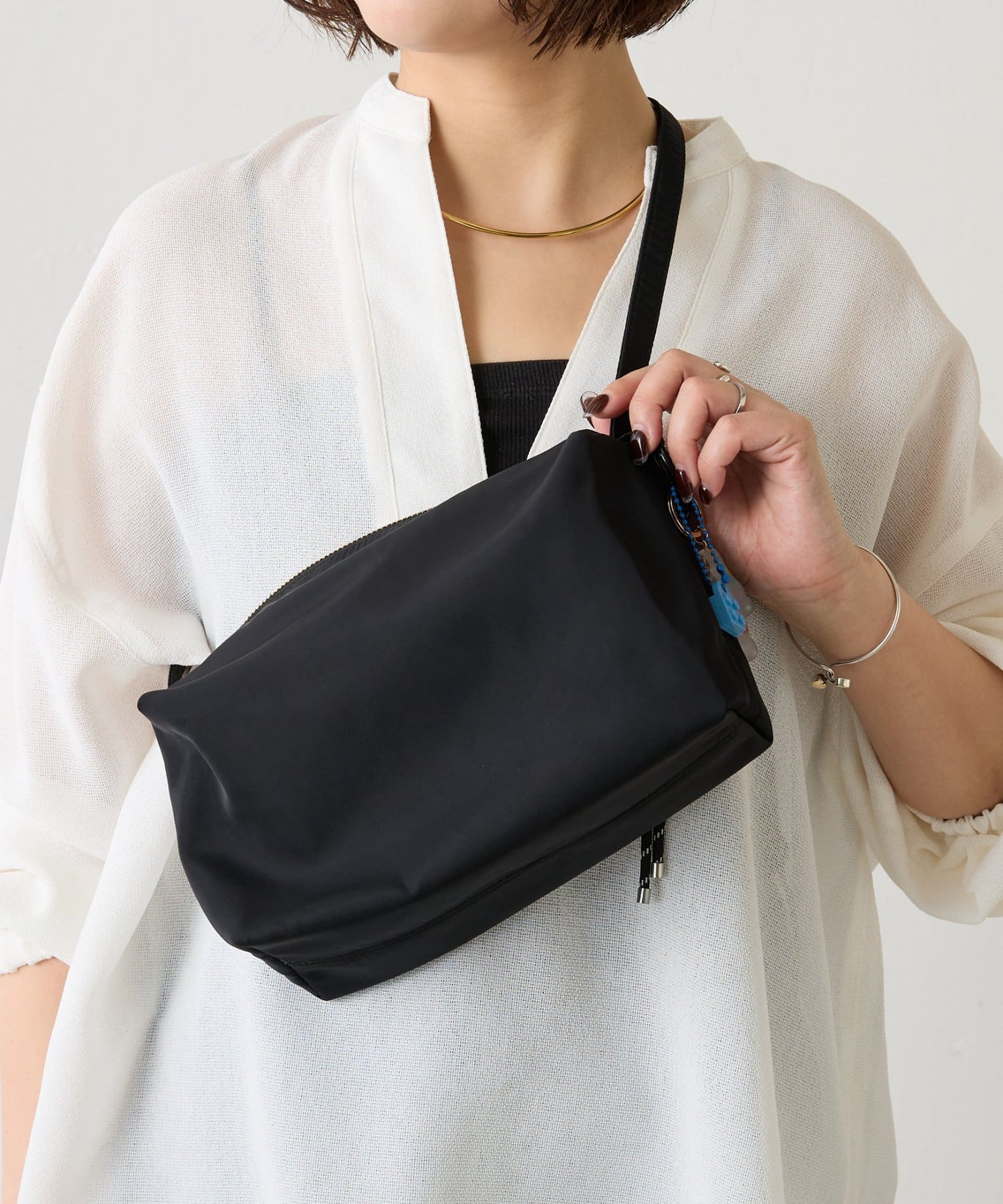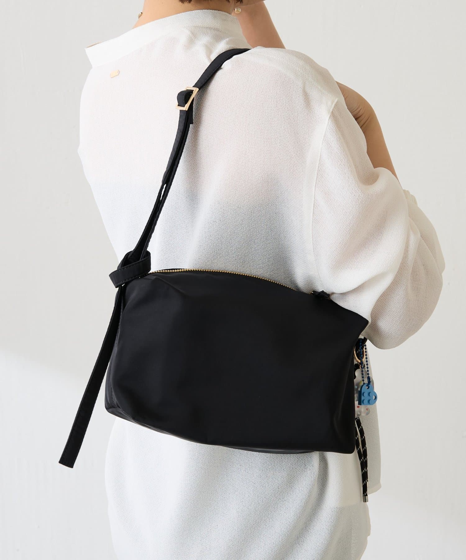 ハリのあるナイロン素材やきらりと光るゴールドのファスナーがカジュアルすぎず大人っぽい印象に。
