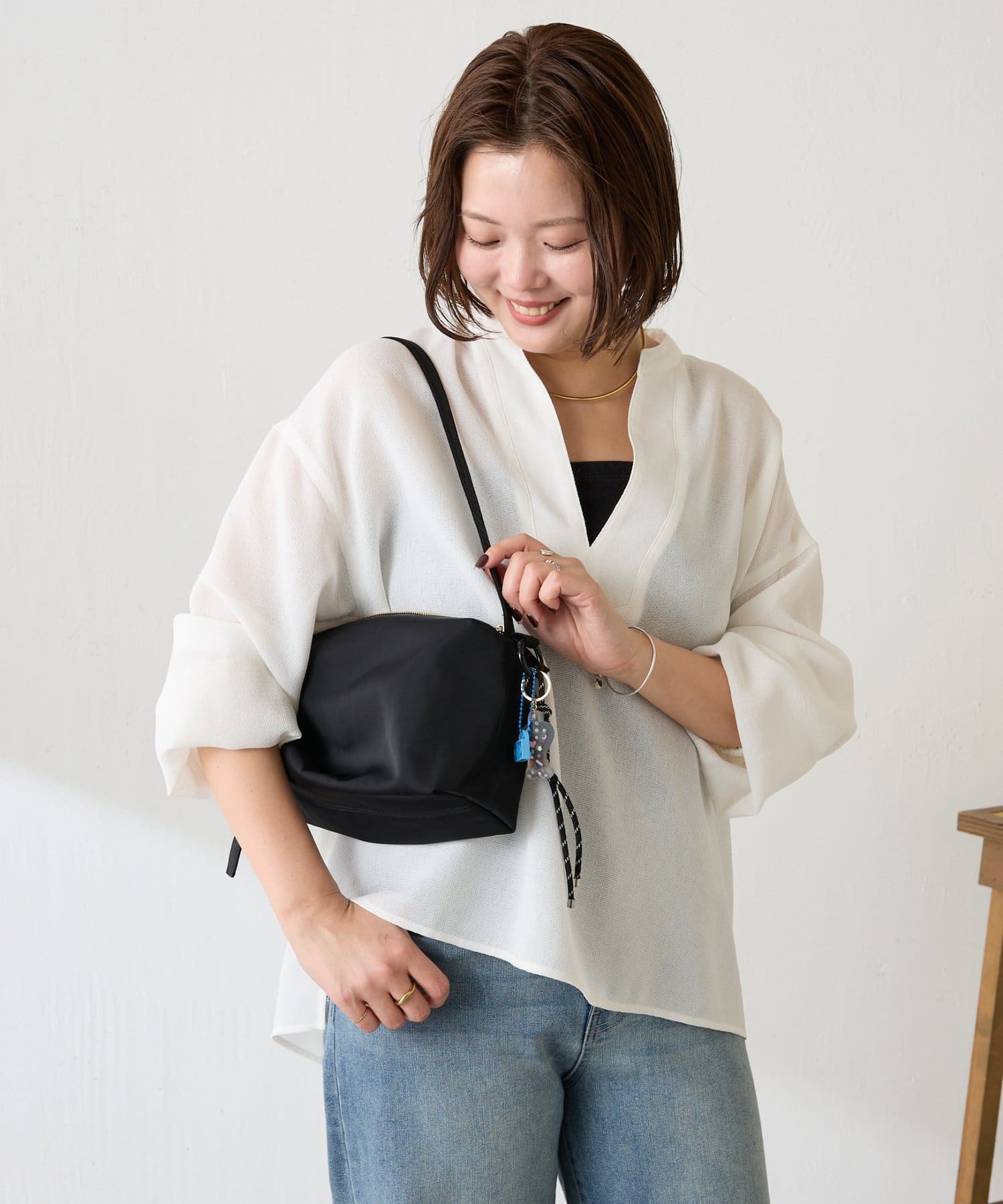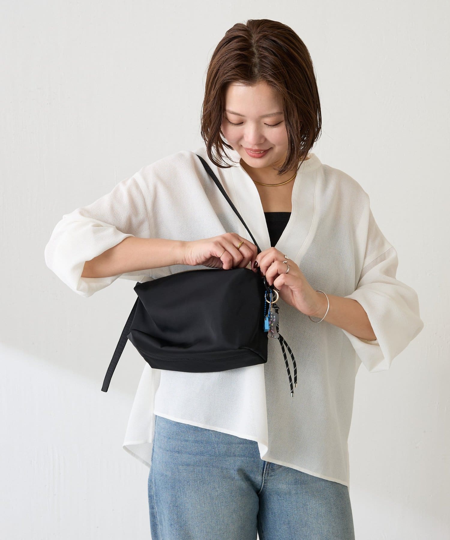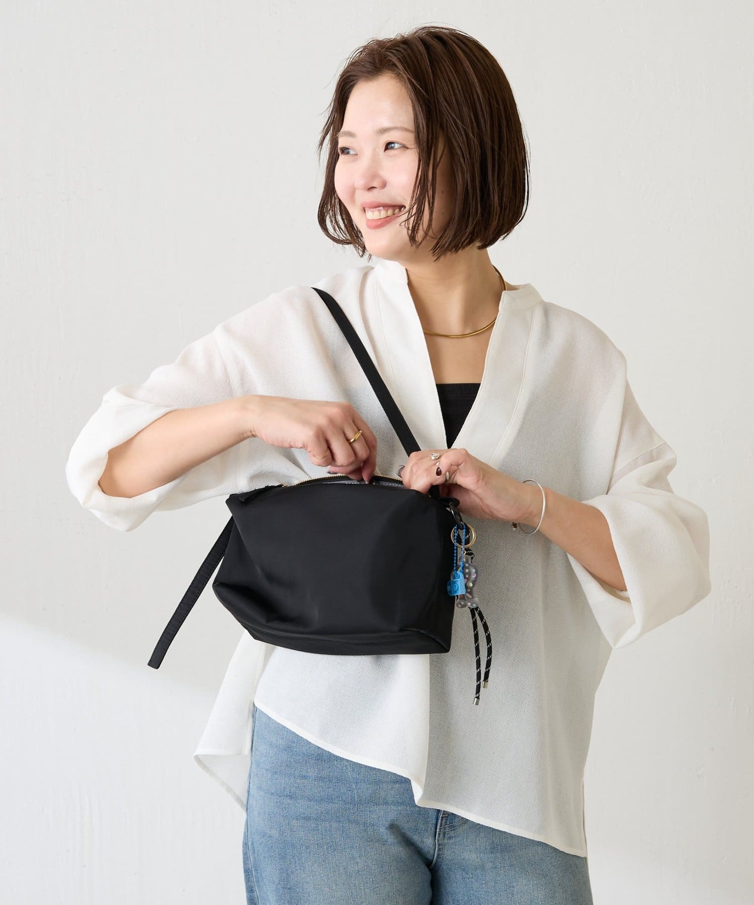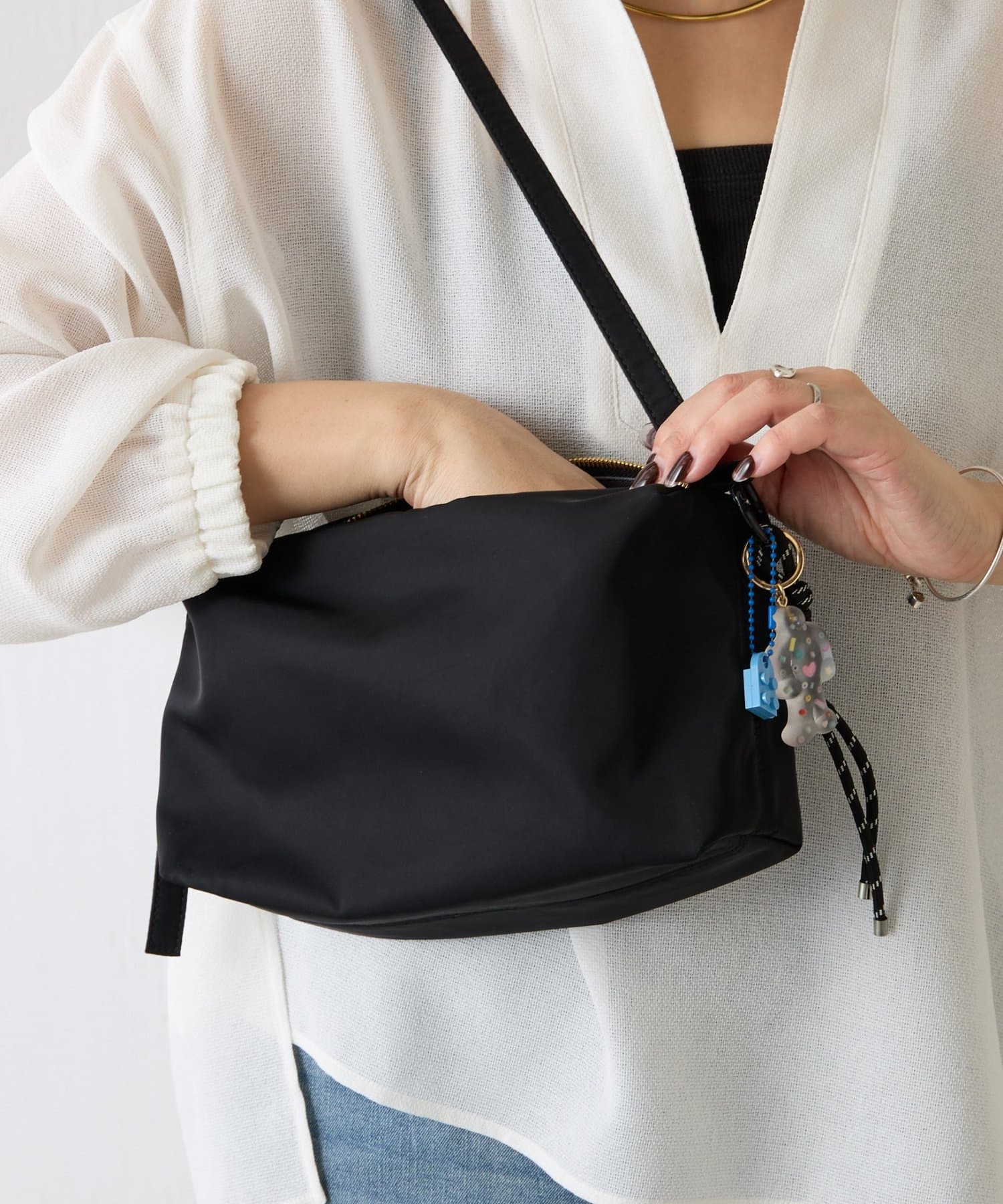 ハリのあるナイロン素材やきらりと光るゴールドのファスナーがカジュアルすぎず大人っぽい印象に。