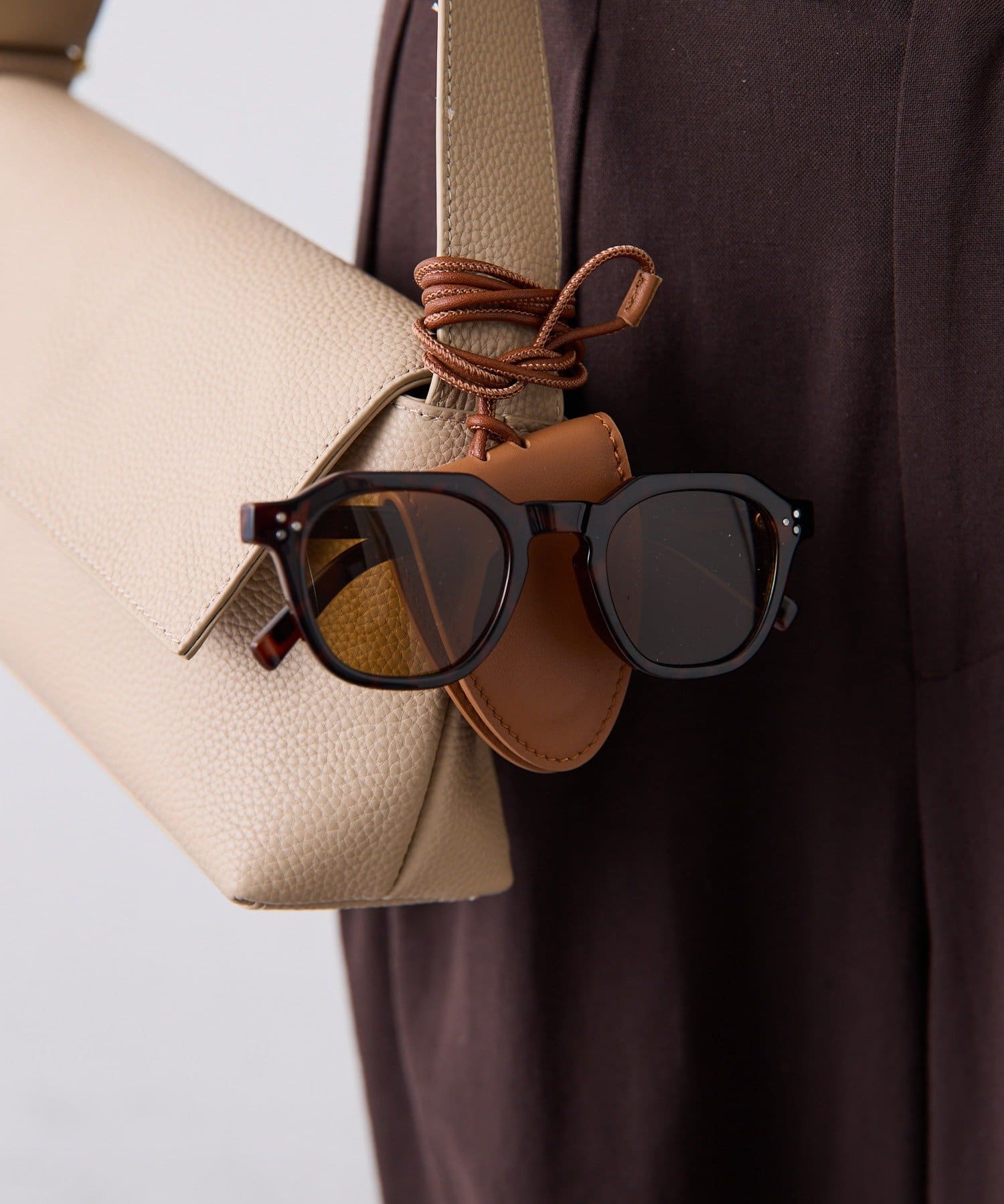 ・メガネを挟まずにネックレスとしてもレザーの風合いがコーデを引き締めてくれます。