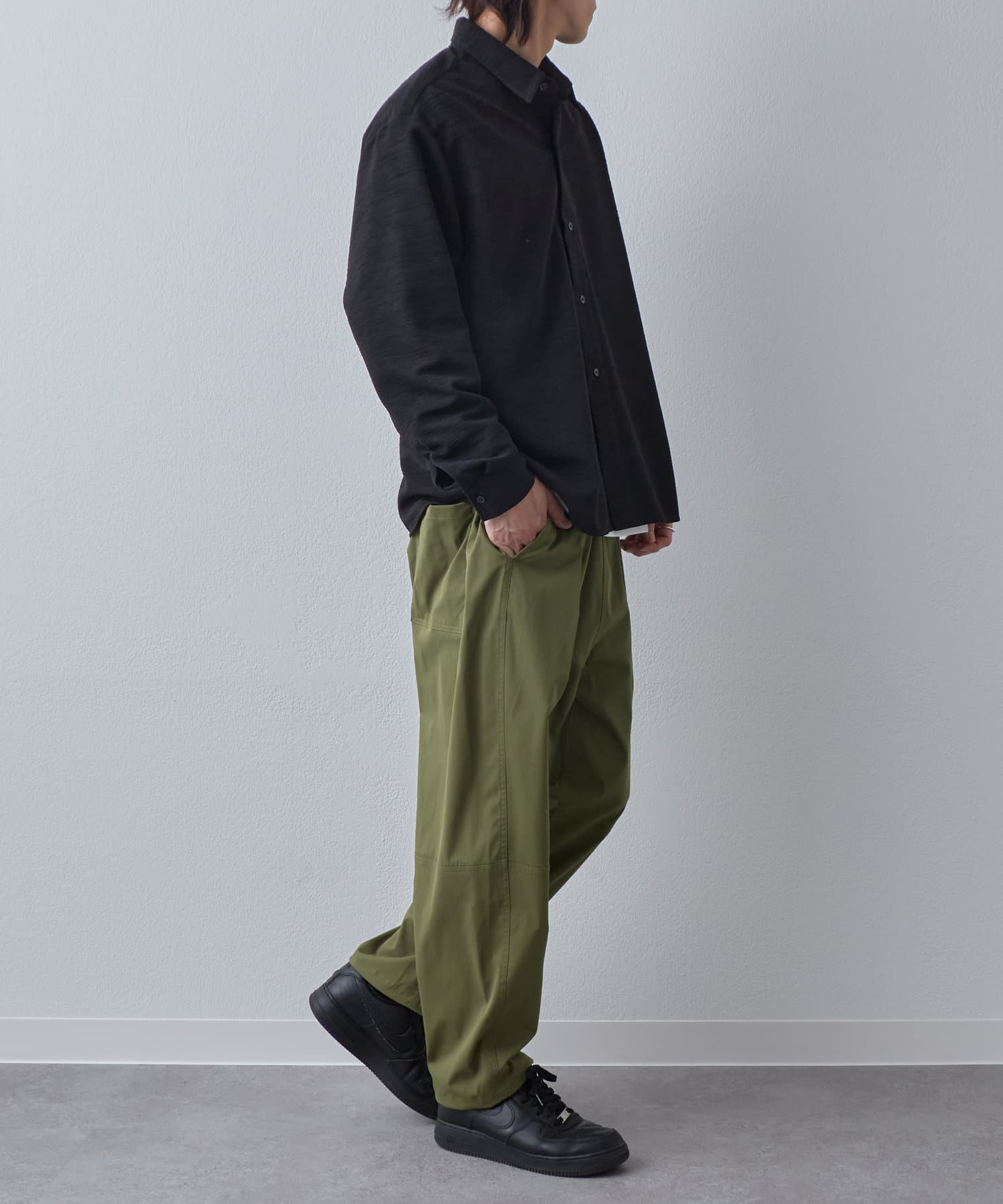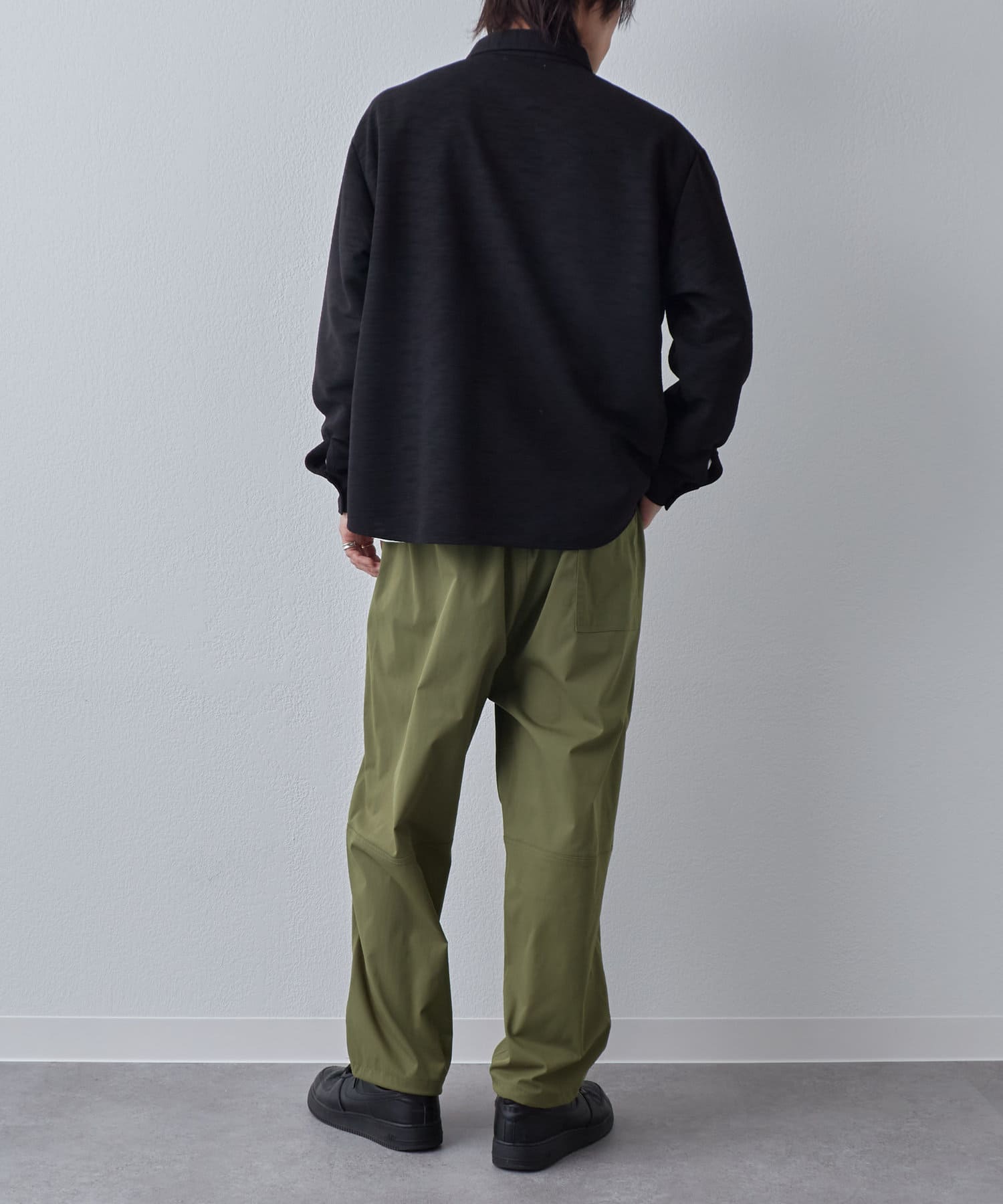 柔らかくやや伸縮性のある素材で動きやすさもあり、軽やかで通気性のある素材を使用しているので春から秋にかけて快適に着用していただけます。
