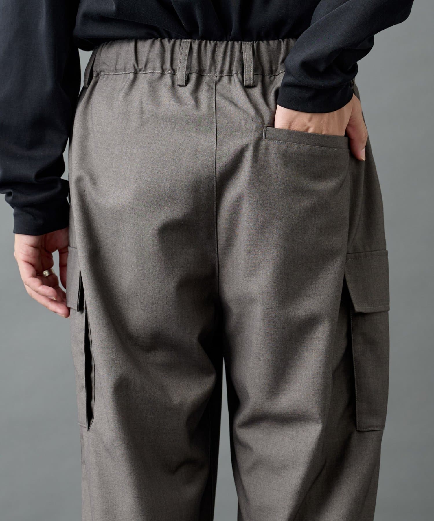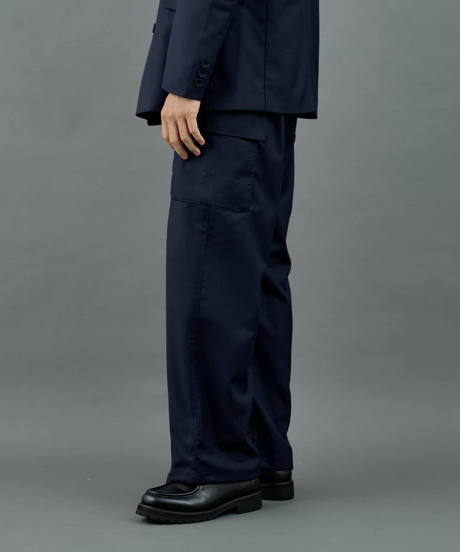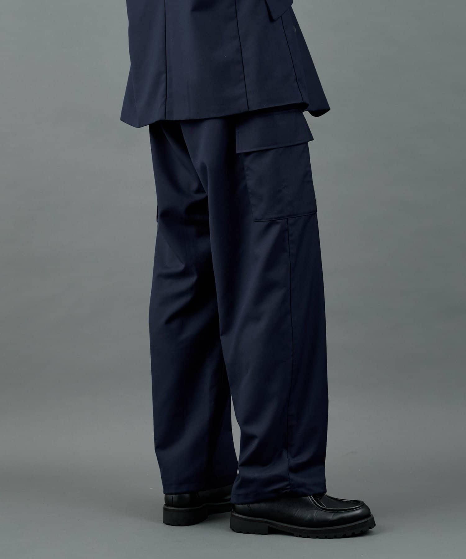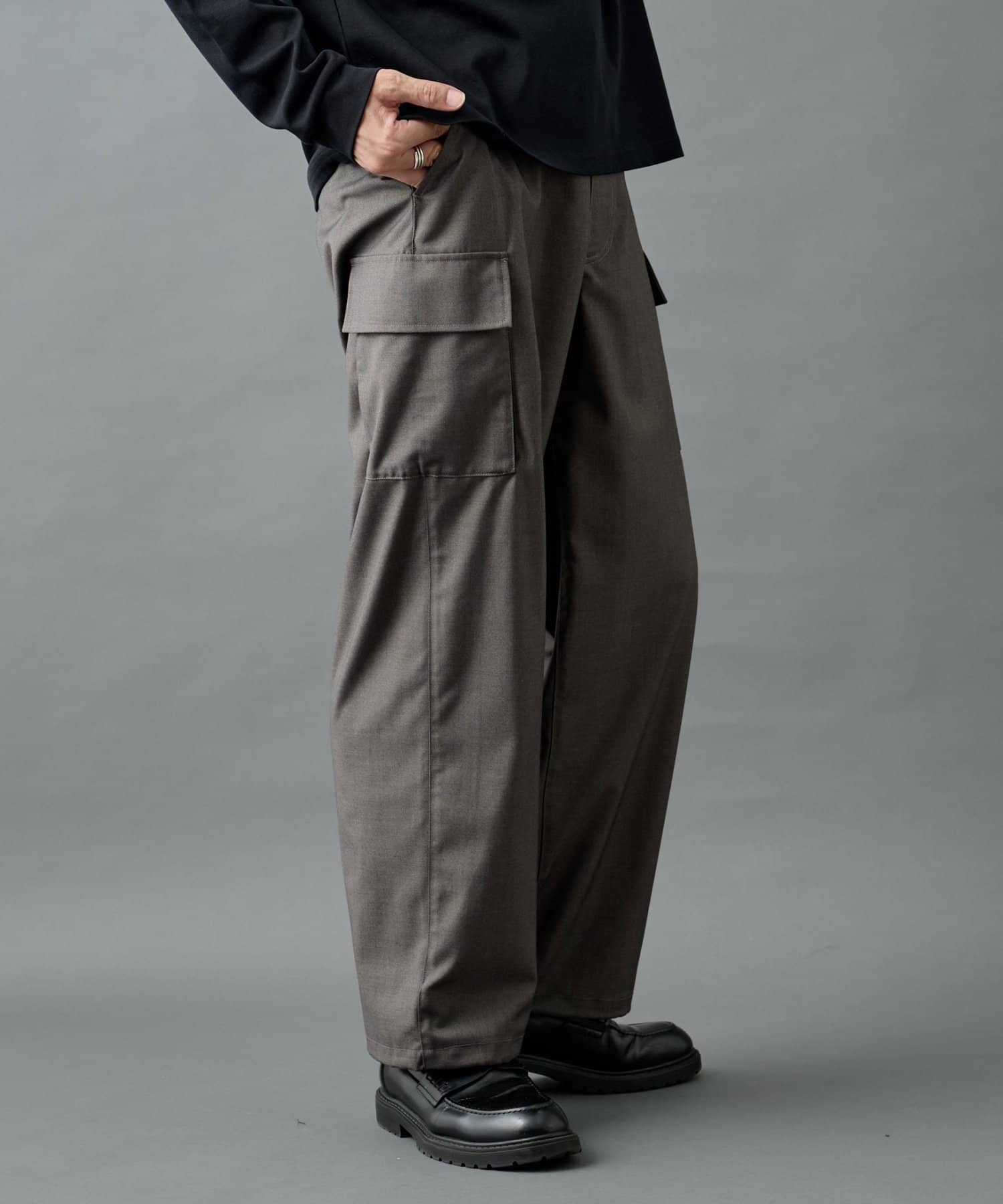 ミリタリー由来のカーゴディテールを、スラックス仕様の美しいシルエットに落とし込んだシルエットがポイントです。