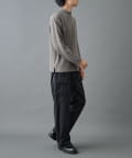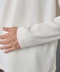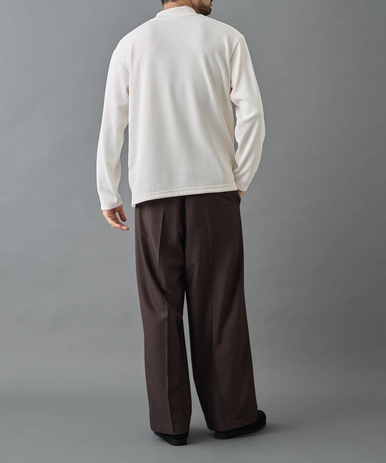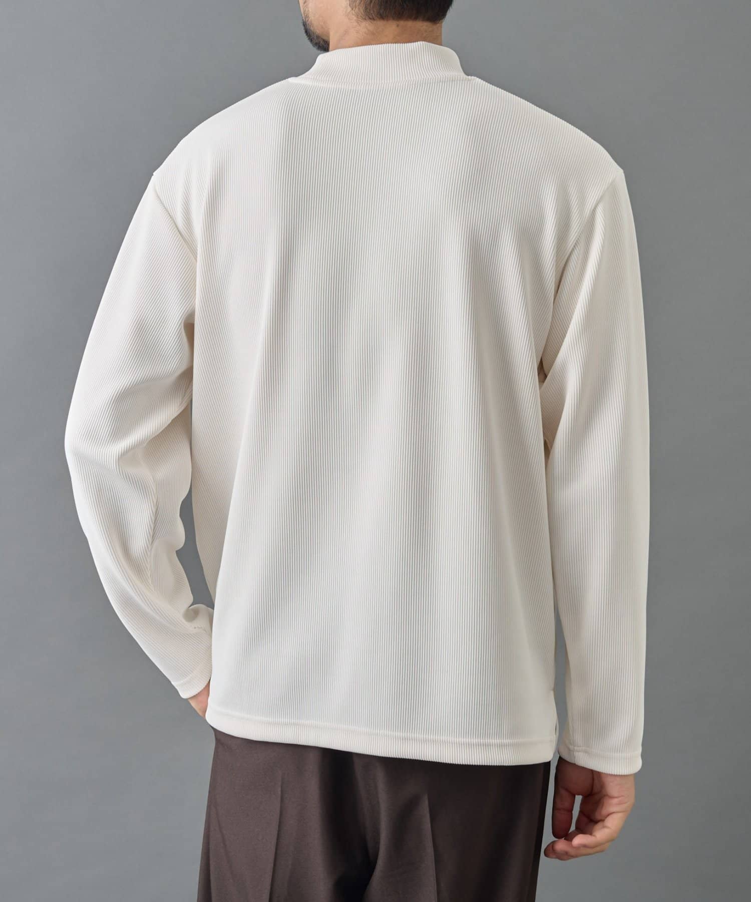 首元はやや高さを持たせたハイネック仕様になっているため、重ね着した際のレイヤードが美しく決まり、ジャケットやコートの中に着てもしっかりと存在感を発揮します。