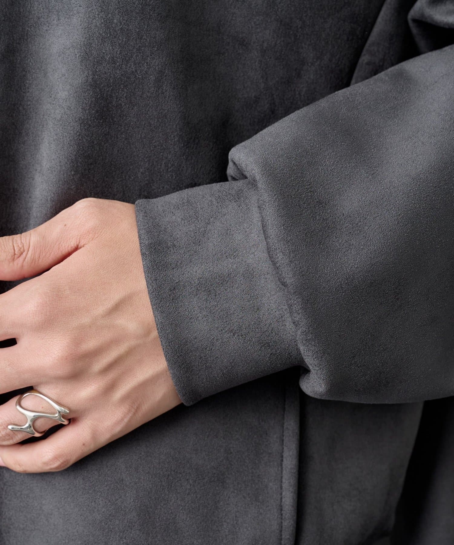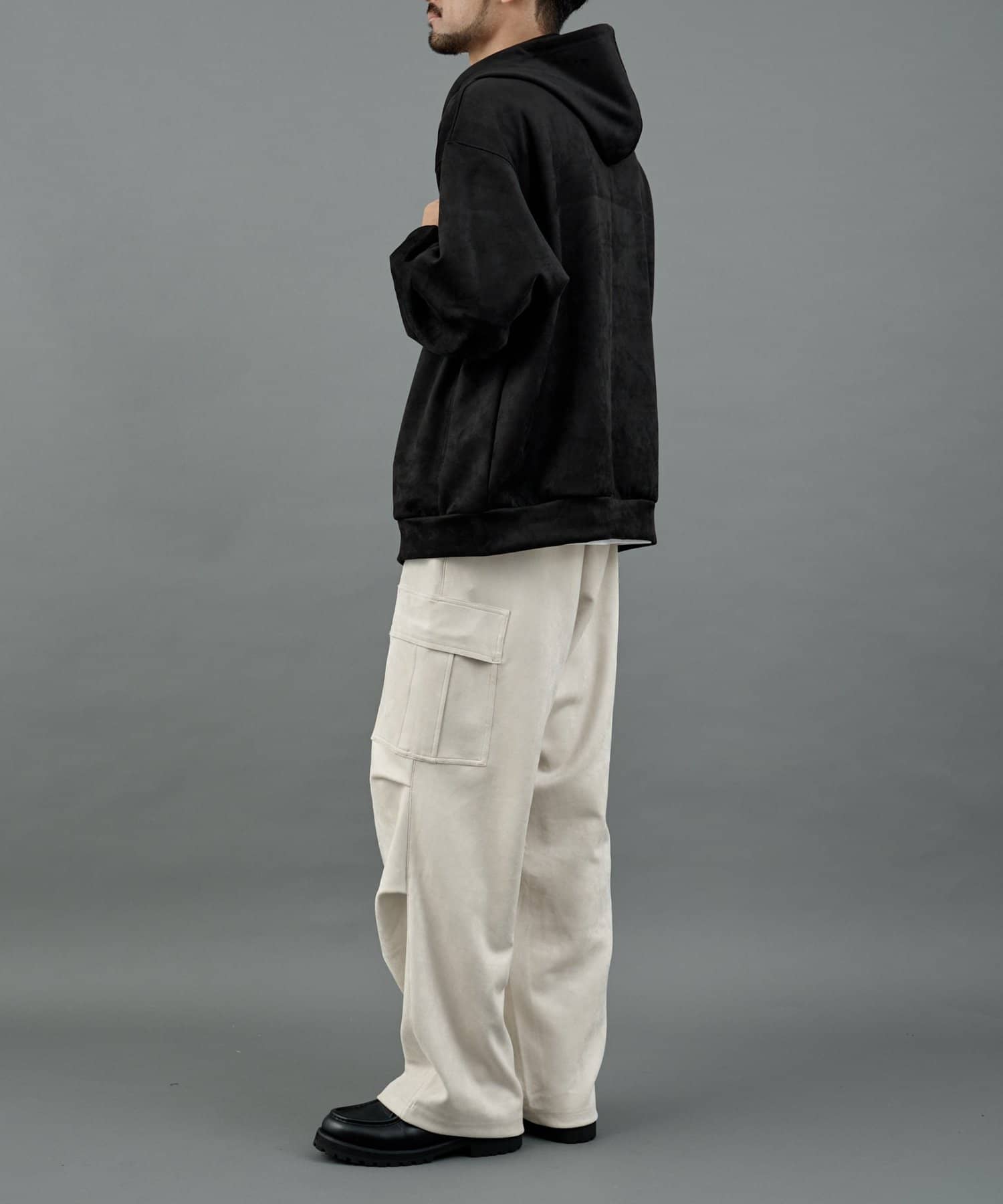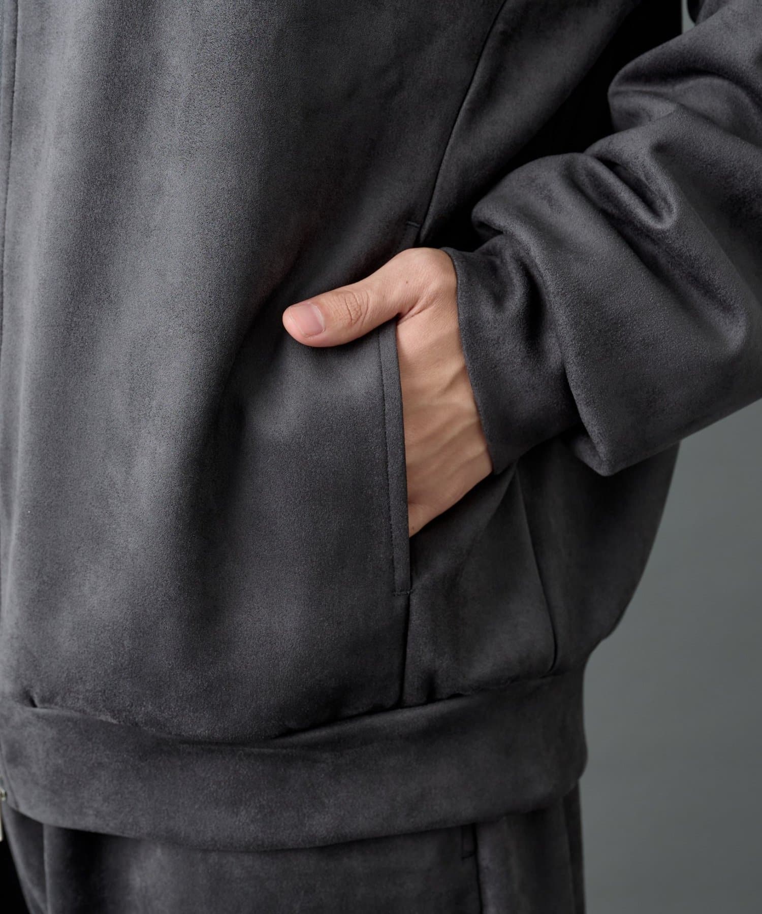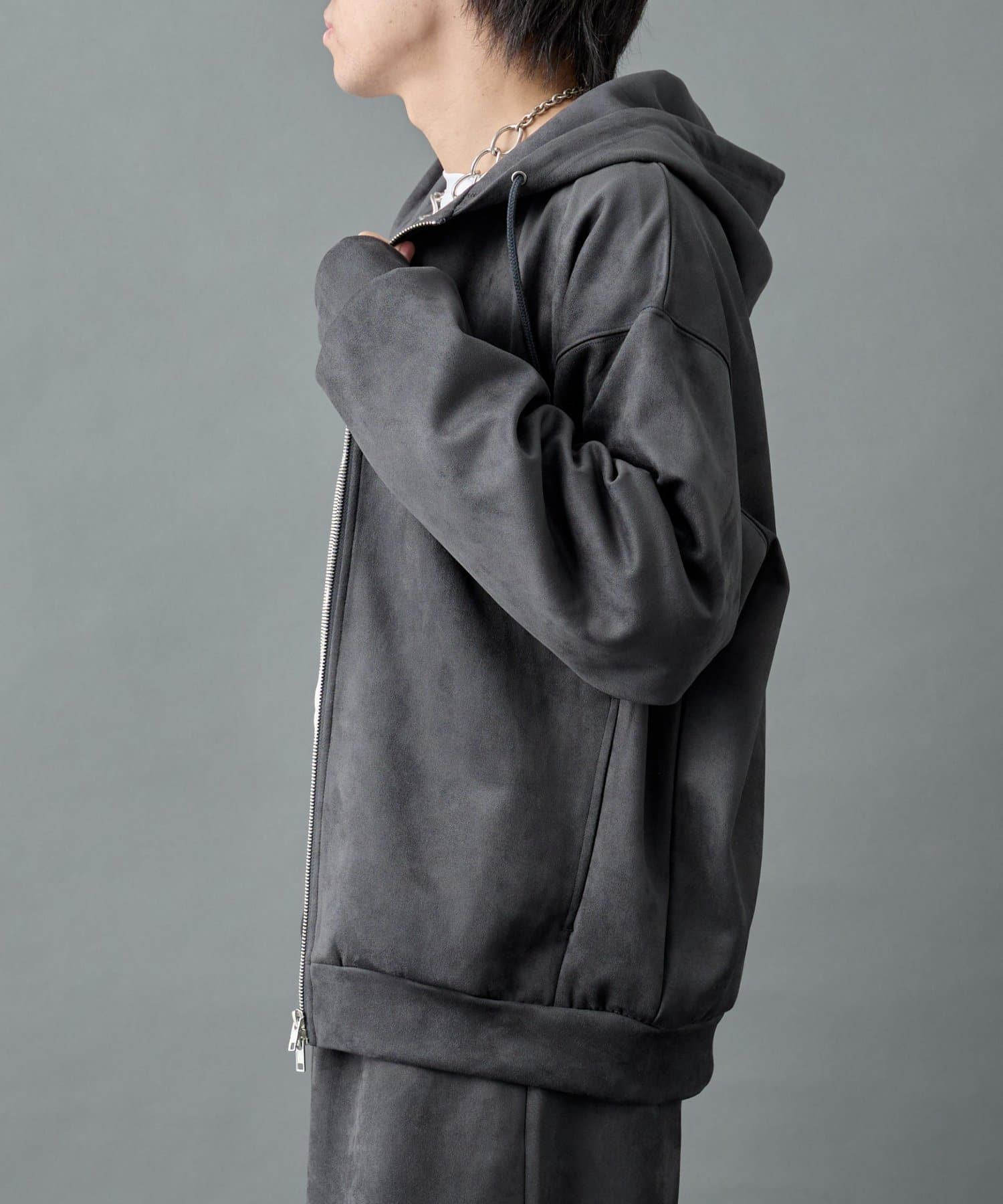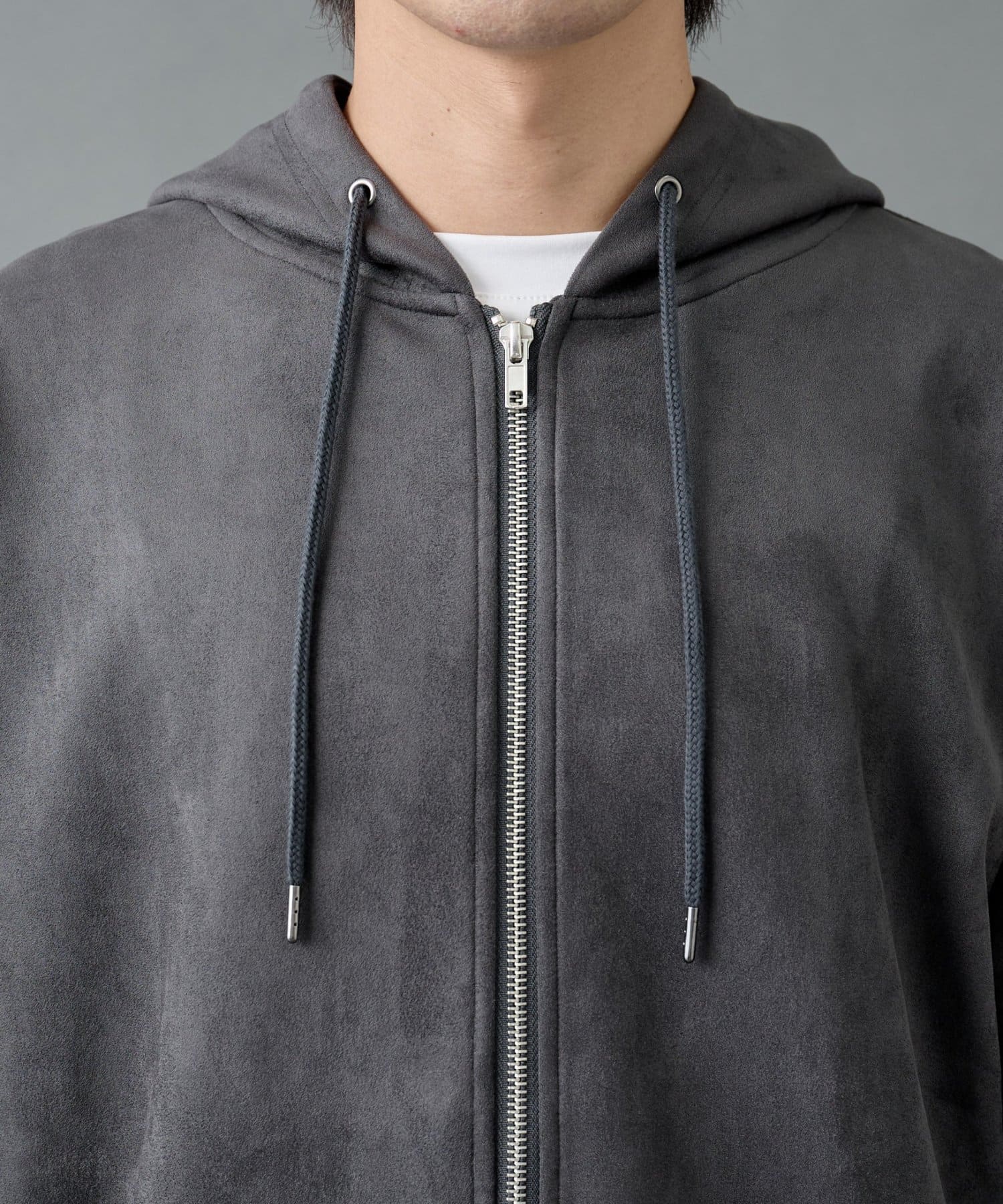 柔らかく上品な合成スエード(フェイクスエード)素材を使用した、ダブルジップ仕様のパーカーです。