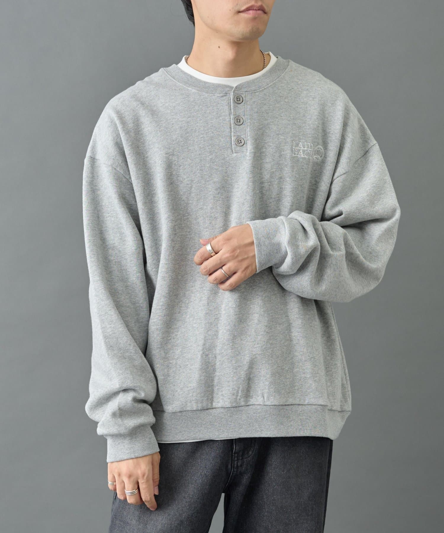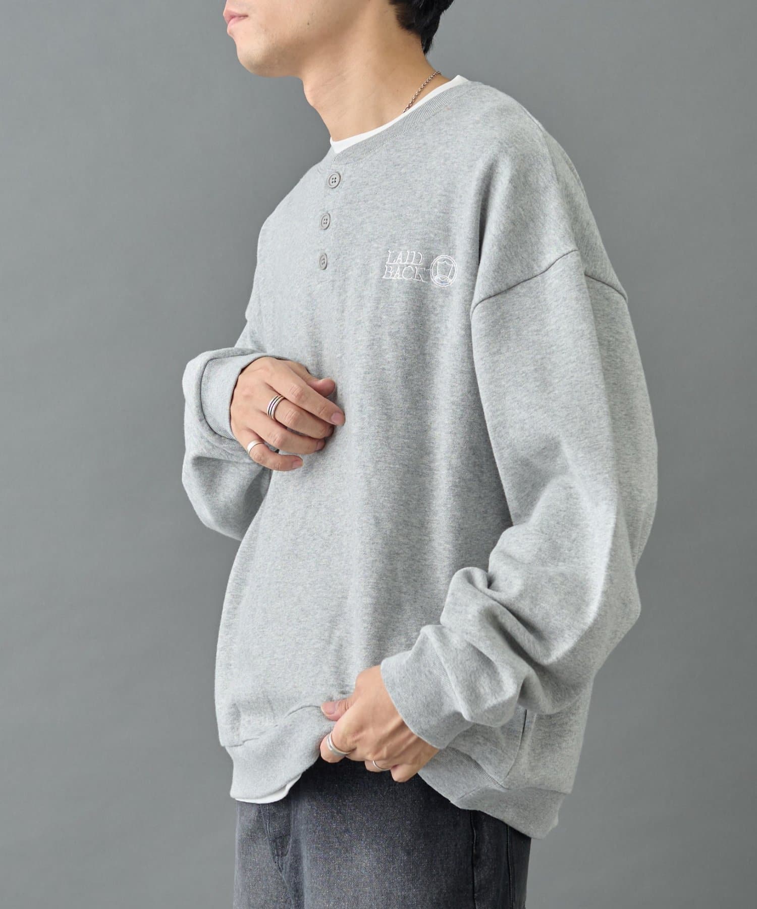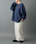 胸元の刺繍がワンポイントになっているヘンリーネックスウェットです。