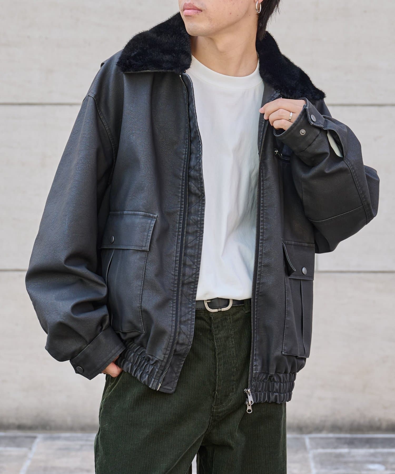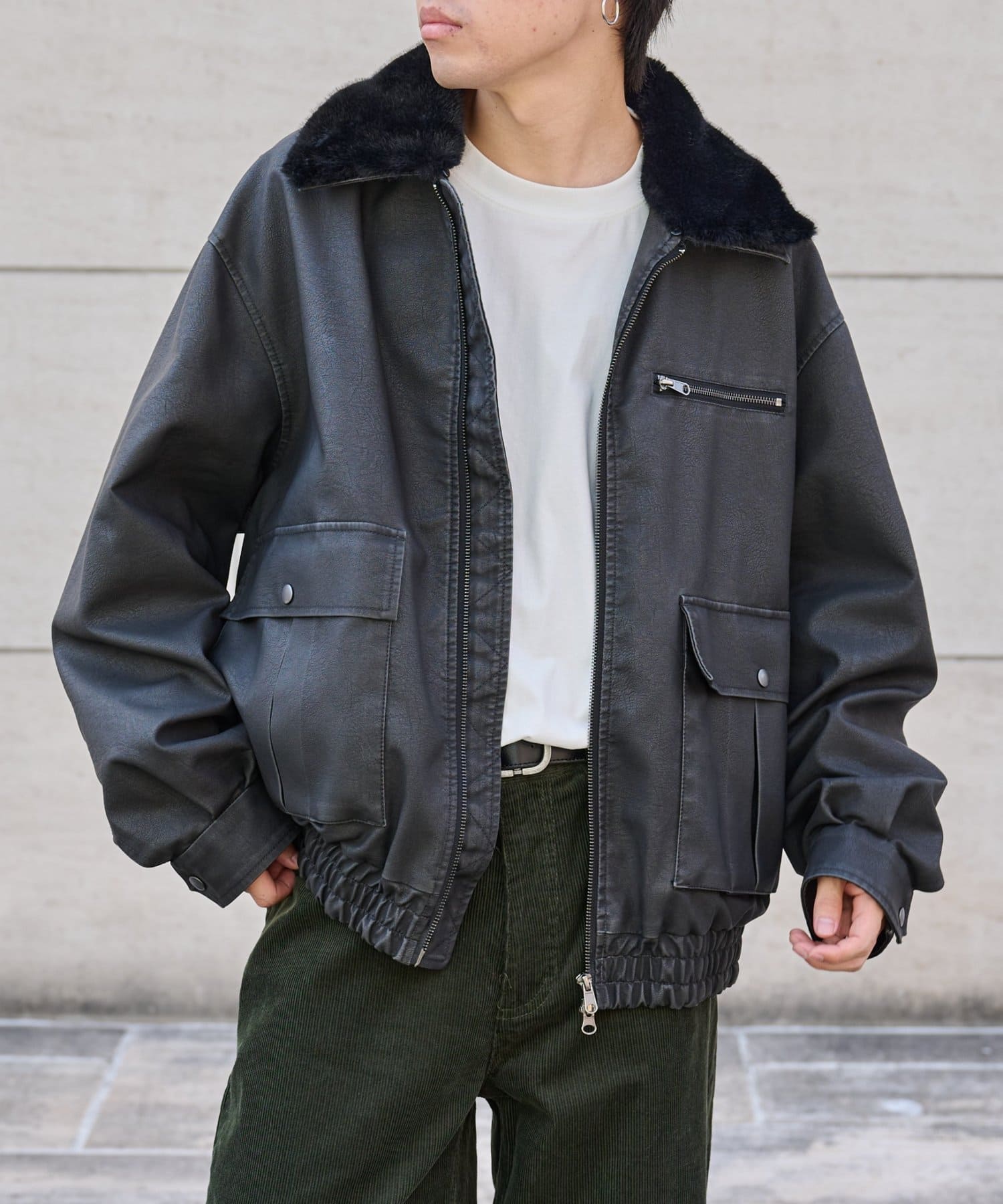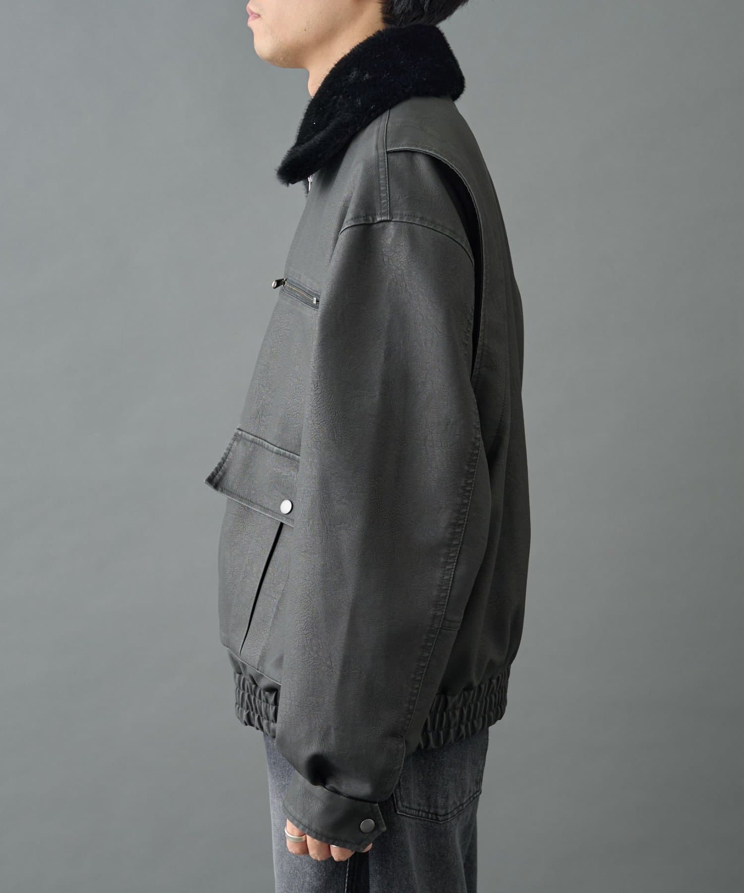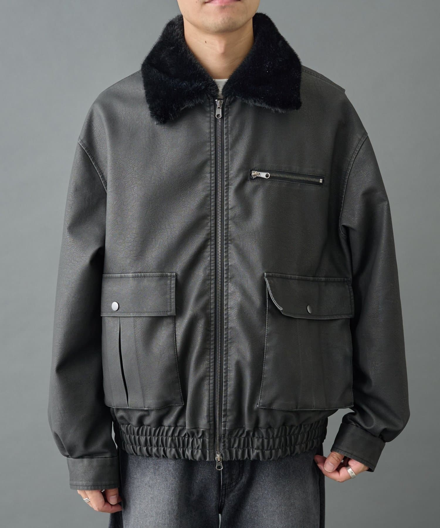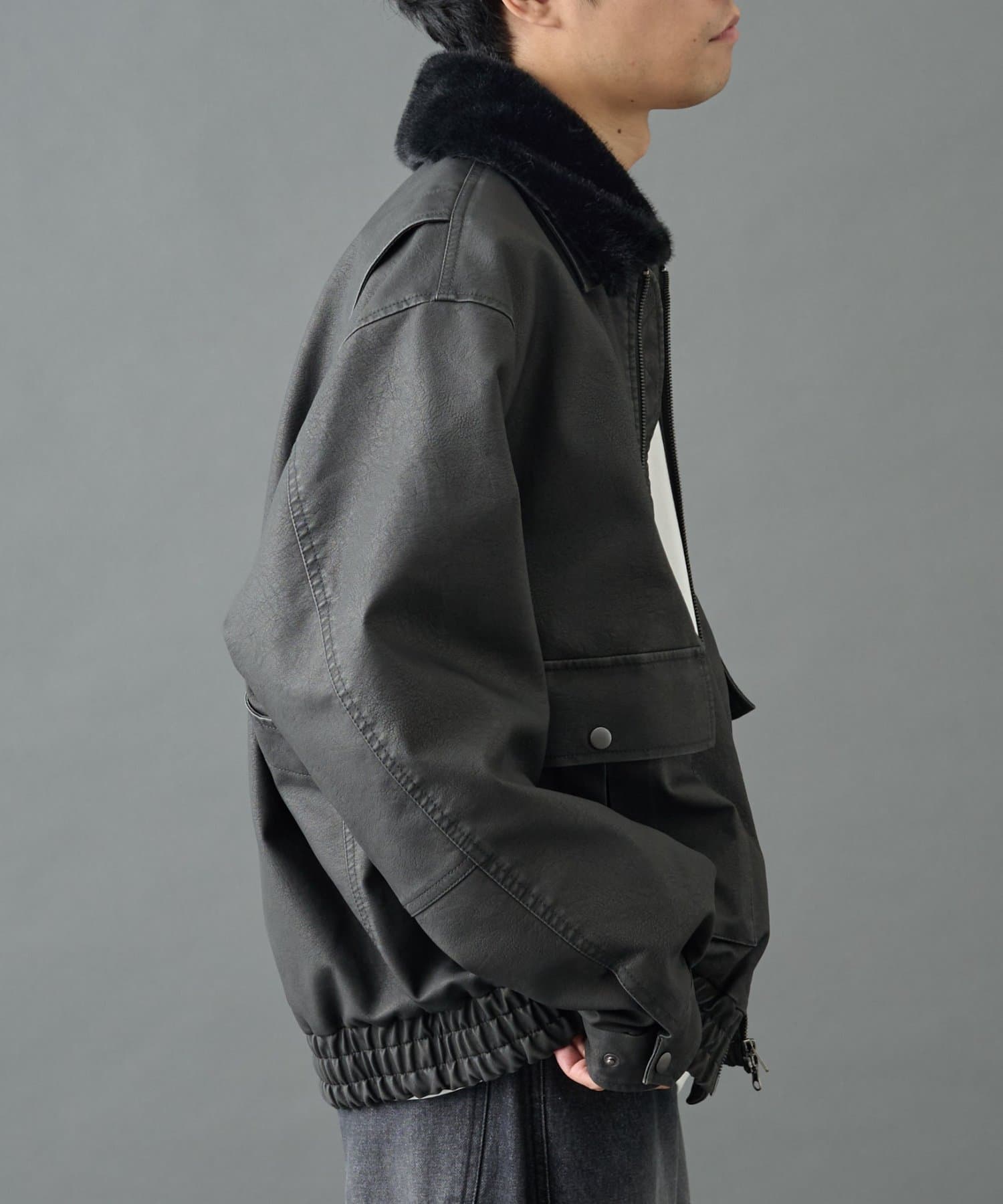 【レザーのような艶と、使い込んだようなフェード感が特徴。フェイクレザーG-1ジャケット】