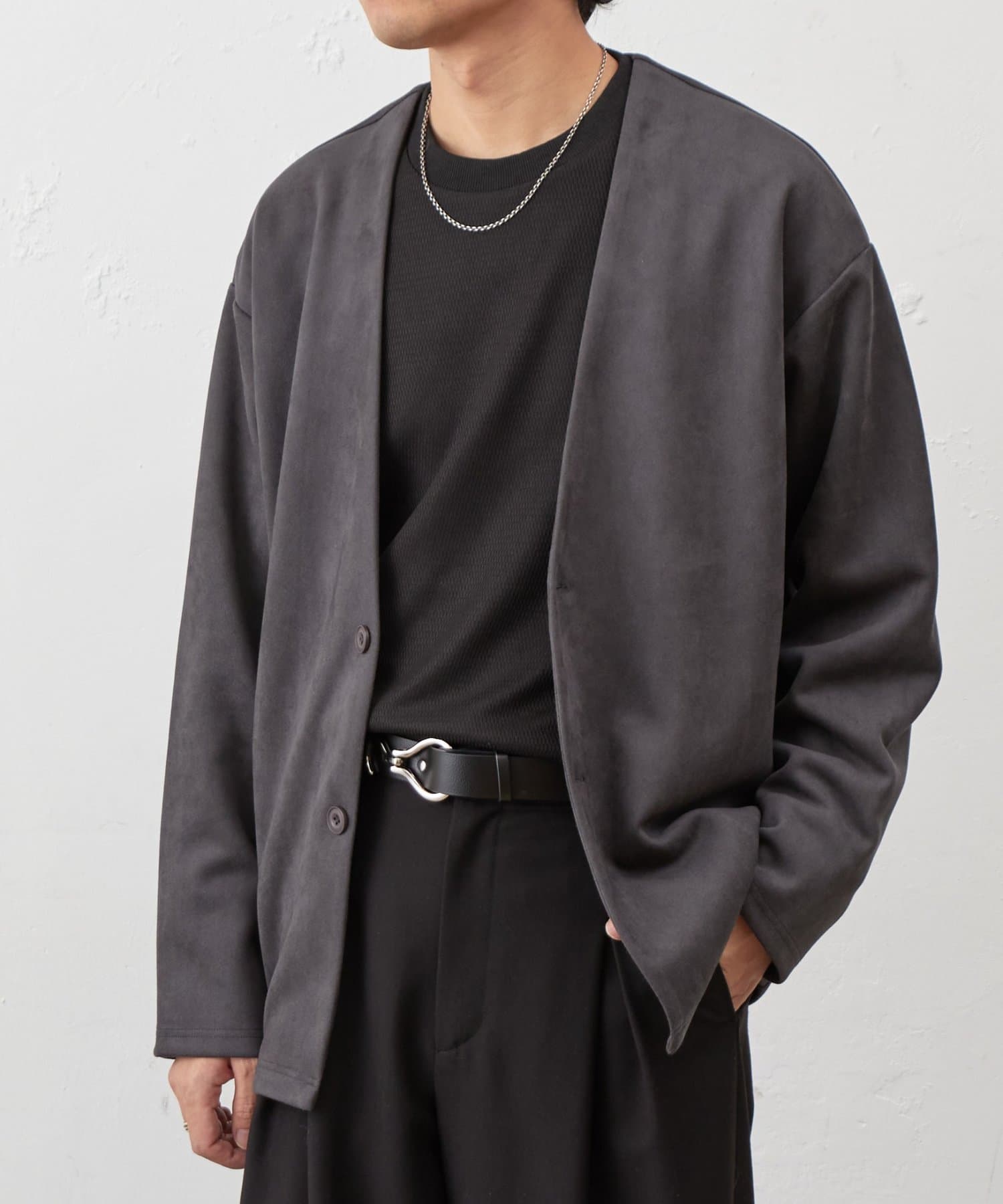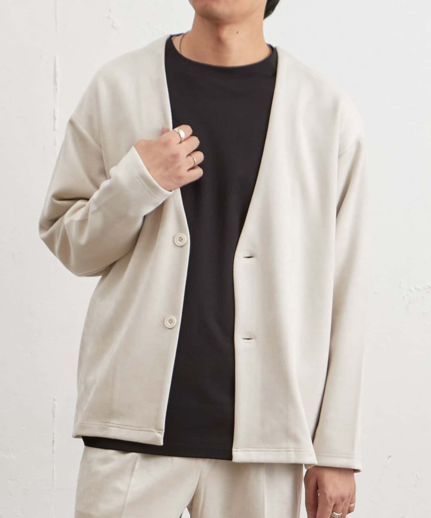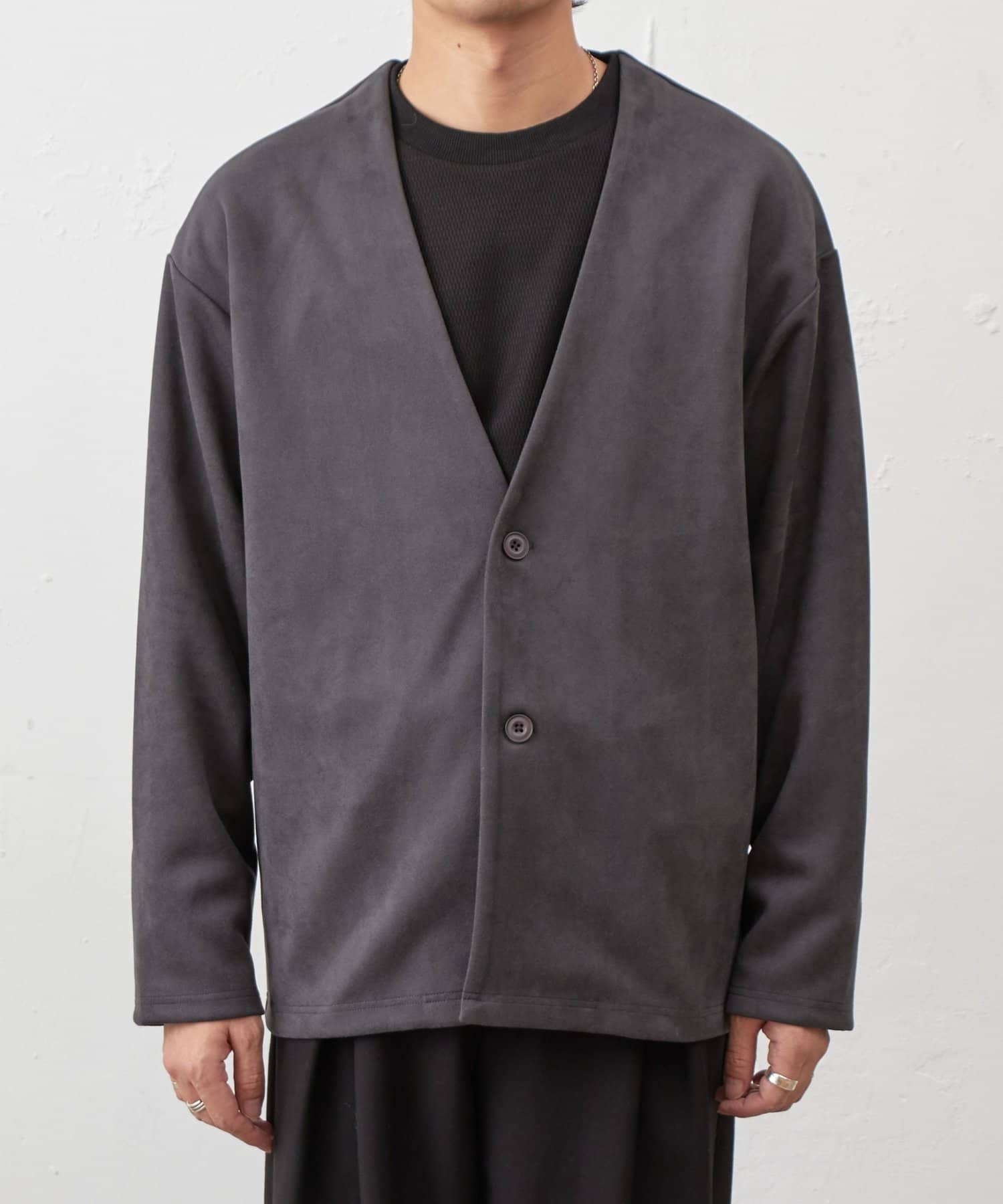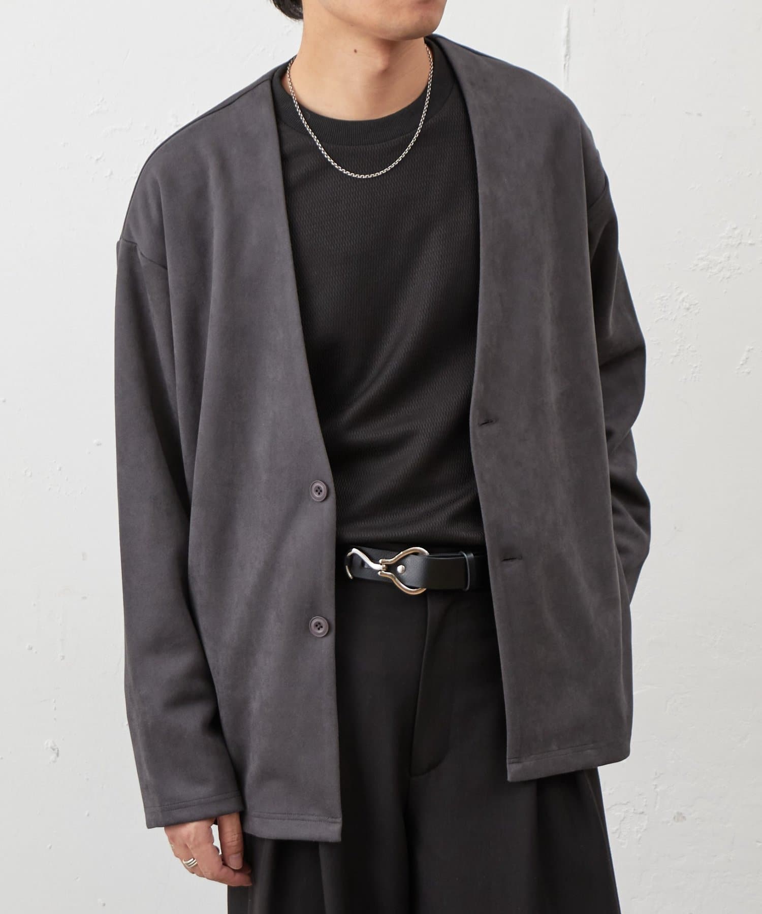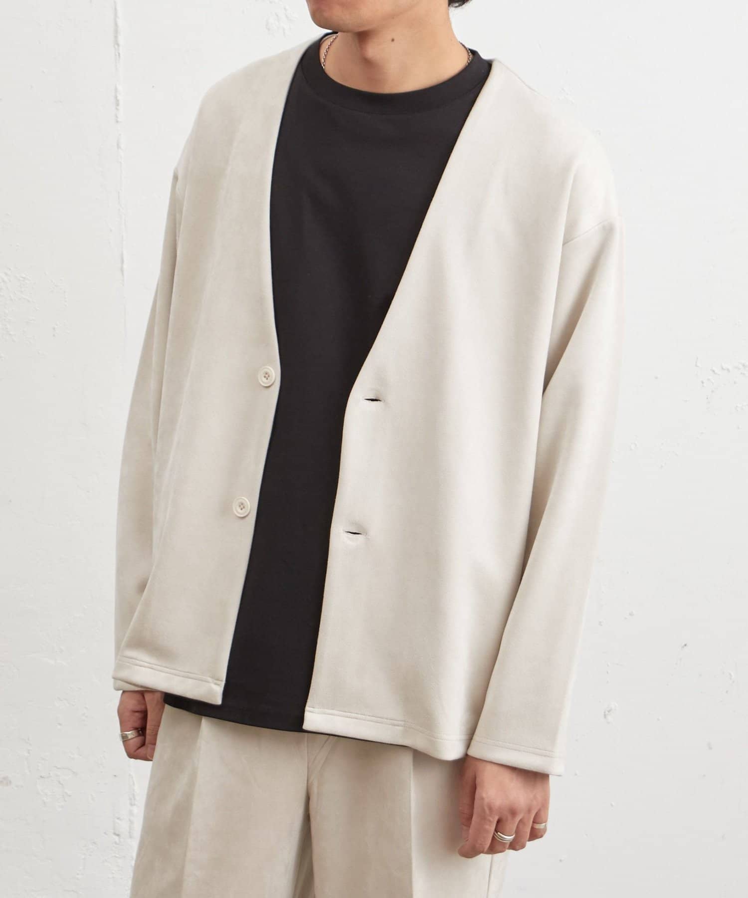 なめらかな起毛感が特徴のシンセティックスエード素材を使用した大人のための上品なカーディガンです。