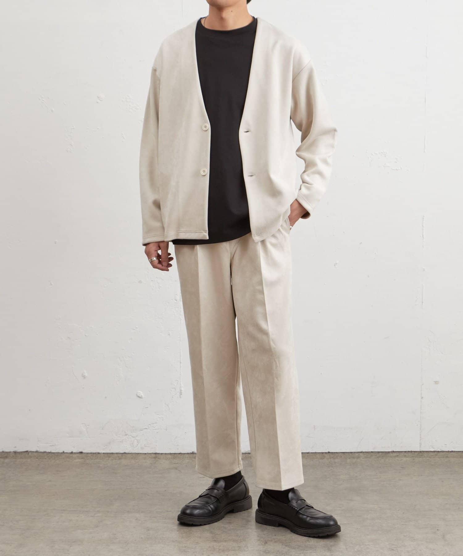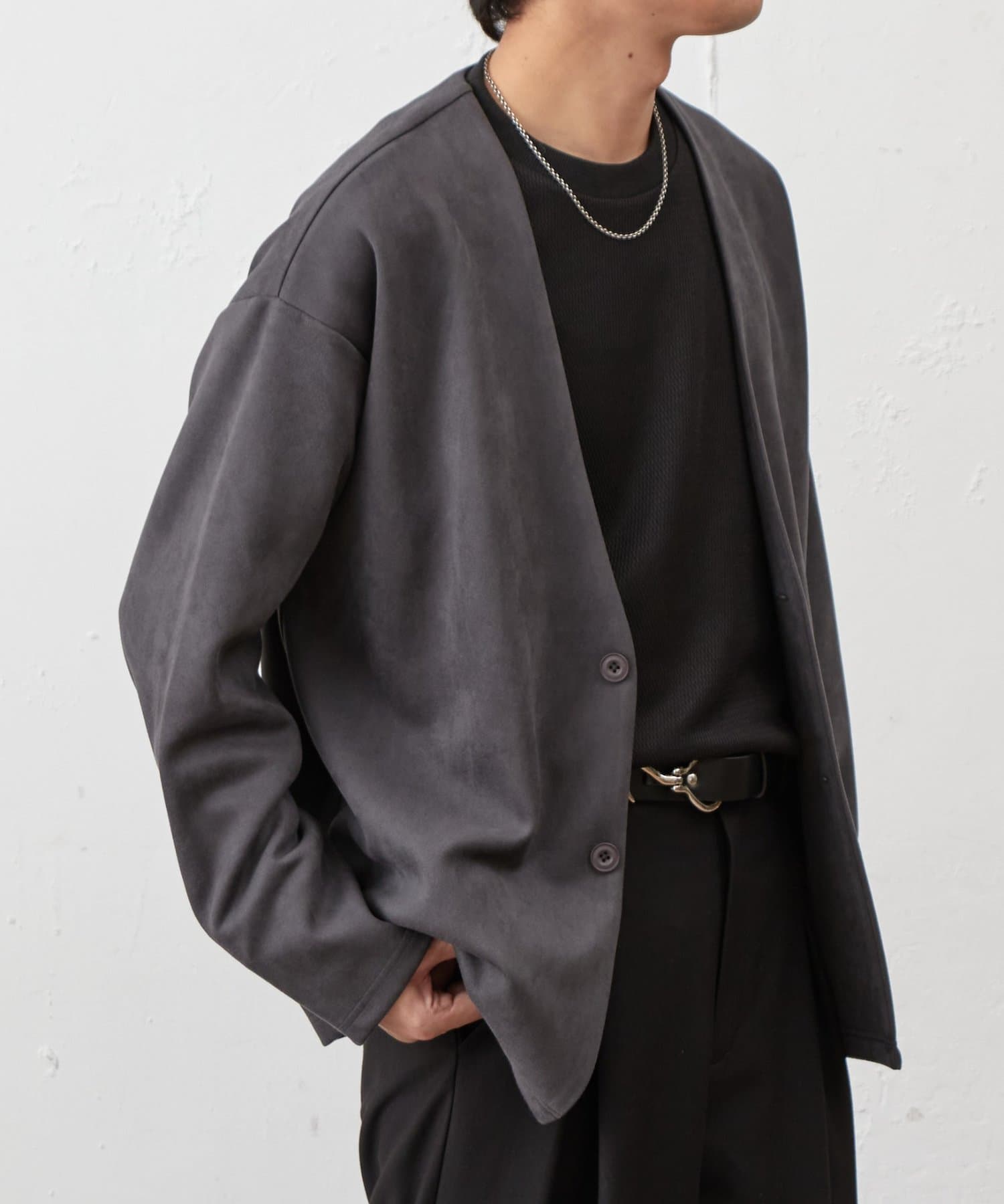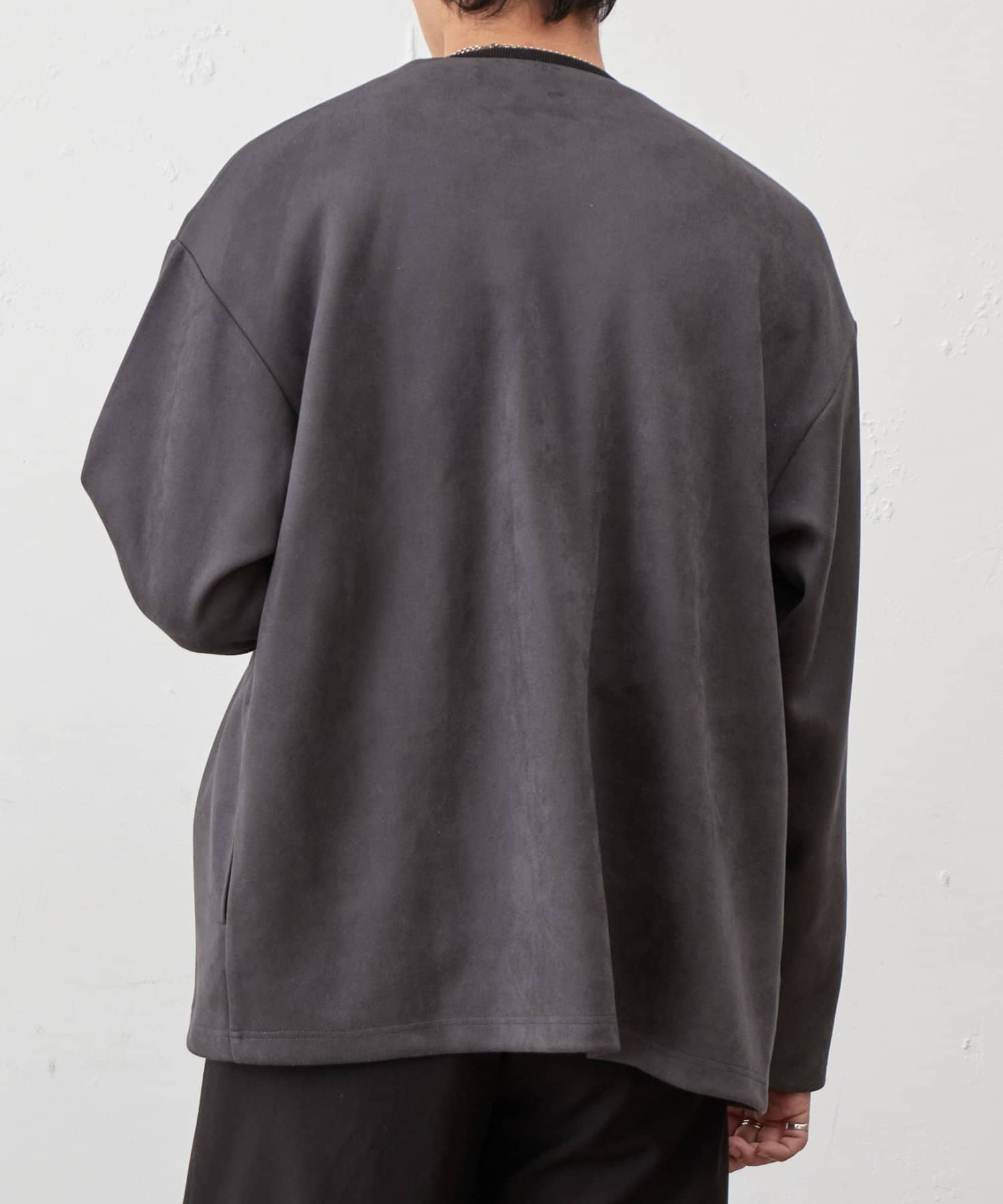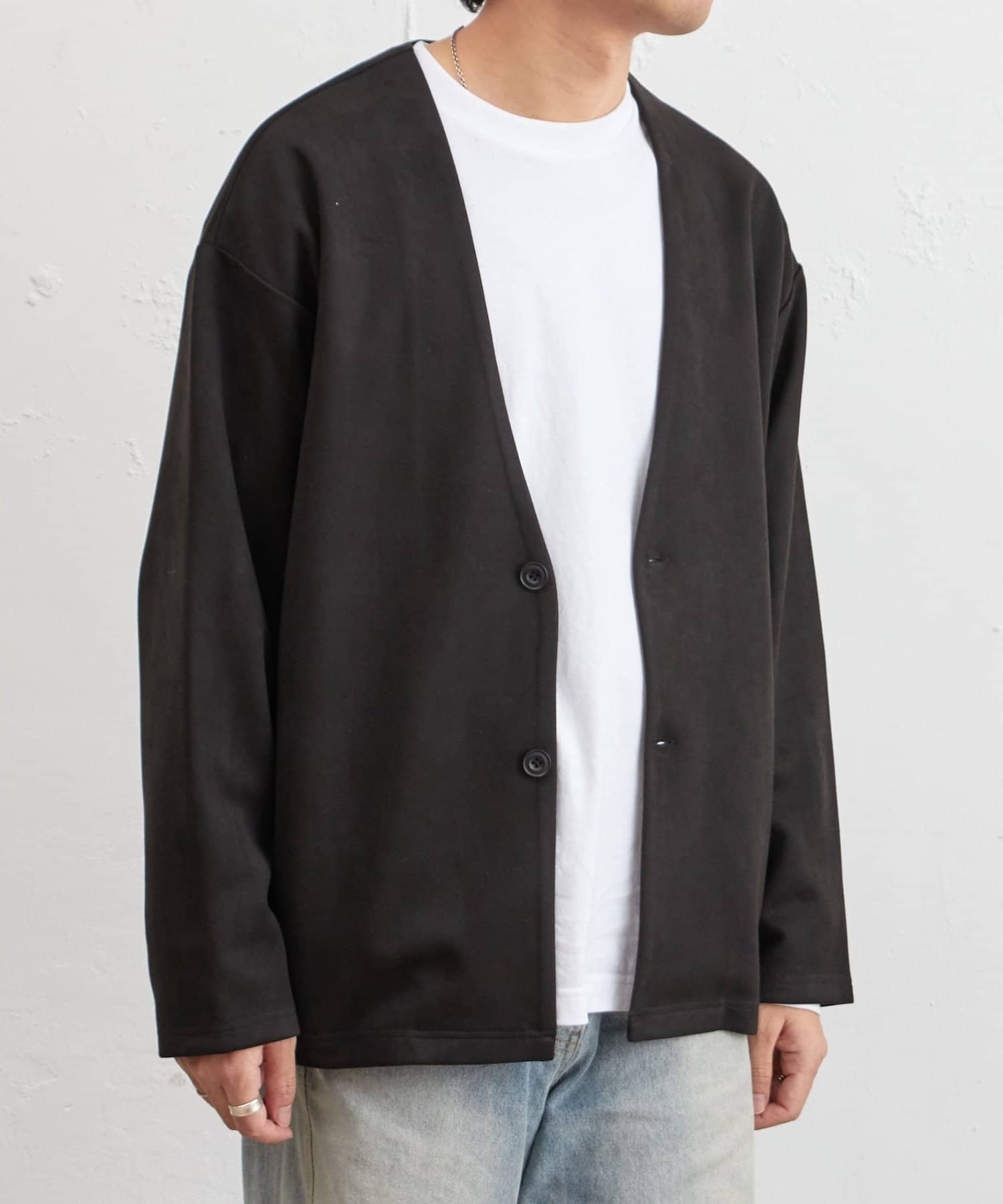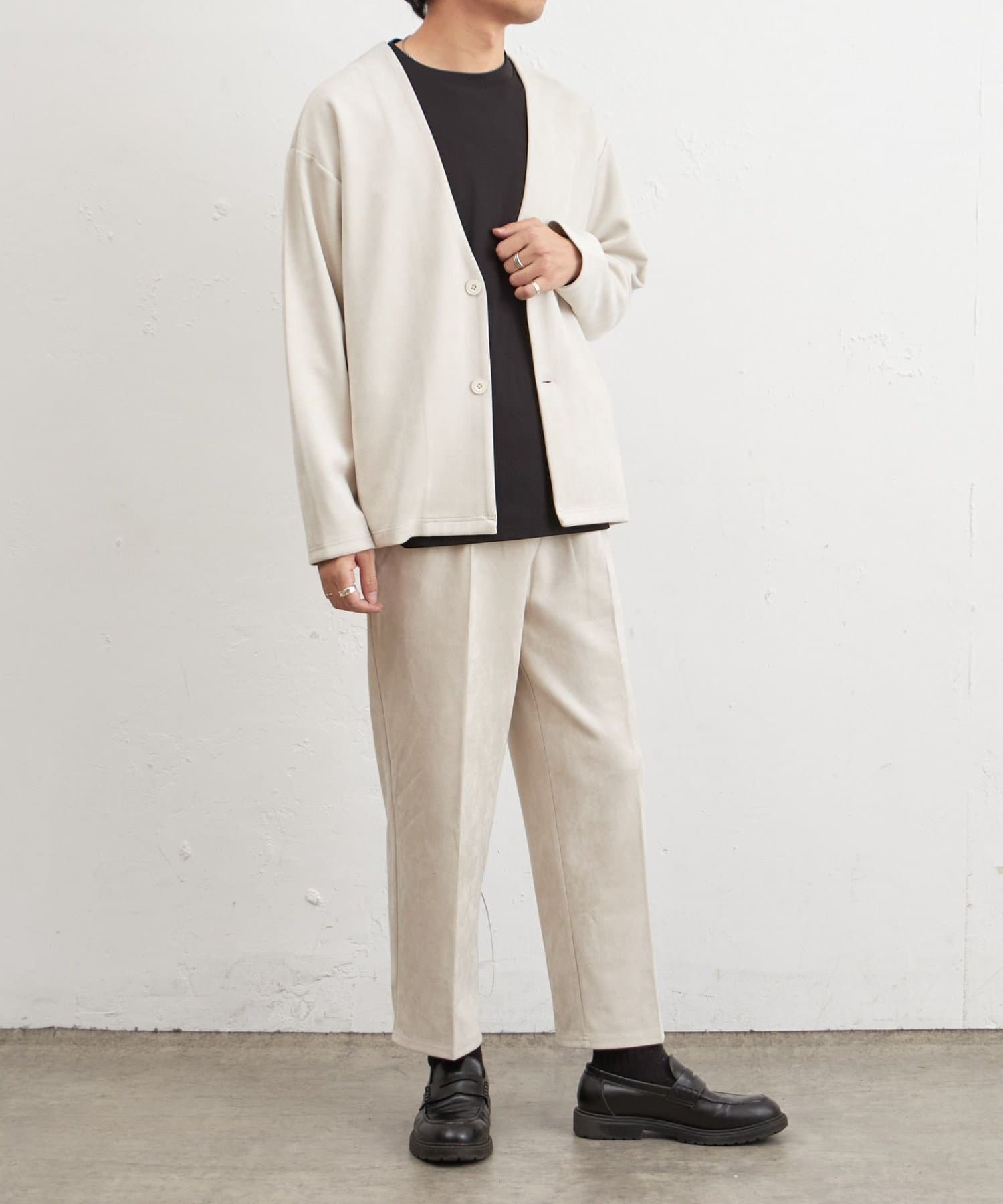 なめらかな起毛感が特徴のシンセティックスエード素材を使用した大人のための上品なカーディガンです。