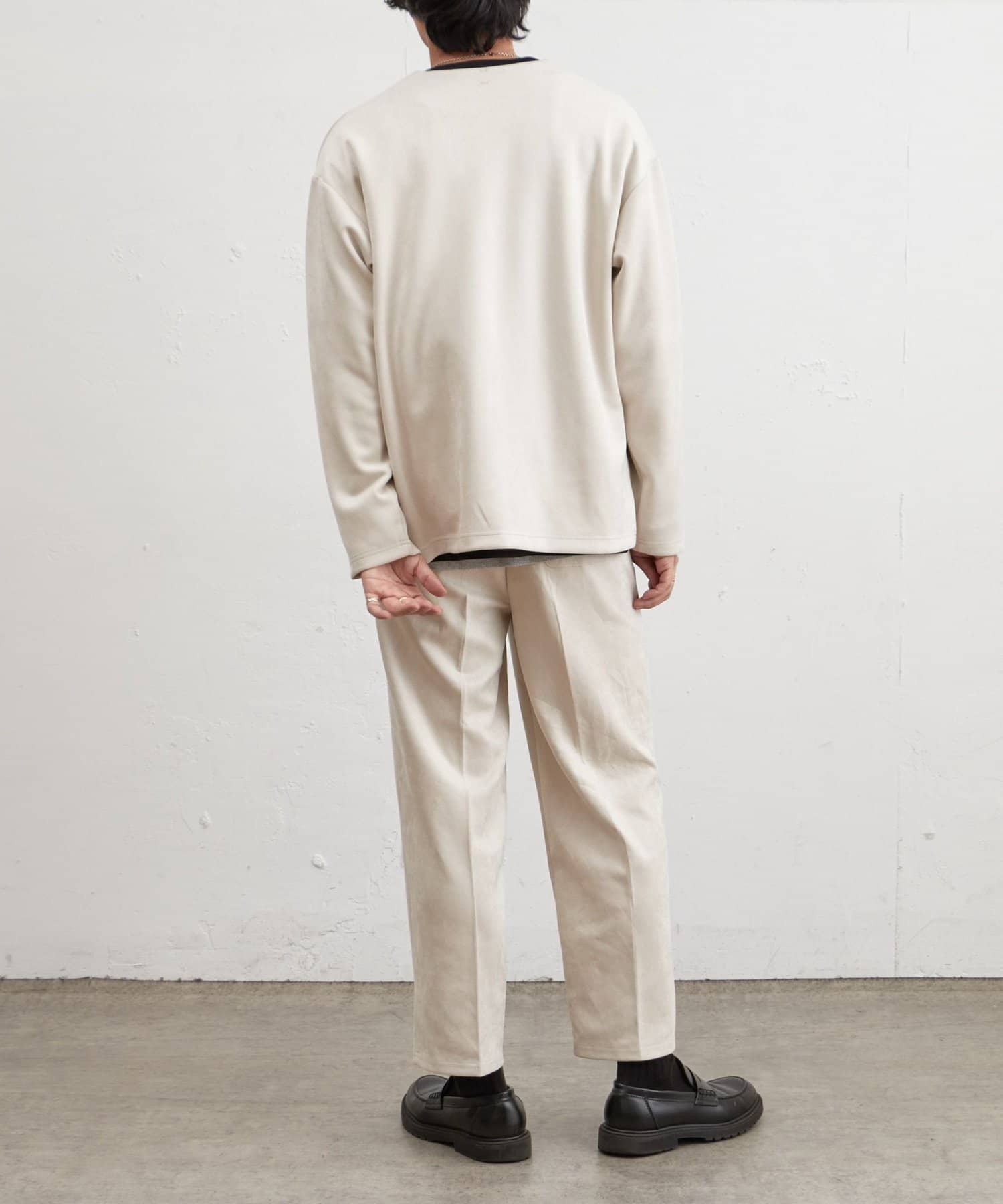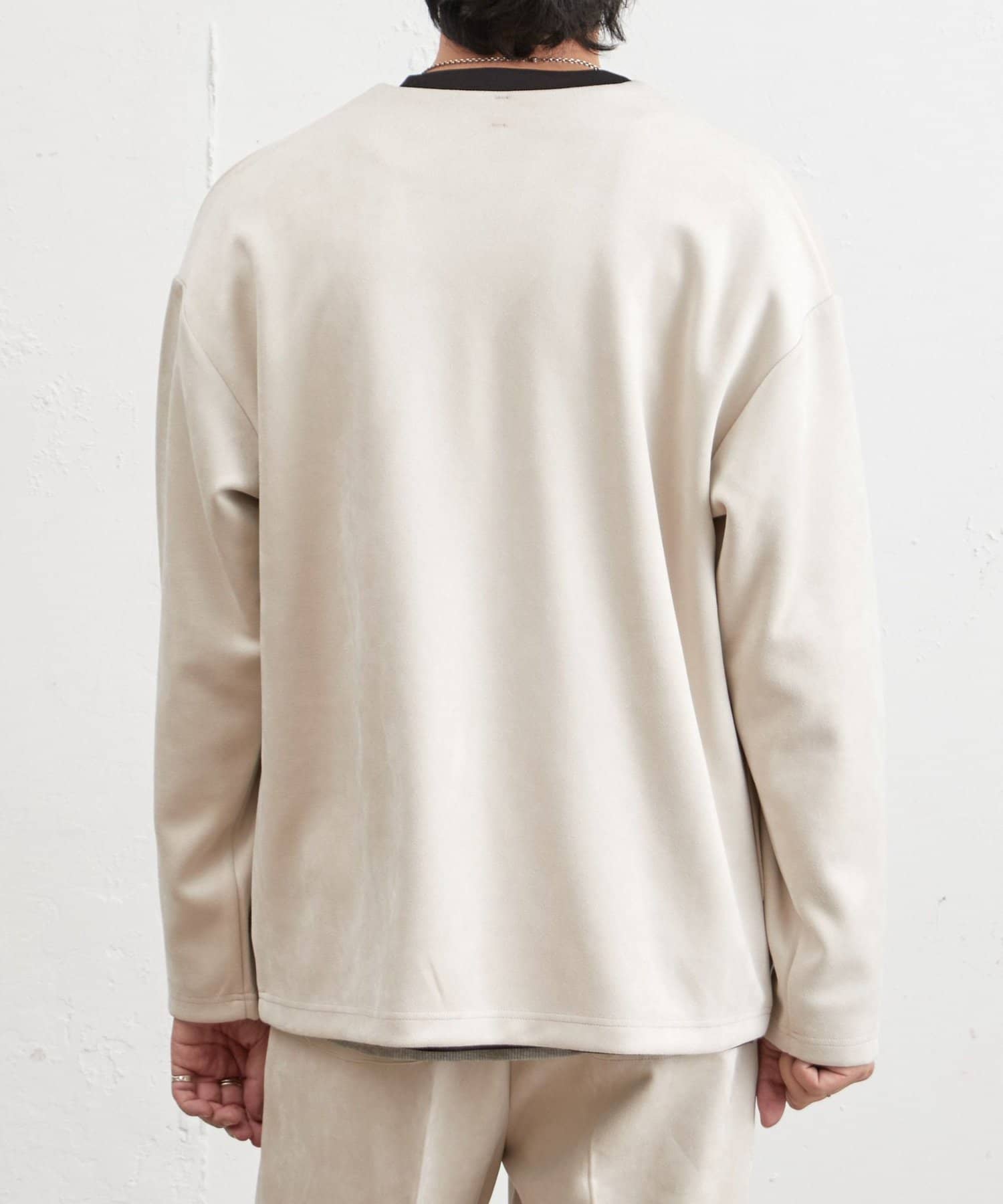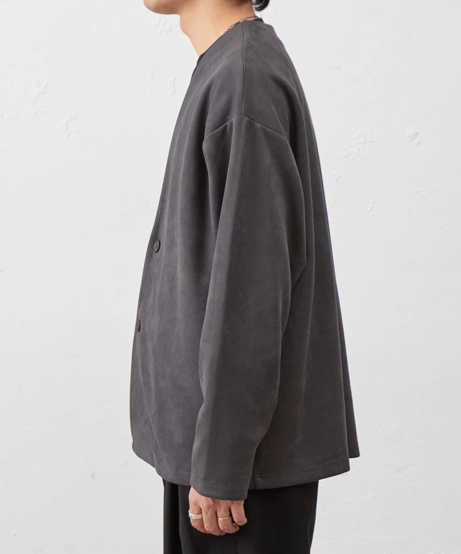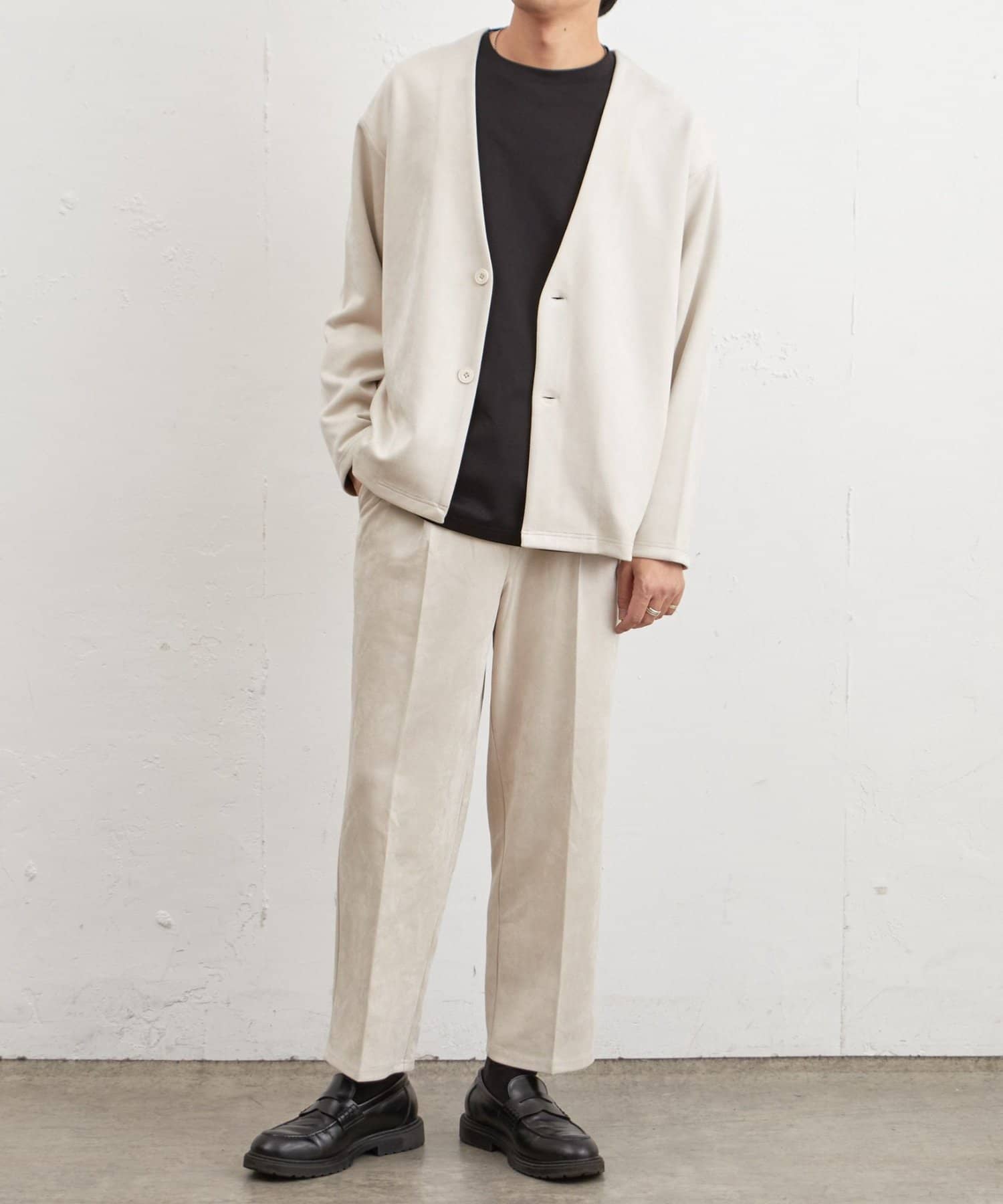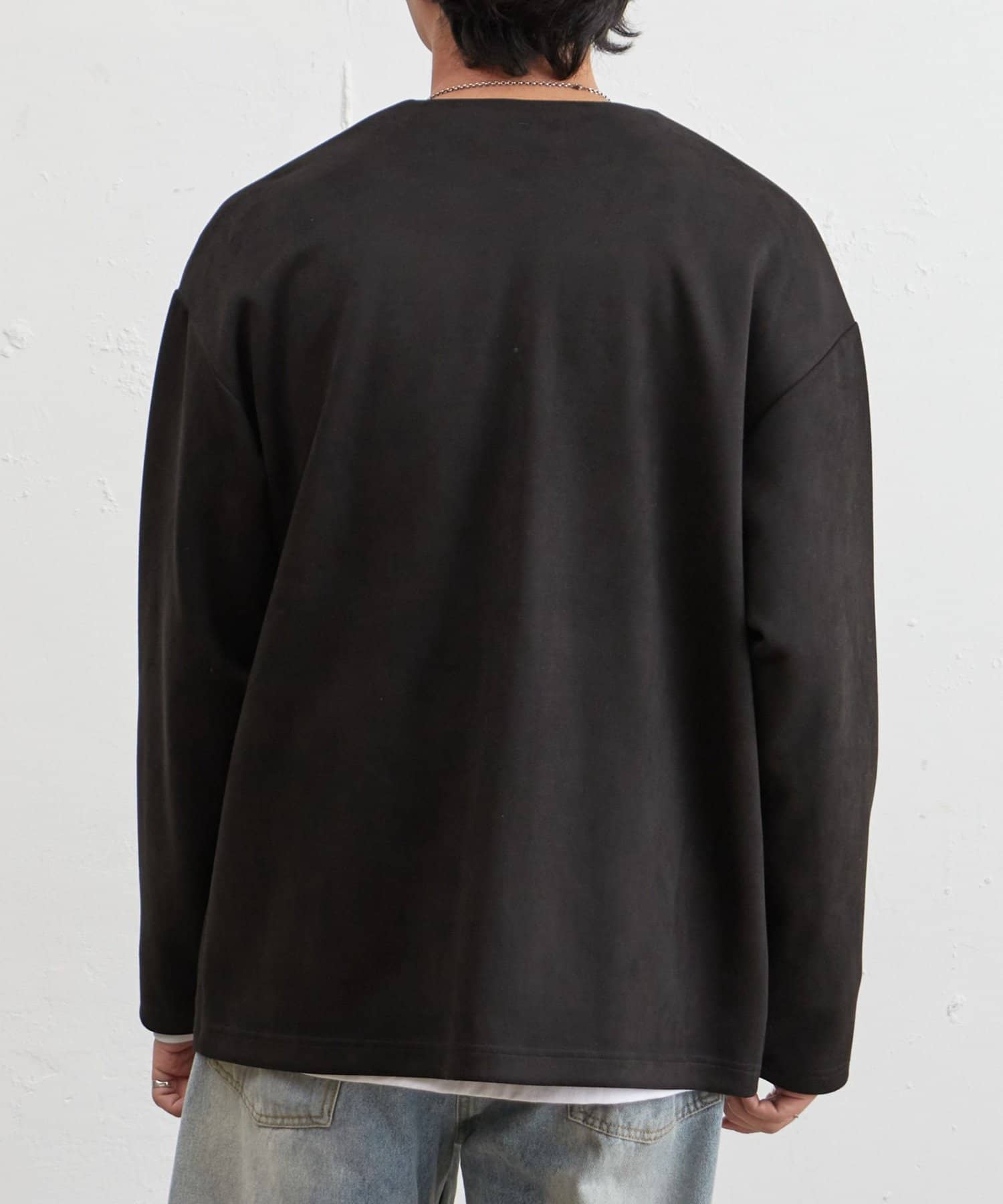 なめらかな起毛感が特徴のシンセティックスエード素材を使用した大人のための上品なカーディガンです。