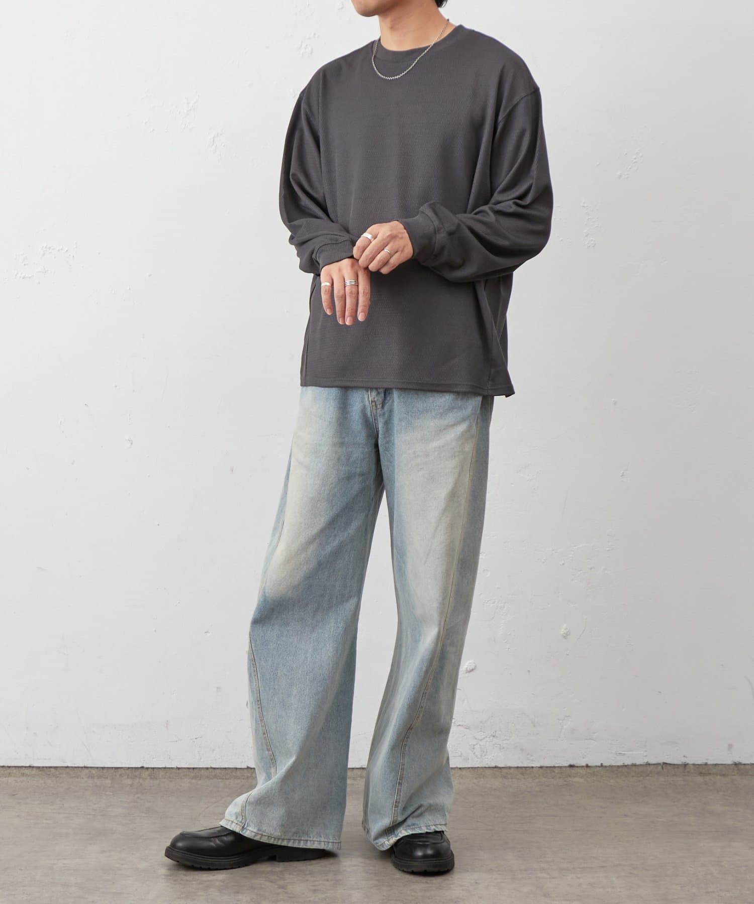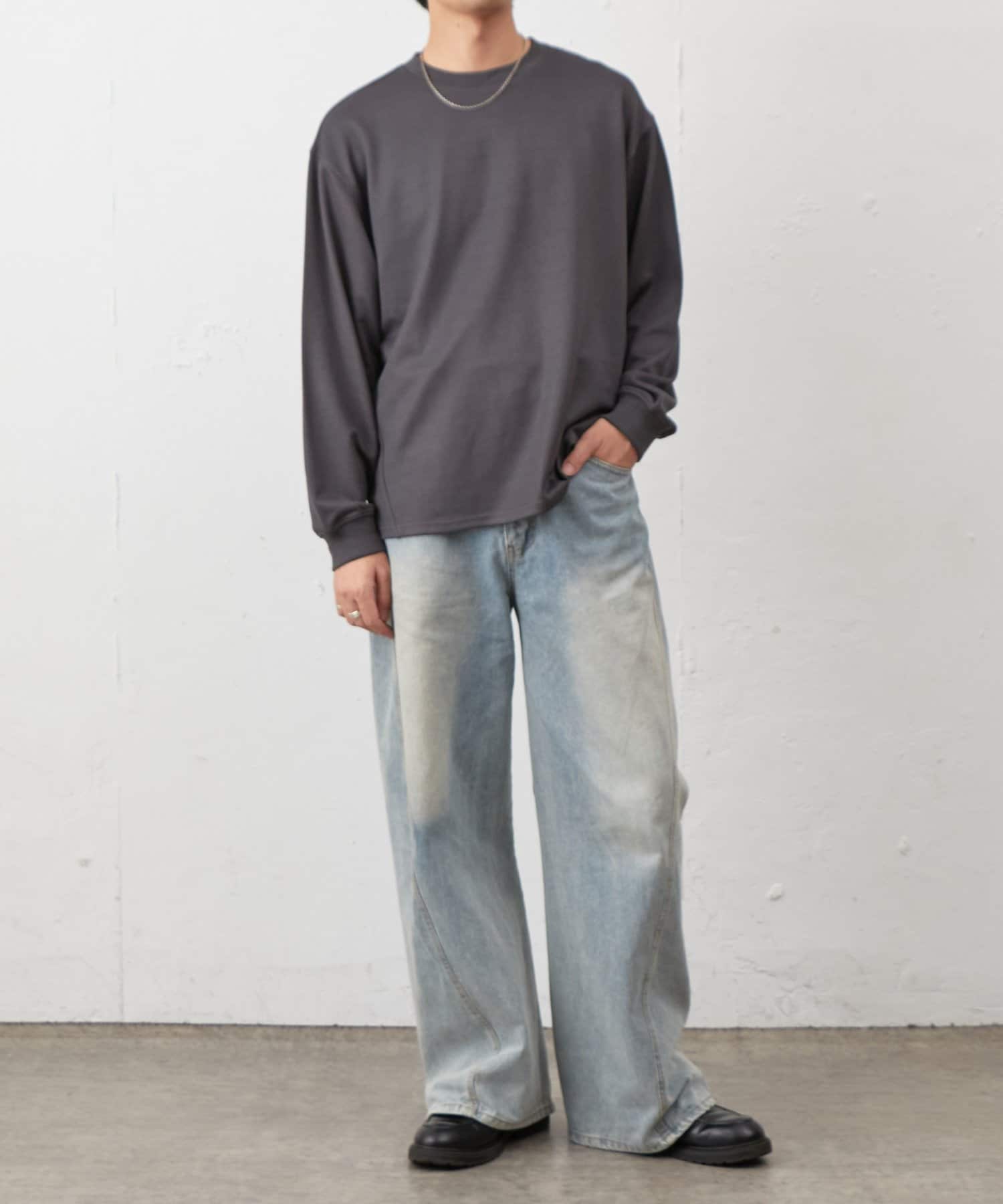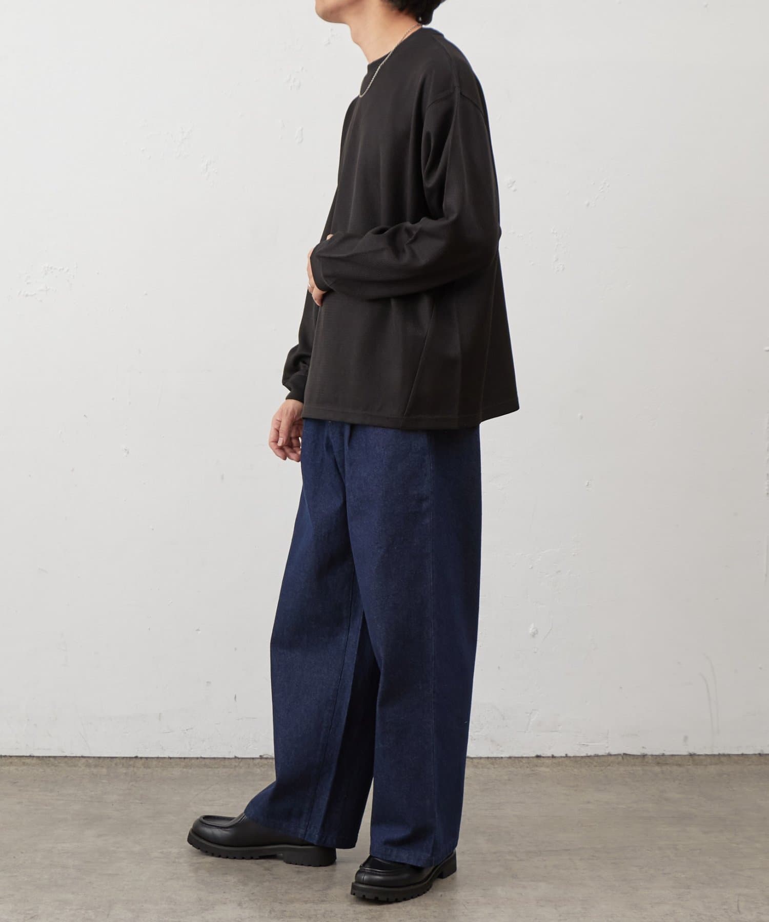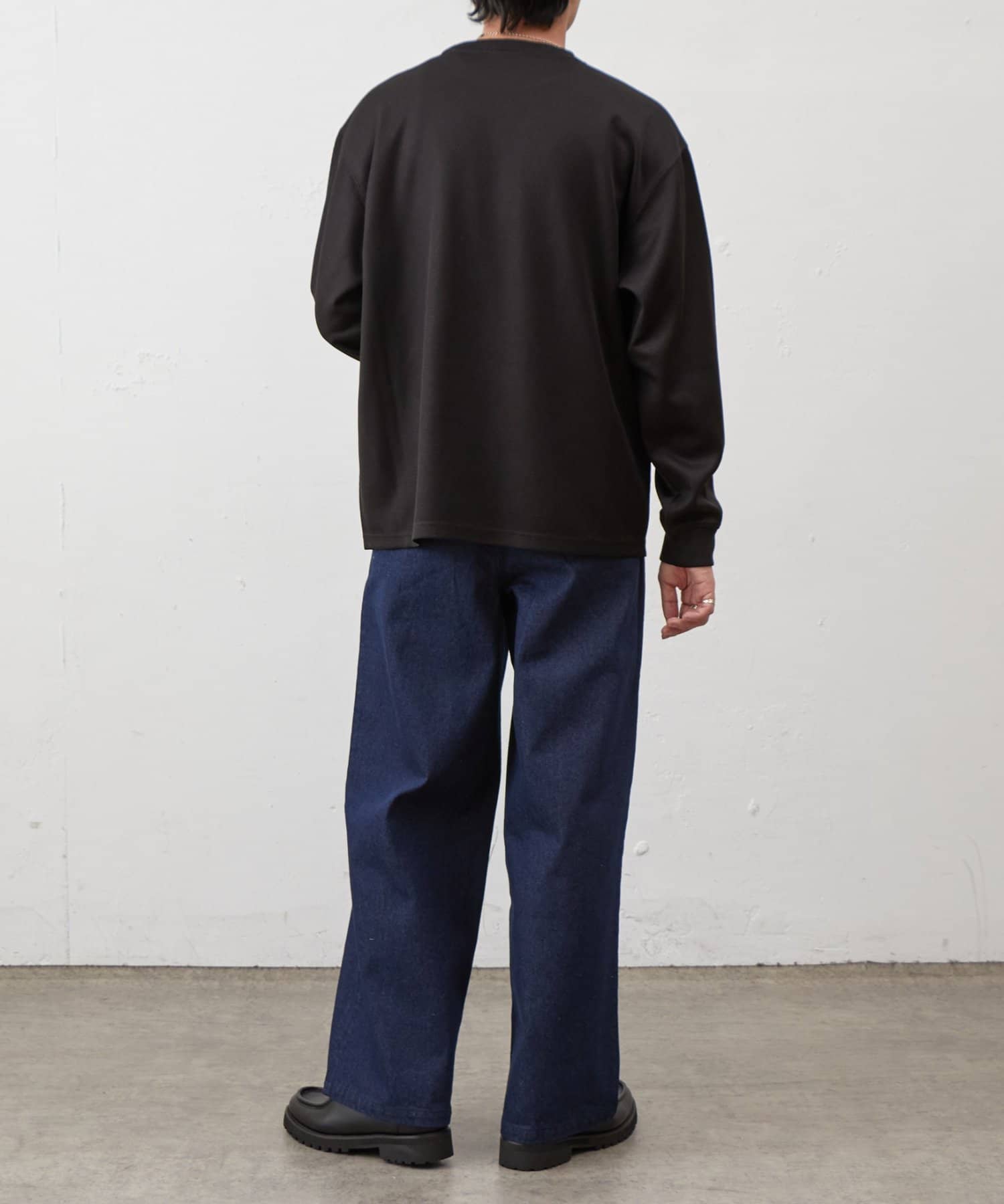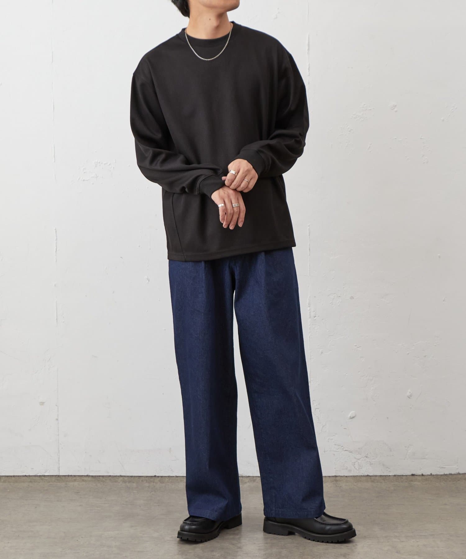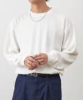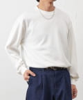 すっきりとしたクルーネックが大人らしい印象を与えカジュアルになりすぎず、きれいめスタイルにも自然に馴染みます。
