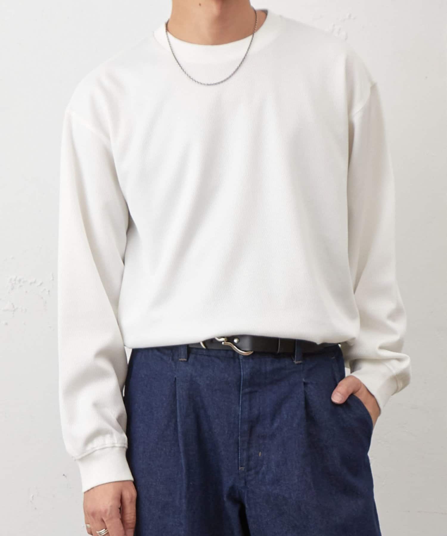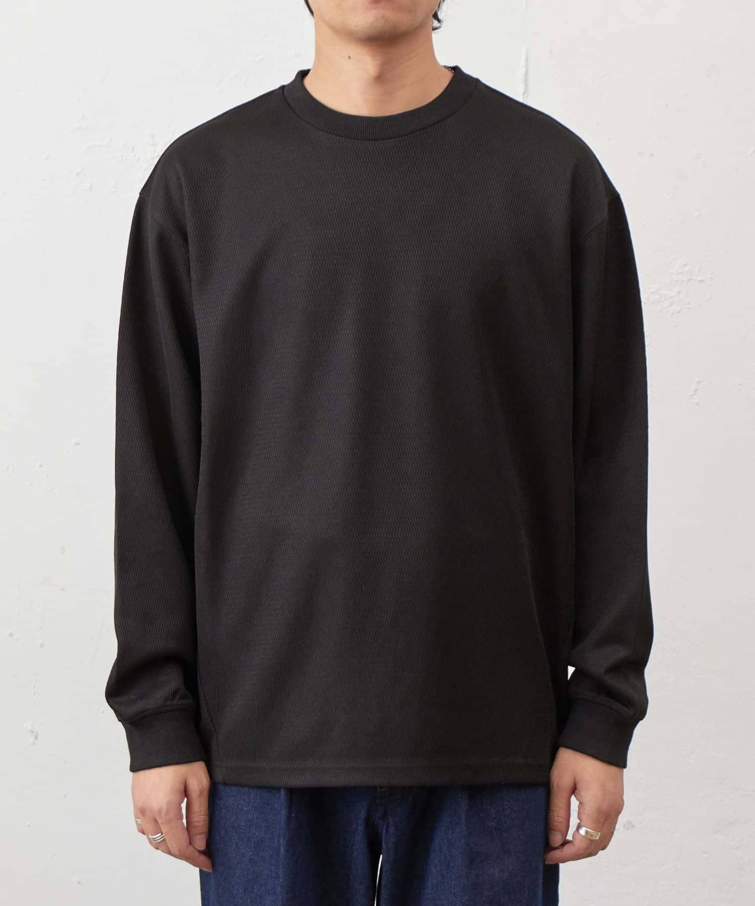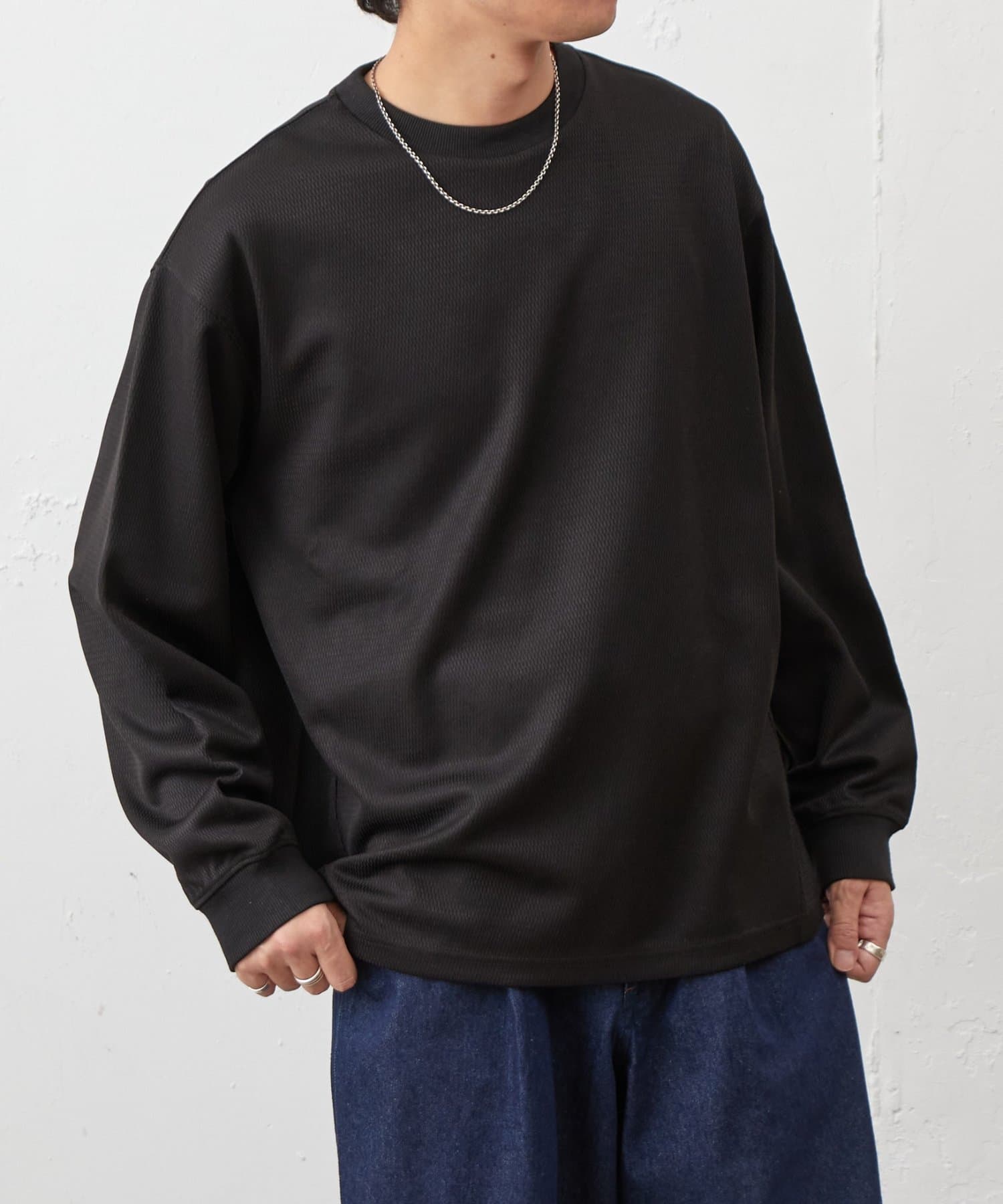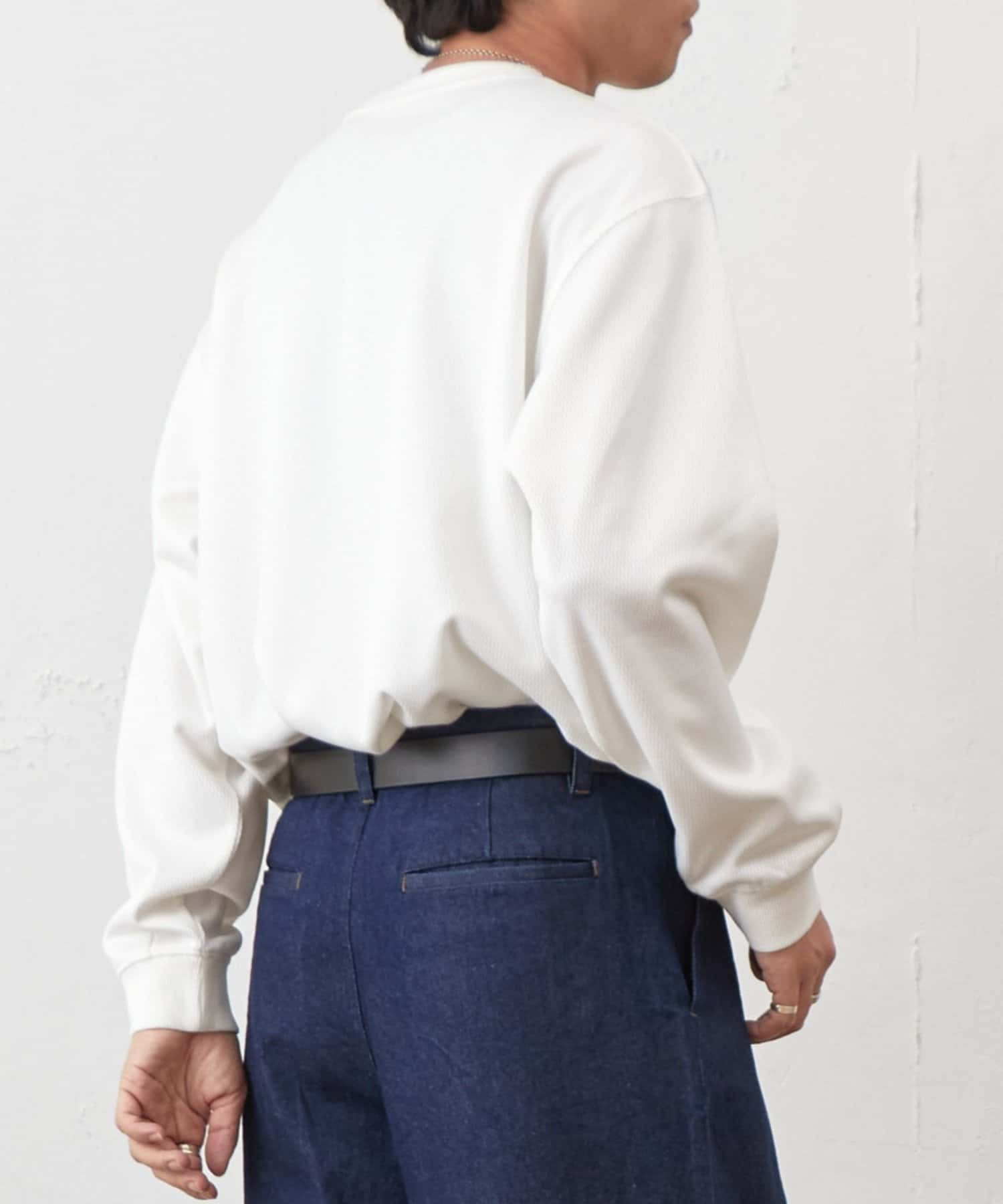 凹凸感のあるハニカム編みがシンプルながらも表情のある着こなしを叶えるクルーネックプルオーバー。