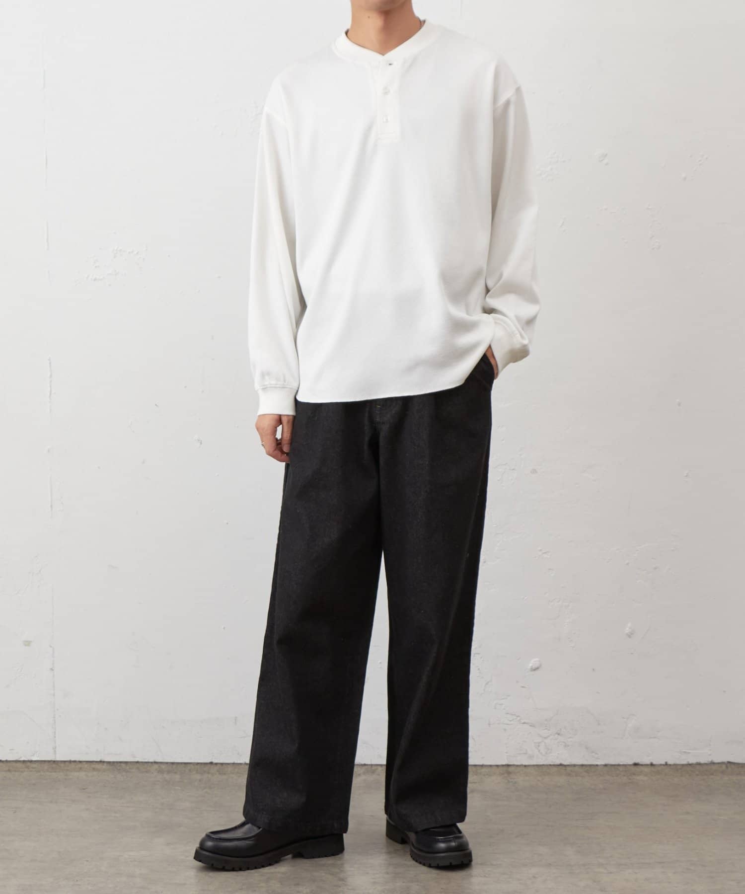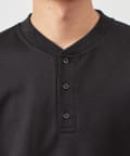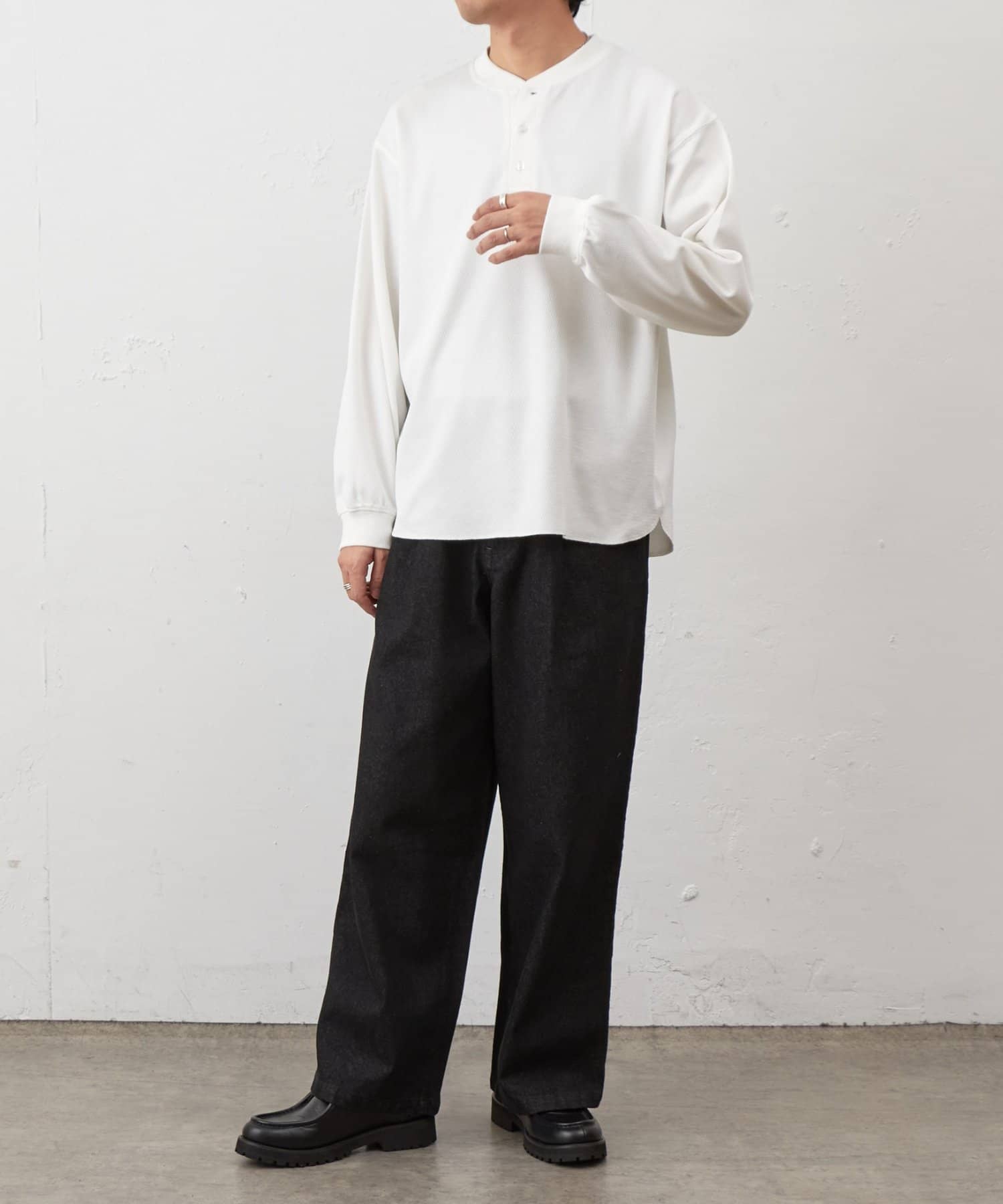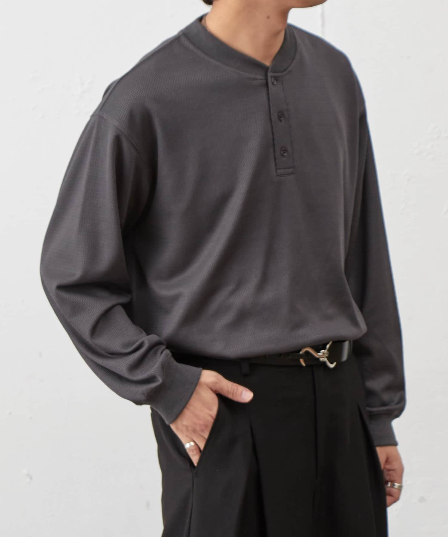 首元に程よい抜け感をつくるヘンリーネックデザインがカジュアルになりすぎず、落ち着いた印象を演出します。