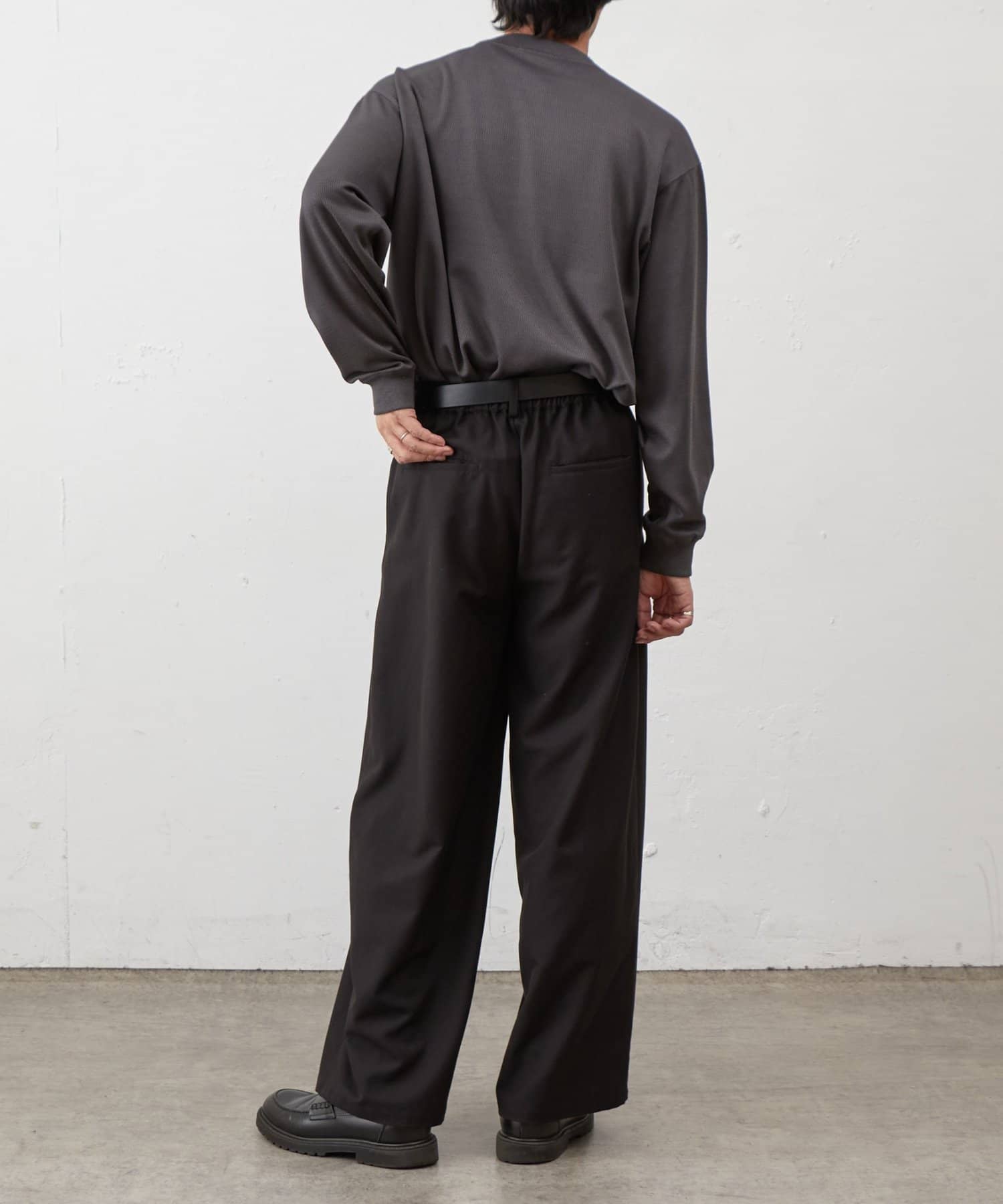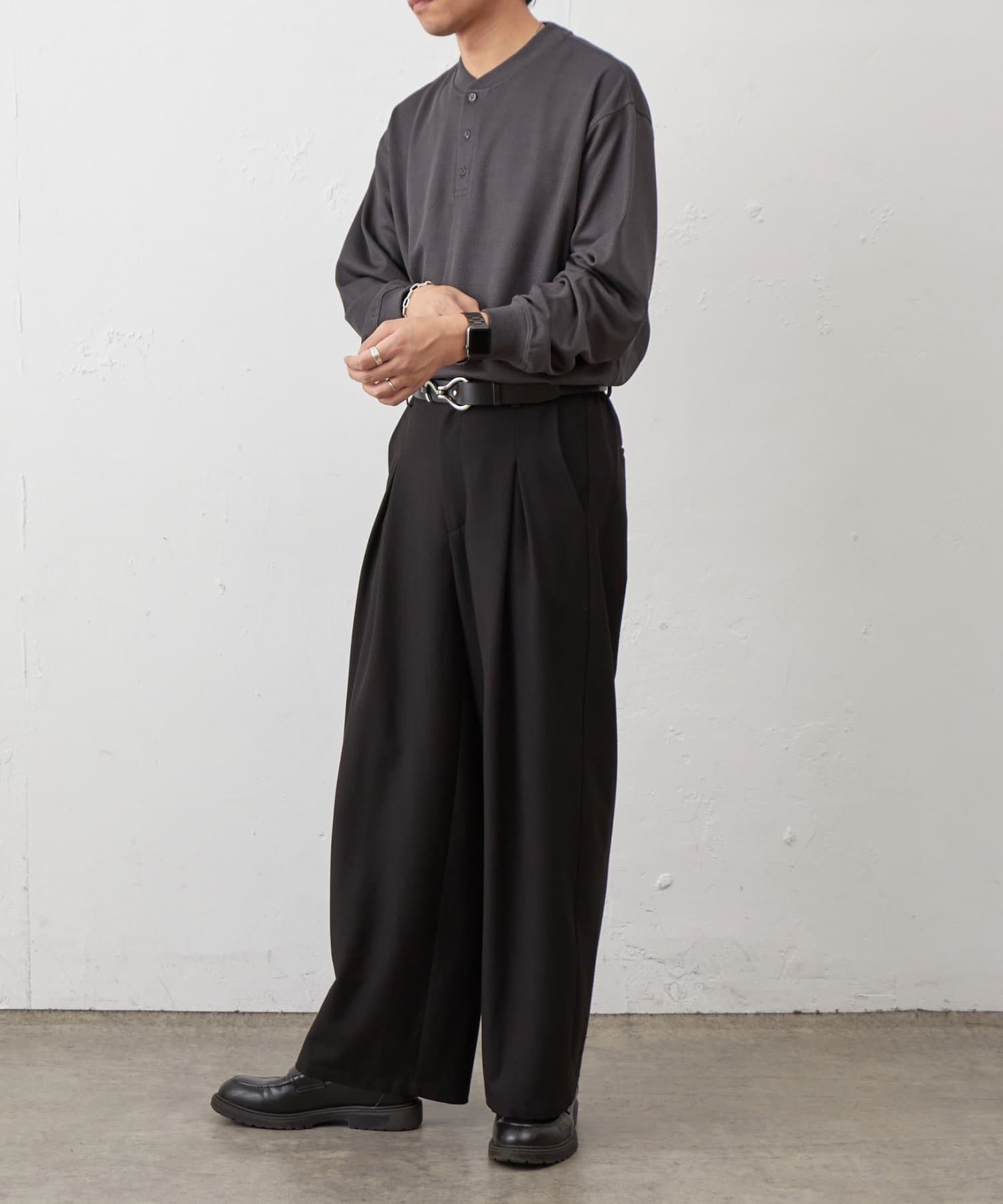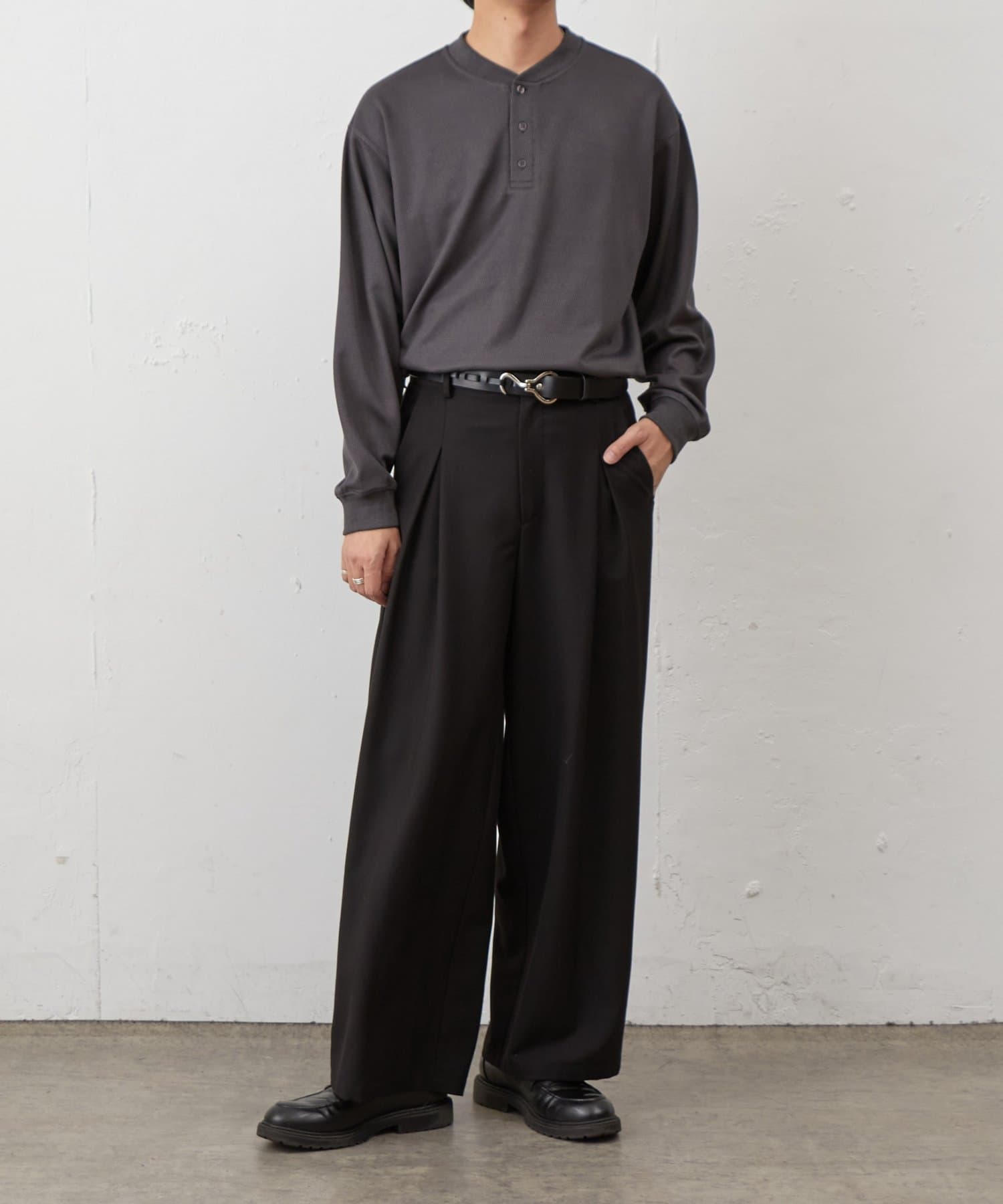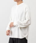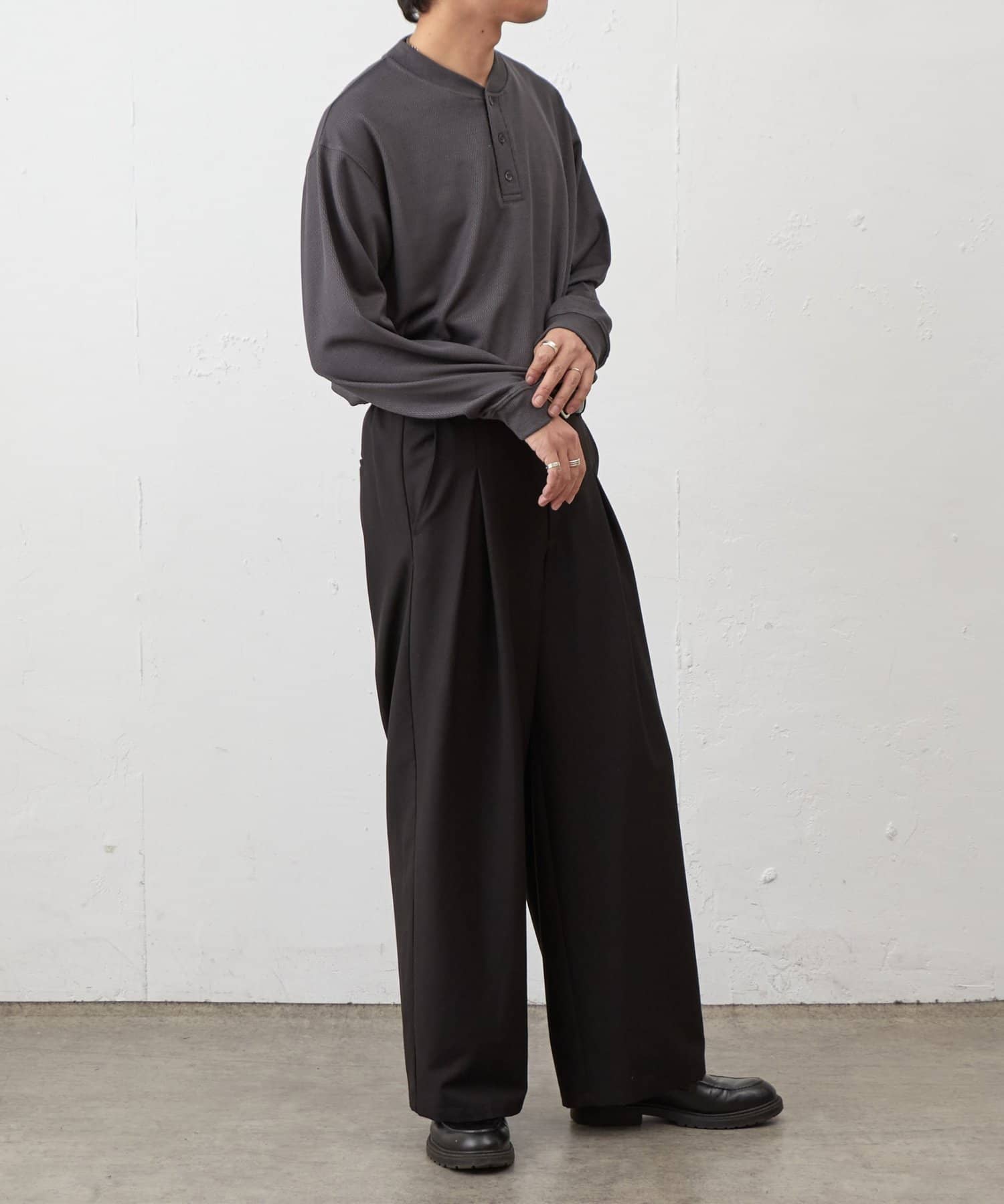 首元に程よい抜け感をつくるヘンリーネックデザインがカジュアルになりすぎず、落ち着いた印象を演出します。