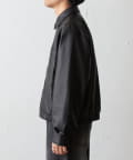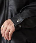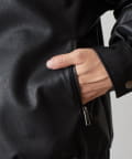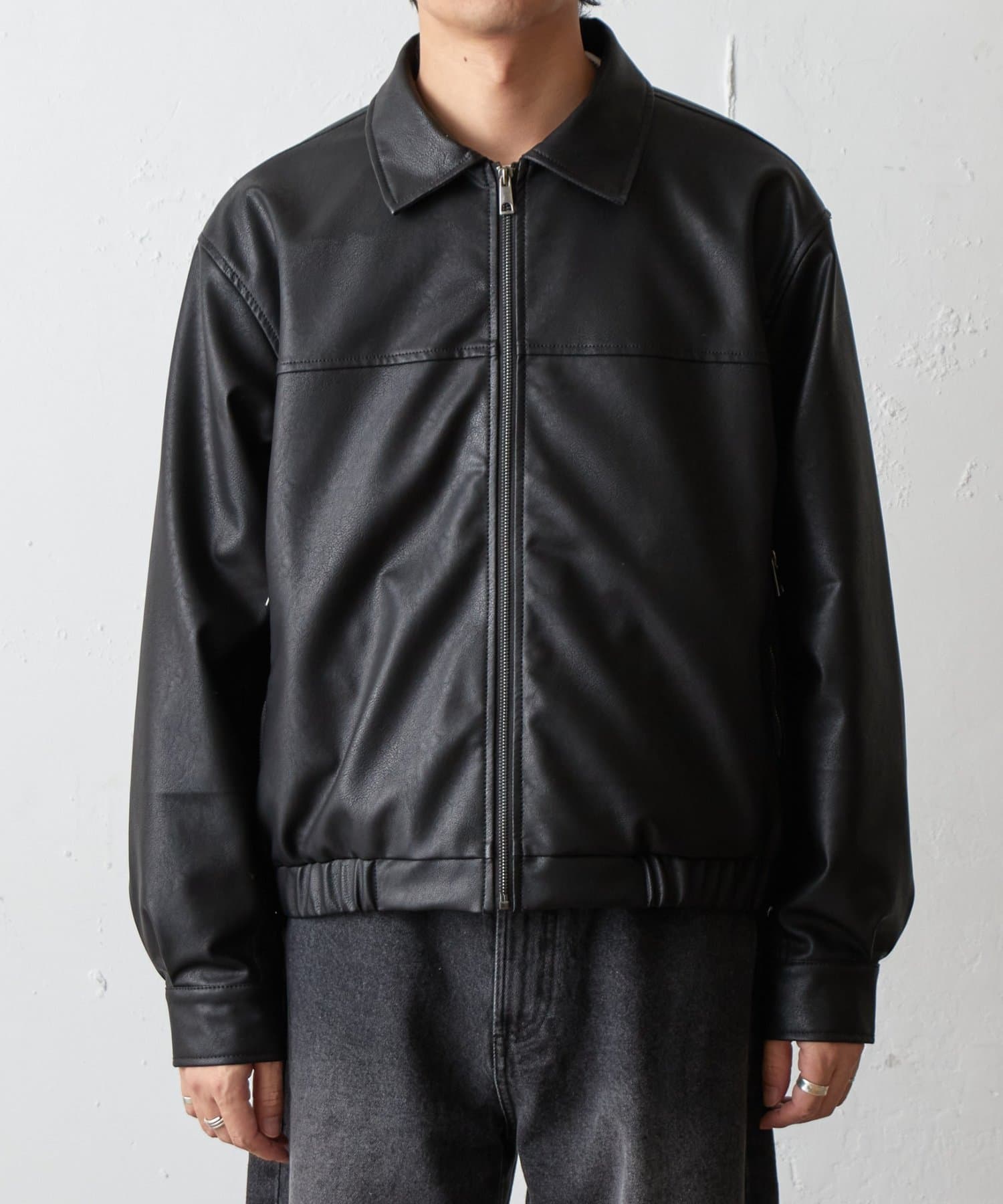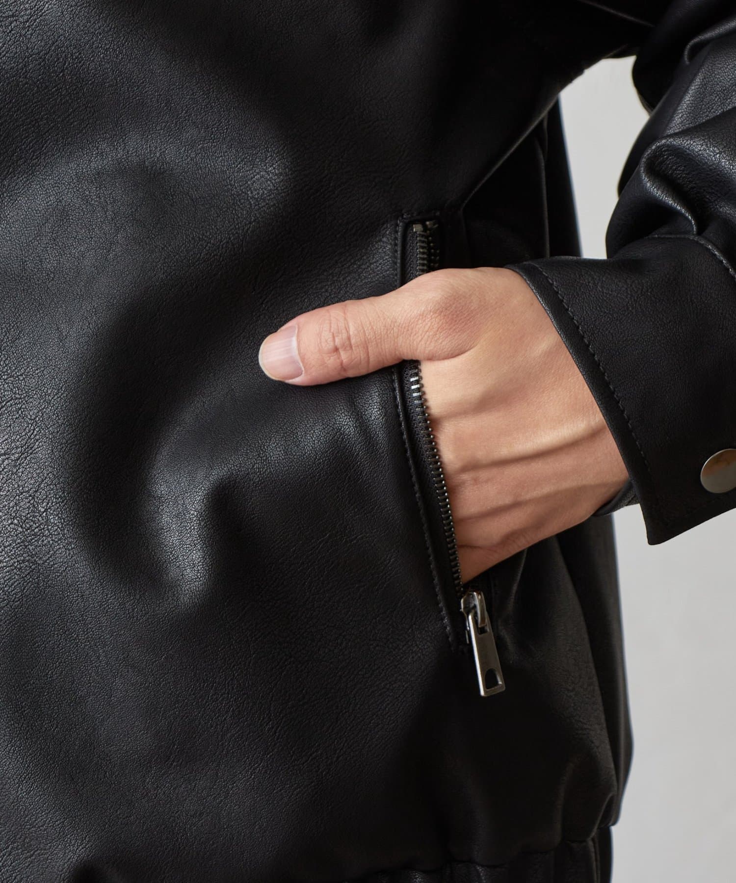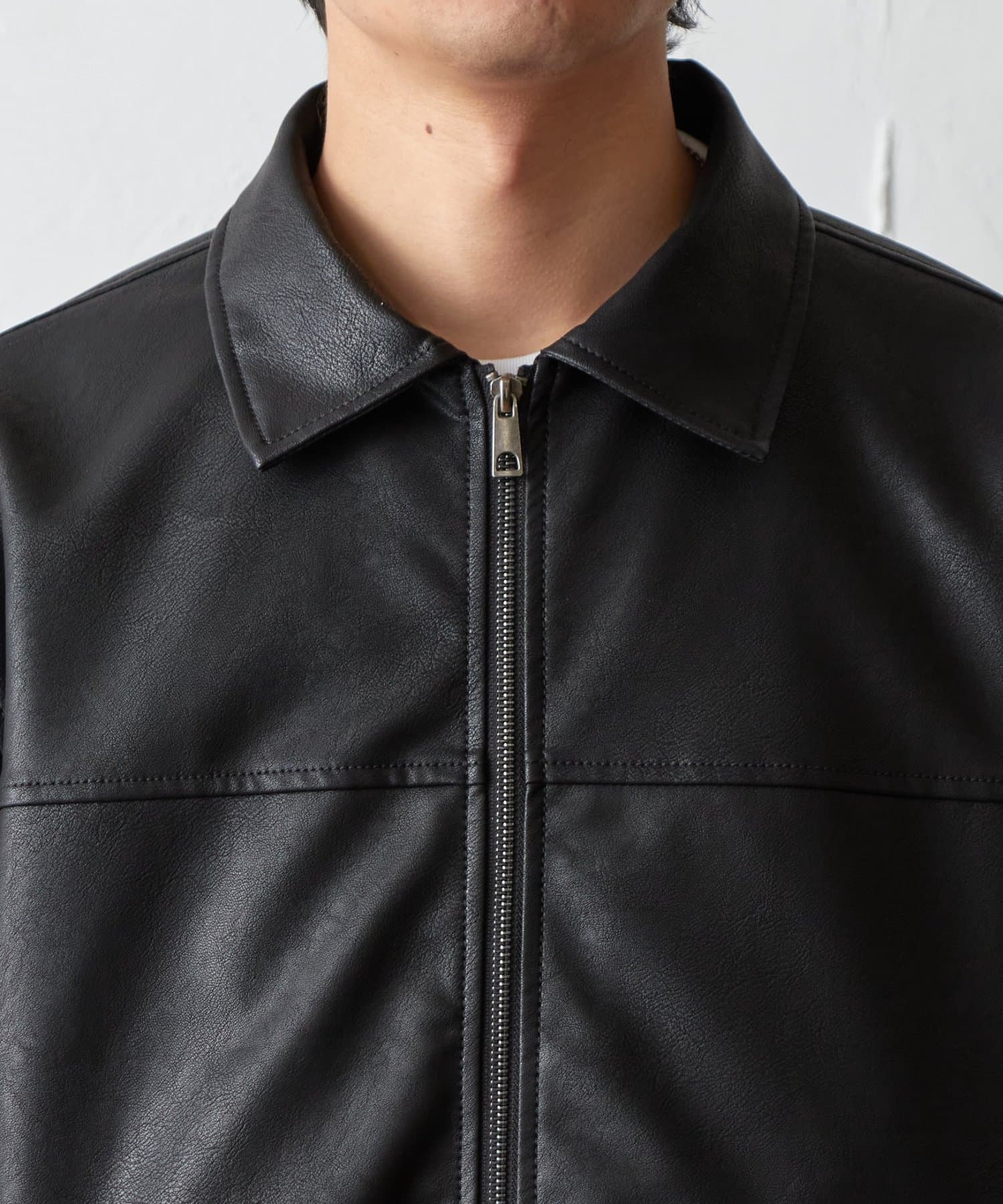上品な光沢と程よいシボ感が特徴のフェイクレザー素材を使用したフェイクレザージップブルゾンです。