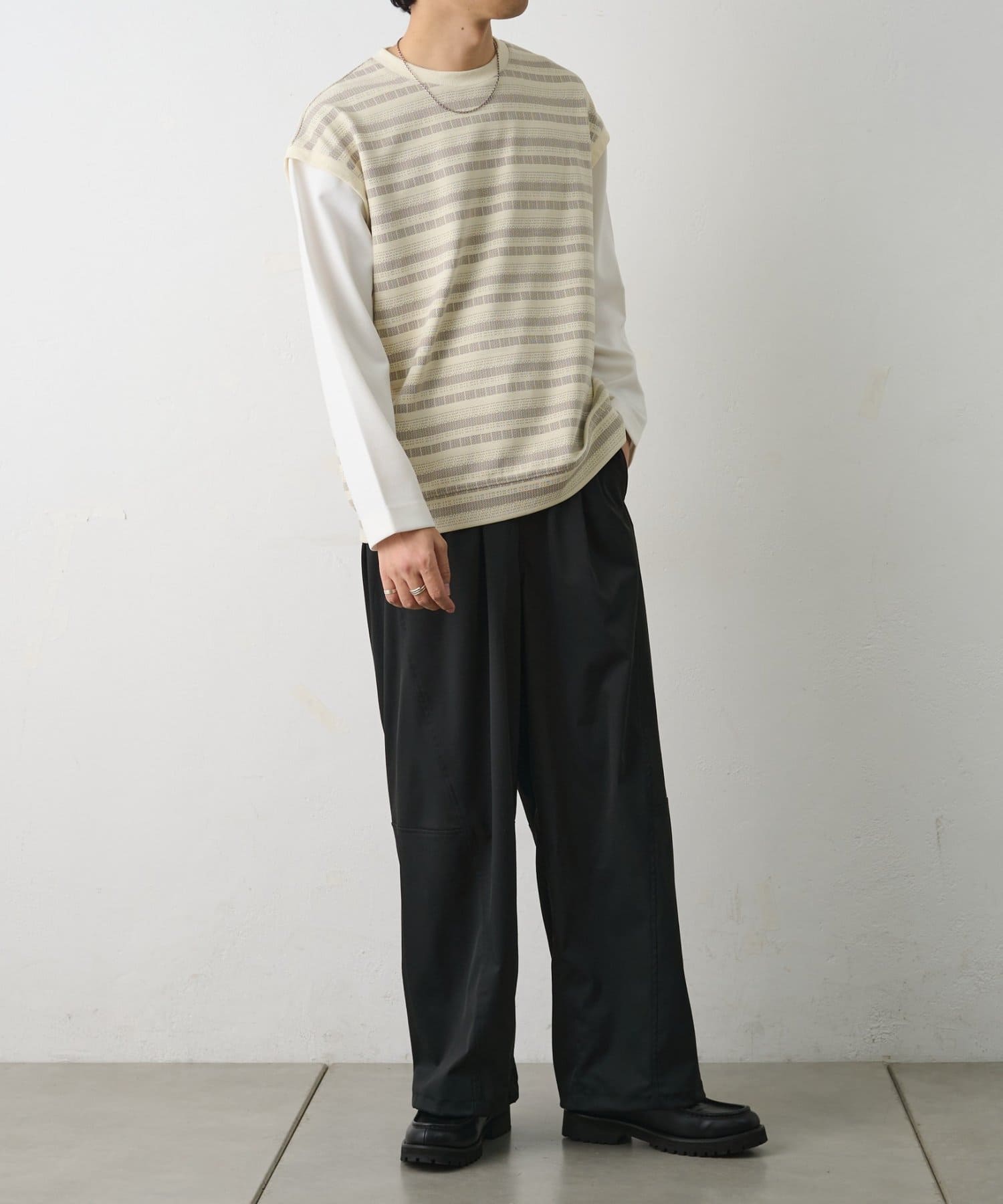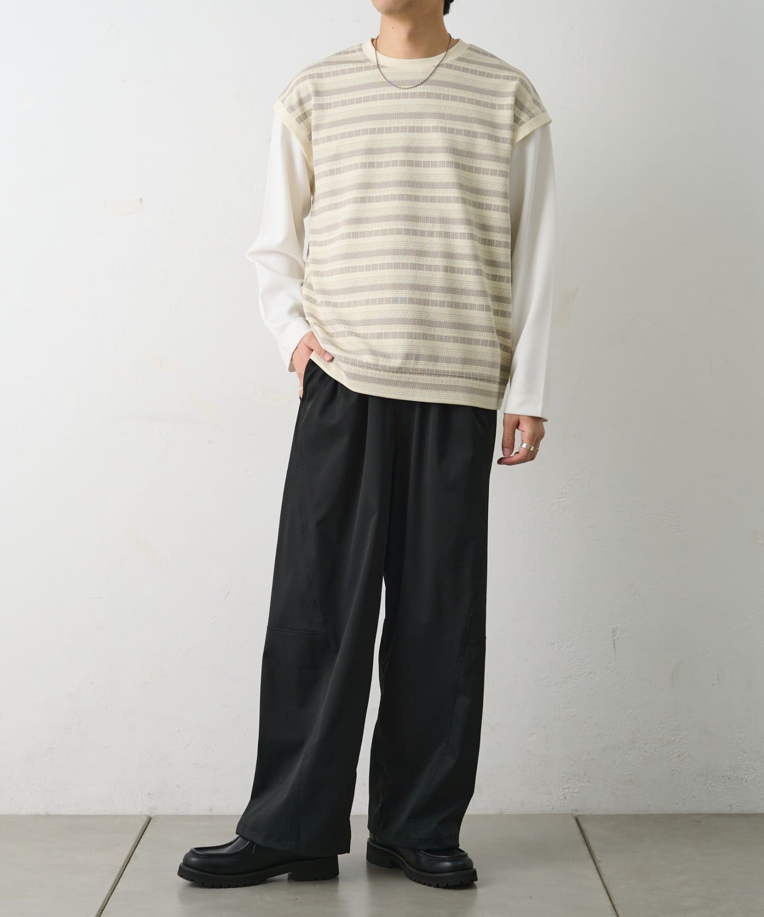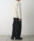 プリントではなく編み柄で表現したジャガードボーダーが、コーディネートにシンプルな中にも奥行きと立体感をプラスします。