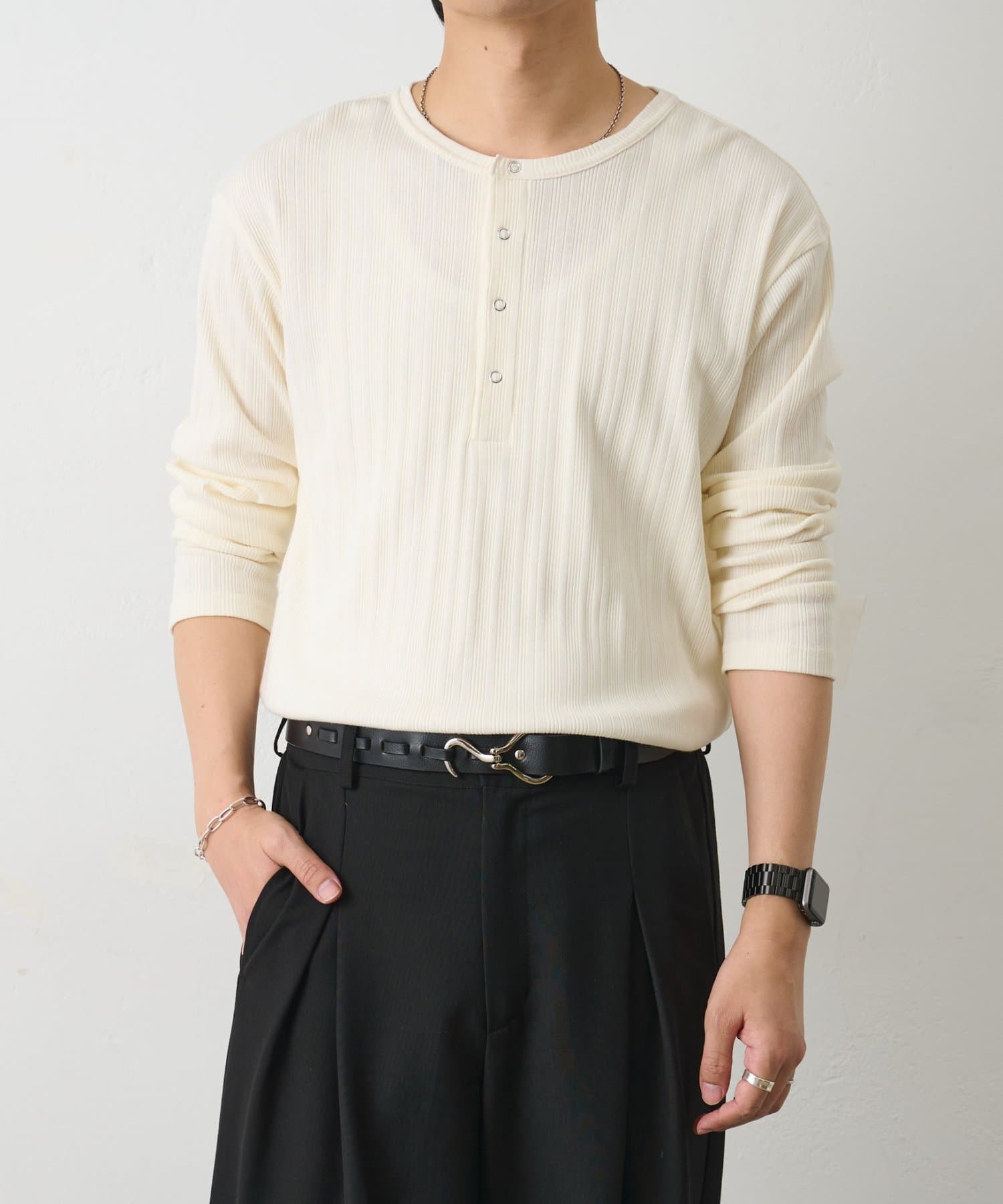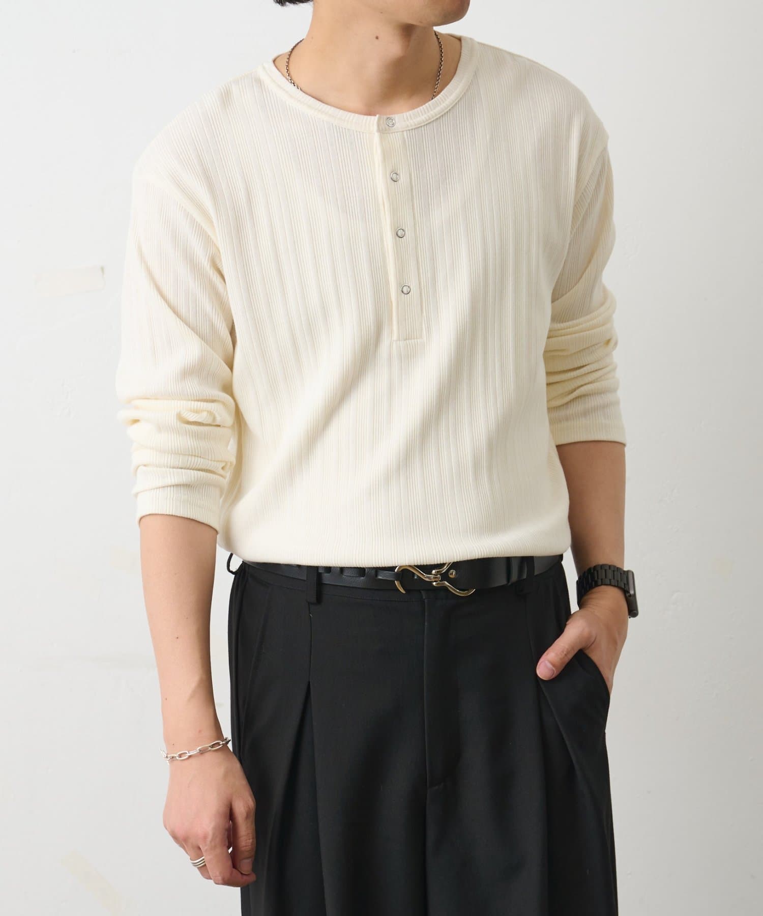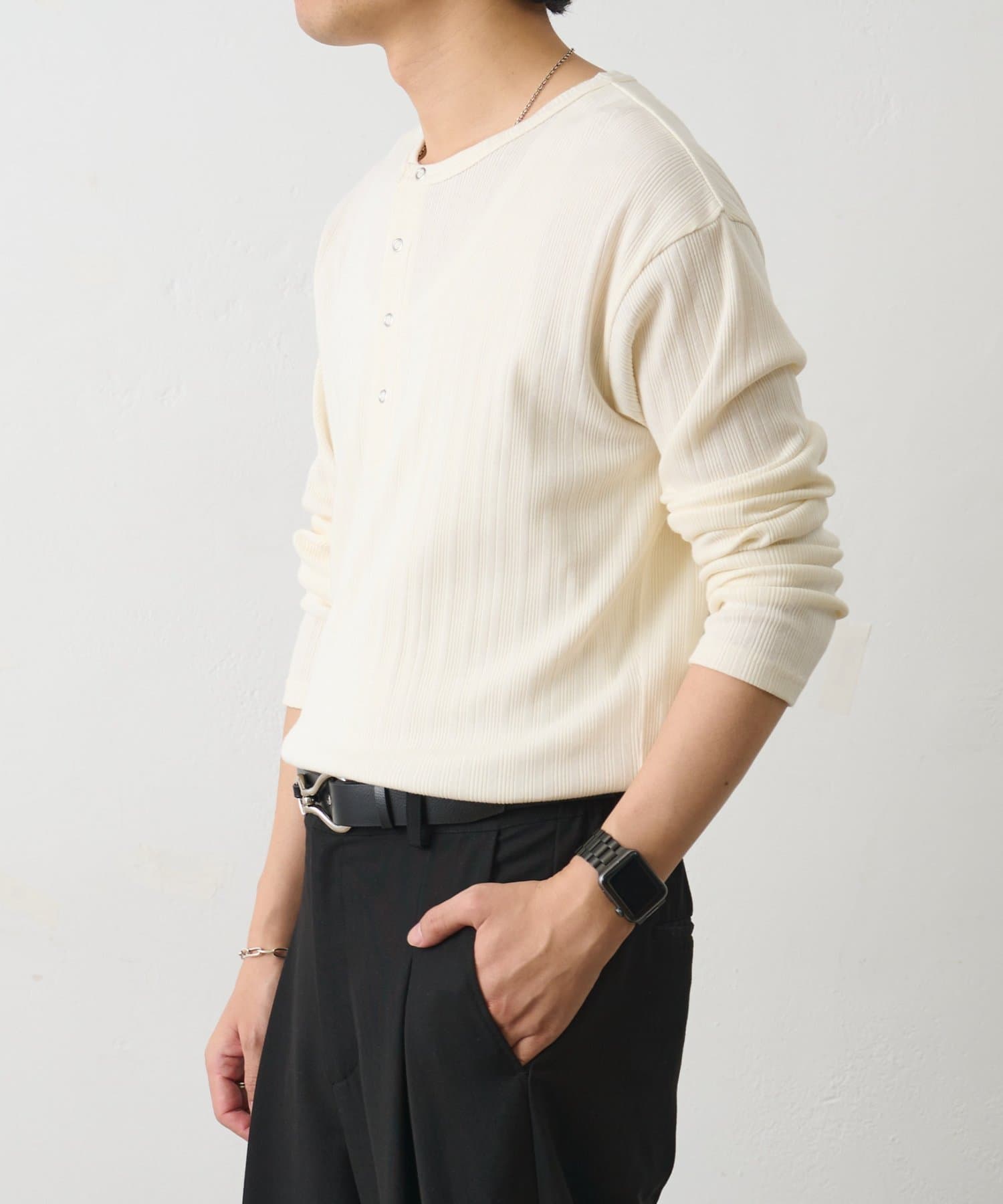 さらに、ヘンリーネックデザインが無地でも単調にならずさりげないアクセントになります◎