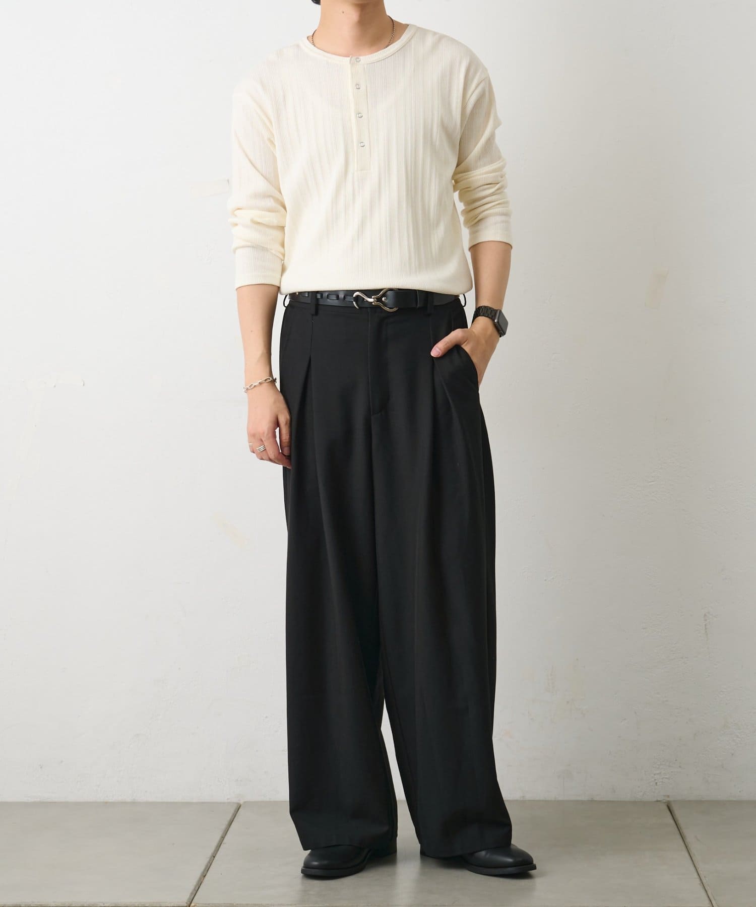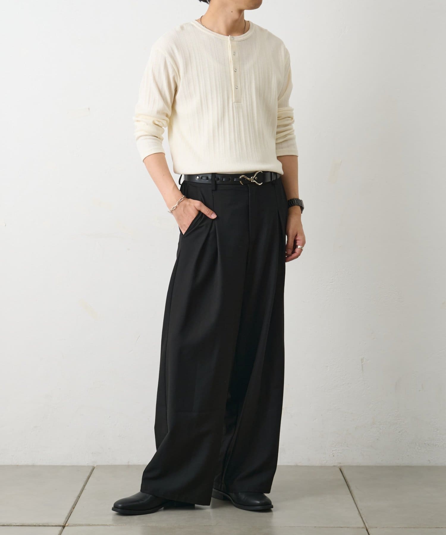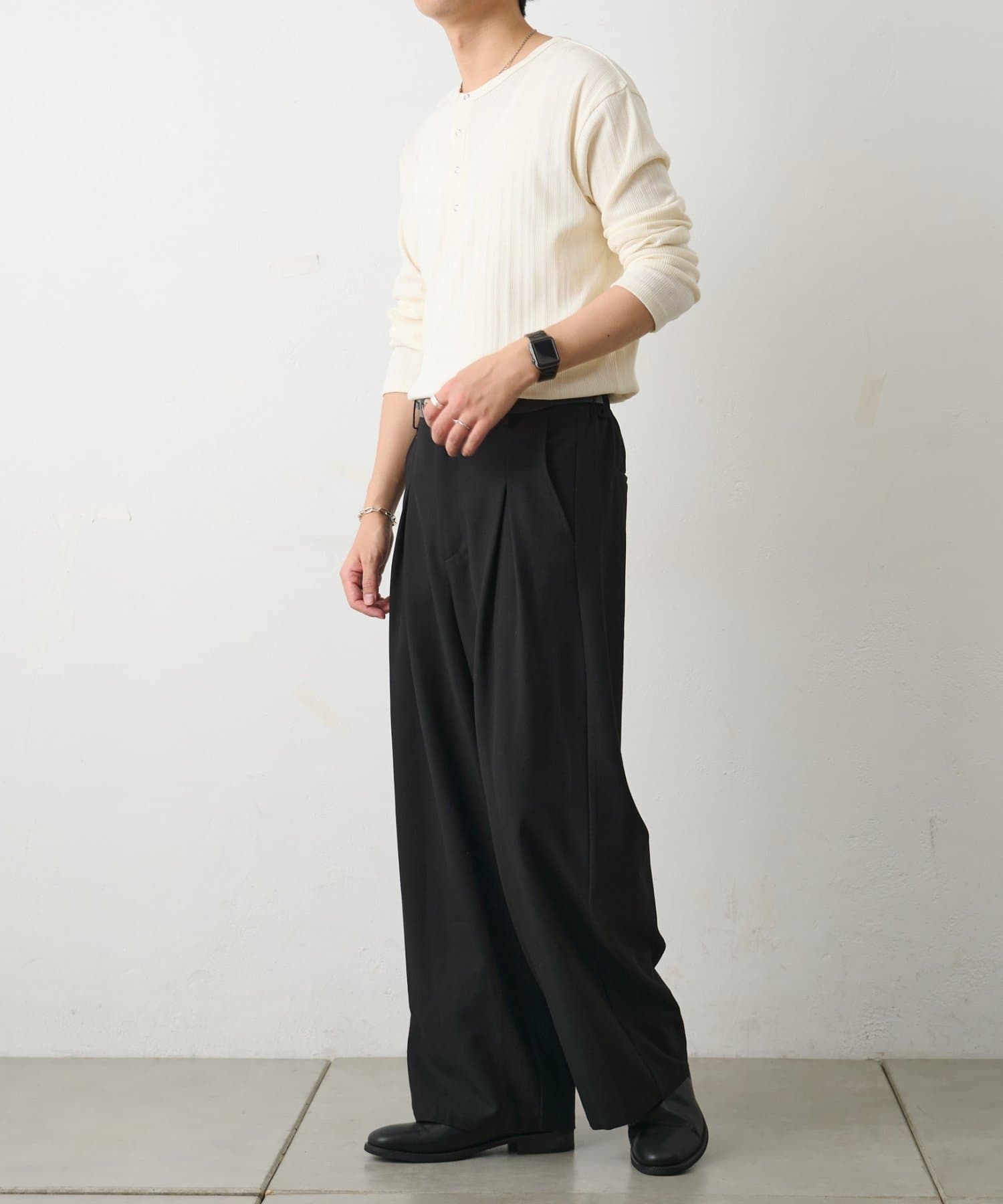 さらに、ヘンリーネックデザインが無地でも単調にならずさりげないアクセントになります◎