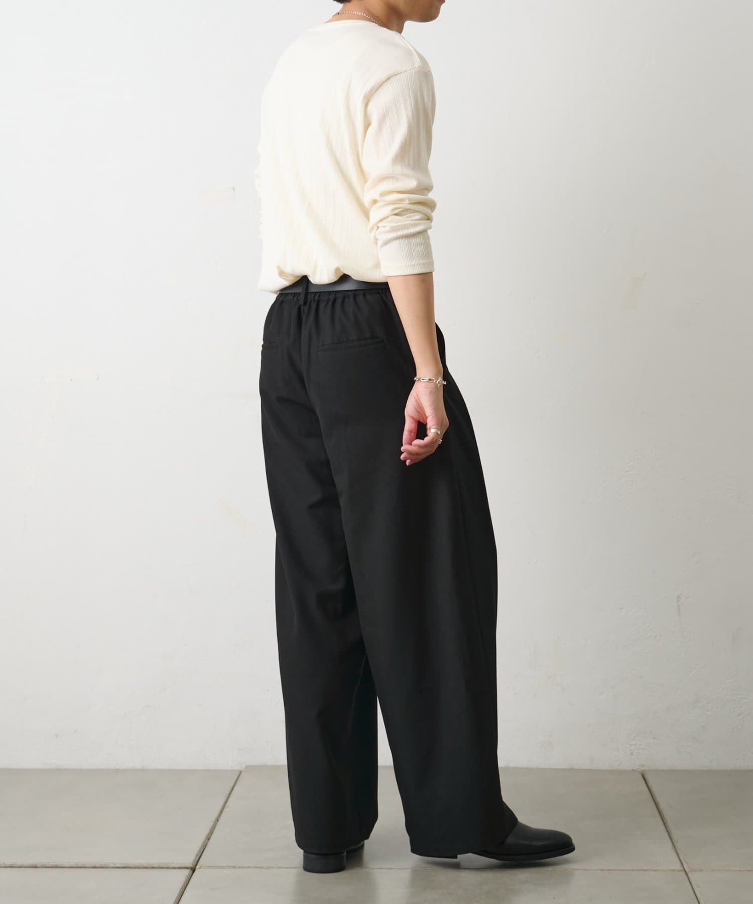 程よくゆとりを持たせたシルエットで、体のラインを拾いすぎず快適な着心地です。
