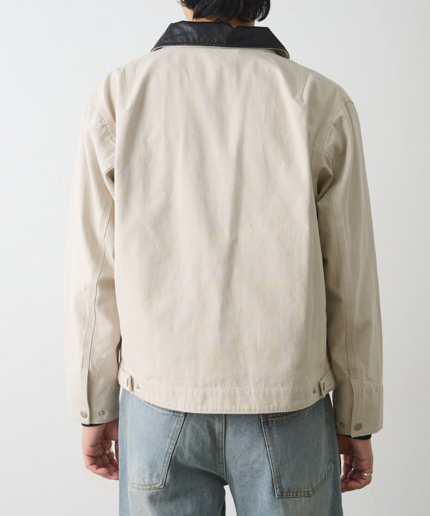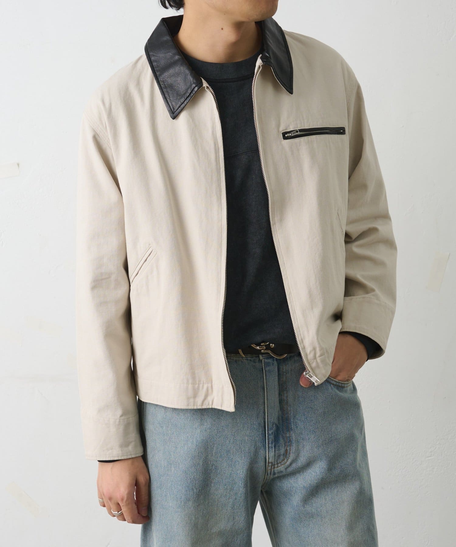 ・襟とジップポケットのフェイクレザー切り替えがアクセントに
